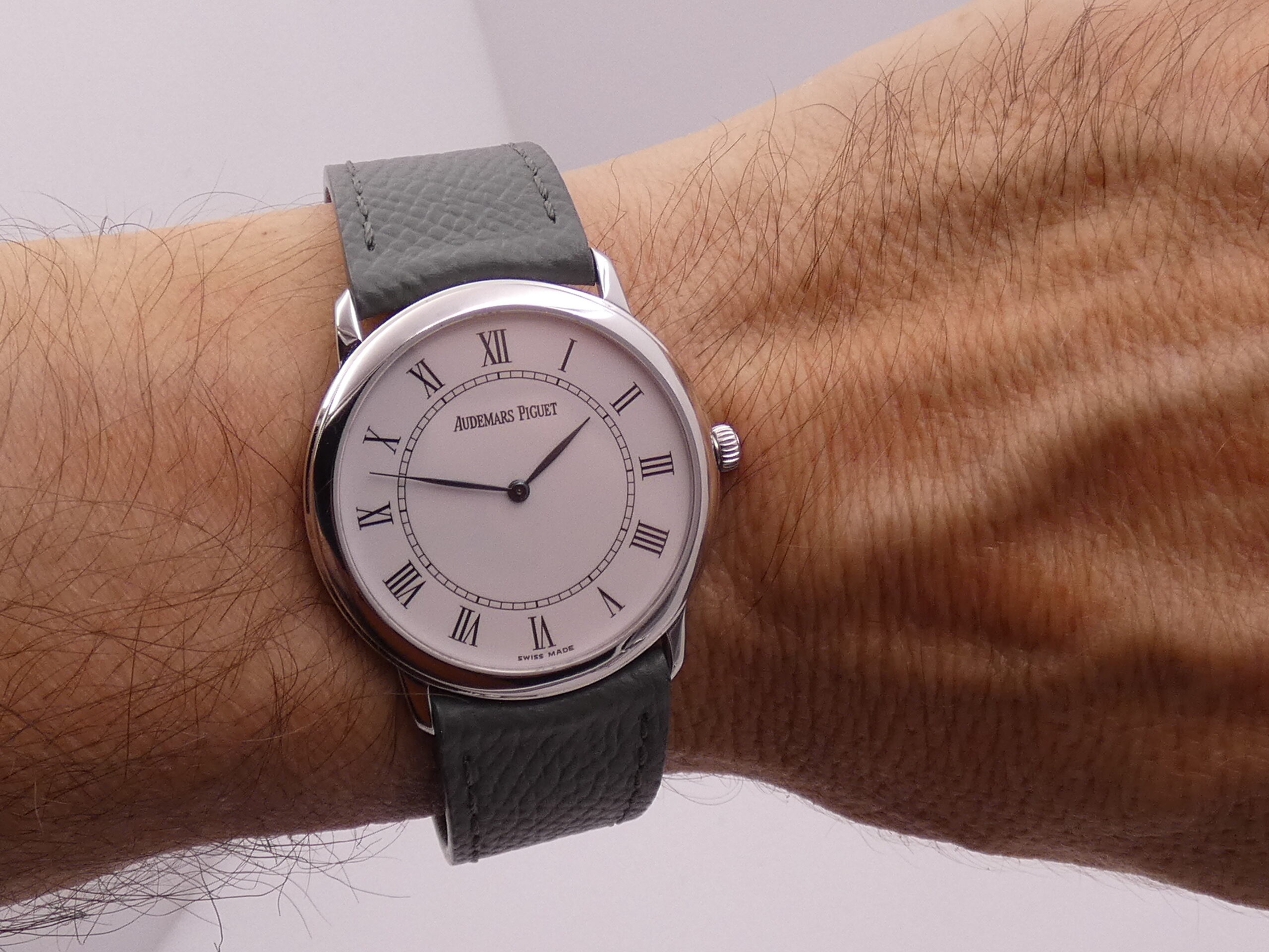 Quadrante: bianco smalto, con indici romani, lancette a foglia, scala sessantesimale centrale a Chemin de fer. logo Audemars Piguet al 12