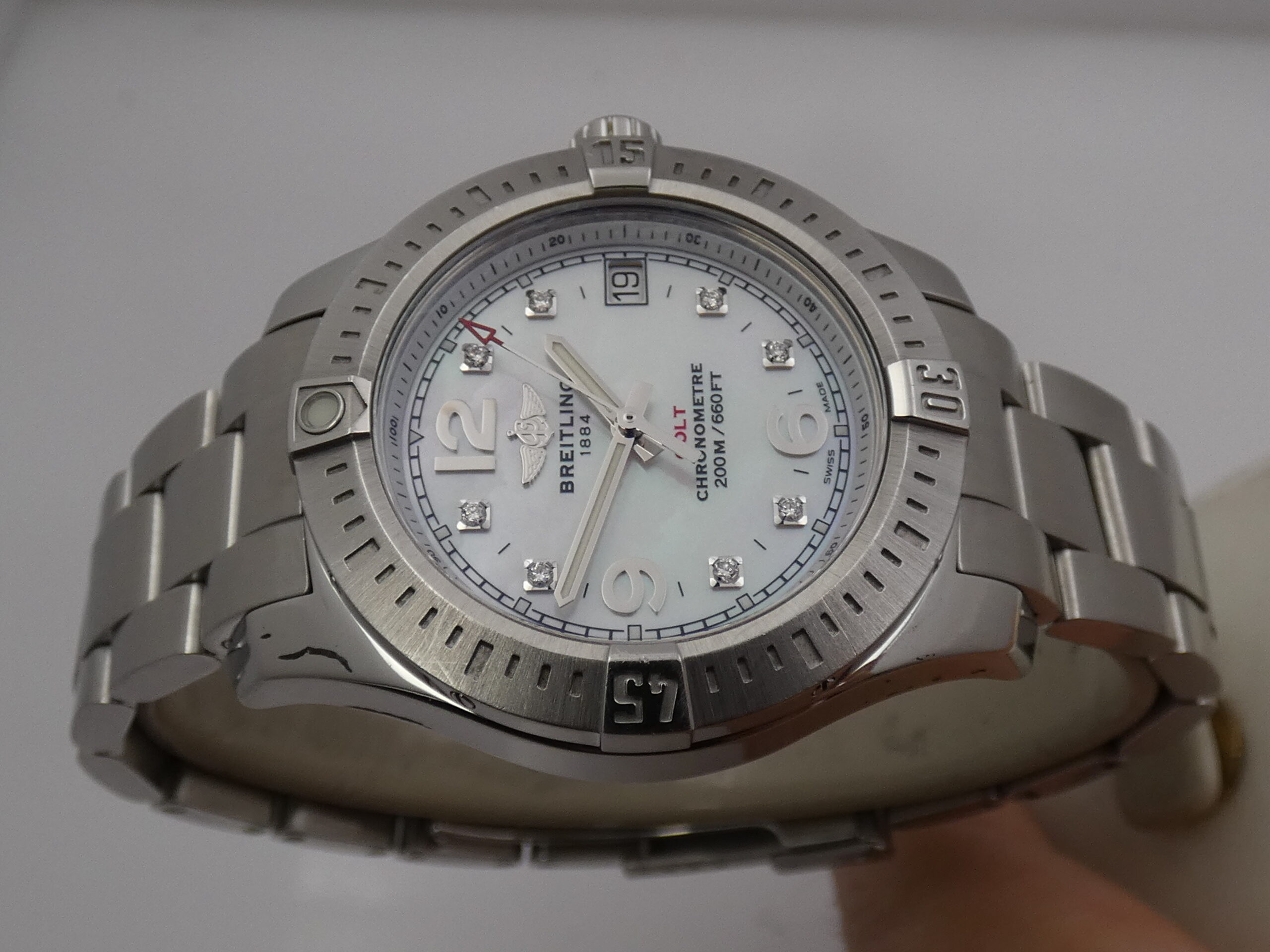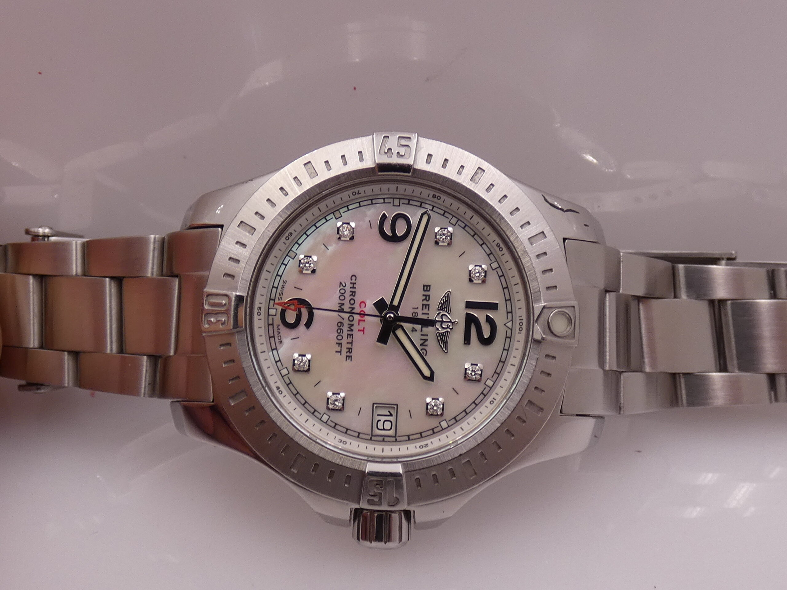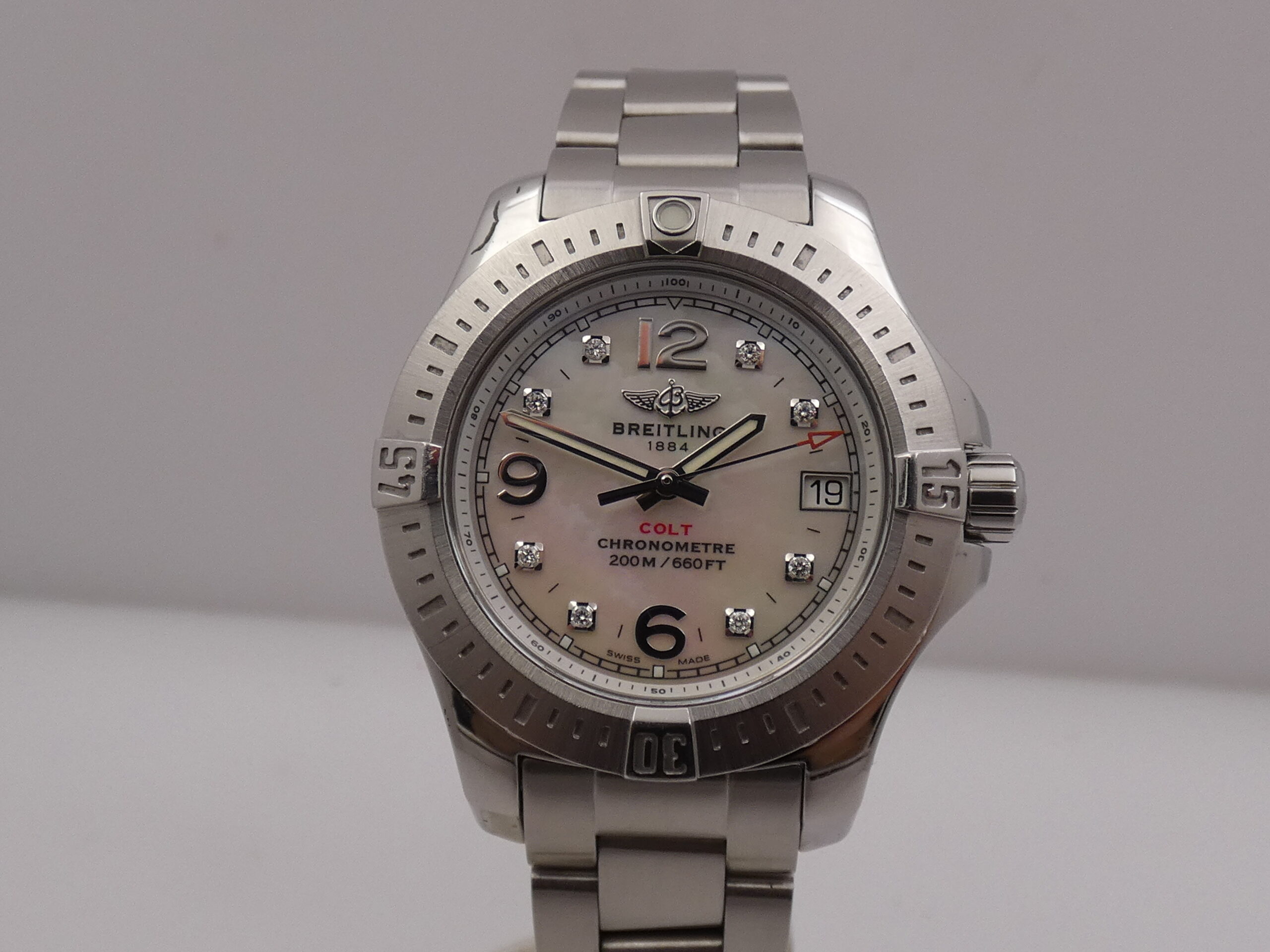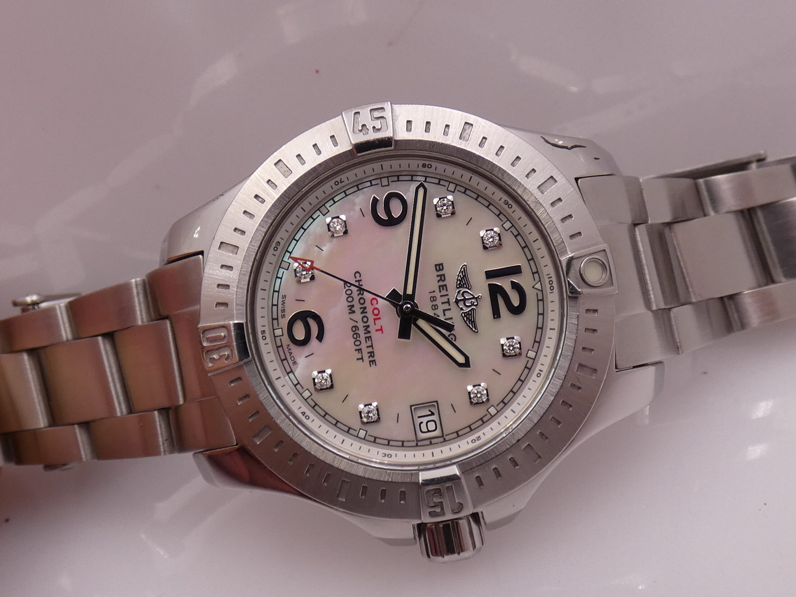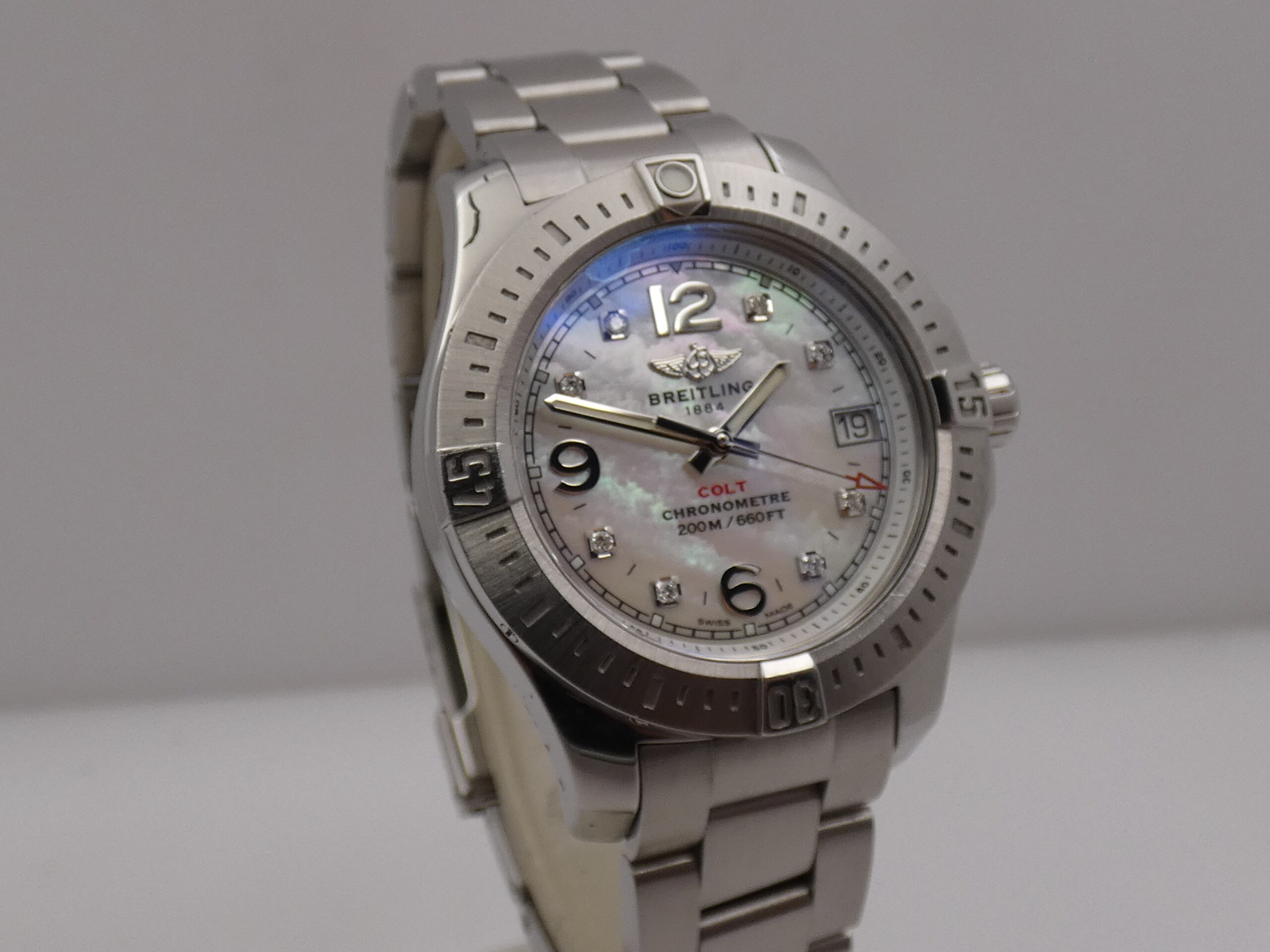 Model: Colt Lady Reference: A77388 Year: 2017 Movement: Precision quartz-controlled, Breitling Caliber 77 with 7 jewels, officially chronometer-certified by the C.O.S.C. Functions: Hours, minutes, seconds, date Case: All-steel Bezel: Unidirectional rotating bezel with 60-minute scale for calculating dive times, quarter tabs, and a luminescent dot at 12 o’clock; Aesthetic screws on the edge Crown: Original screw-down crown with protective shoulders Lugs: Curved Dimensions: 33 mm excluding crown, 41.5 mm at the lugs Crystal: Sapphire Case back: Screw-down case back with the brand logo Dial: Mother-of-pearl MOP, with diamond hour markers, raised steel Arabic numerals with corresponding luminescent dots, luminescent steel pencil hands, center seconds hand, date display at 3 o’clock with quick-set crown, Chemin de Fer (railroad track) 60-minute scale, tachometric scale on the flange, Breitling logo at 12 o’clock Strap: Original Breitling, brushed steel Clasp: Steel deployant with flip lock safety clasp, original BreitlingThe watch you see for sale is in excellent condition, in perfect working order, accurate and reliable, and waterproof: its water resistance has been tested and shown in the photos. It is completely original. It will be delivered to you with its beautiful leather box, outer box, C.O.S.C. certificate, manual, and original Breitling warranty, plus our 12-month warranty on proper functioning!! It’s in the photo. Stunning!!! WE WILL EXAMINE YOUR PRE-OWNED ITEM. WE SHIPPED FREE WORLDWIDE. INT. CODE TCZZ |