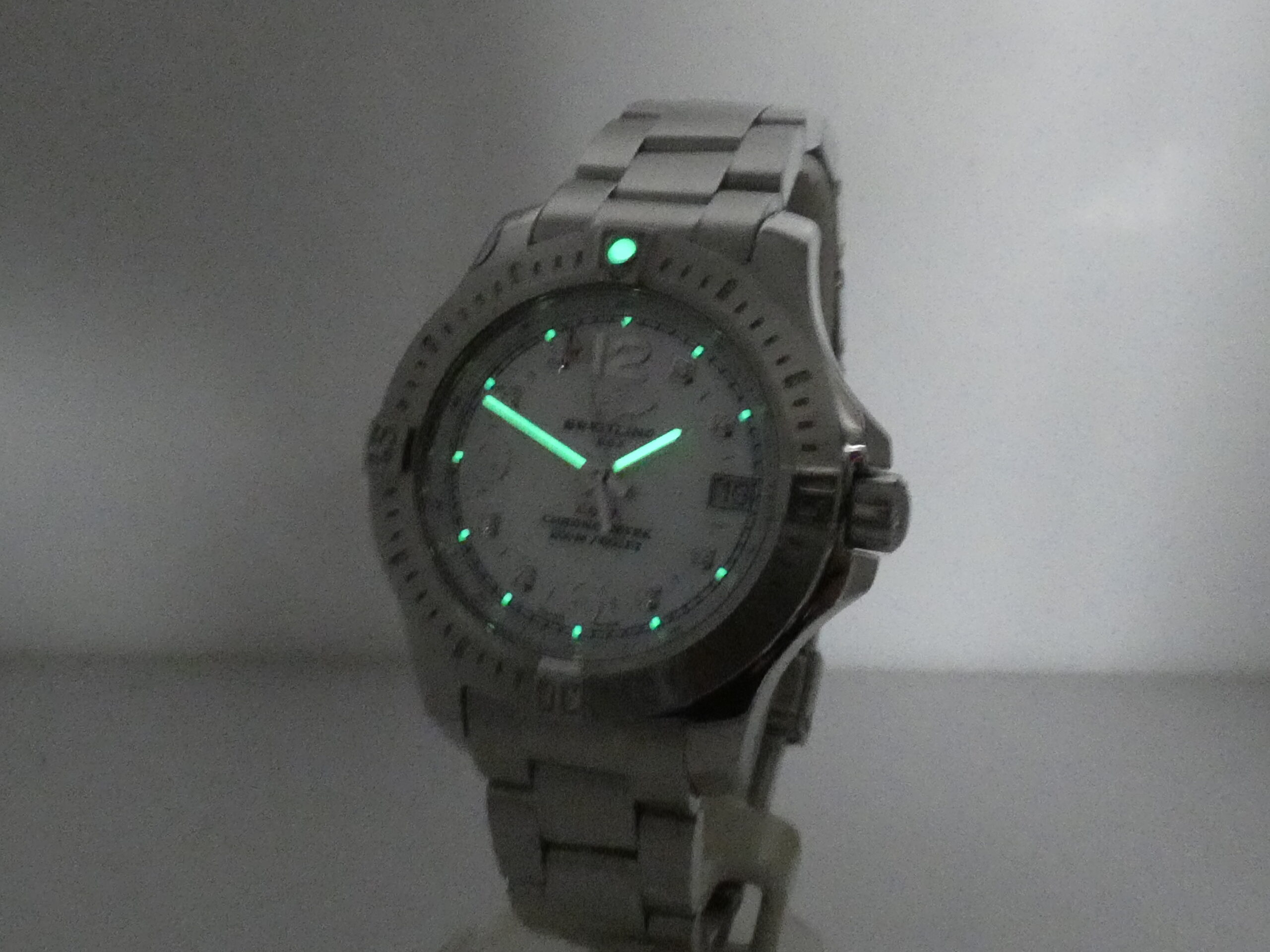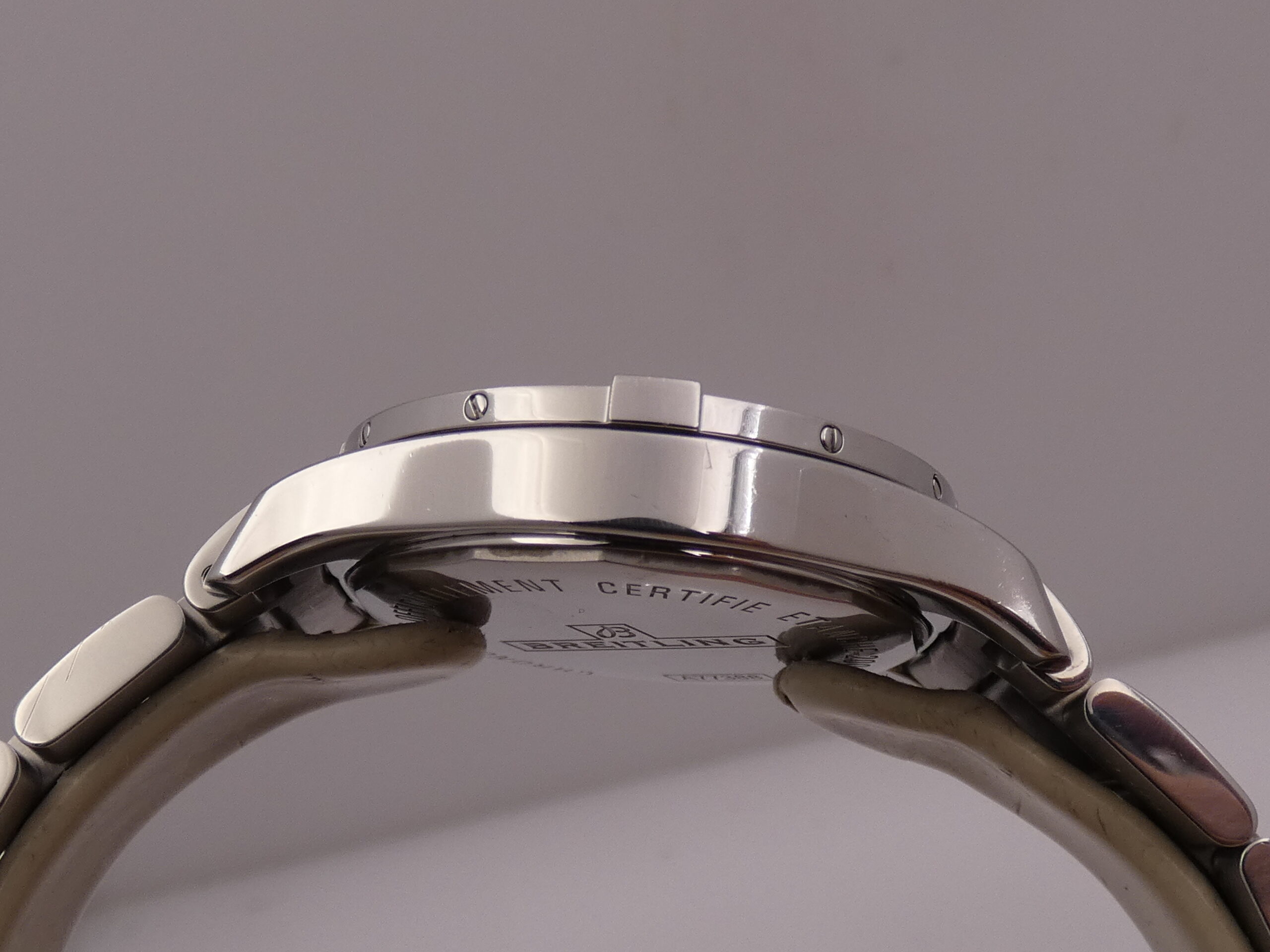 Quadrante: MOP madreperla, con indici di brillanti, arabi a quarti, in acciaio in rilievo e con punti luminescenti in corrispondenza, lancette a matita, anch’esse in acciaio e luminescenti, secondi al centro, datario al 3 con rimessa rapida in corona, scala sessantesimale Chemin De Fer, scala tachimetrica sul rehaut, logo Breitling al 12