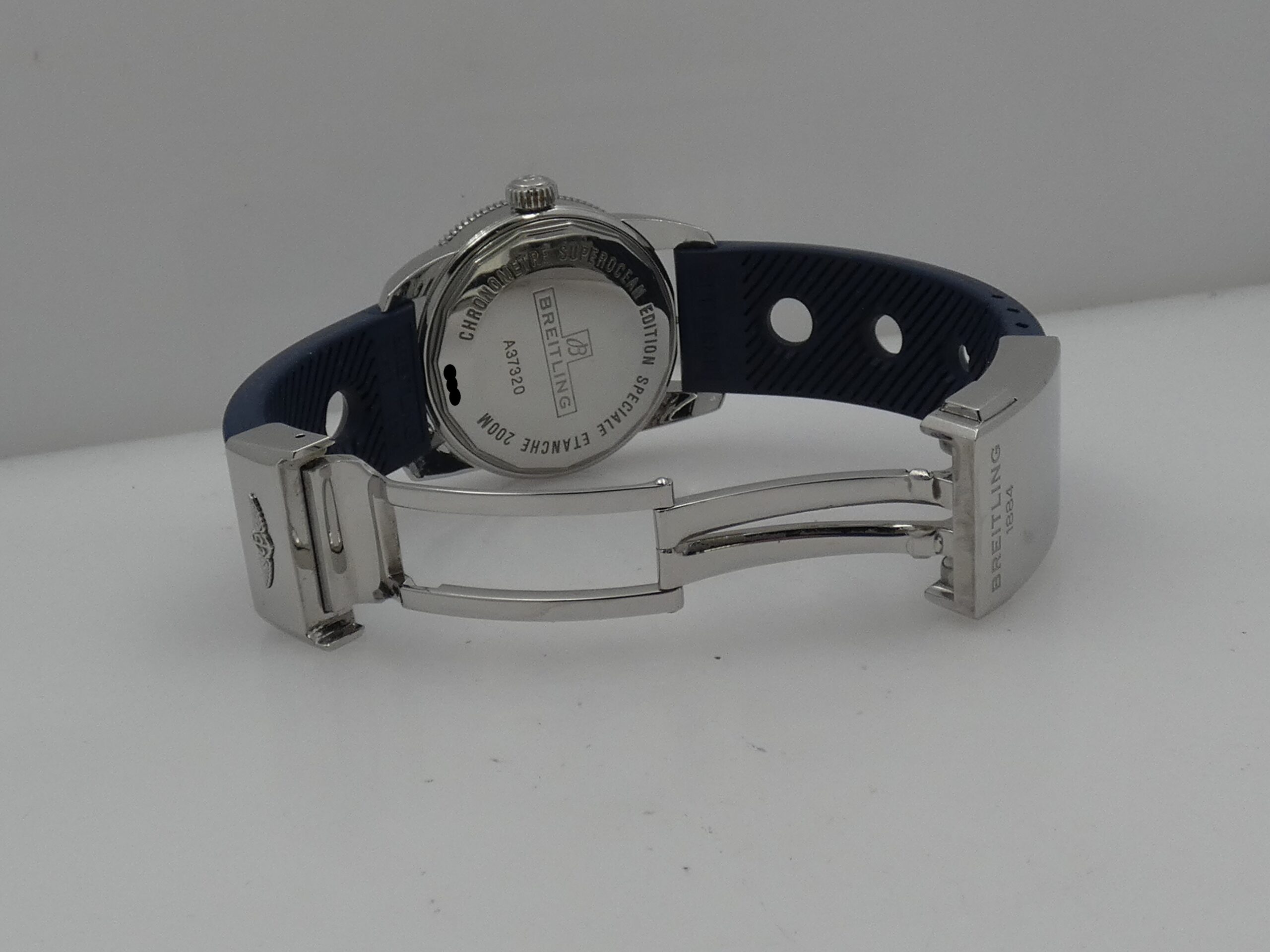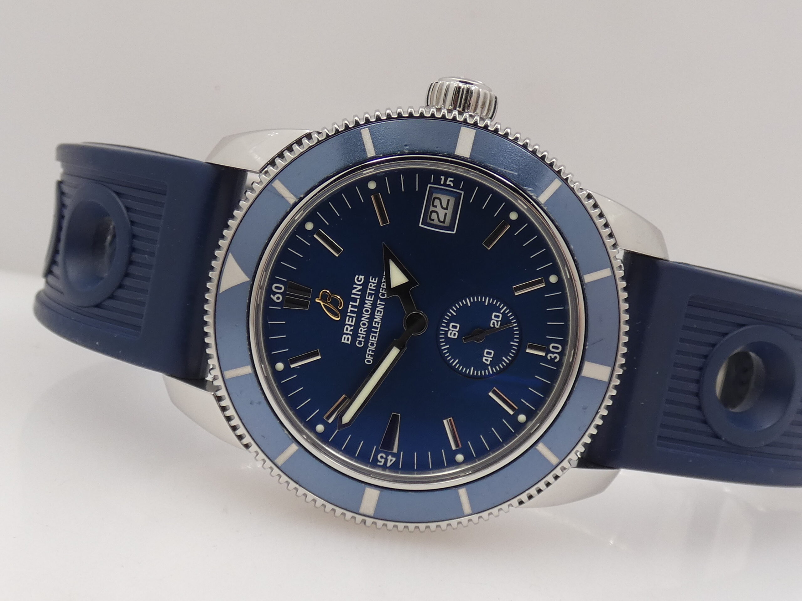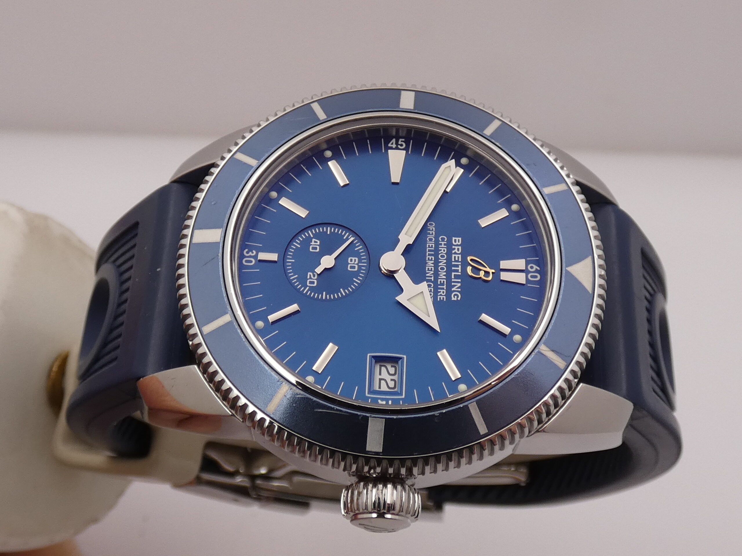 Model: Superocean Heritage Reference: A37320 Year: 2008 Movement: Self-winding mechanical, caliber Breitling 37 Functions: Hours, minutes, seconds, date Case: All-steel Bezel: blue, unidirectional rotating, with sixtieth scale for calculating dive times, with some light scratches Crown: Screw-lock, original Breitling Lugs: Curved; 20mm lug width Dimensions: 38 mm excluding crown, 46 mm at the lugs Crystal: sapphire, with anti-reflective coating Case back: screw-down, featuring the brand logo Dial: blue sunburst, with raised steel bar indexes and corresponding luminescent dots, pointed steel and luminescent hands, seconds at 6 o’clock, date display at 3 o’clock with quick-set crown, 60s scale, Breitling logo at 12 o’clock Strap: blue, rubber, perforated, original Breitling, adjustable using the buttons on the side of the clasp Clasp: steel, folding clasp, original BreitlingThe watch you see for sale is in excellent condition, in perfect working order, accurate and reliable, and waterproof: its water resistance has been tested. It is completely original. It will be delivered to you with its original Breitling warranty and COSC certificate, plus our 12-month warranty on proper functioning!!! It’s in the photo. Stunning!!! WE WILL EXAMINE YOUR PRE-OWNED ITEM. WE SHIPPED FREE WORLDWIDE. |