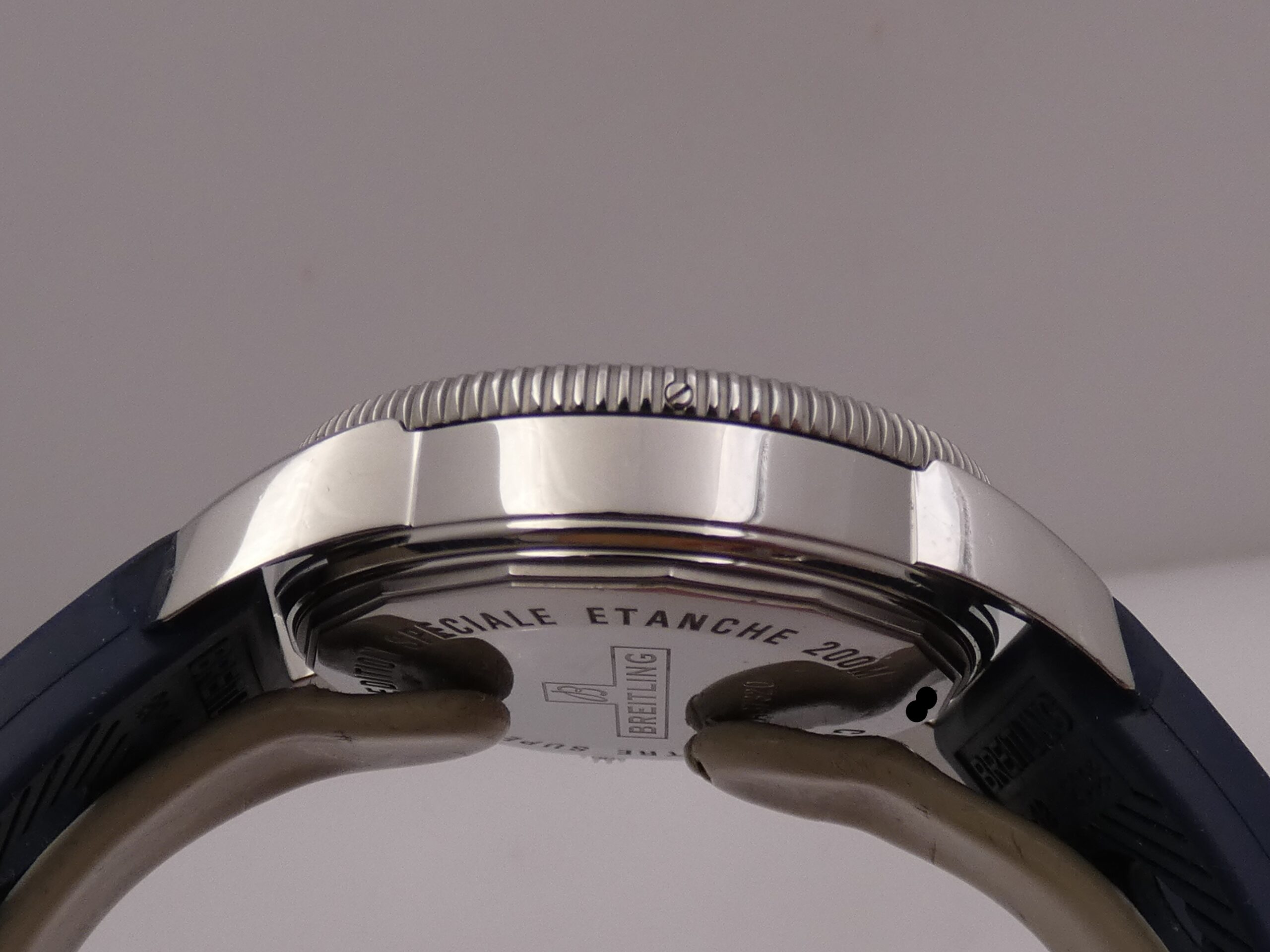 Quadrante: blu soleil, con indici a barretta in acciaio, in rilievo e con punti luminescenti in corrispondenza, lancette a punta anch’esse in acciaio e luminescenti, secondi al 6, datario al 3 con rimessa rapida in corona, scala sessantesimale, logo Breitling al 12