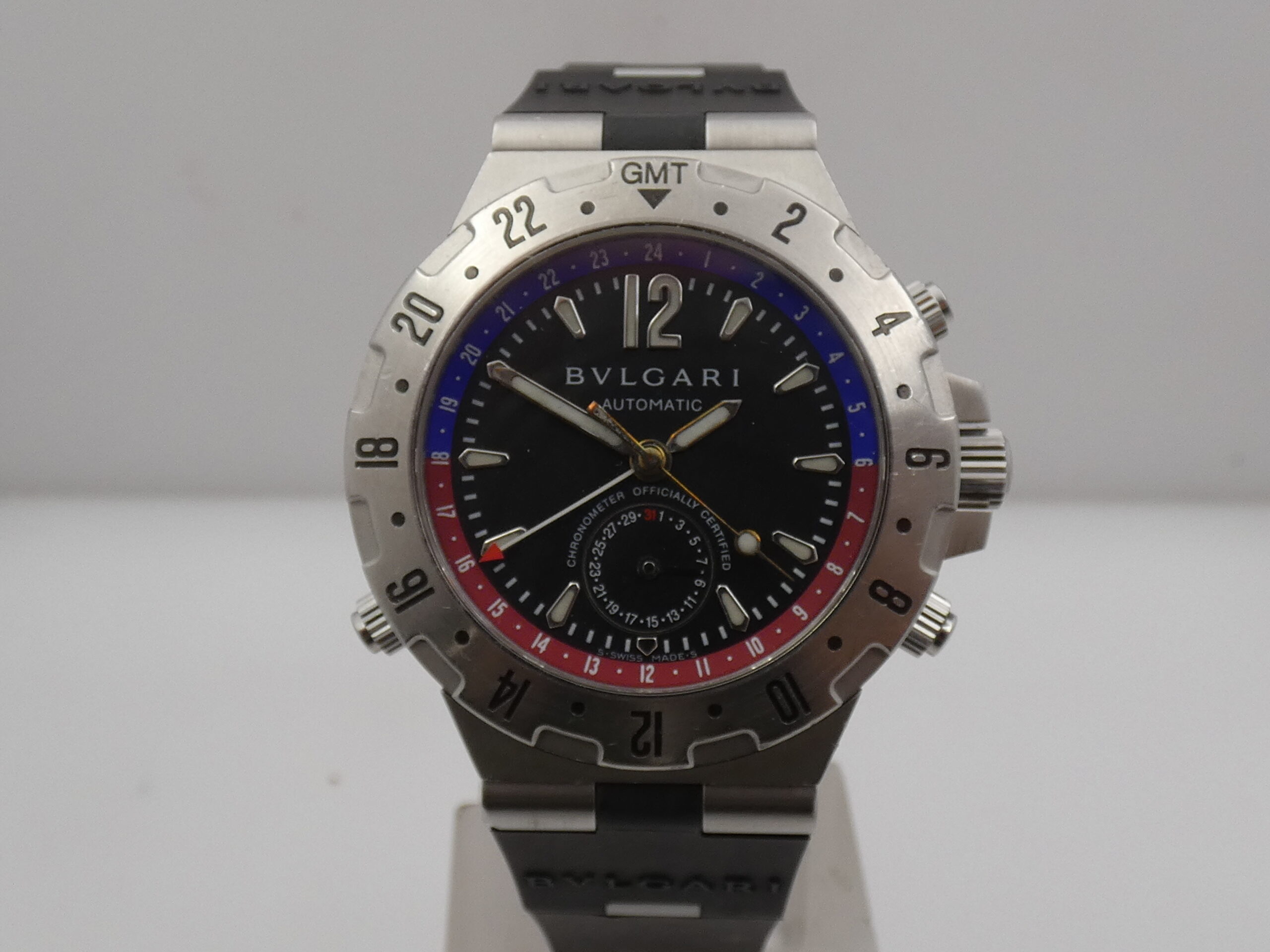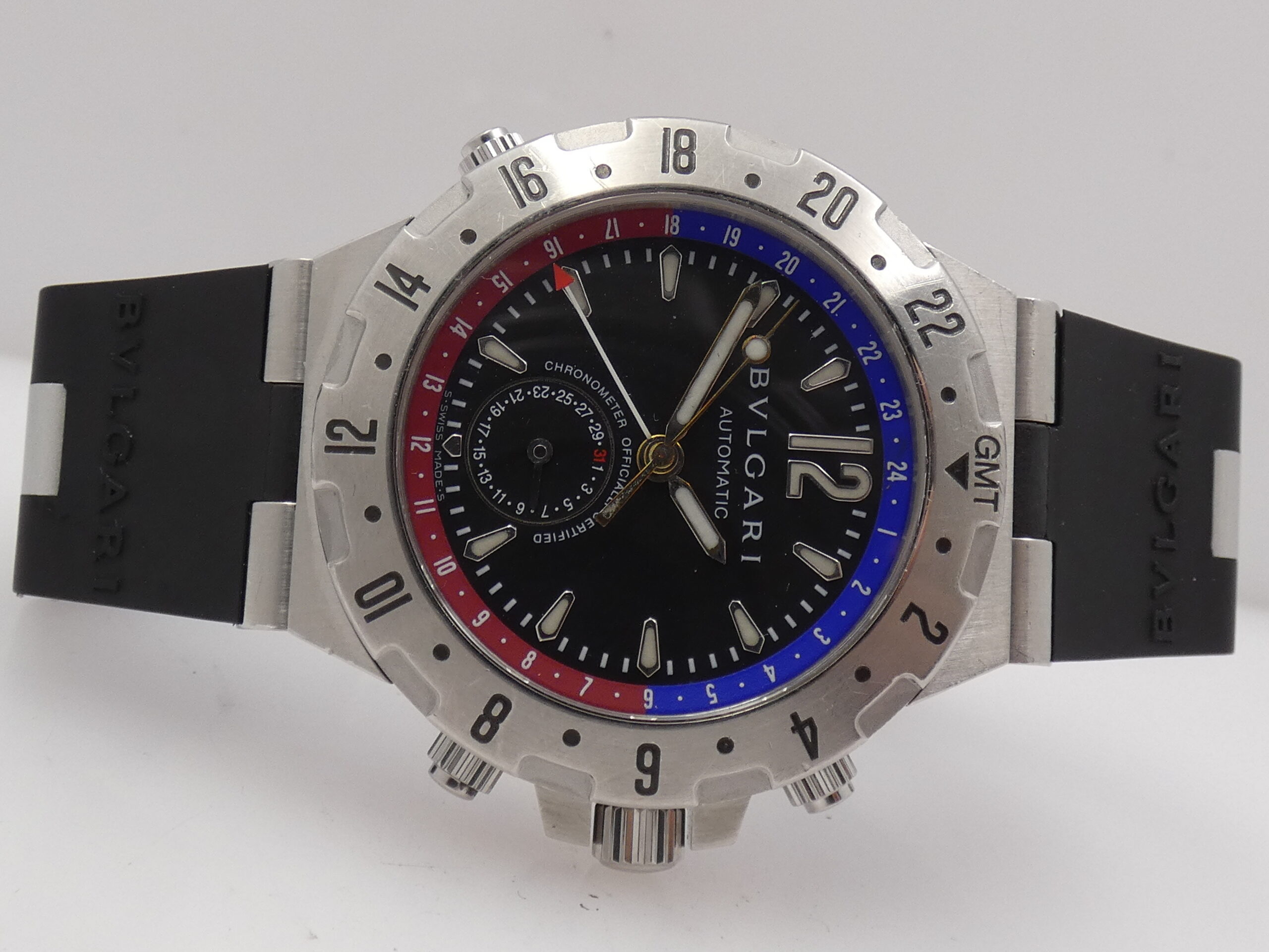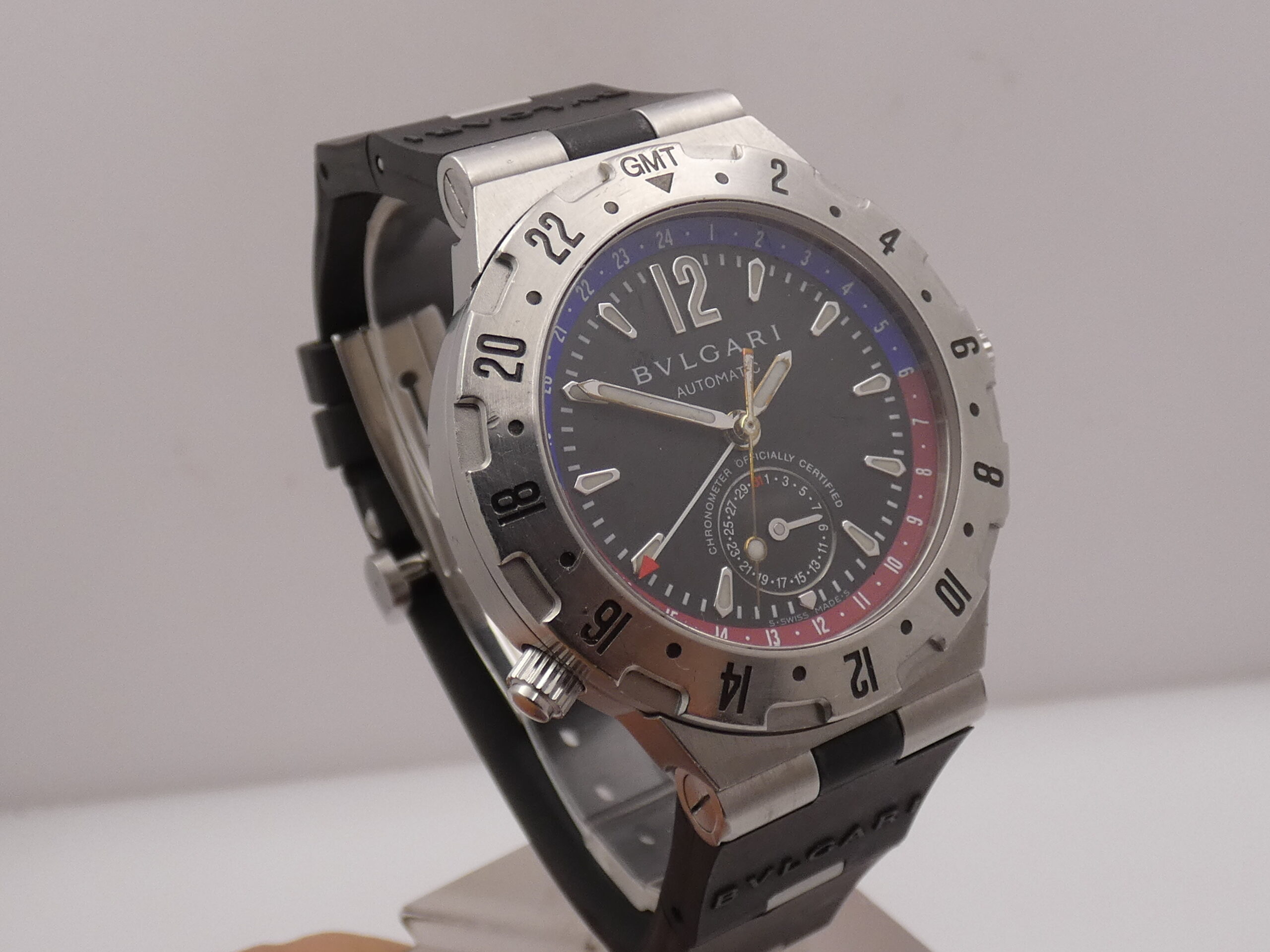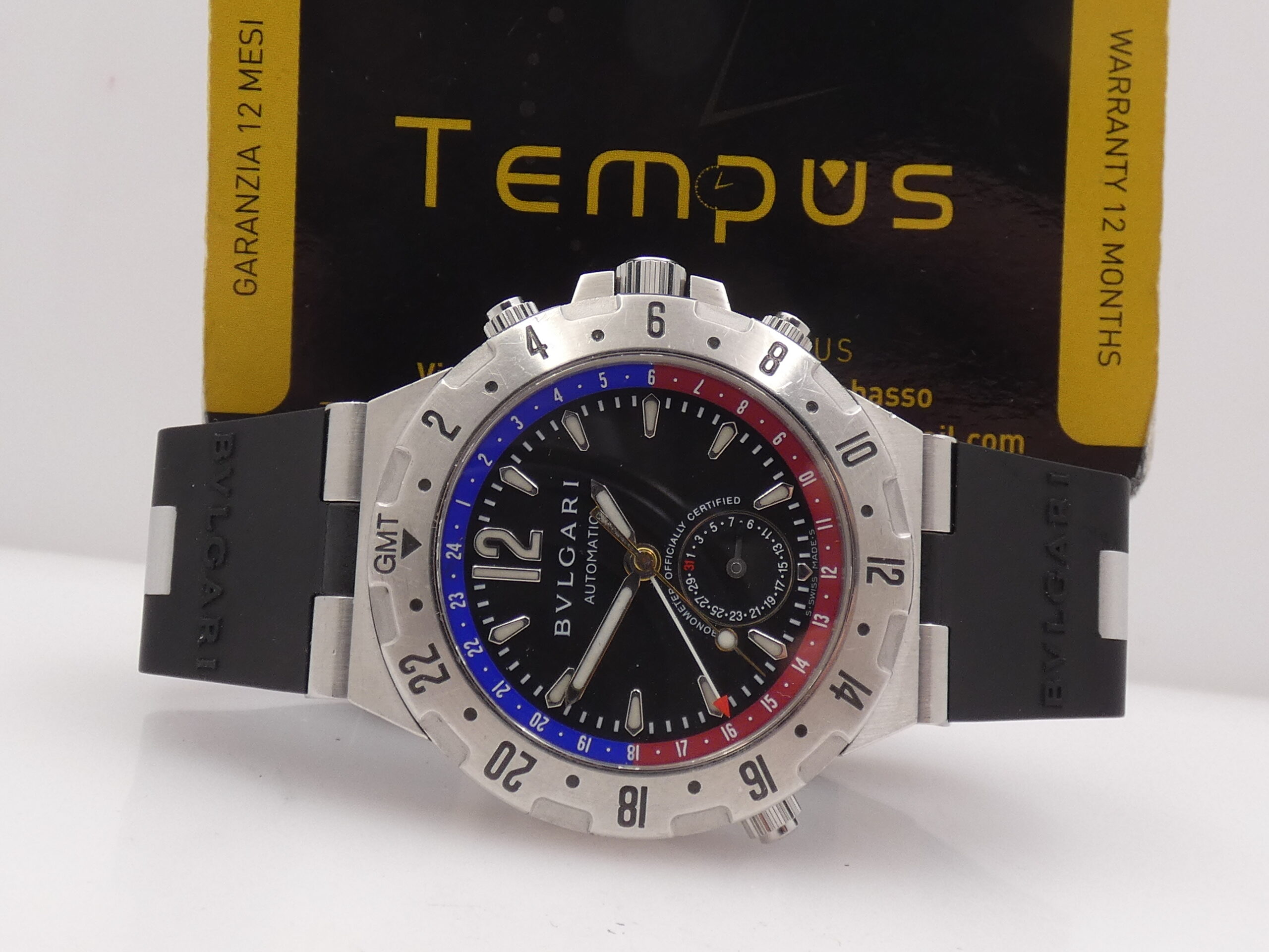 Quadrante: nero, con indici dauphine e arabo al 12, in acciaio e trattati con materiale luminescente, lancette a spada in acciaio, anch’esse luminescenti, secondi continui al centro, datario al 6 con rimessa rapida in corona tramite pulsante all’8, indicazione del GMT tramite freccia bianca con punta rossa, scala sessantesimale, indicazione delle 24 ore sul rehaut, logo Bulgari al 12