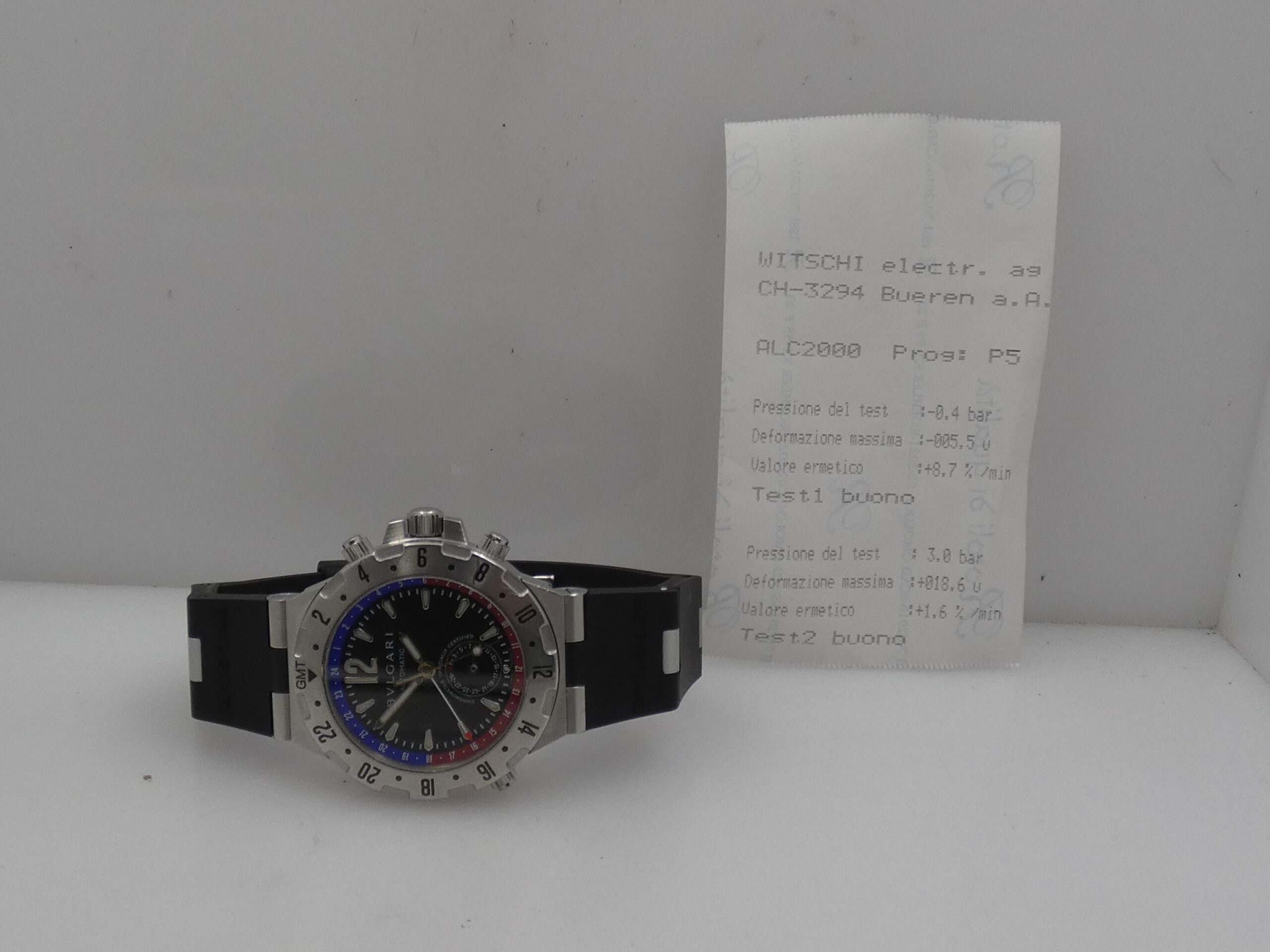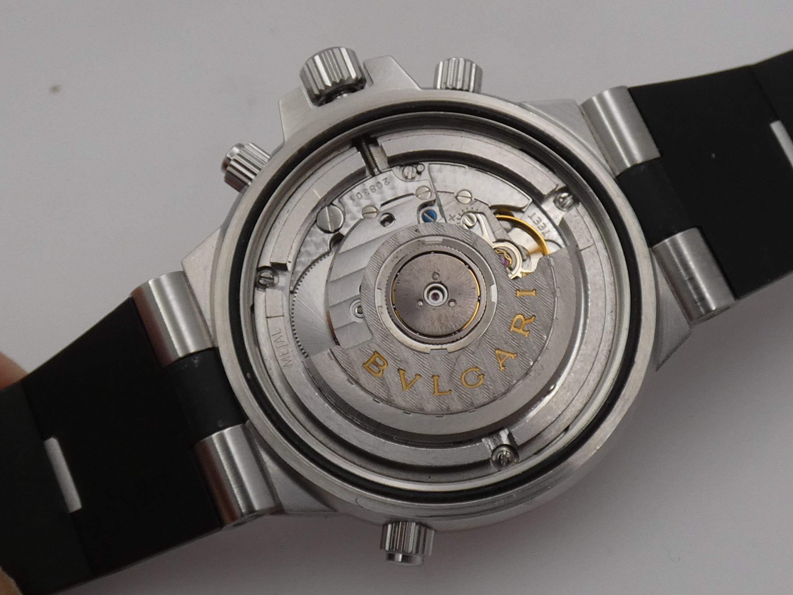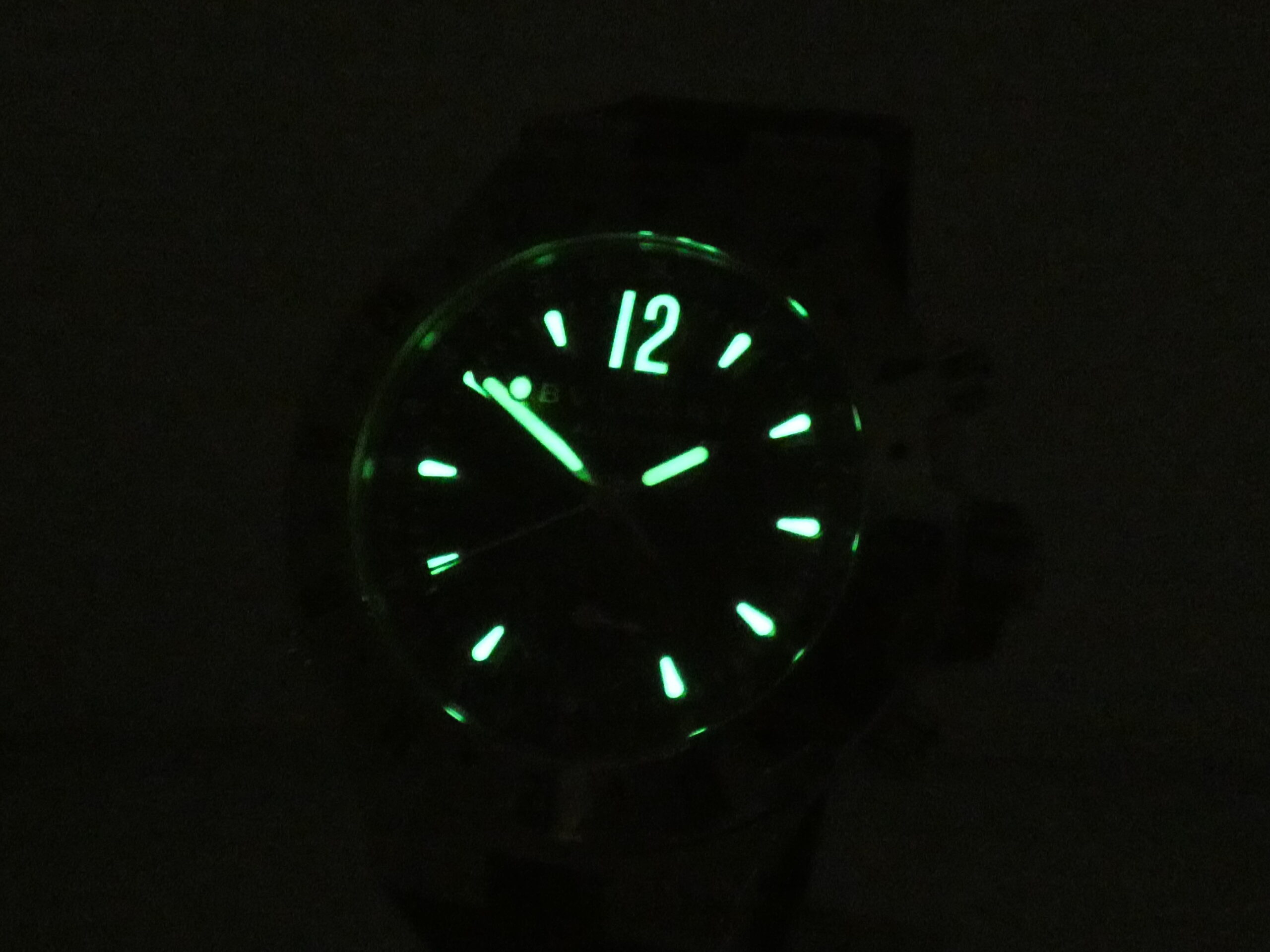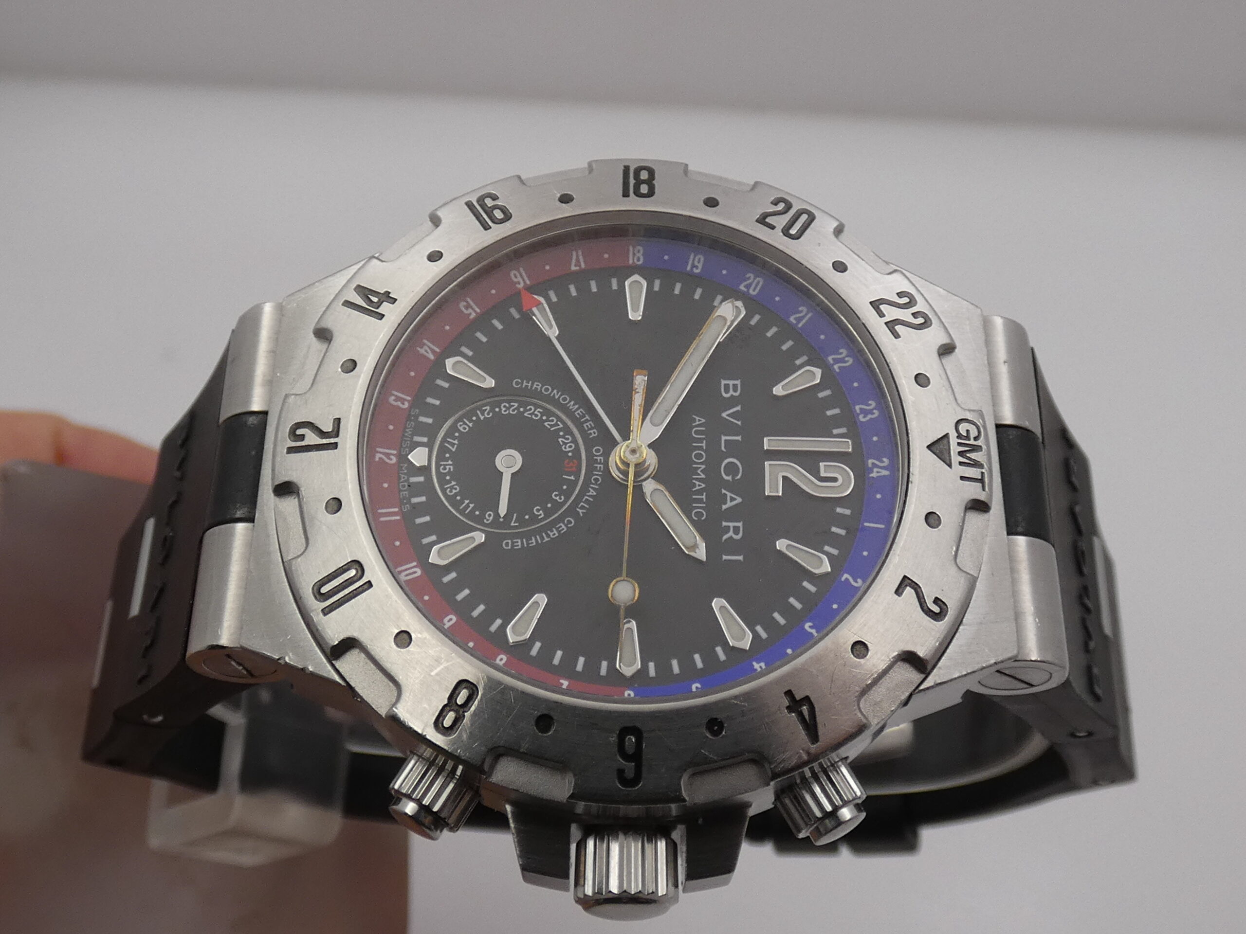 Quadrante: nero, con indici dauphine e arabo al 12, in acciaio e trattati con materiale luminescente, lancette a spada in acciaio, anch’esse luminescenti, secondi continui al centro, datario al 6 con rimessa rapida in corona tramite pulsante all’8, indicazione del GMT tramite freccia bianca con punta rossa, scala sessantesimale, indicazione delle 24 ore sul rehaut, logo Bulgari al 12