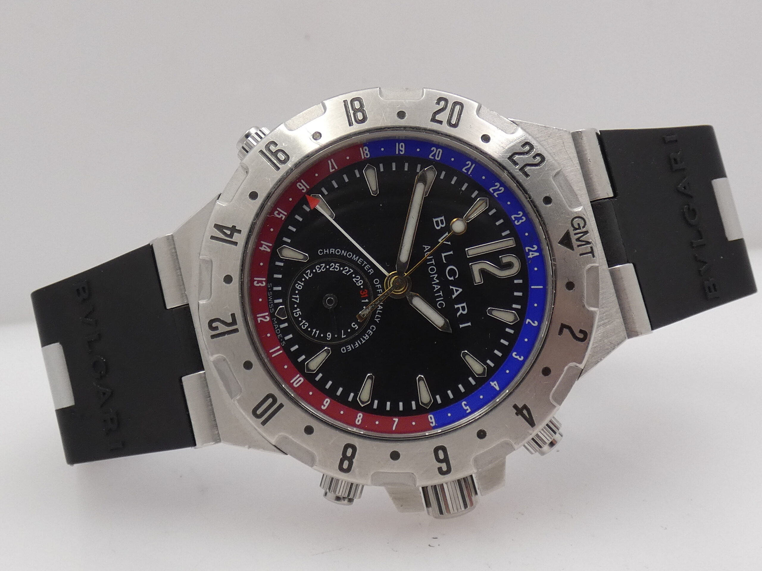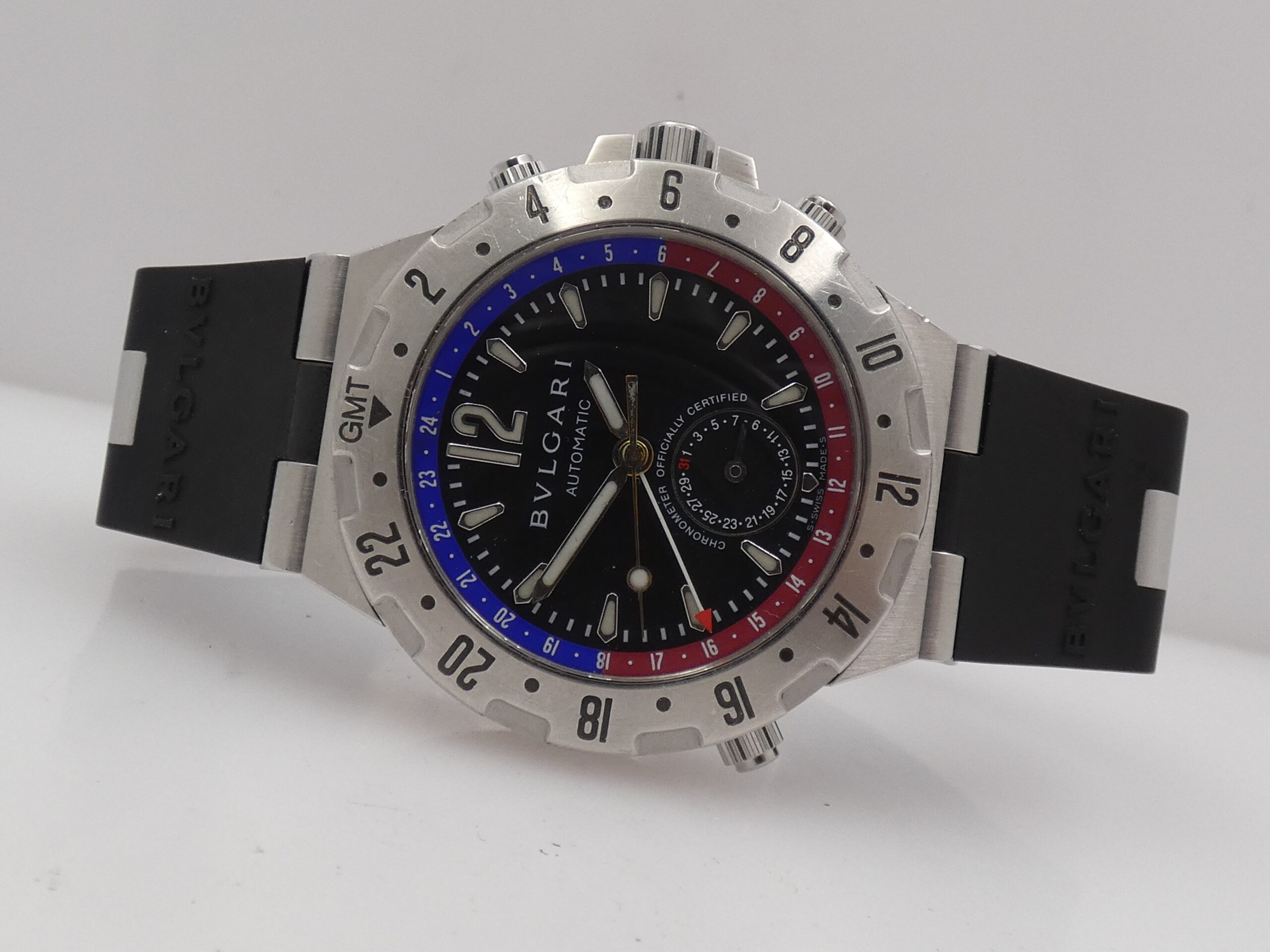 Dial: black, with dauphine and Arabic indexes at 12, in steel and treated with luminescent material, sword hands in steel, also luminescent, continuous seconds in the center, date at 6 display with quick reset in the crown via a button at 8, GMT indication via a white arrow with a red tip, sextensimal scale, 24-hour indication on the flange, Bulgari logo at 12