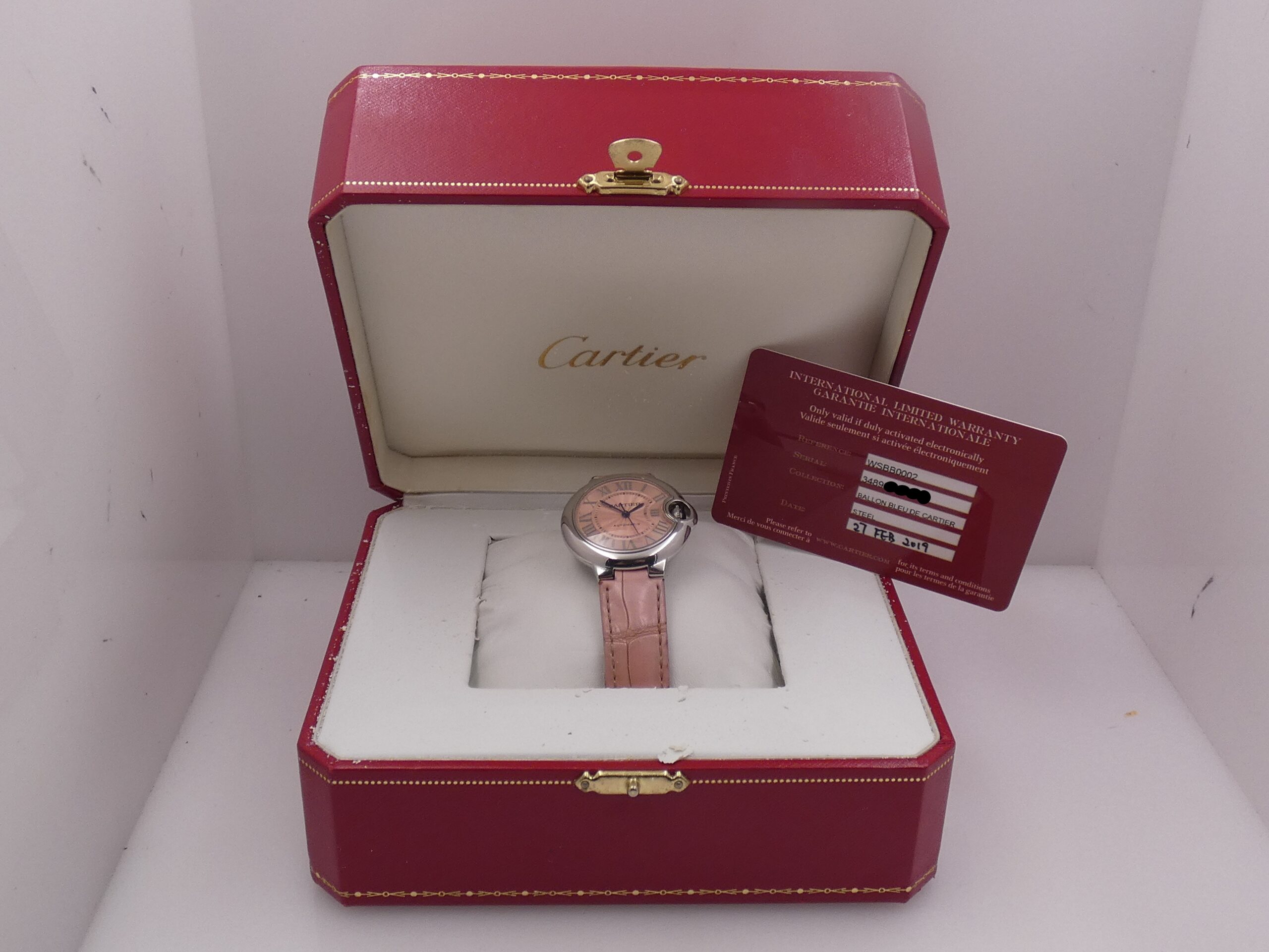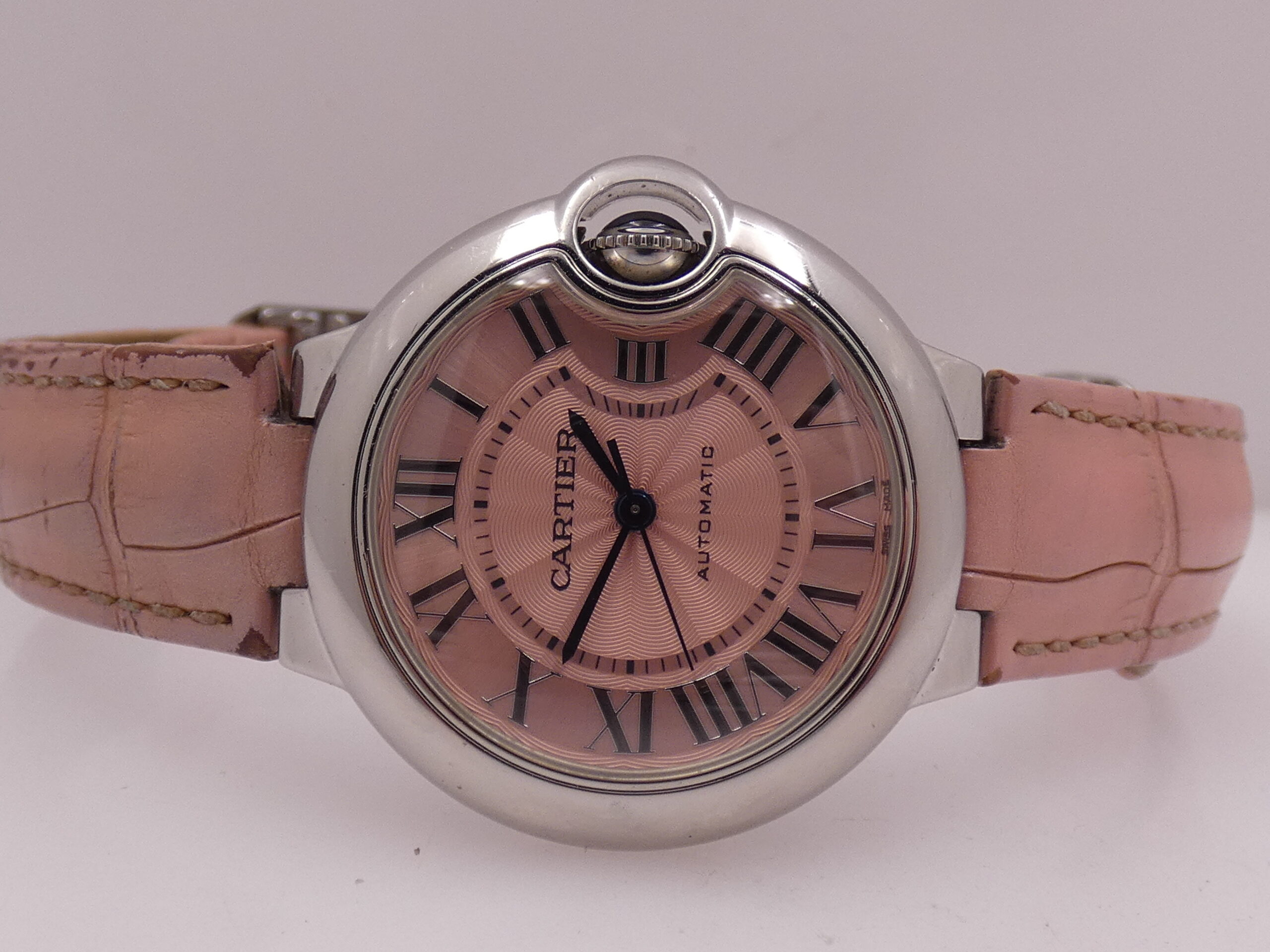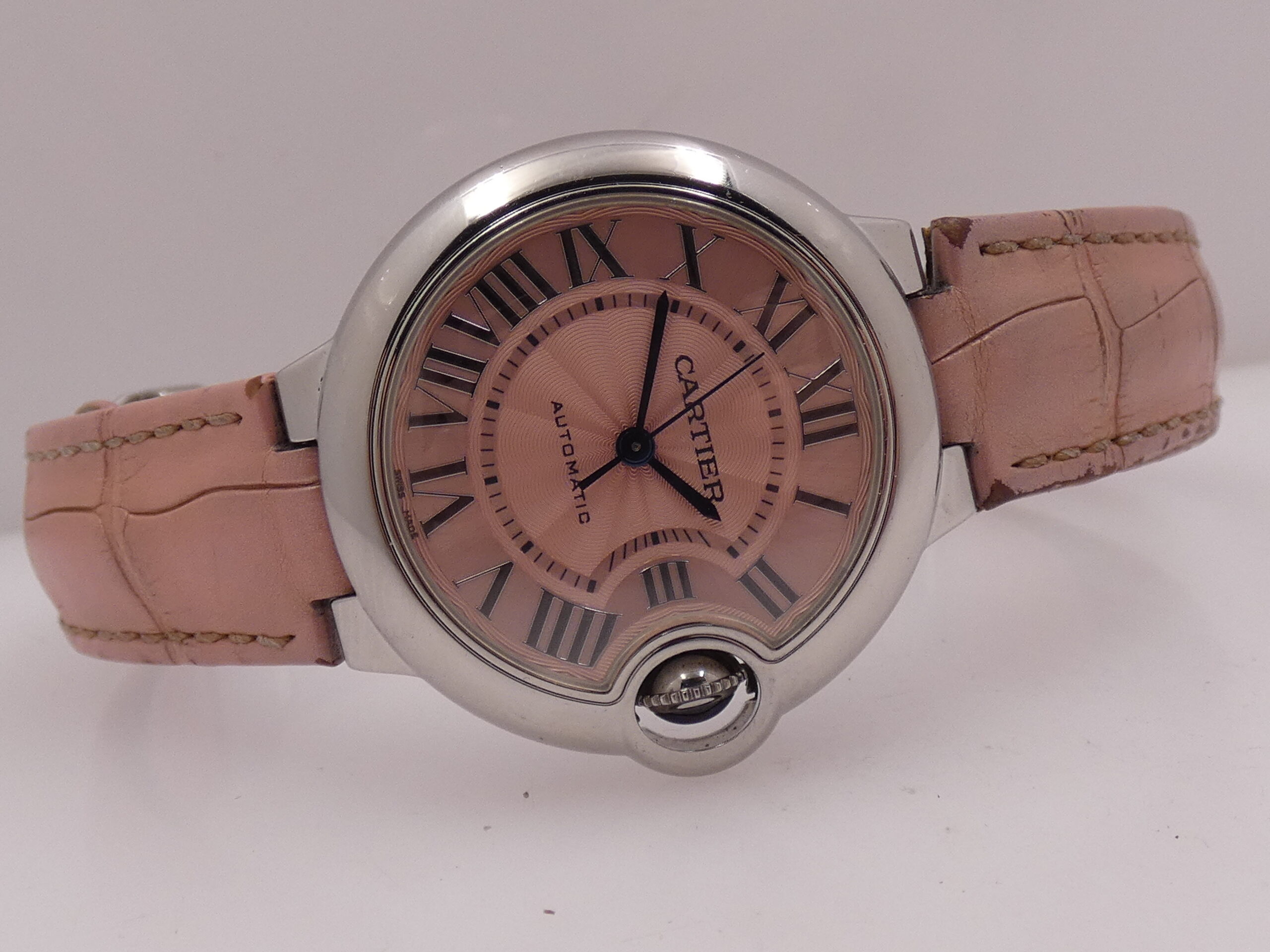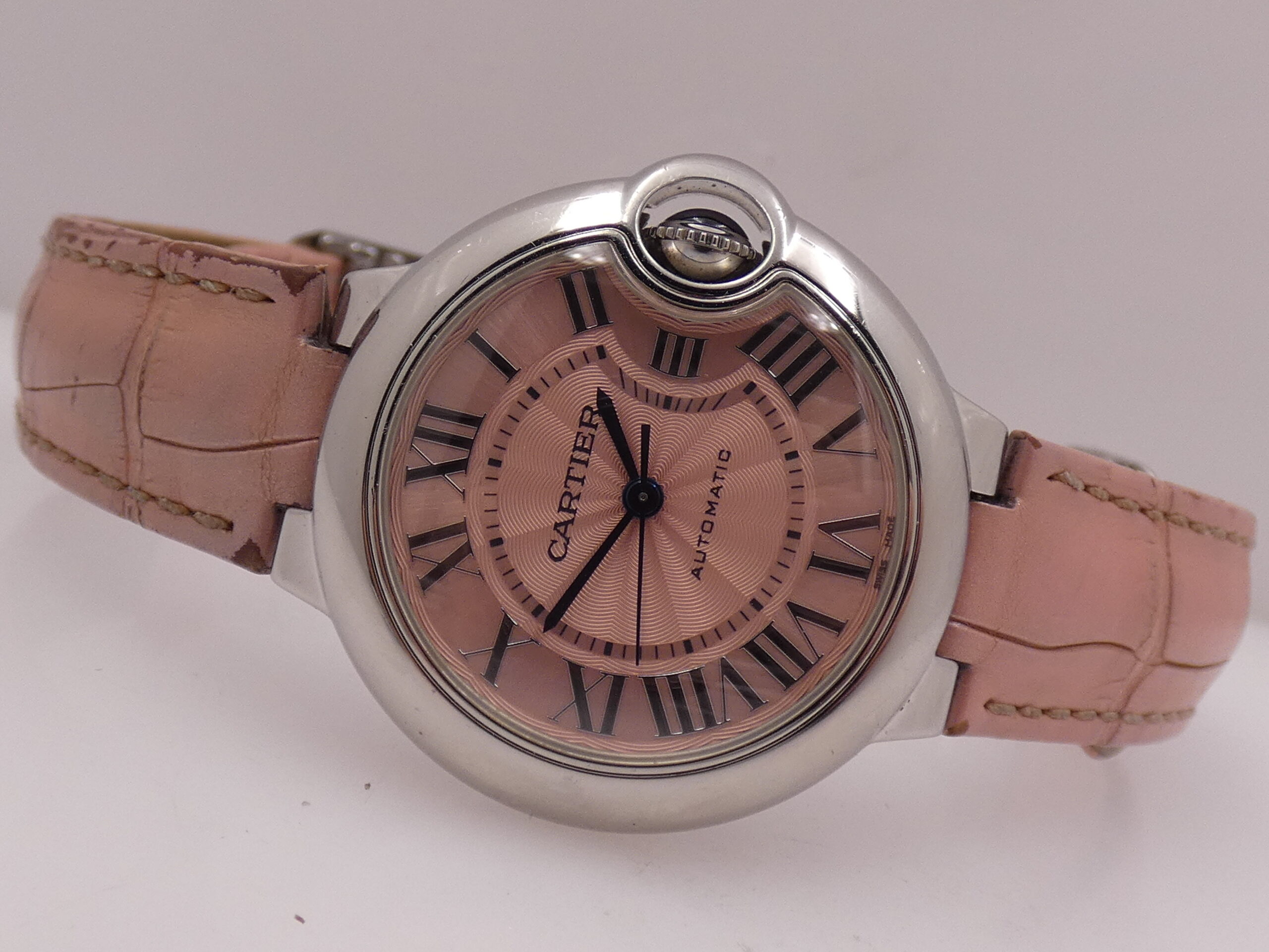 Dial: Pink, central wave-patterned sunray dial, raised steel Roman numerals, blued steel sword hands, center seconds hand, 60-minute scale, Cartier logo at 12 o’clock