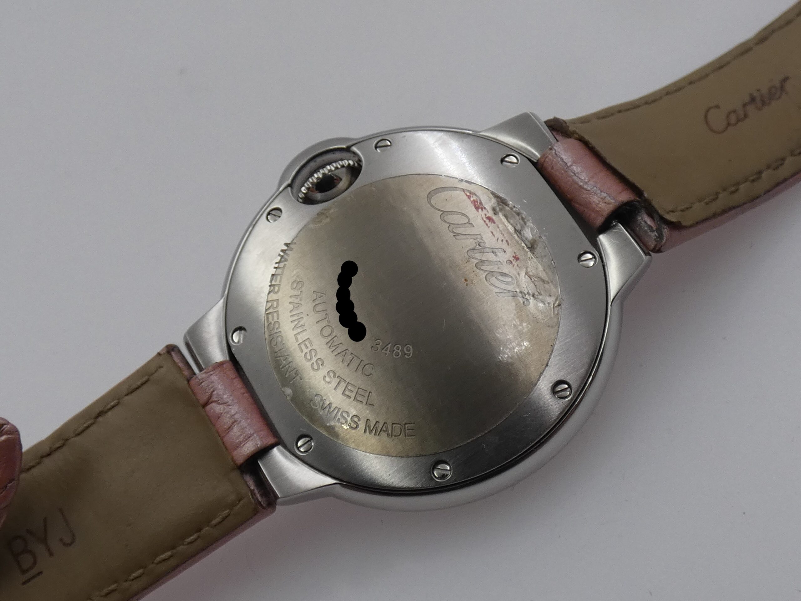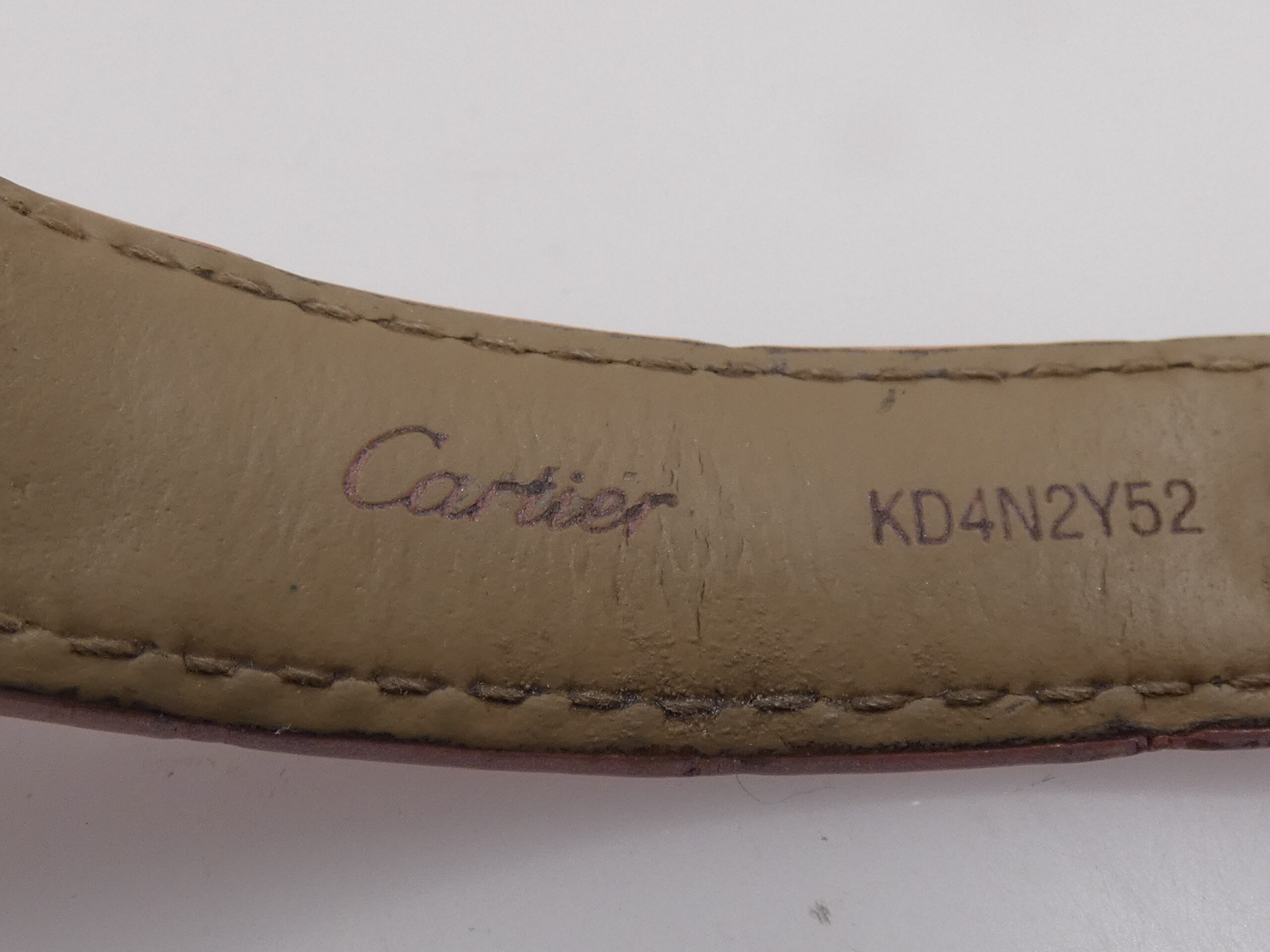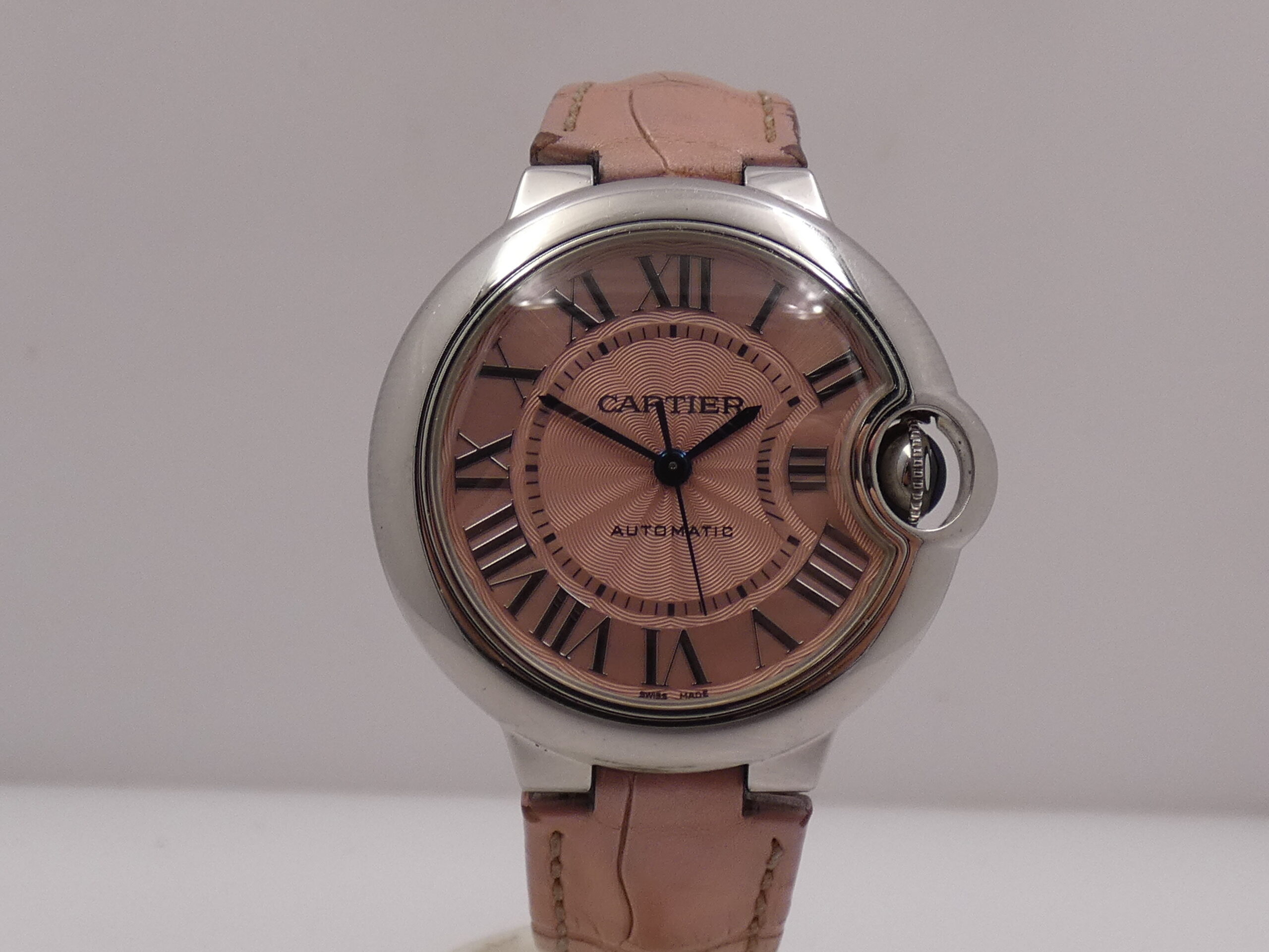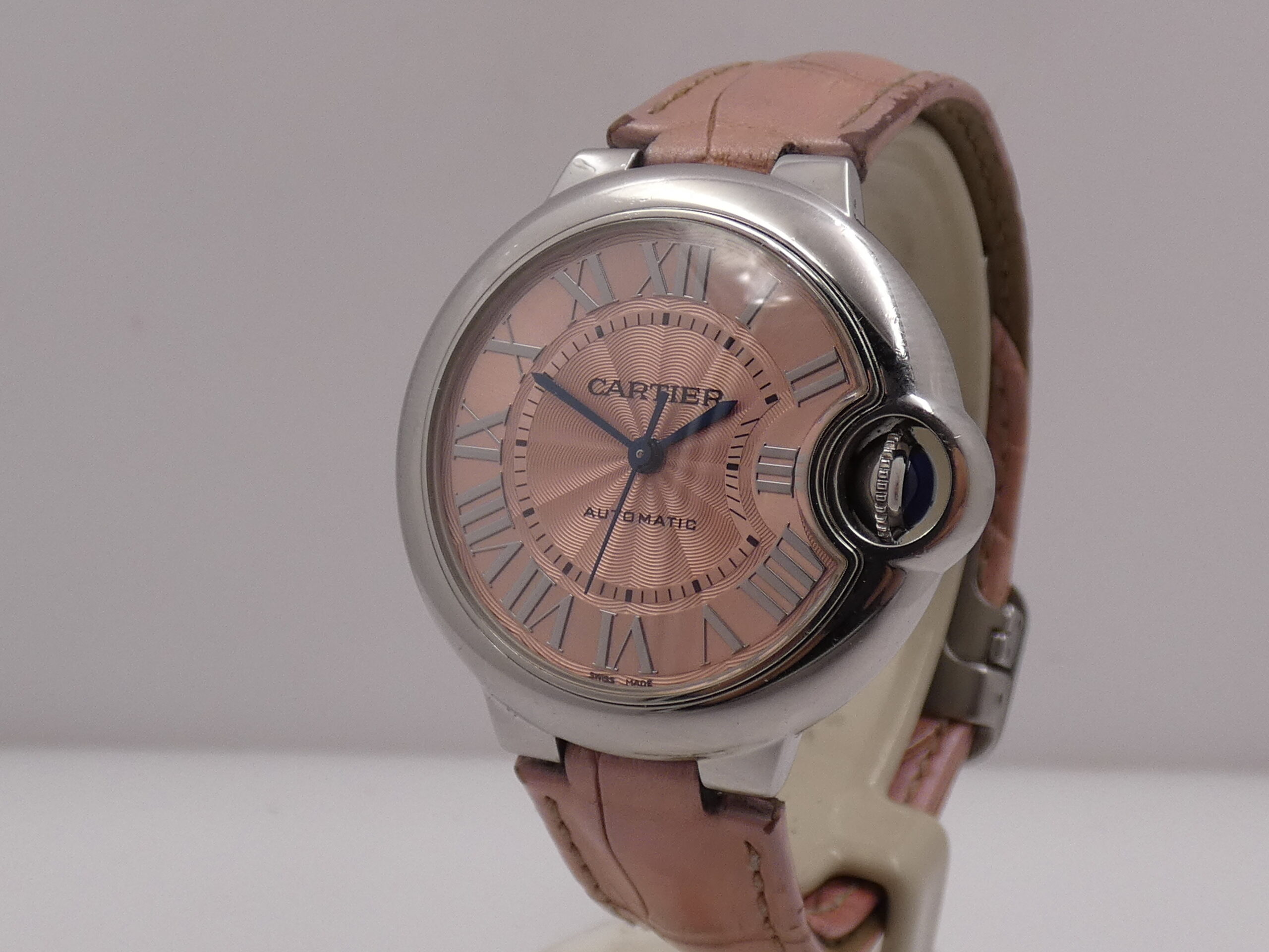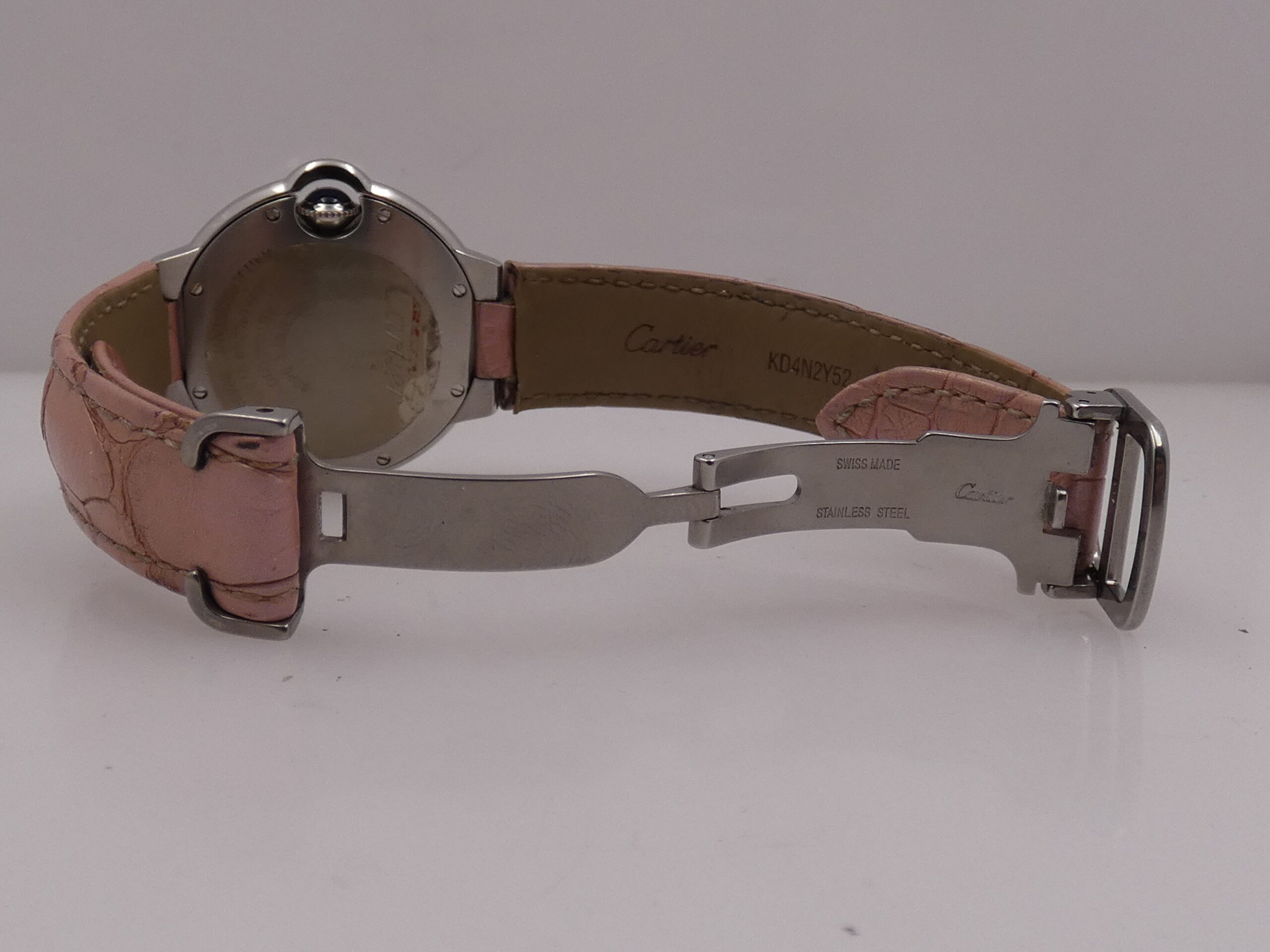 Dial: Pink, central wave-patterned sunray dial, raised steel Roman numerals, blued steel sword hands, center seconds hand, 60-minute scale, Cartier logo at 12 o’clock