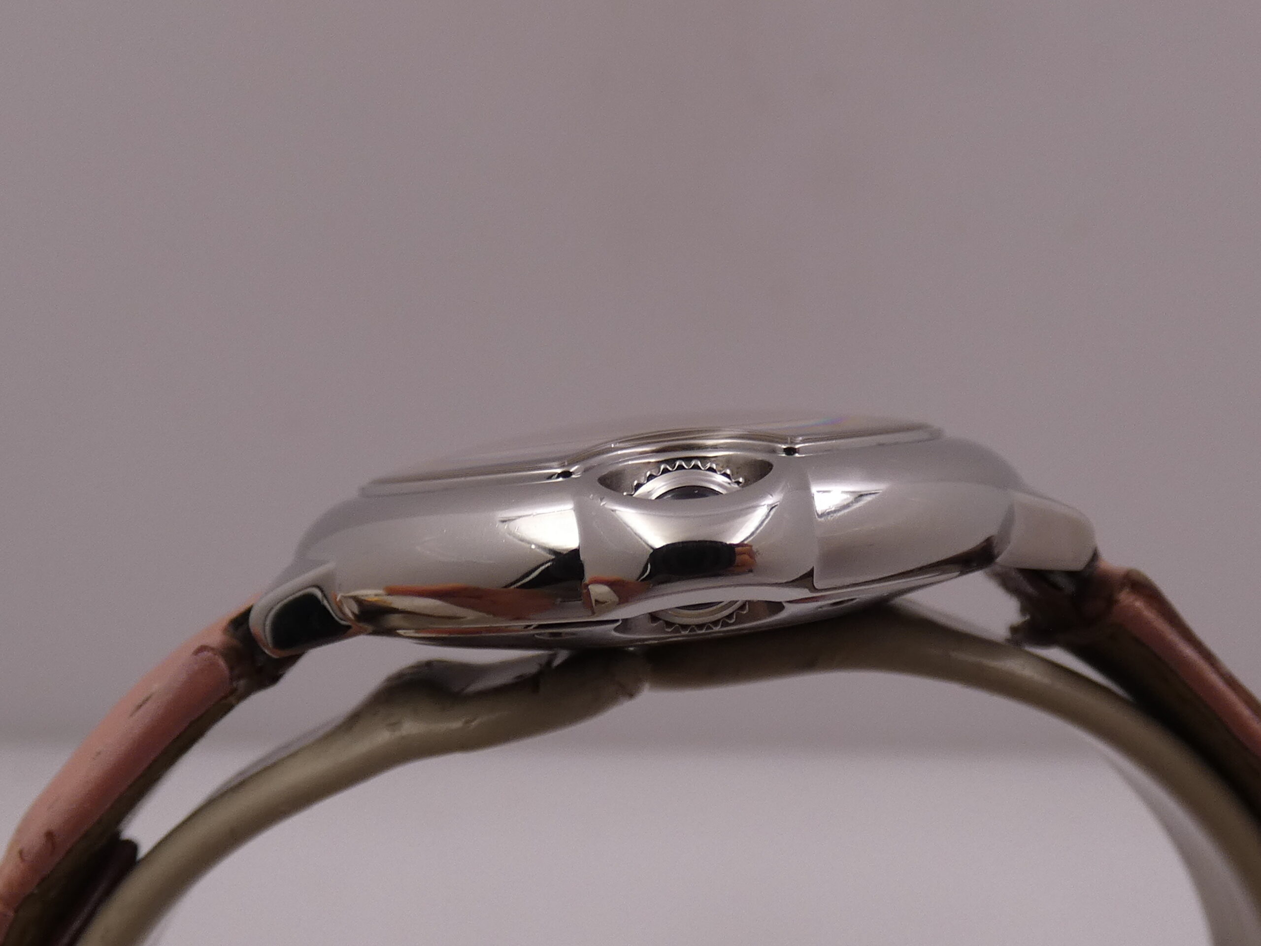 Quadrante: rosa, zona centrale lavorata ad onde con effetto soleil, indici romani in acciaio ed in rilievo, lancette a spada in acciaio azzurrato, secondi al centro, scala sessantesimale, logo Cartier al 12