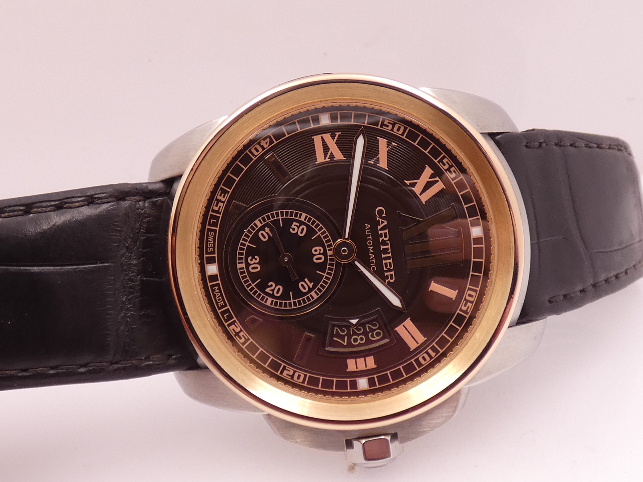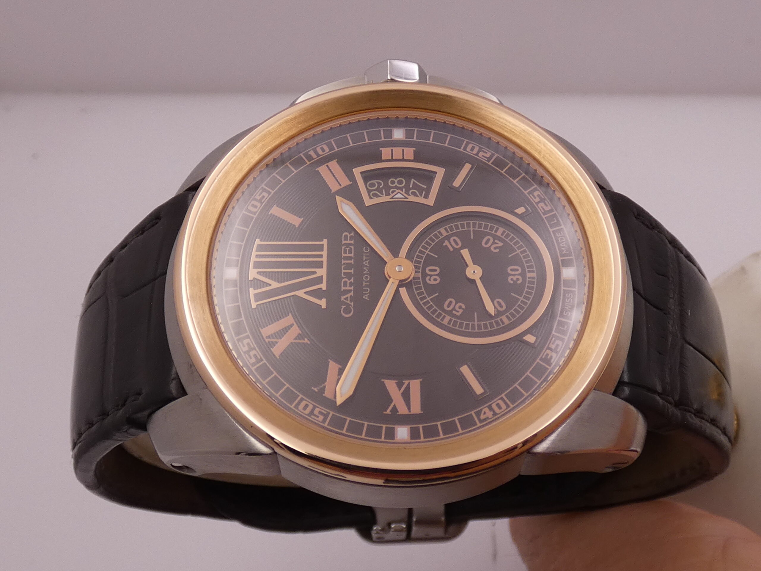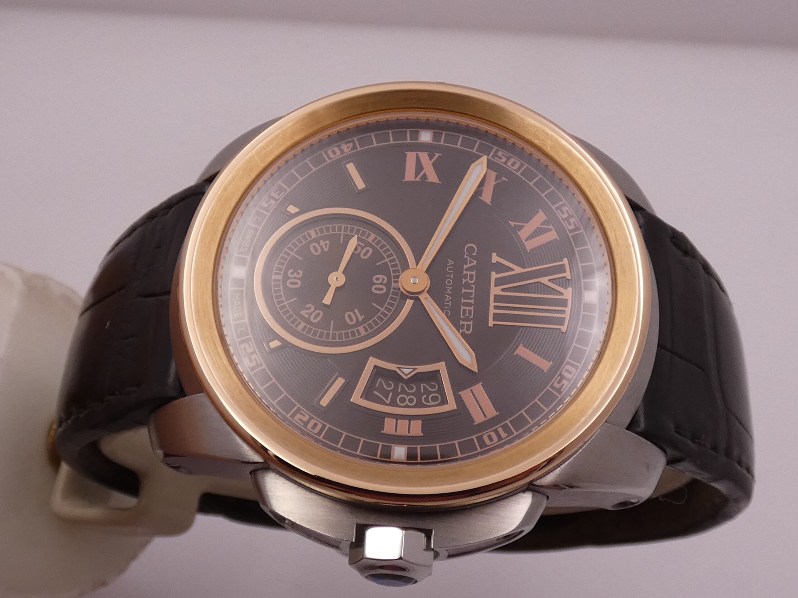Quadrante: chocolate, con meravigliosa lavorazione circulaire, indici romani, barrette dal 4 all’8, punti luminescenti a quarti in corrispondenza, lancette a spada in acciaio brunito e trattate con materiale luminescente Luminova, secondiera al 6 con scala sessantesimale Chemin De Fer, datario al 3 con rimessa rapida in corona, scala sessantesimale Chemin De Fer, logo Cartier al 12