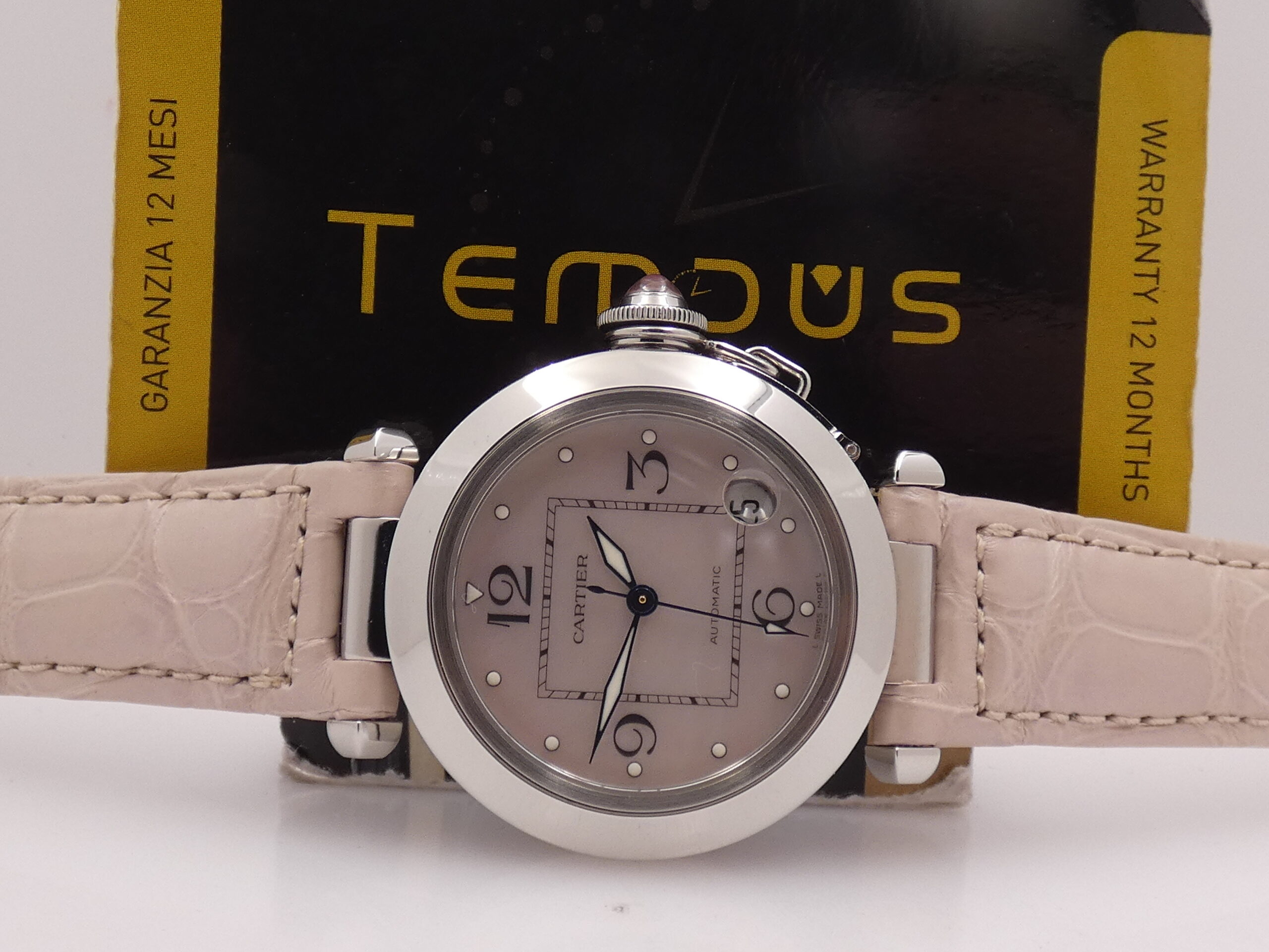 Quadrante: rosa madreperla, con arabi a quarti e punti luminescenti in corispondenza, lancette a foglia azzurrate trattate con materiale luminescente, secondi al centro, datario tra il 4 e il 5 con rimessa rapida in corona, logo Cartier al 12