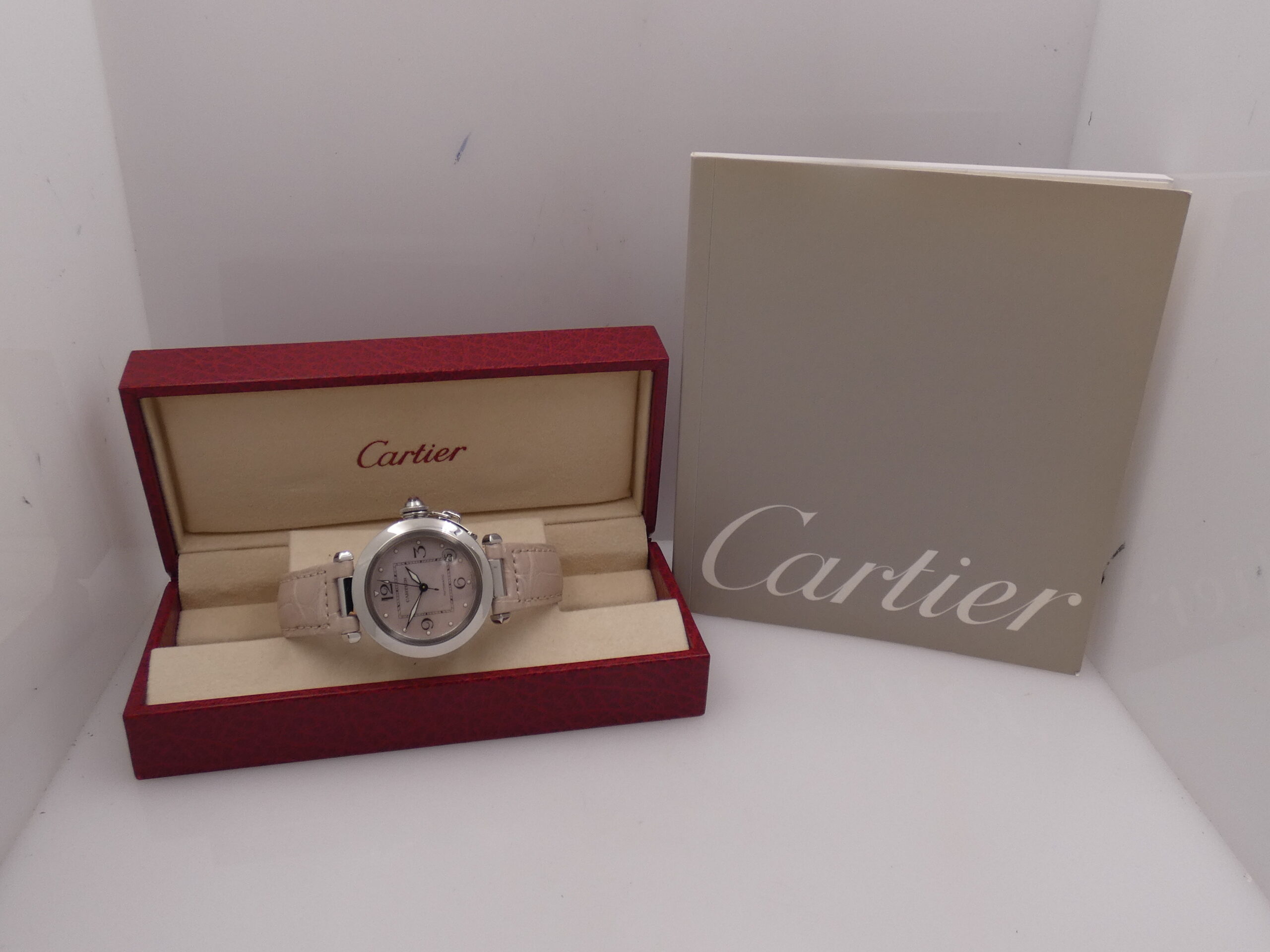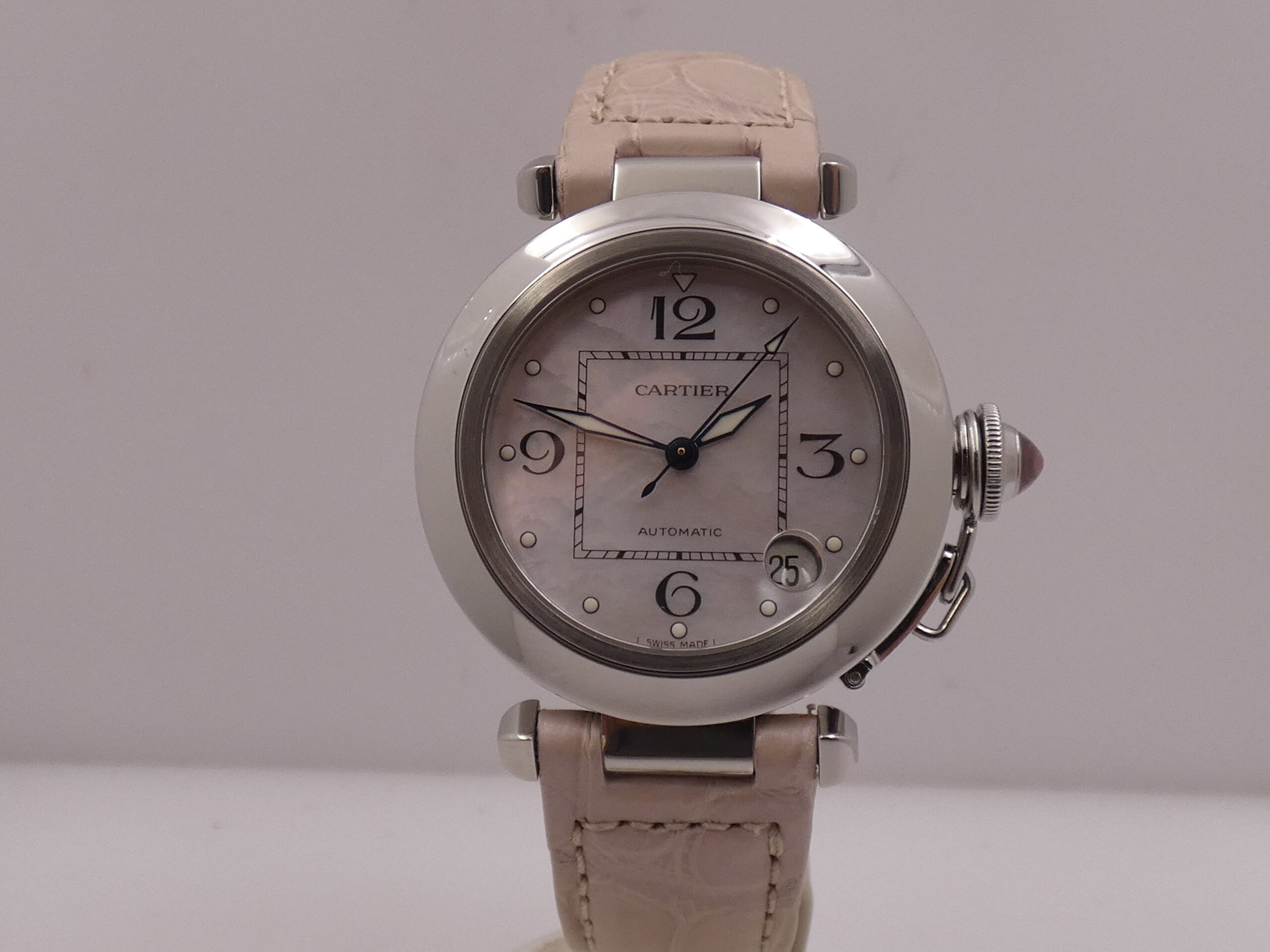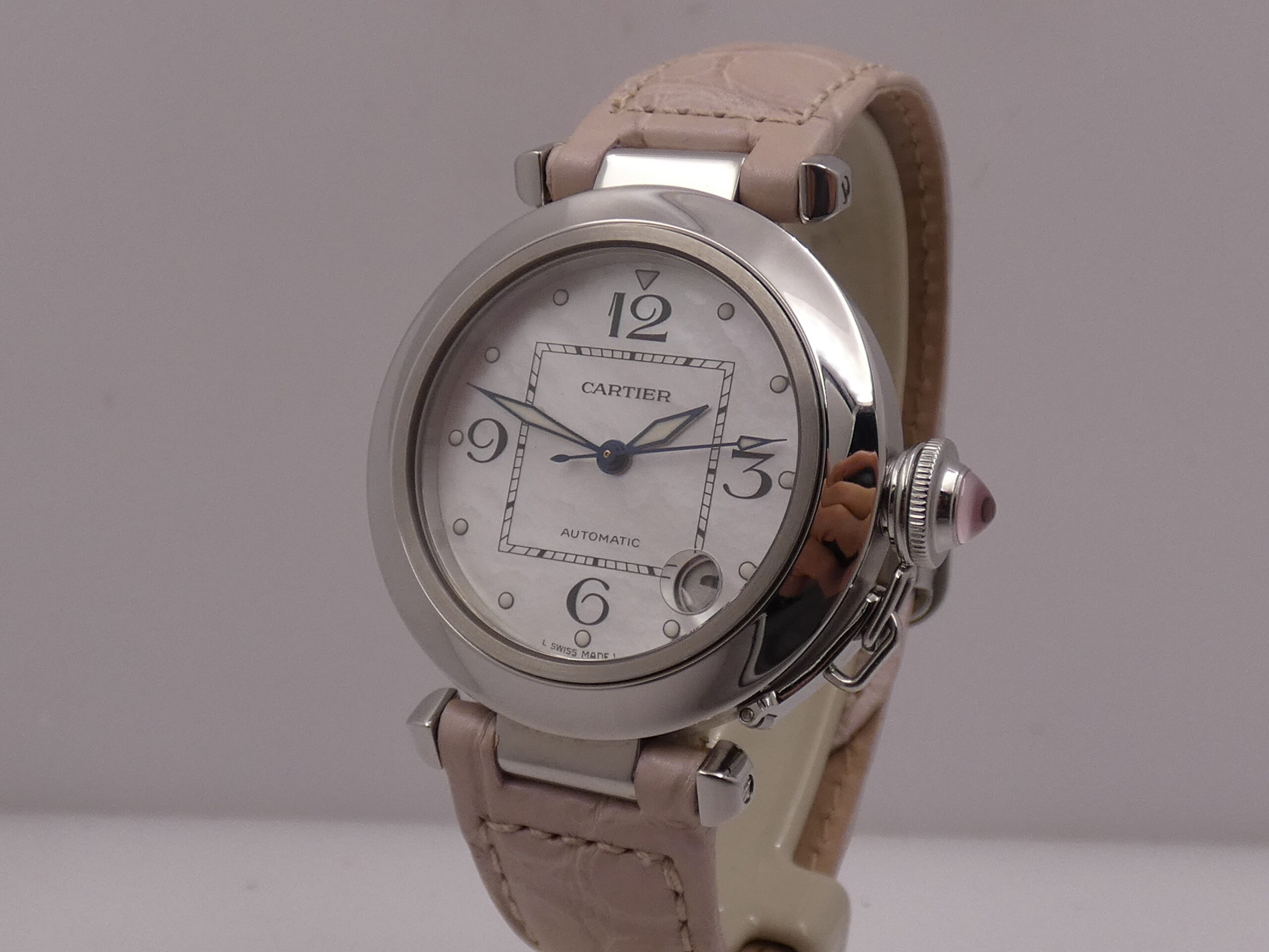 Dial: Pink mother-of-pearl, with luminescent quarter Arabic numerals and corresponding dots, blued leaf-shaped hands with luminescent material, center seconds, date display between 4 and 5 o’clock with quick-set crown, Cartier logo at 12 o’clock