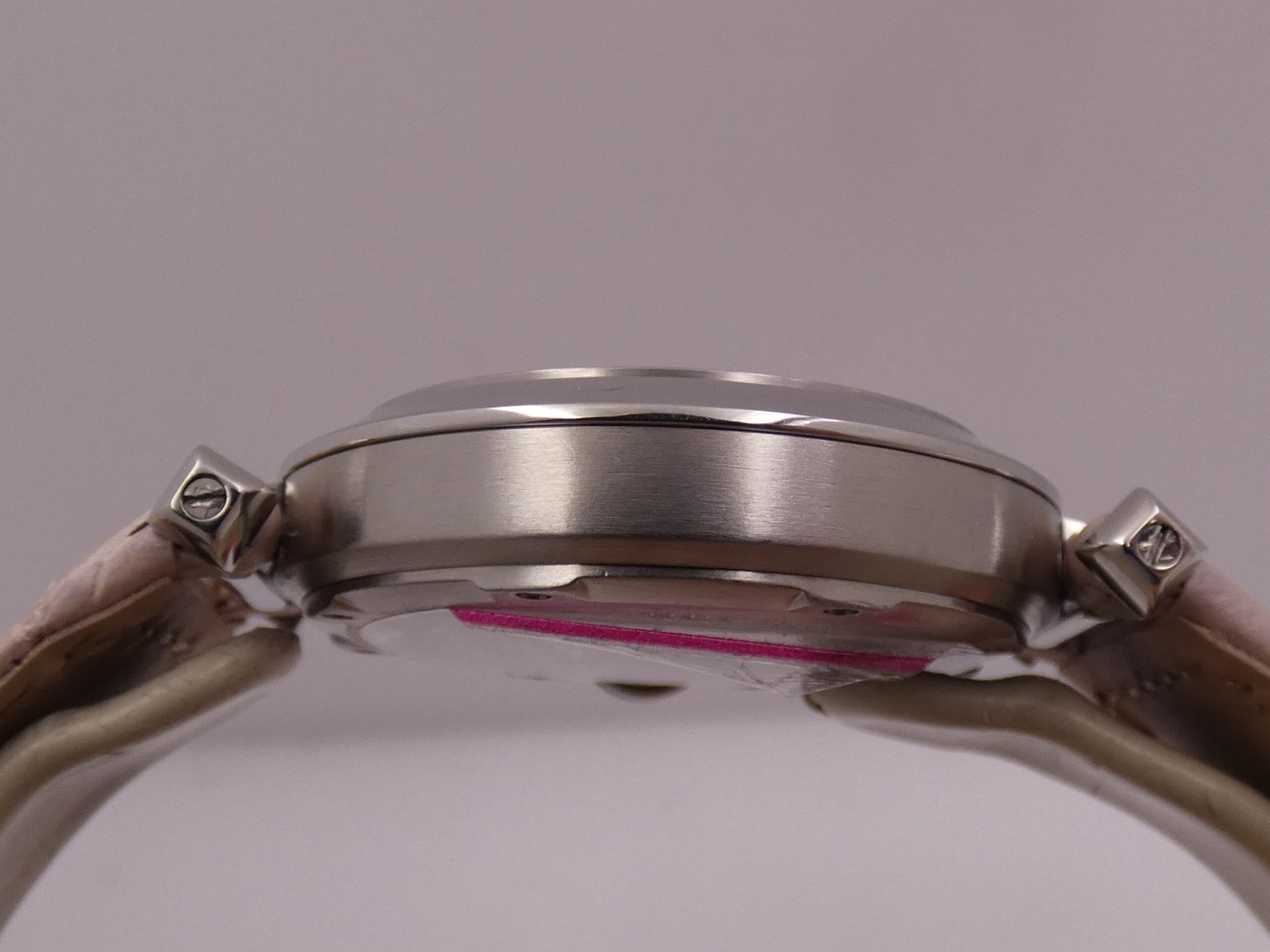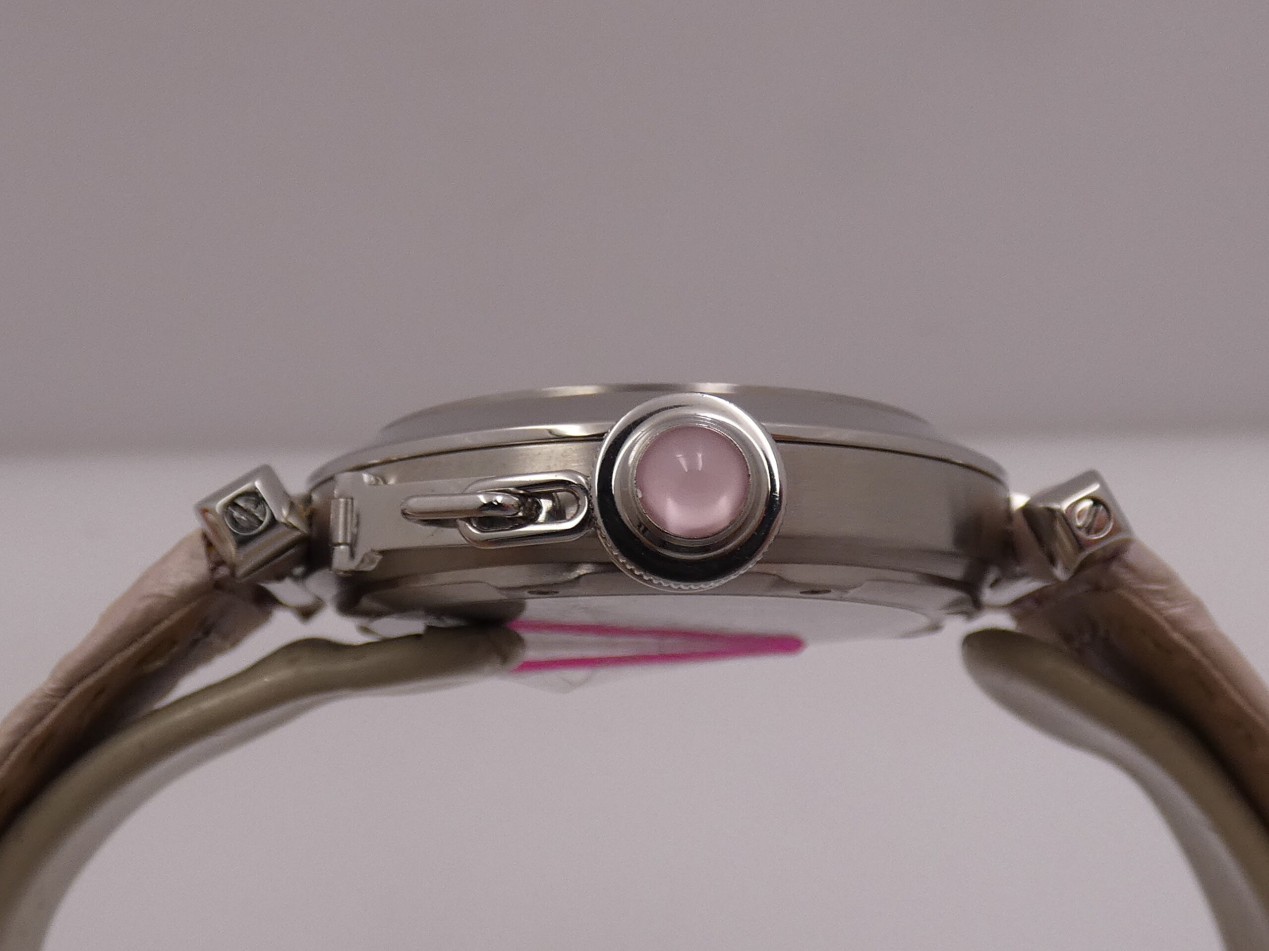 Crown: Original screw-down crown with a pink cabochon and the signature Cartier protective ring
