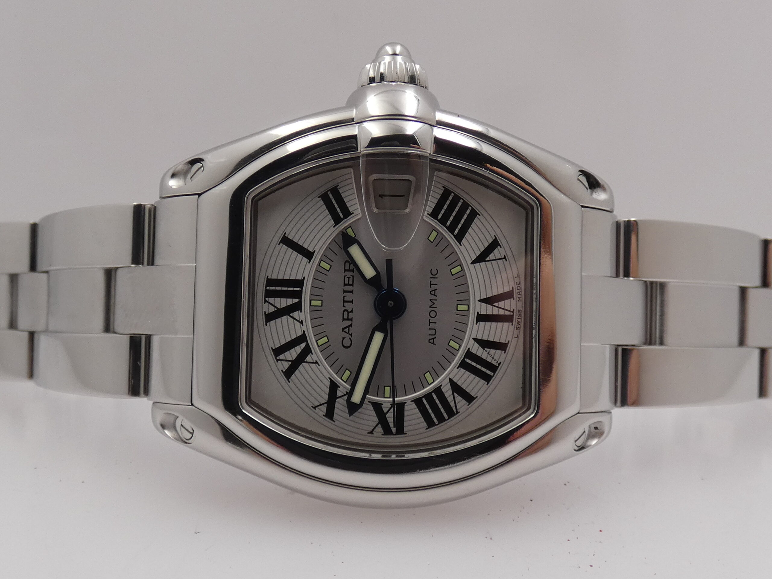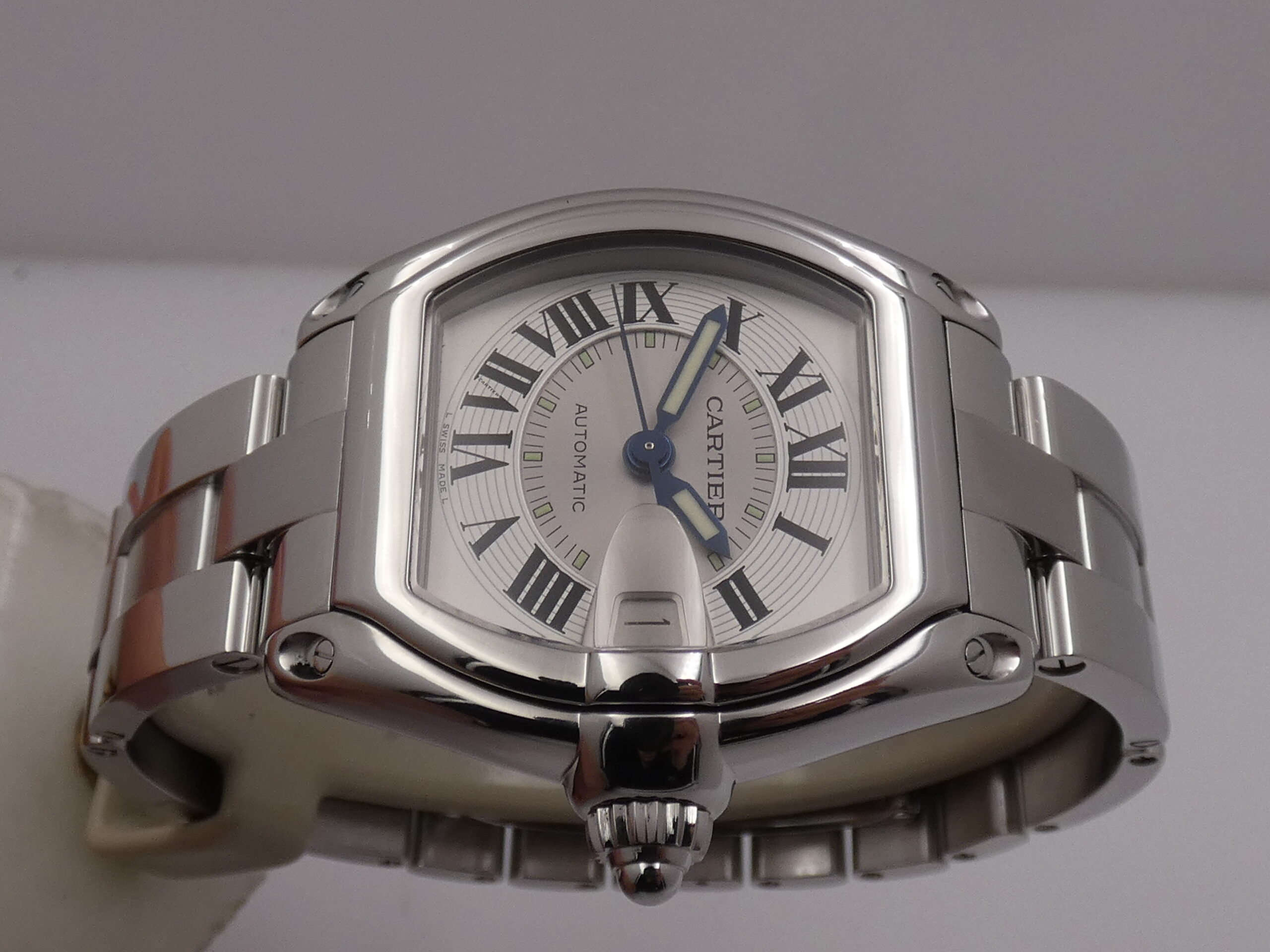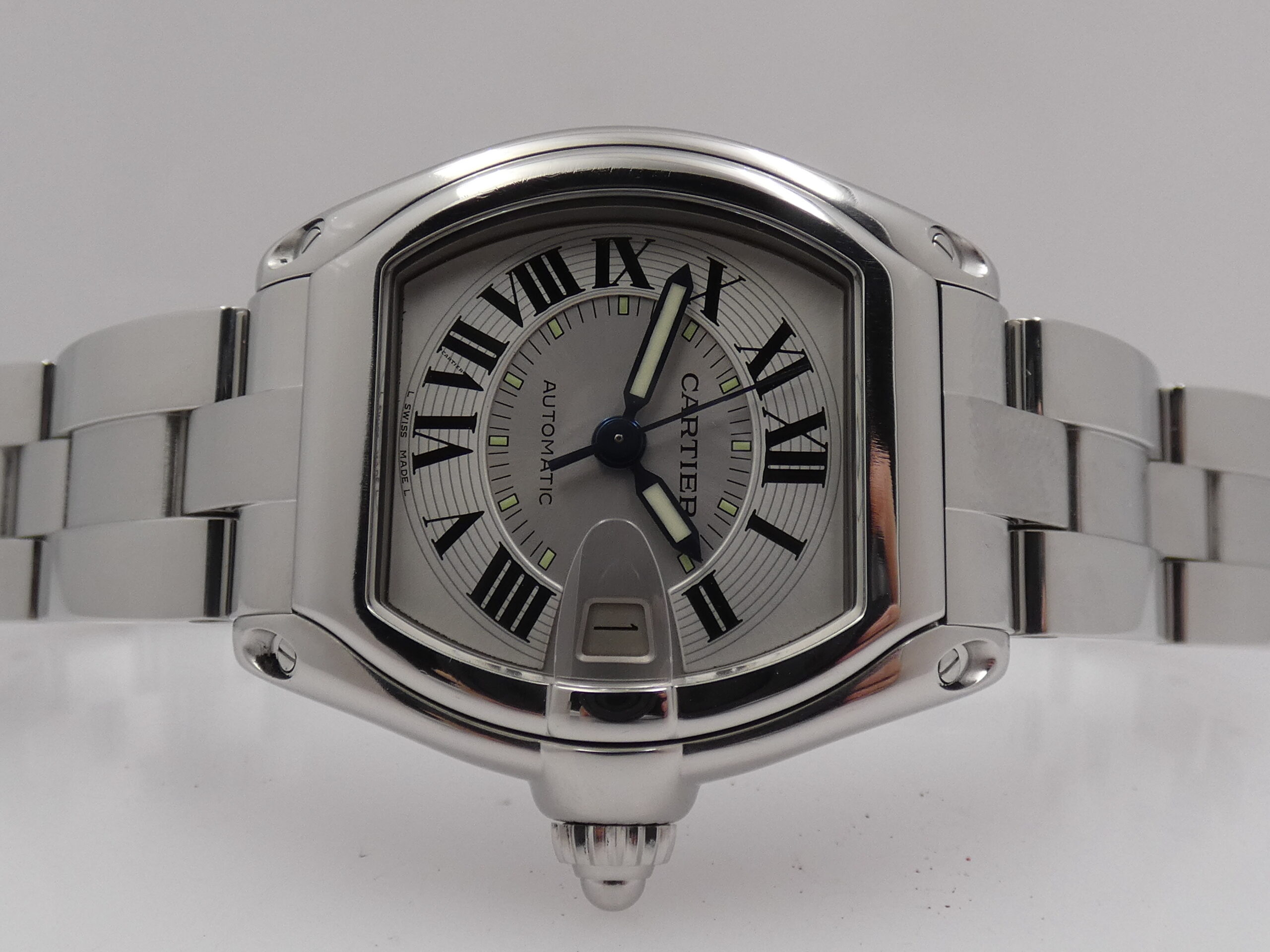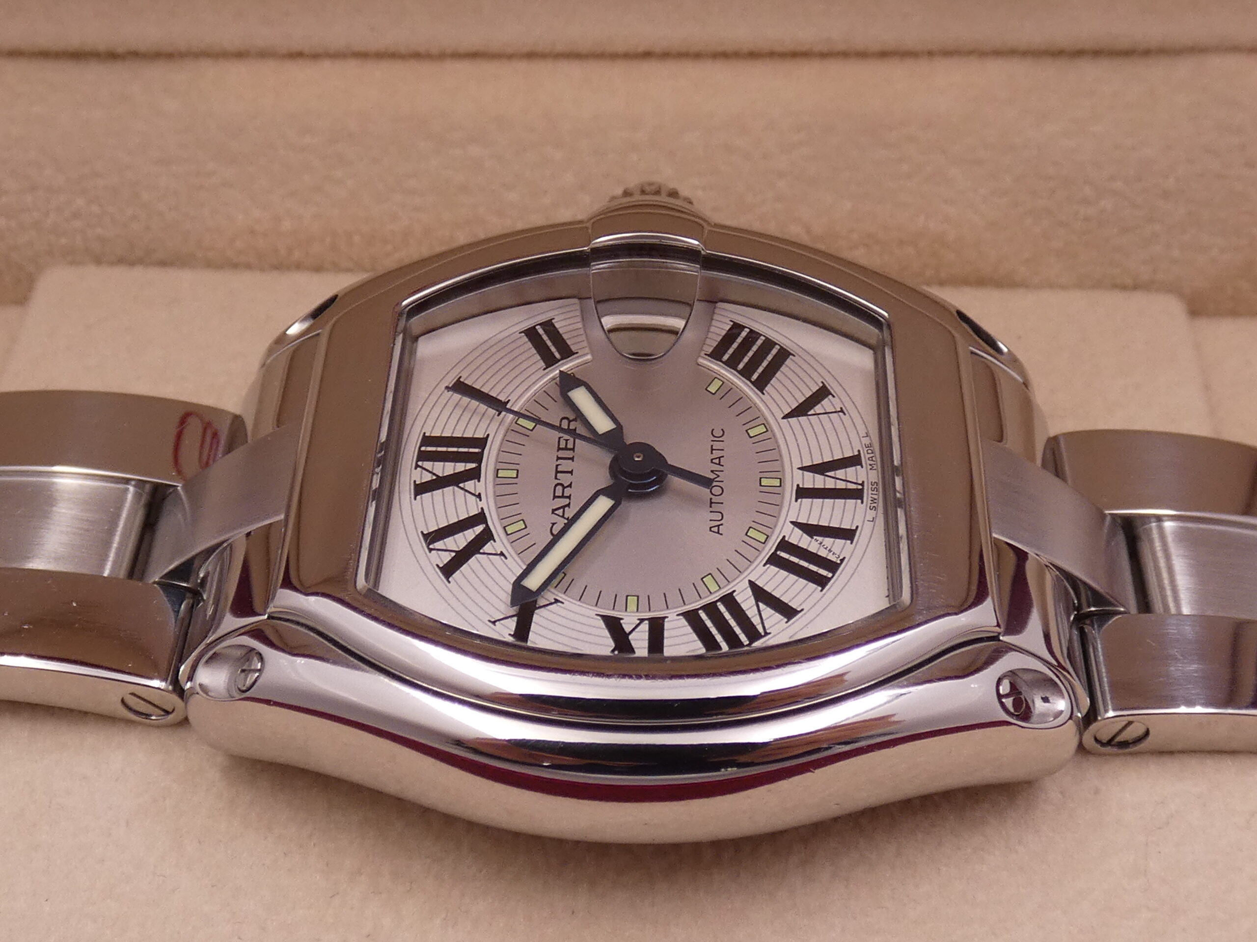Quadrante: argentè con zona centrale soleil, indici romani con punti Luminova in corrispondenza, lancette a spada azzurrate, anch’esse luminescenti, secondi al centro, datario al 3 con rimessa rapida in corona, scala sessantesimale centrale, logo Cartier al 12