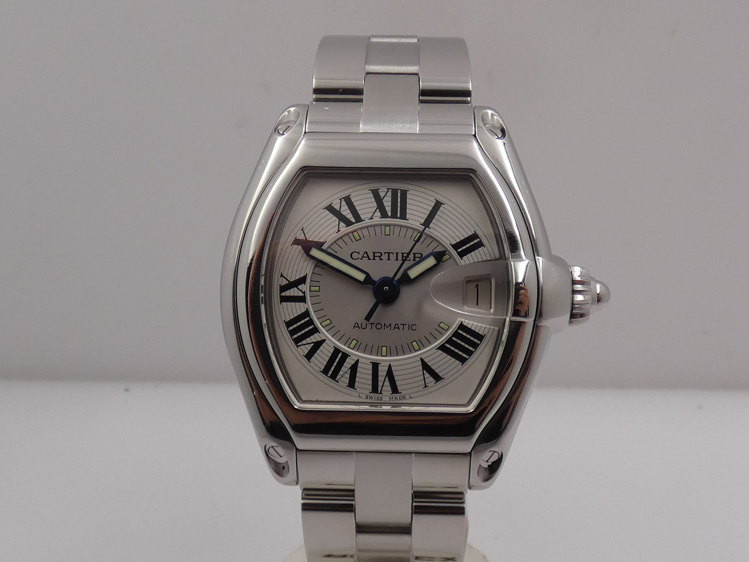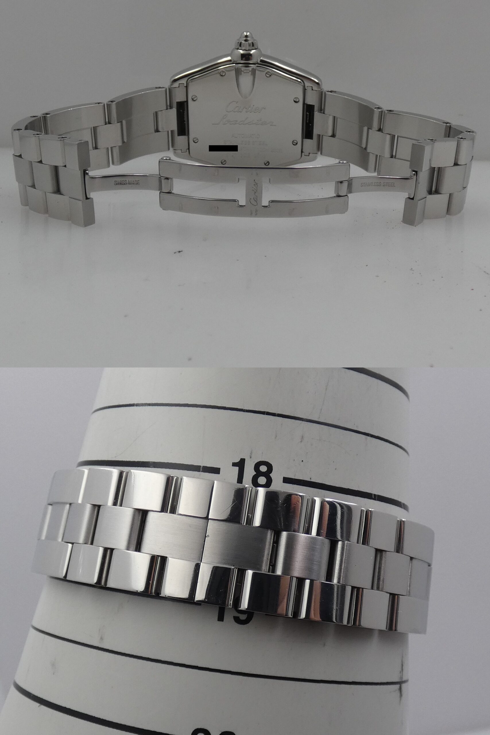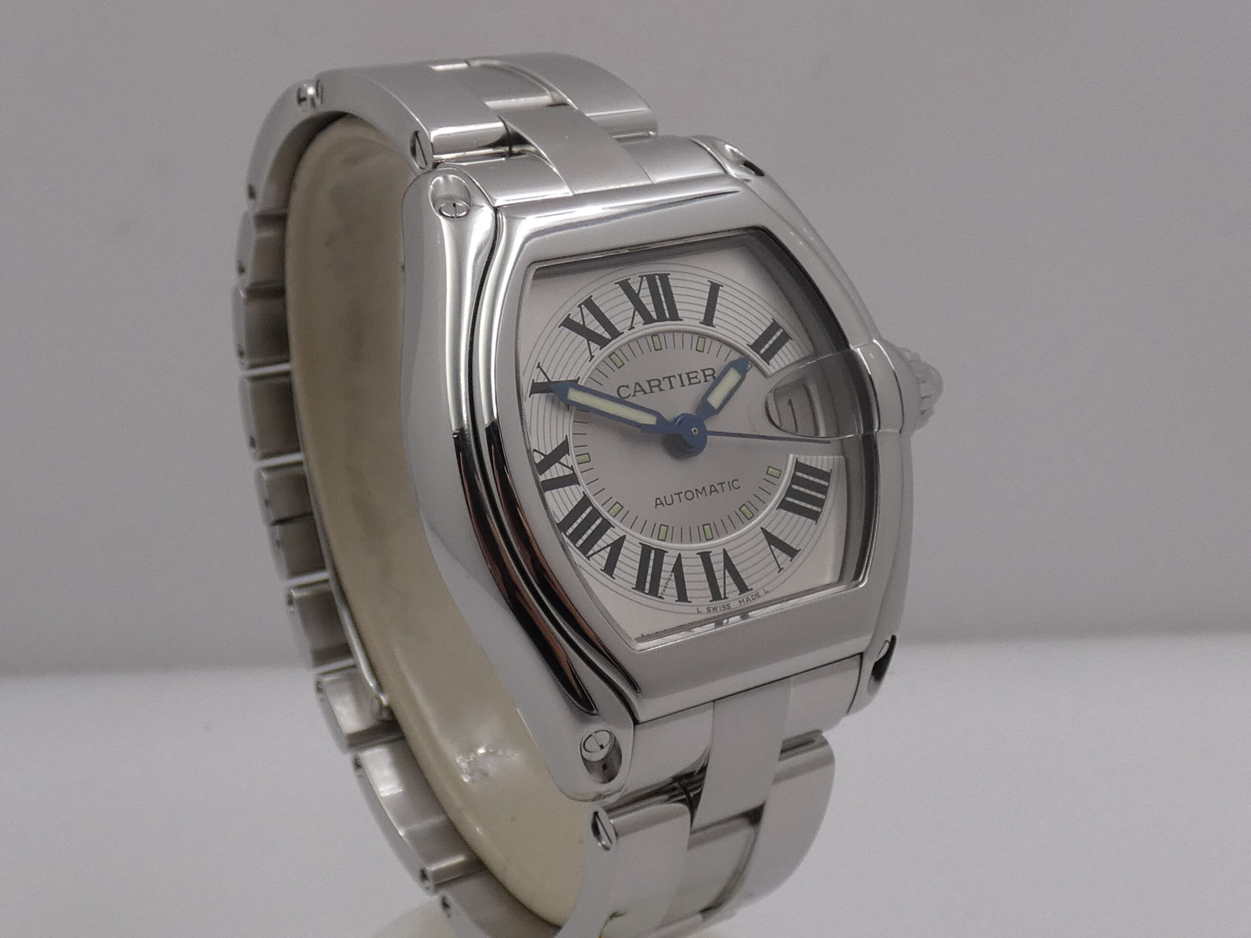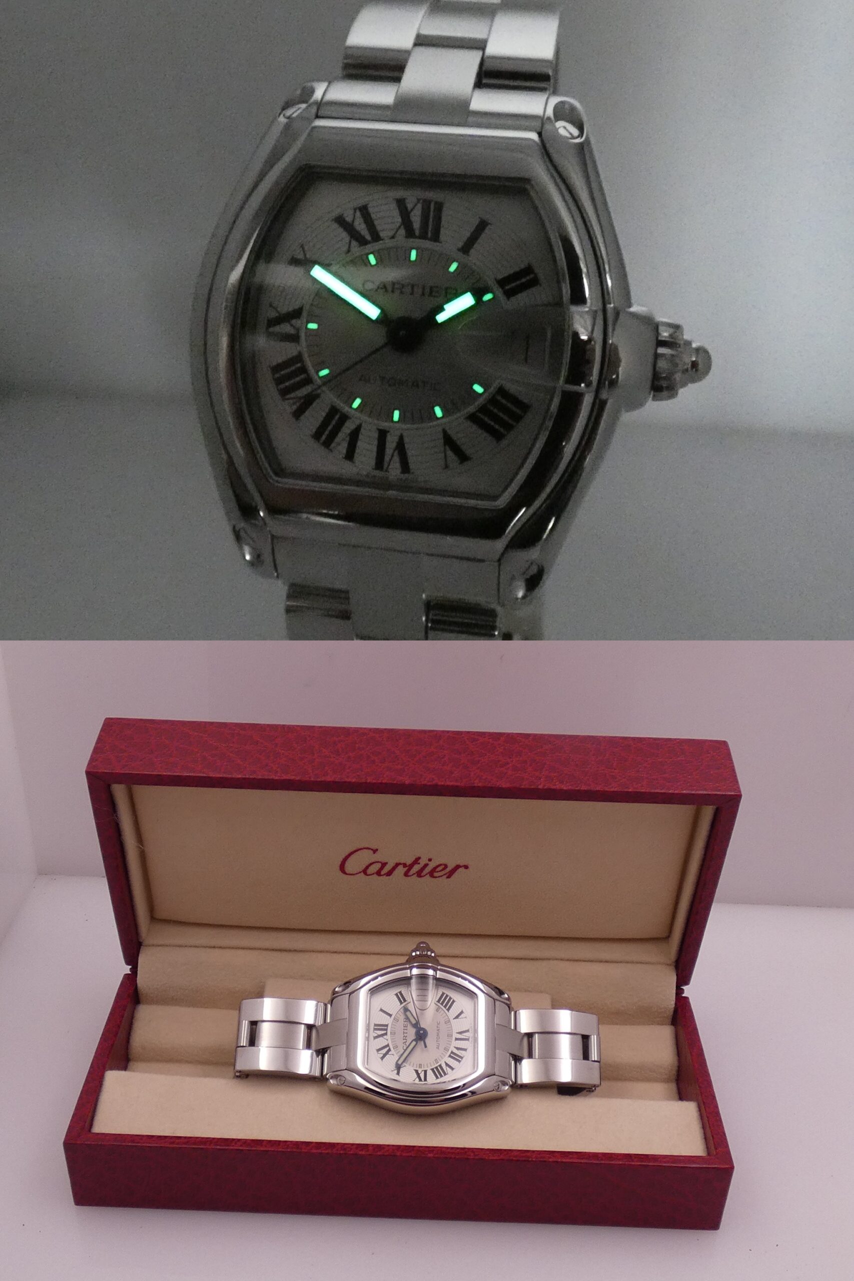 Quadrante: argentè con zona centrale soleil, indici romani con punti Luminova in corrispondenza, lancette a spada azzurrate, anch’esse luminescenti, secondi al centro, datario al 3 con rimessa rapida in corona, scala sessantesimale centrale, logo Cartier al 12