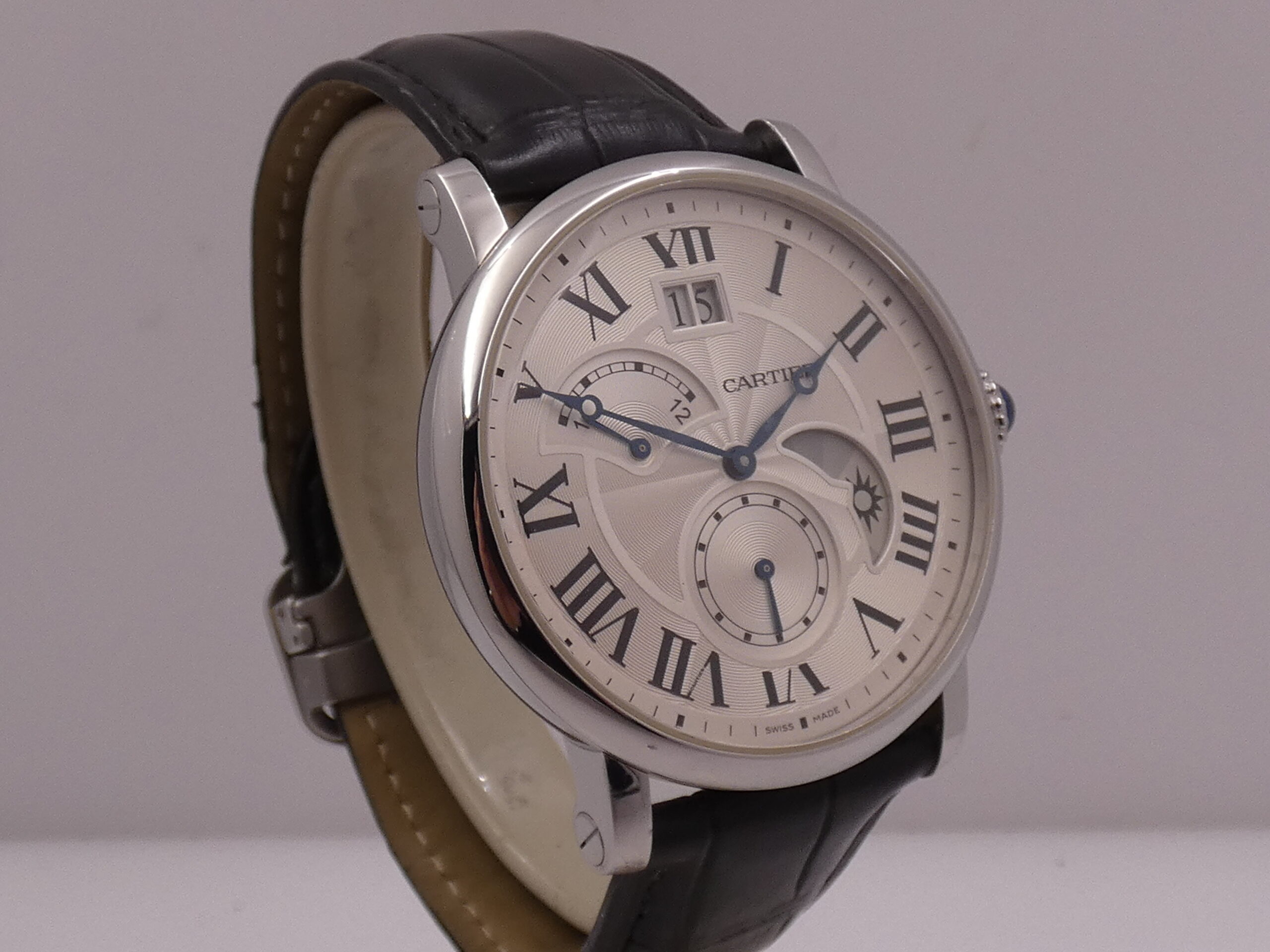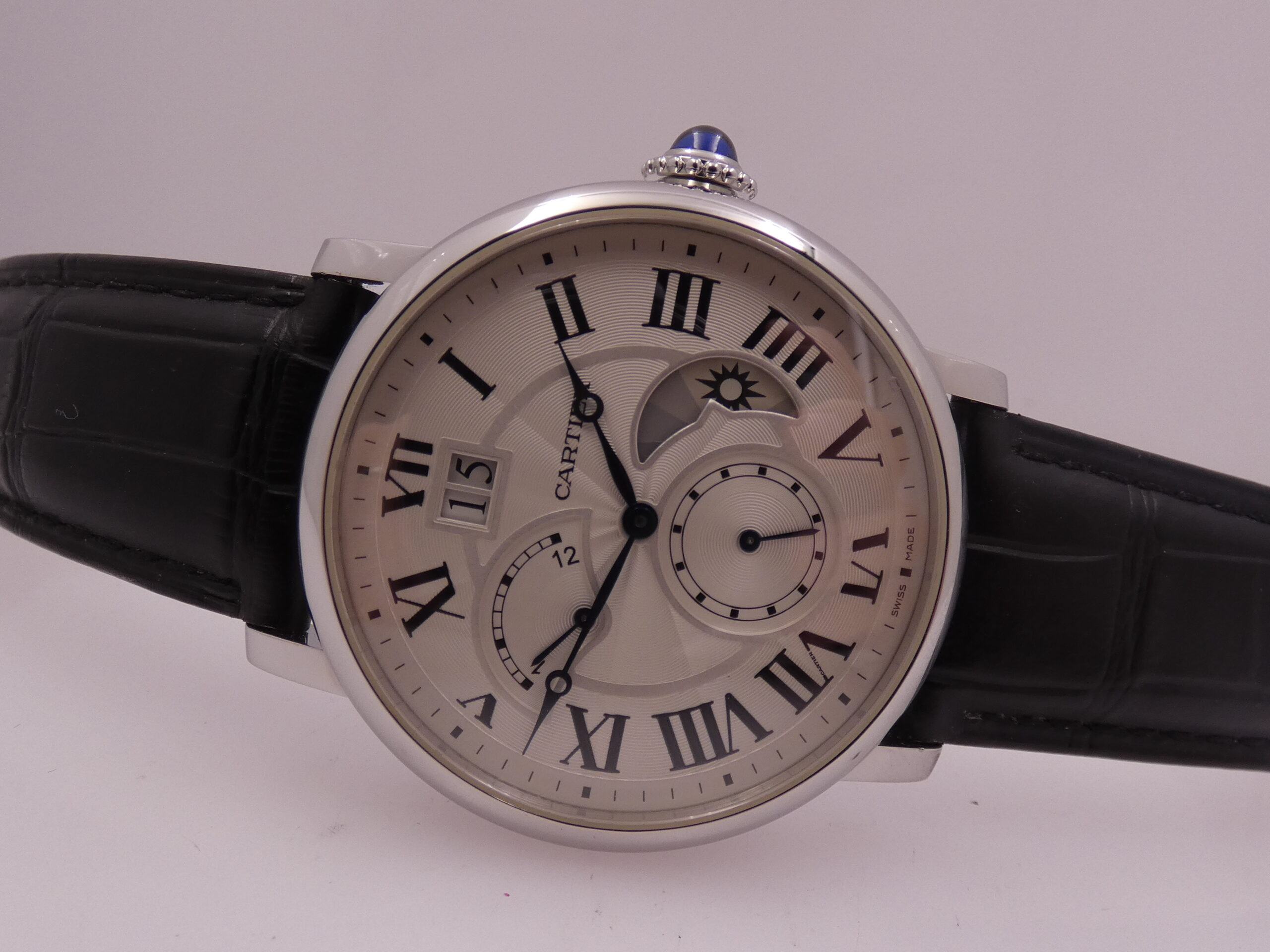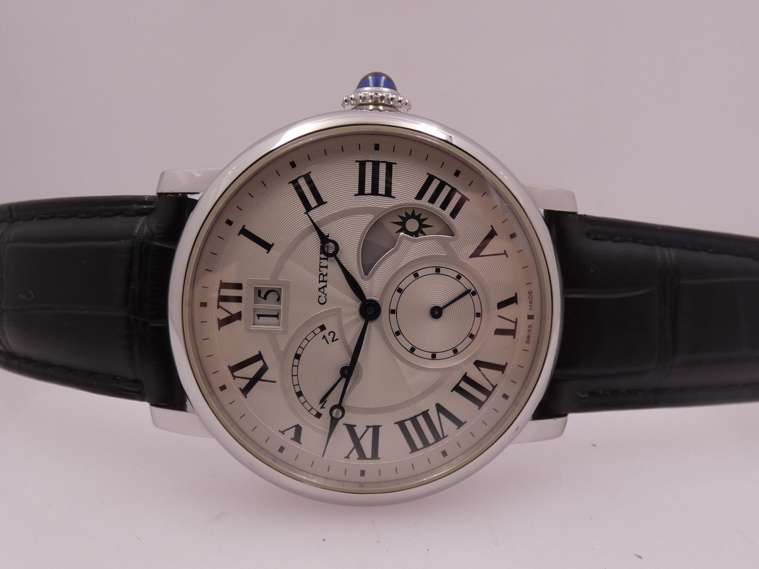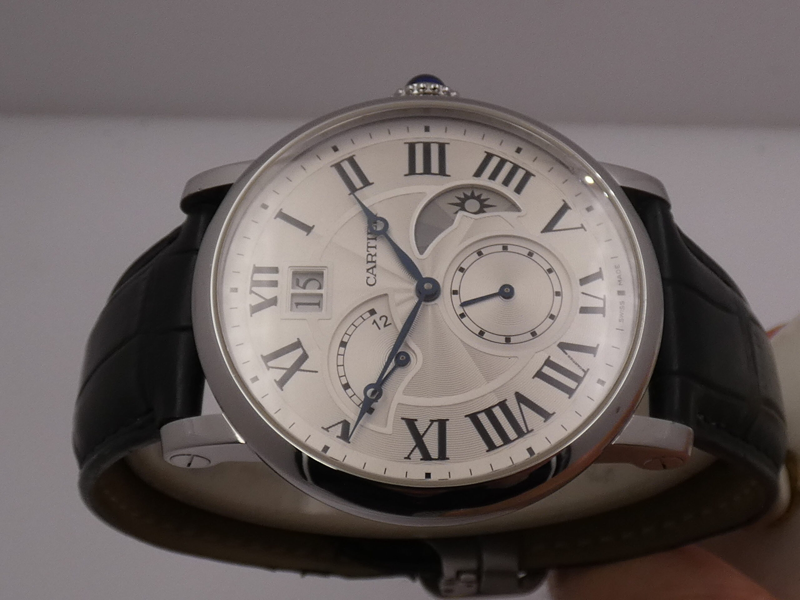 Quadrante: argentè con bellissima lavorazione guillochè, indici romani, lancette ‘Breguet’ in acciaio azzurrato, indicazione del datario tramite doppia finestrella al 12 con rimessa rapida in corona, scala delle 12 ore per l’indicazione del GMT al 9 con rimessa tramite pulsante in corona, indicazione giorno/notte al 4, secondi al 6, scala sessantesimale, logo Cartier al 2
