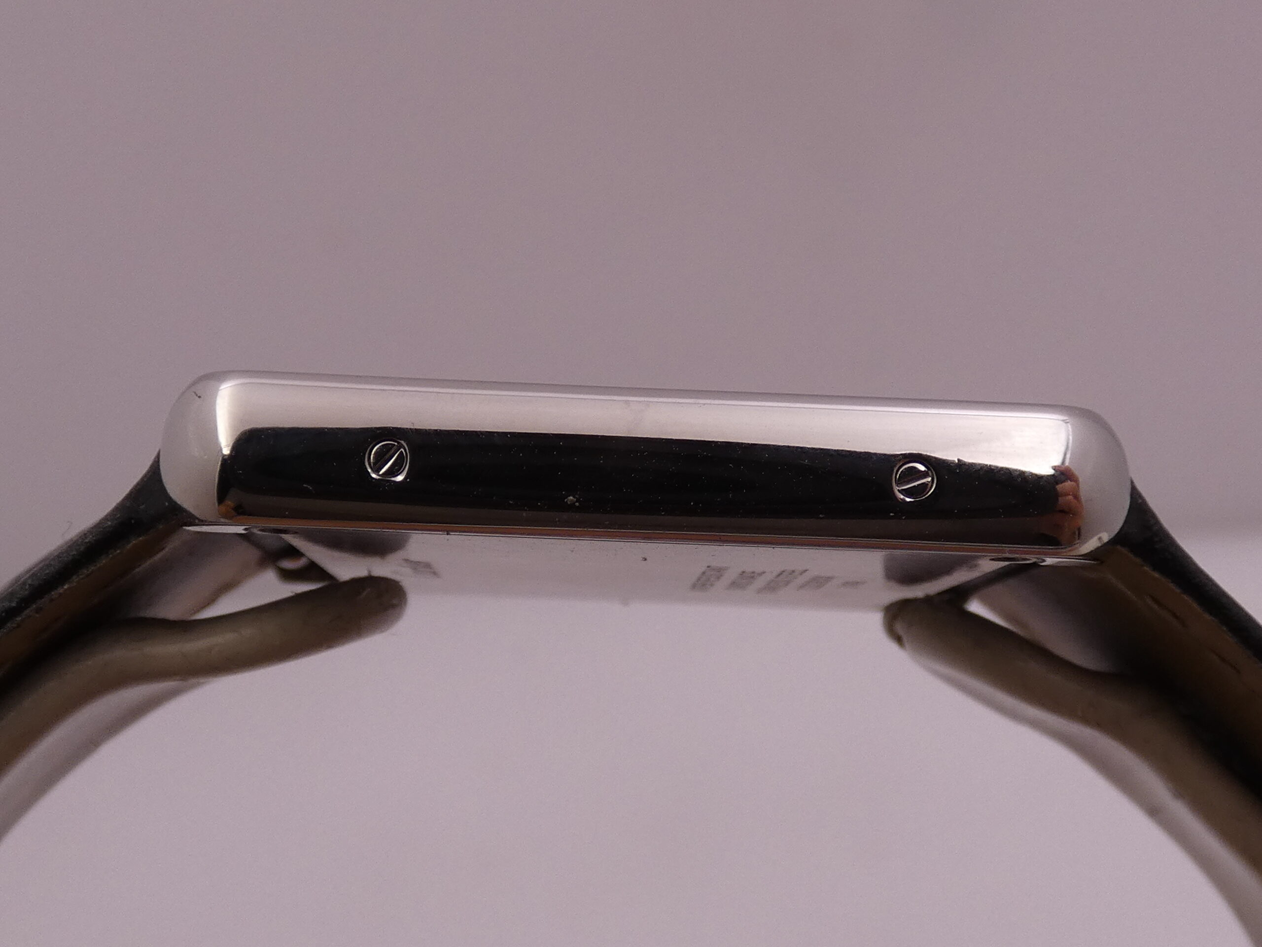 Dial: Silvered, with Roman numerals and Cartier lettering at 7 o’clock, blued sword hands, central Chemin-de-ferret scale, Cartier logo at 12 o’clock