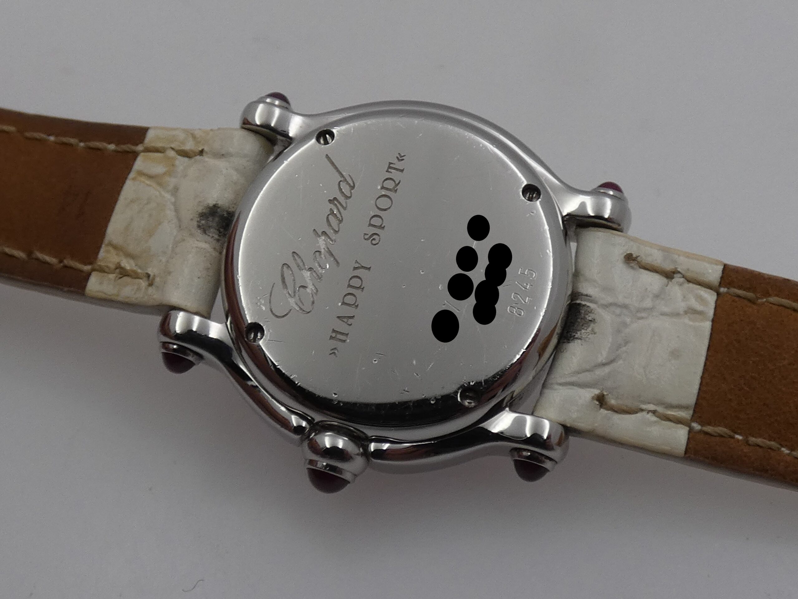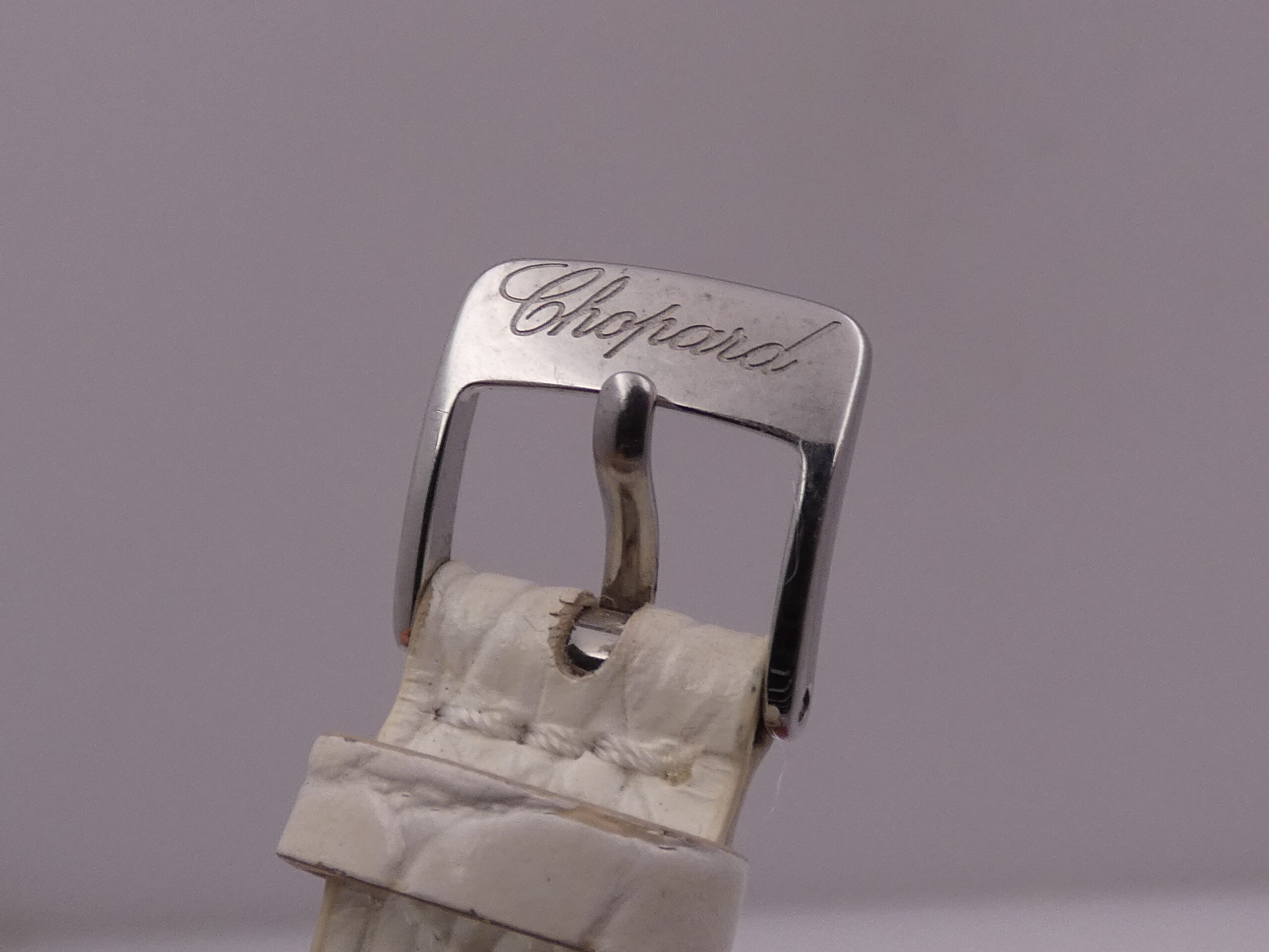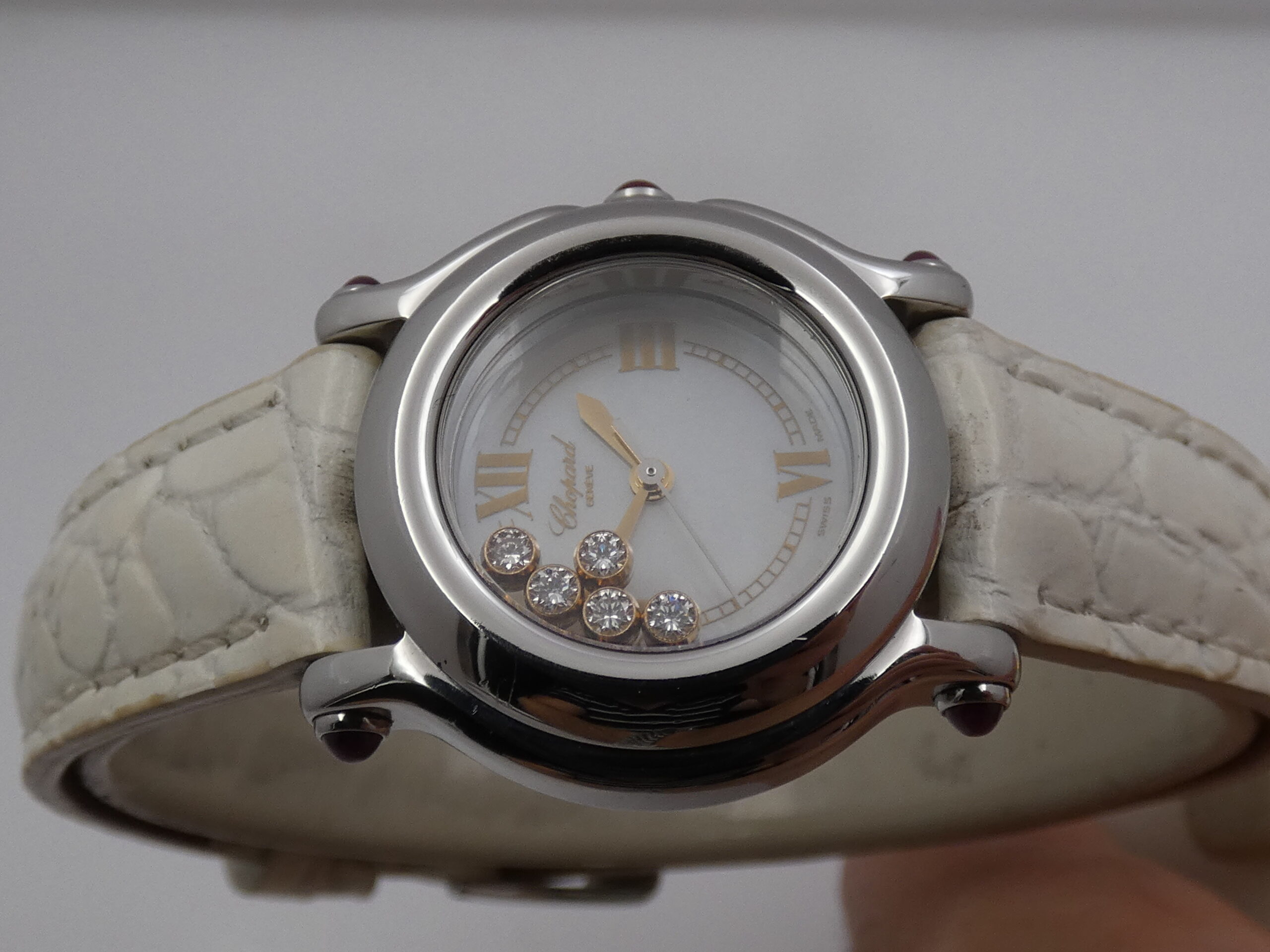 Quadrante: “Happy” in madre perla bianco e con 5 diamanti fluttuanti, indici romani a quarti, lancette a spada in oro, secondi al centro, scala sessantesimale Chemin De Fer, logo Chopard al 12