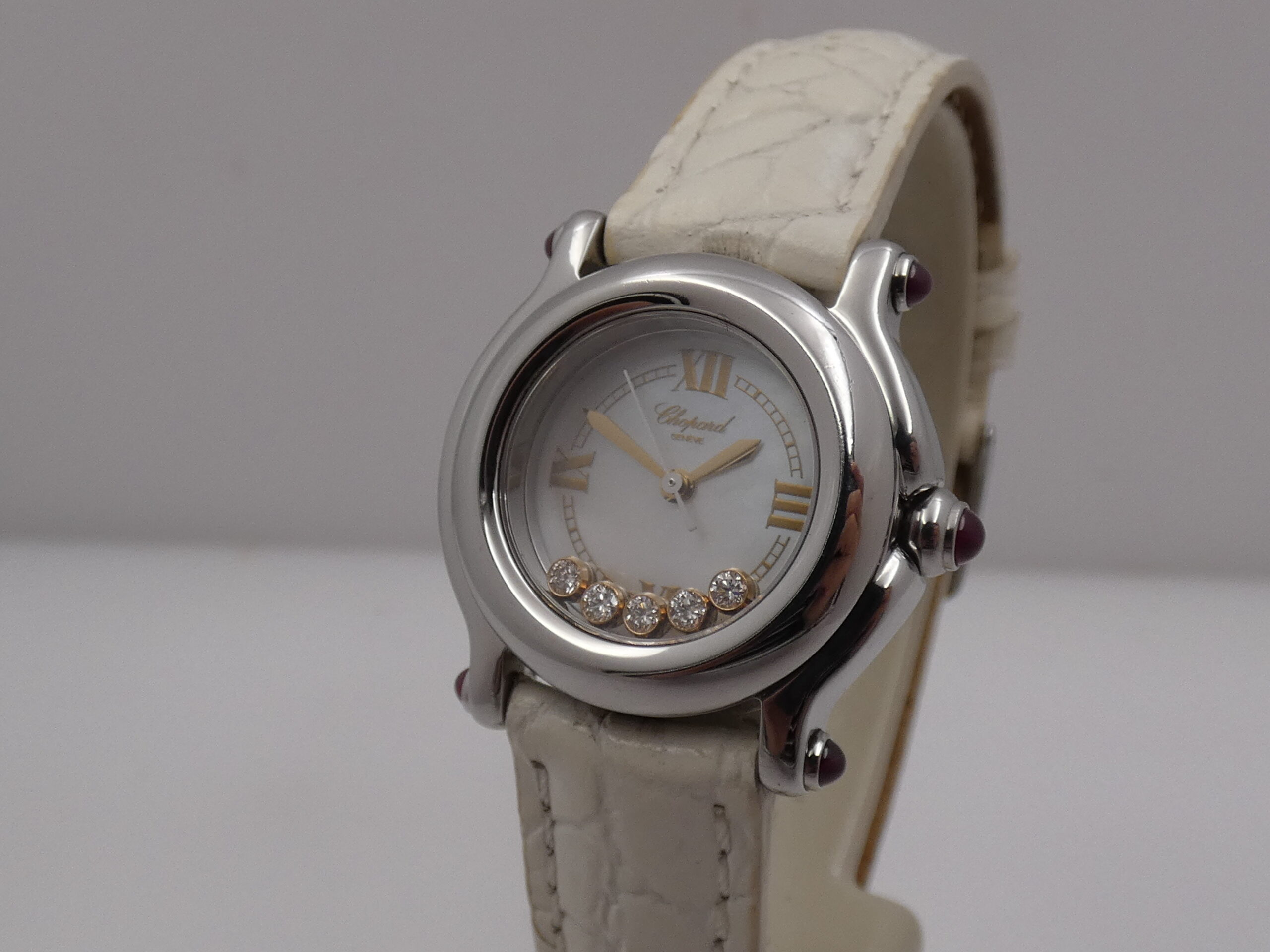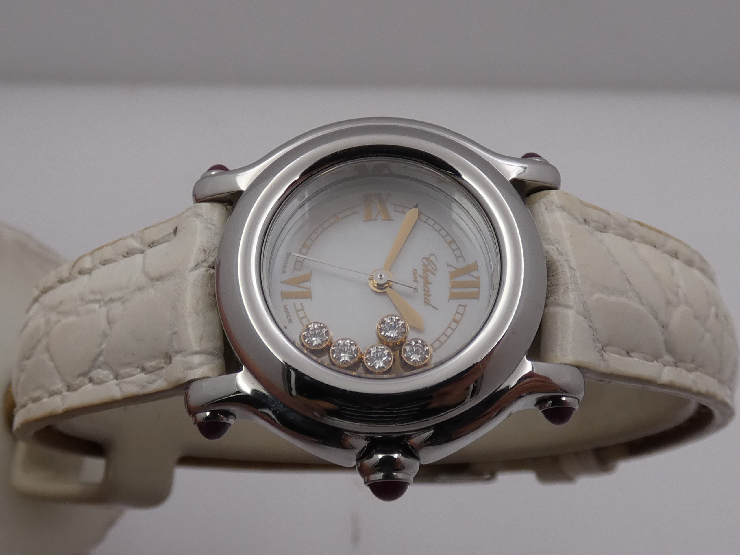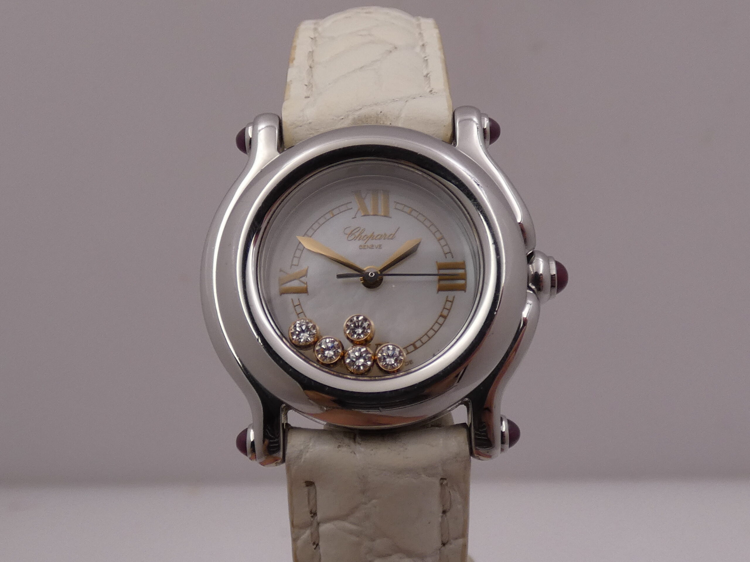 Dial: “Happy” white mother-of-pearl with 5 floating diamonds, Roman numeral hour markers, gold sword hands, center seconds, Chemin de Fer (fer-type) scale, Chopard logo at 12 o’clock