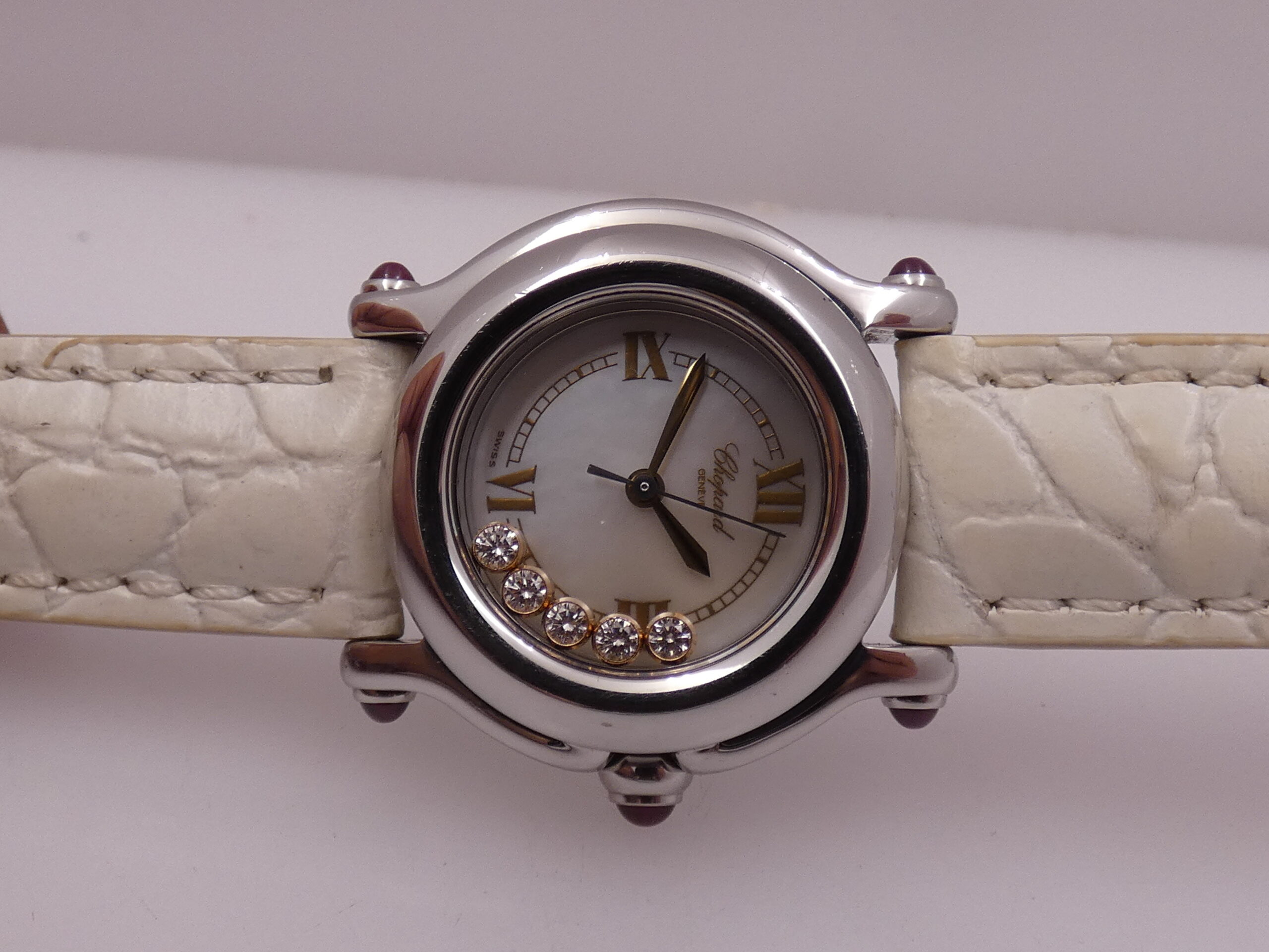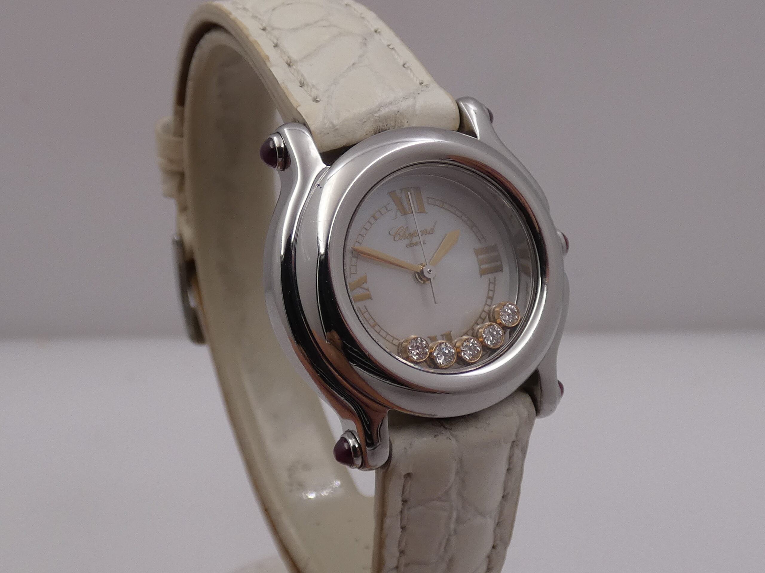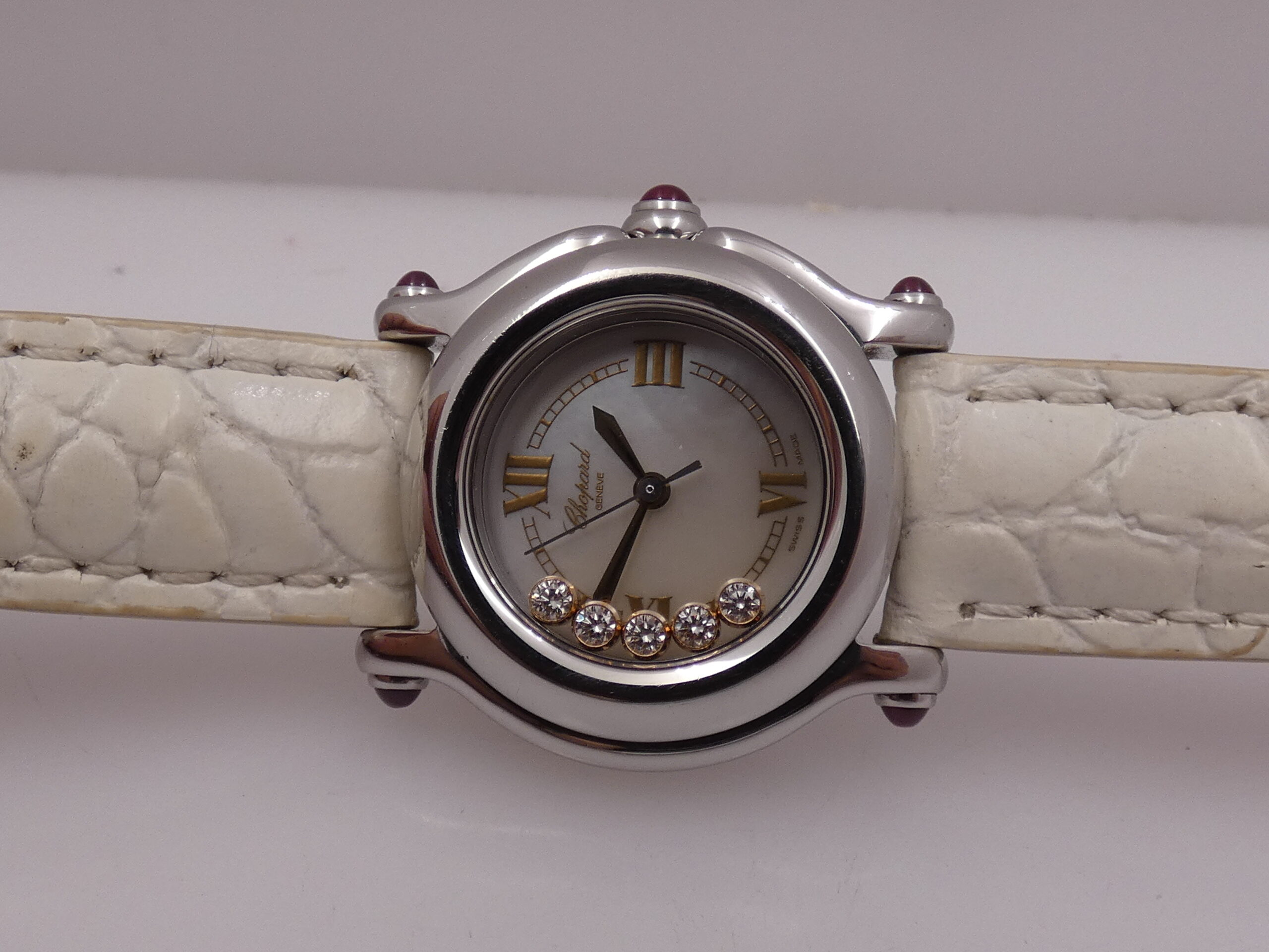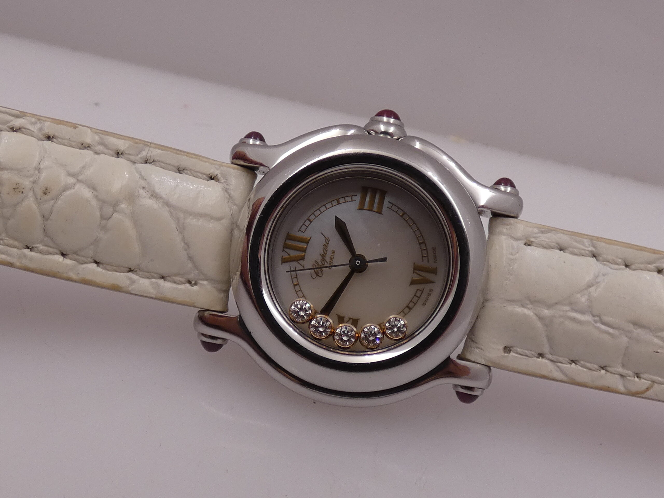 Dial: “Happy” white mother-of-pearl with 5 floating diamonds, Roman numeral hour markers, gold sword hands, center seconds, Chemin de Fer (fer-type) scale, Chopard logo at 12 o’clock