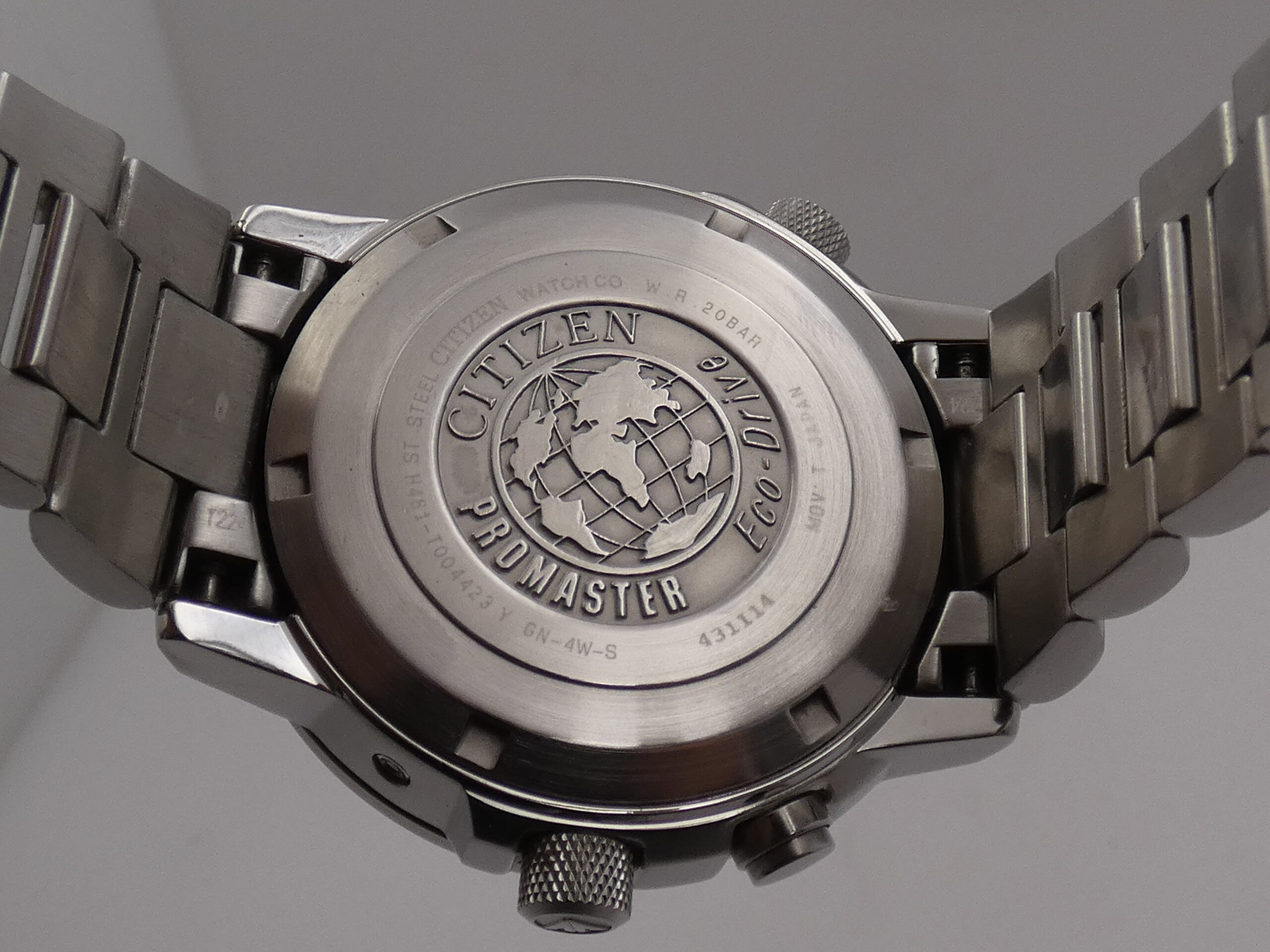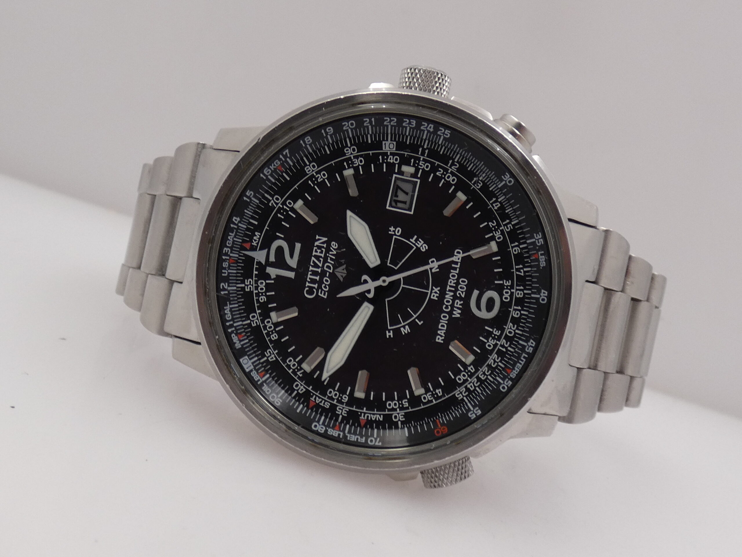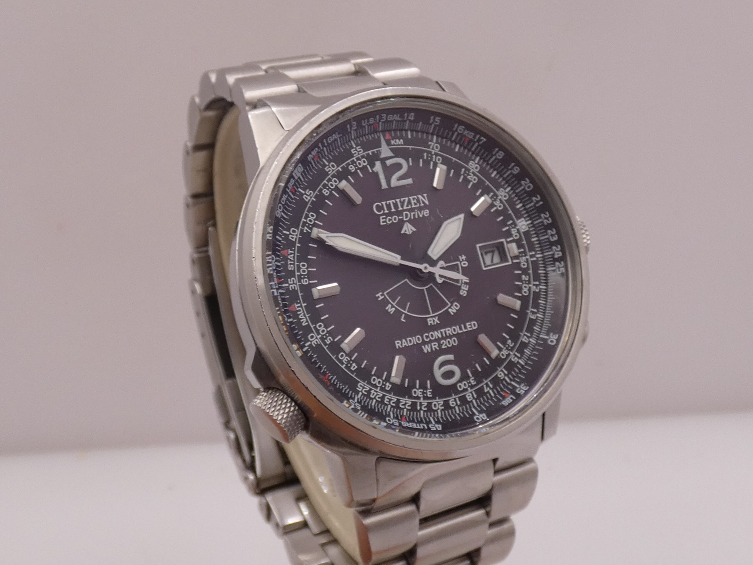 Dial: Black, with raised steel bar indexes and corresponding luminescent dots, fully luminescent Arabic numerals, steel and luminescent spear-tip hands, center seconds, date display 3, central radio-controlled display with crown reset, pusher at 2 o’clock and pusher at 4 o’clock, perpetual calendar in correspondence with the indexes, 60-second scale with 1/5th of a second subdivisions, slide rule on the flange rotated via the crown at 8 o’clock, Citizen logo at 12 o’clock;