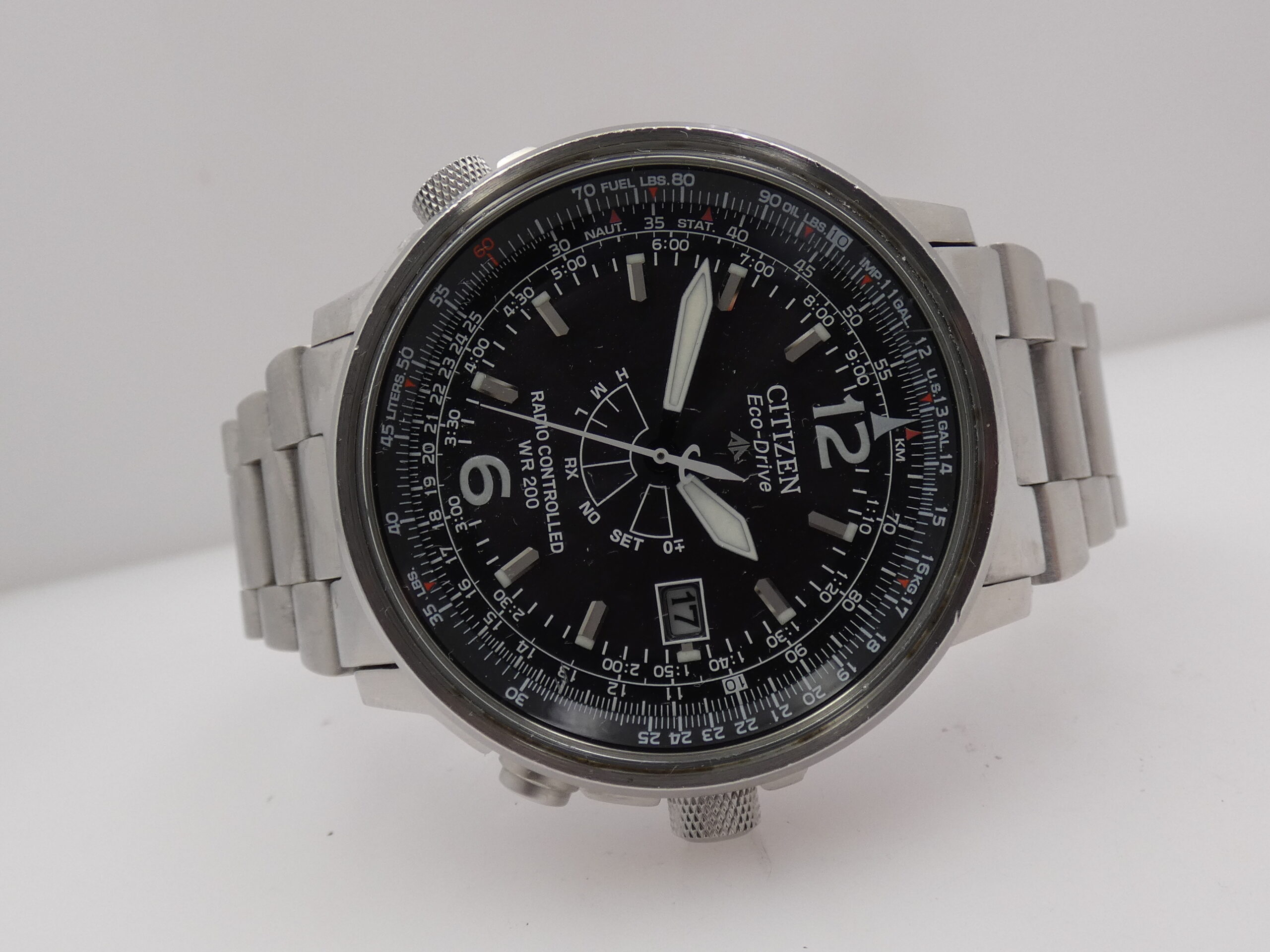 Quadrante: nero, con indici a barrette, in acciaio in rilievo e con punti luminescenti in corrispondenza, arabi a mezza completamente luminescenti, lancette a punta di lancia in acciaio e luminescenti, secondi al centro, dataro al 3, indicazione del radio controllo al centro con rimessa tramite corona, pulsantino al 2 e pulsante al 4, calendario perpetuo in corrispondenza degli indici, scala sessantesimale con suddivisione ad 1/5 di secondo, regolo calcolatore sul rehaut girevole tramite corona ad ore 8, logo Citizen al 12;
