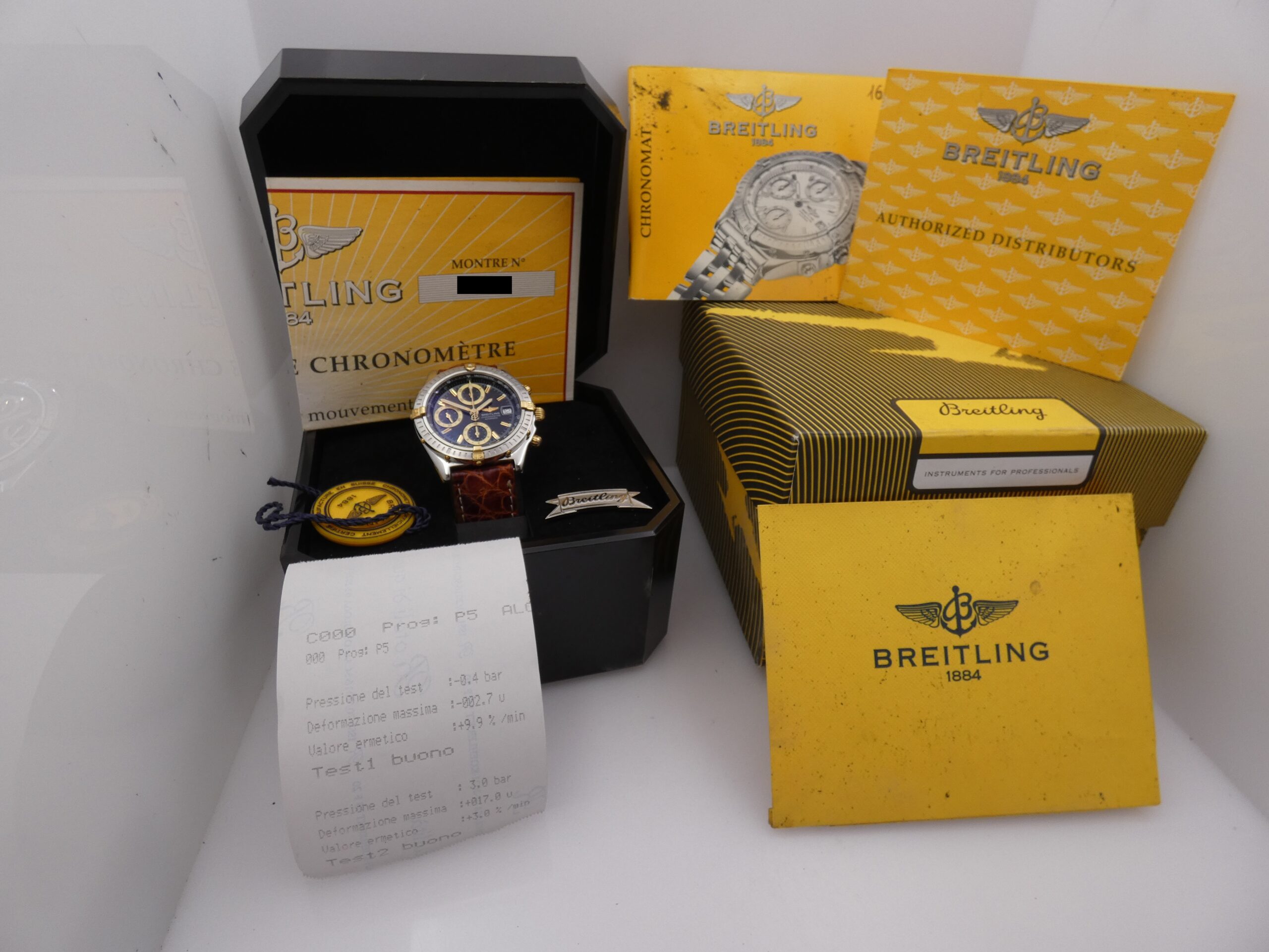 Verrà a voi consegnato con la sua scatola, la sua controscatola, il suo certificato C.O.S.C., il suo manuale ed il suo sigillo C.O.S.C., originali Breitling, più la nostra garanzia di 12 mesi sul buon funzionamento !!!