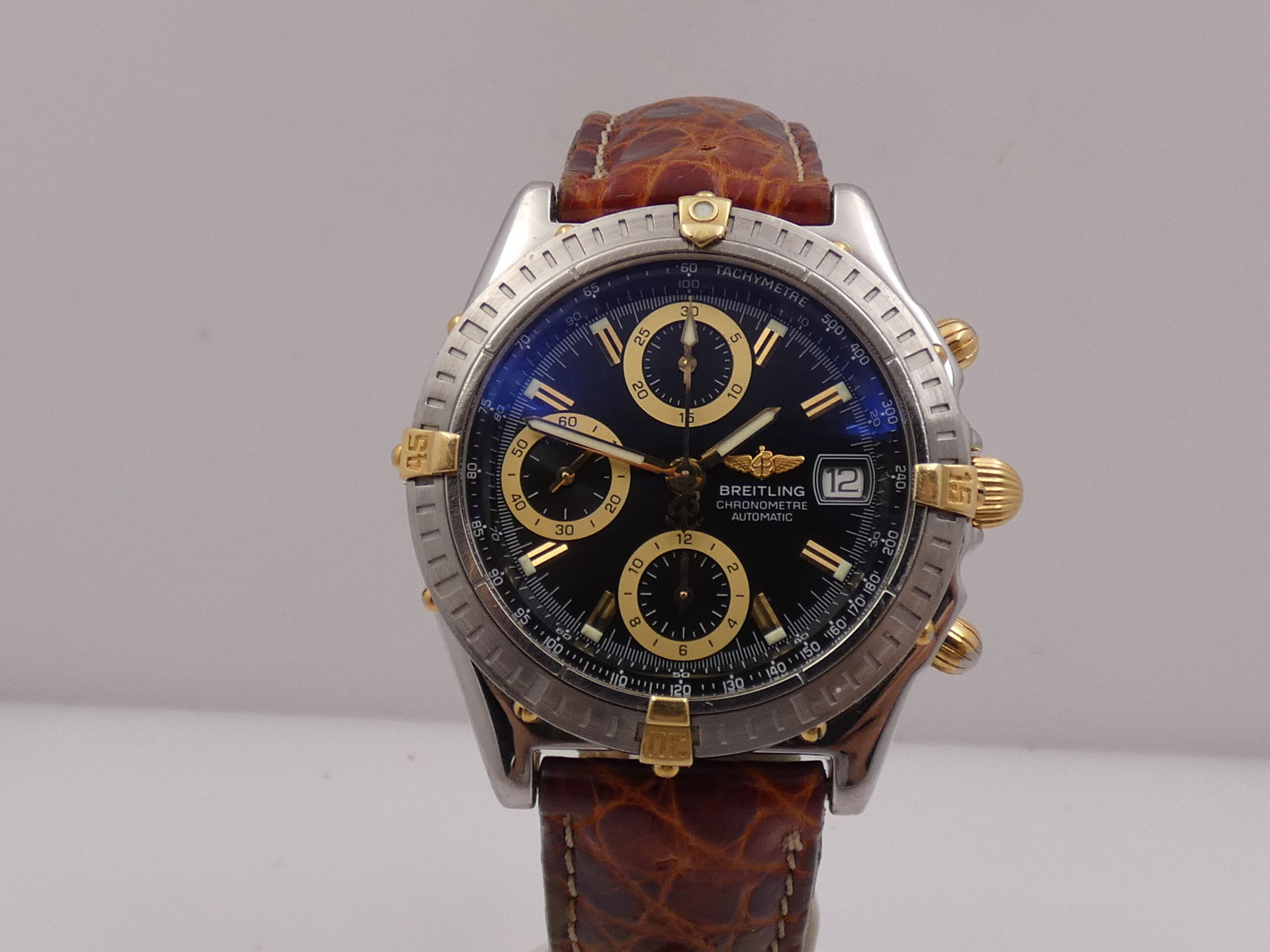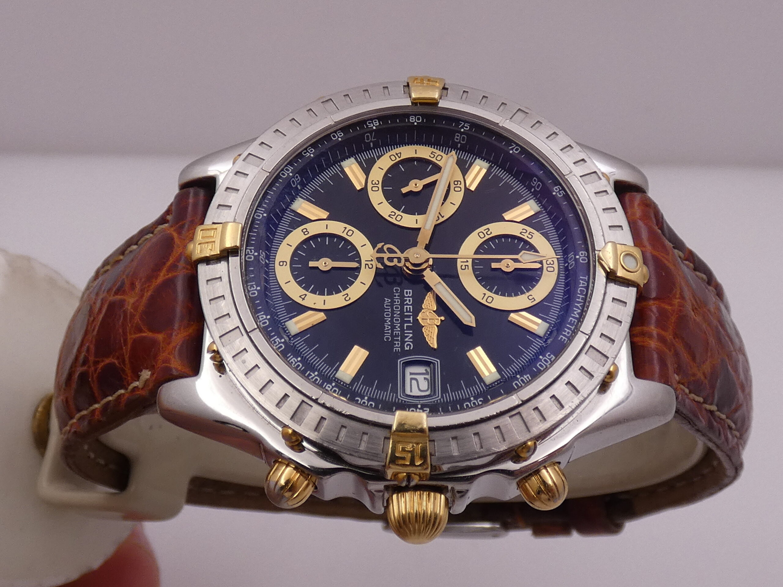 Quadrante: nero, con indici a barretta in oro, in rilievo e con punti luminescenti in corrispondenza, lancette a stilo anch’esse in oro e luminescenti, contatori con profili in oro ed in rilievo, secondi continui al 9, minuti del crono al 12, ore del crono al 6, datario al 3 con rimessa rapida in corona, scala sessantesimale con suddivisione ad 1/5 di secondo, scala centesimale sul rehaut, scala tachimetrica, logo Breitling al 3 in oro ed in rilievo