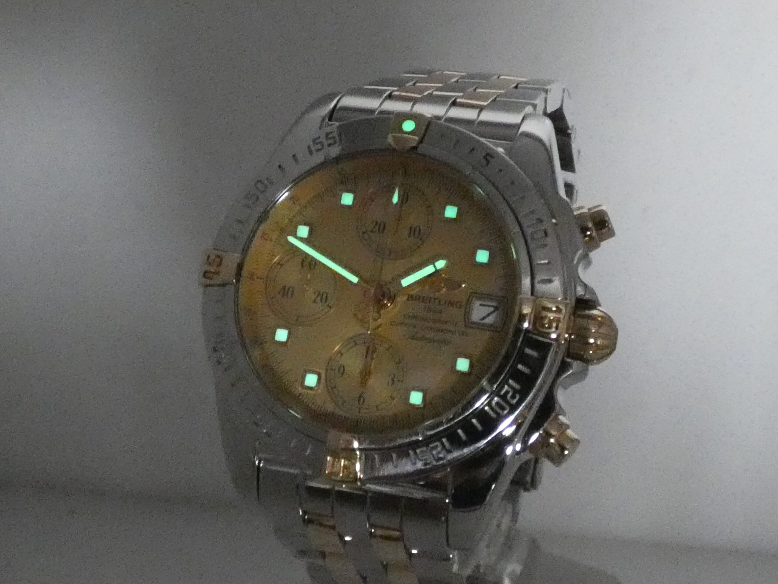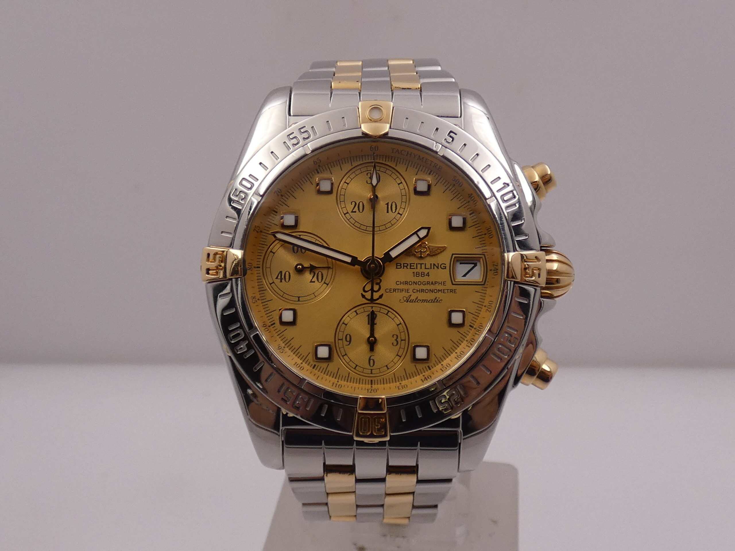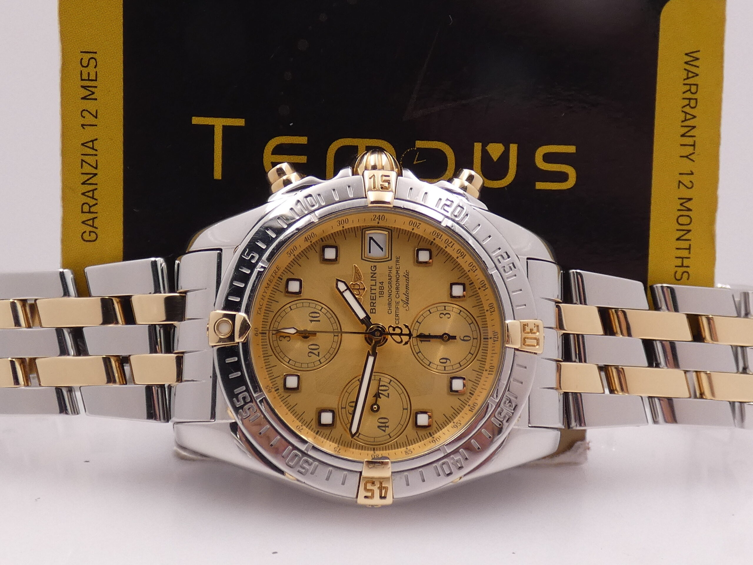 Quadrante: champagne, con indici a geometrici in oro, in rilievo e trattati con materiale luminescente, lancette a matita, anch’esse in oro e luminescenti, secondi continui al 9, minuti del crono al 12, ore del crono al 6, datario al 3 con rimessa rapida in corona, scala sessantesimale con suddivisione ad 1/5 di secondo, scala tachimetrica sul rehaut, logo Breitling al 3 in oro ed in rilievo