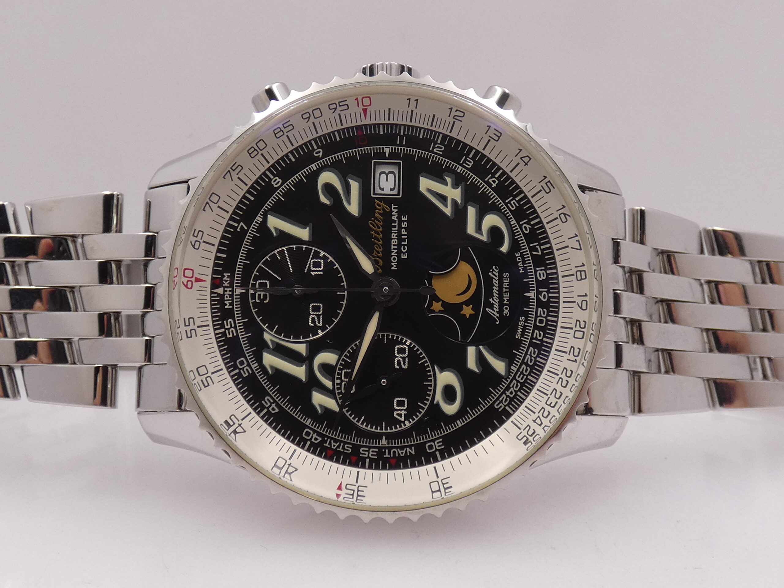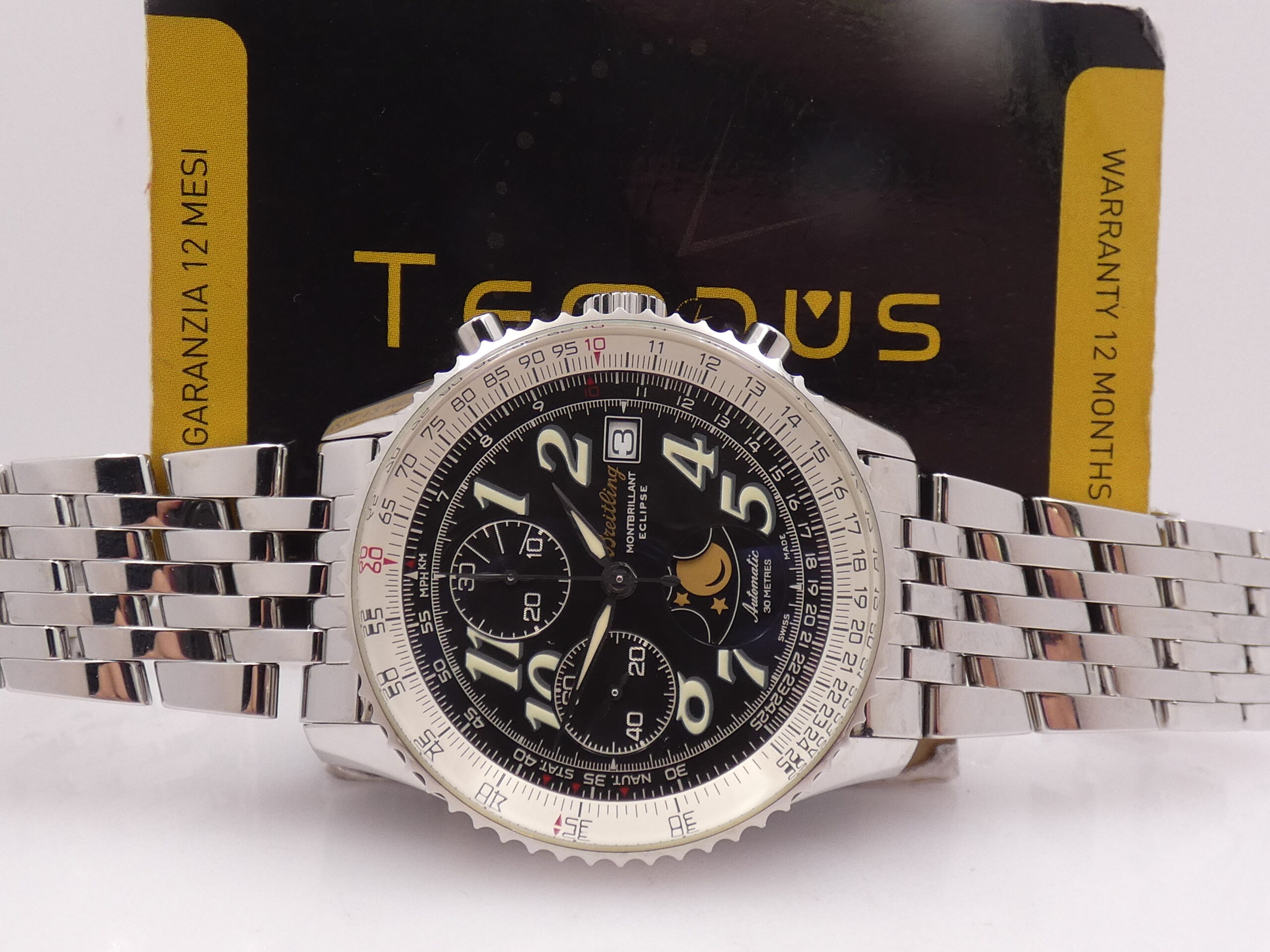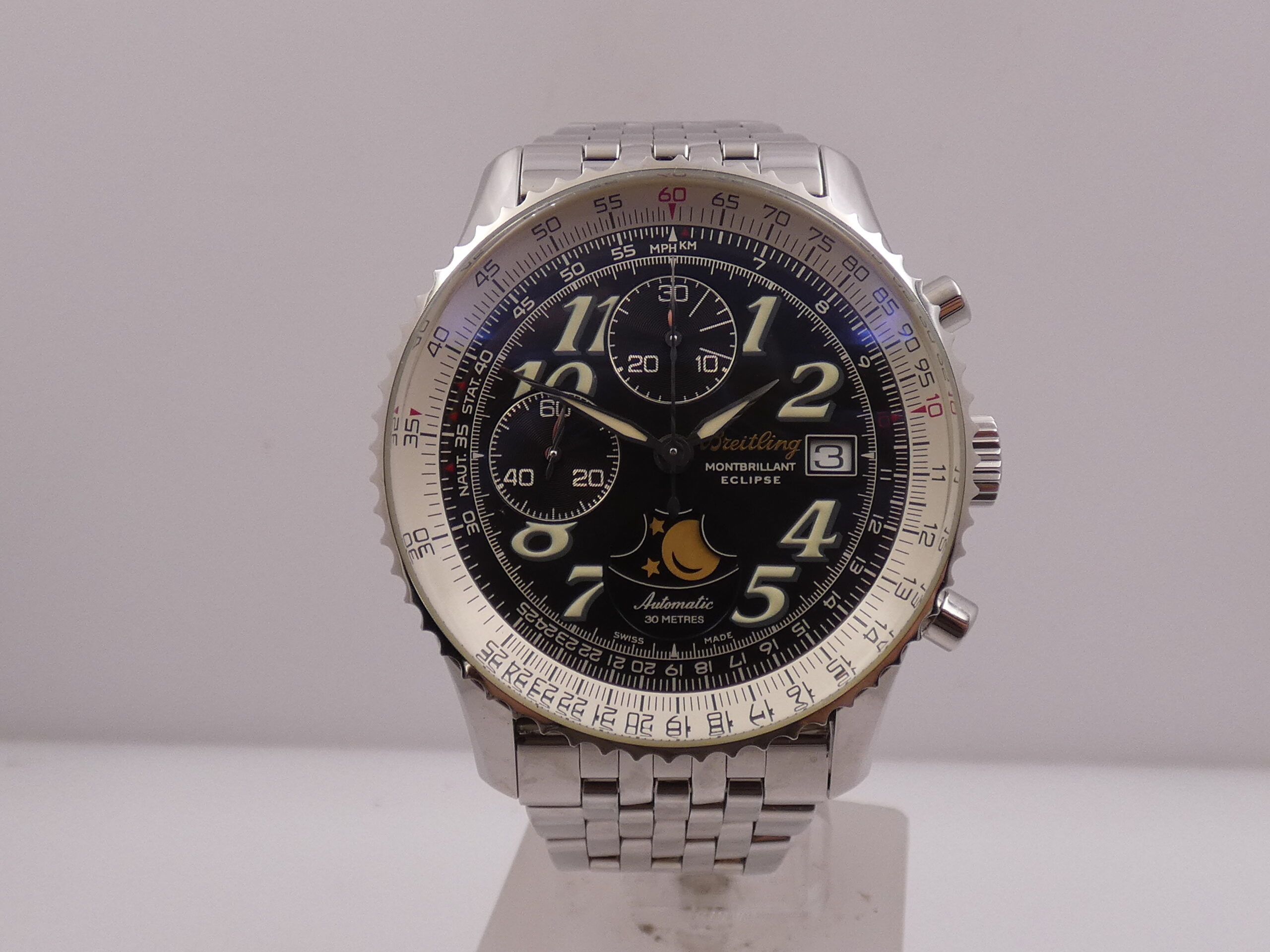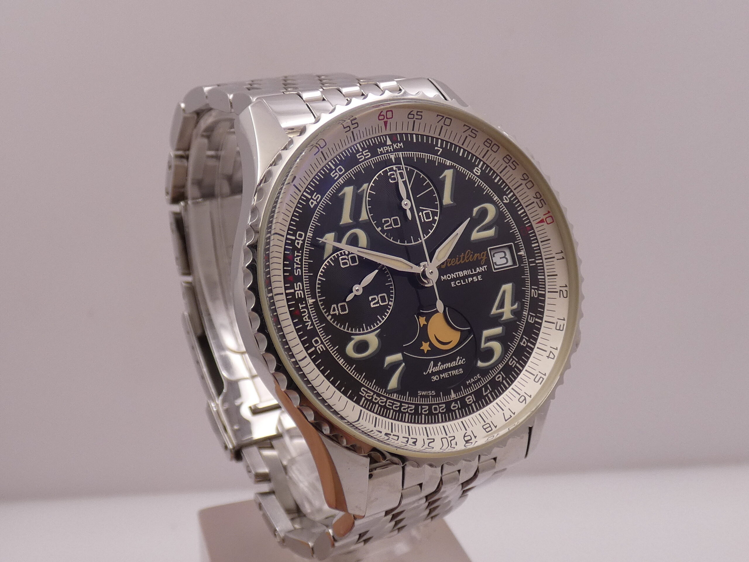 Quadrante: nero soleil, con lavorazione circulaire nei contatori, indici arabi, trattati con materiale luminescente, lancette a punta di lancia in acciaio, anch’esse luminescenti, secondi continui al 3, minuti del crono al 12, indicazione delle fasi Lunari al 6 con rimessa rapida in corona (ruotando la corona in senso antiorario), indicazione del datario tramite finestrella al 3 con rimessa rapida in corona (ruotando la corona in senso orario), scala tachimetrica sul rehaut, scala sessantesimale con suddivisione ad 1/5 di secondo, logo Breitling al 3