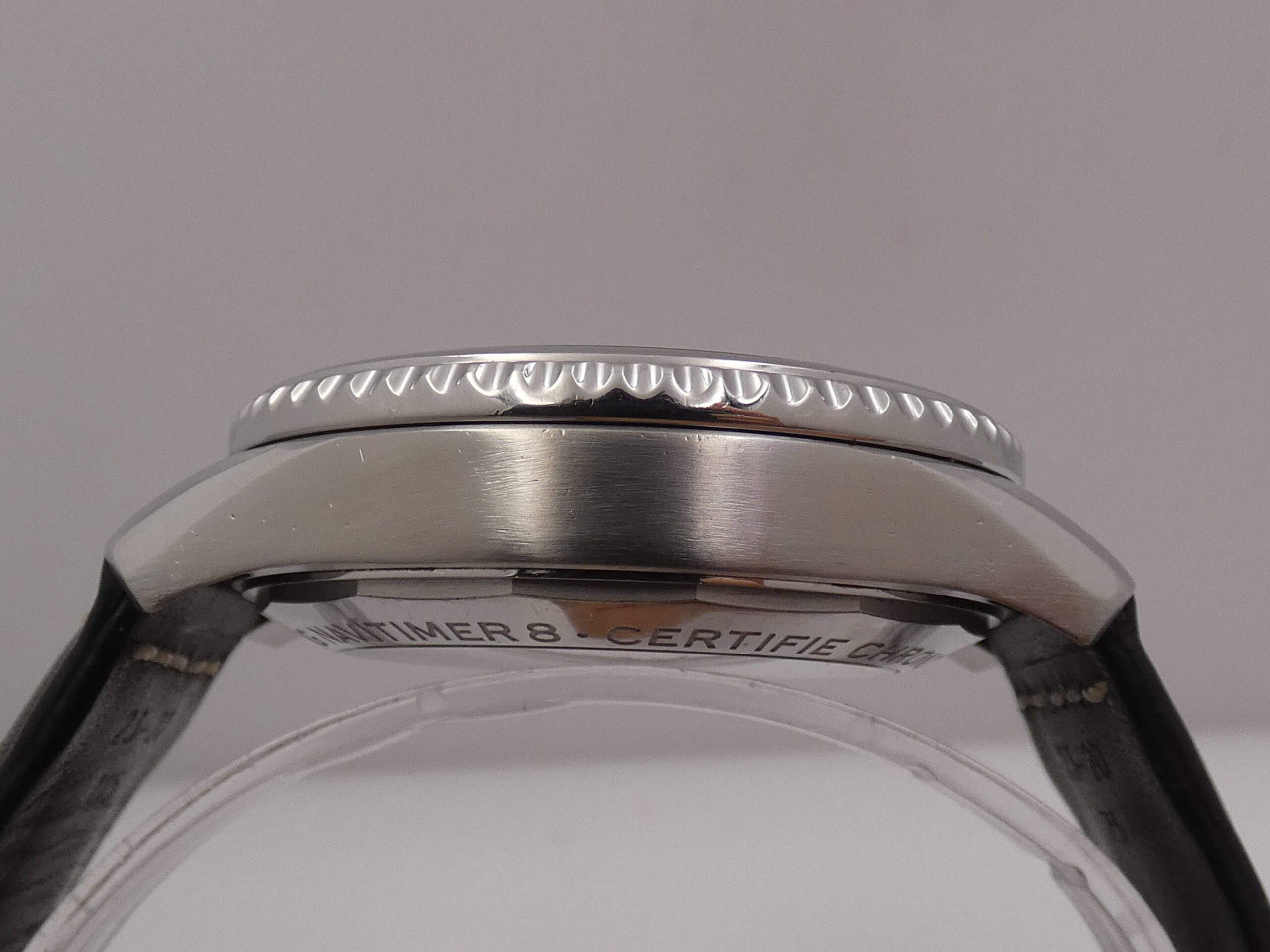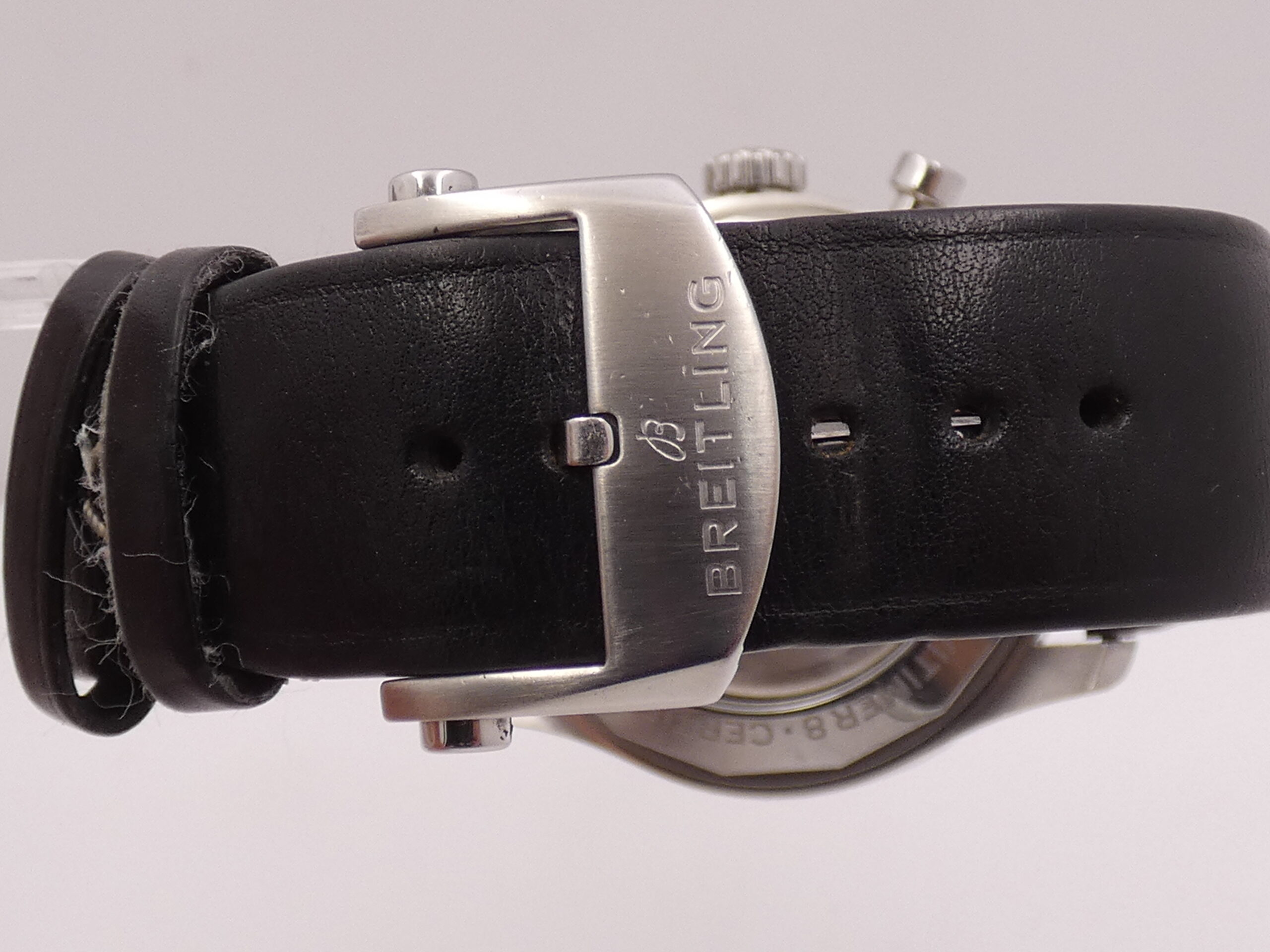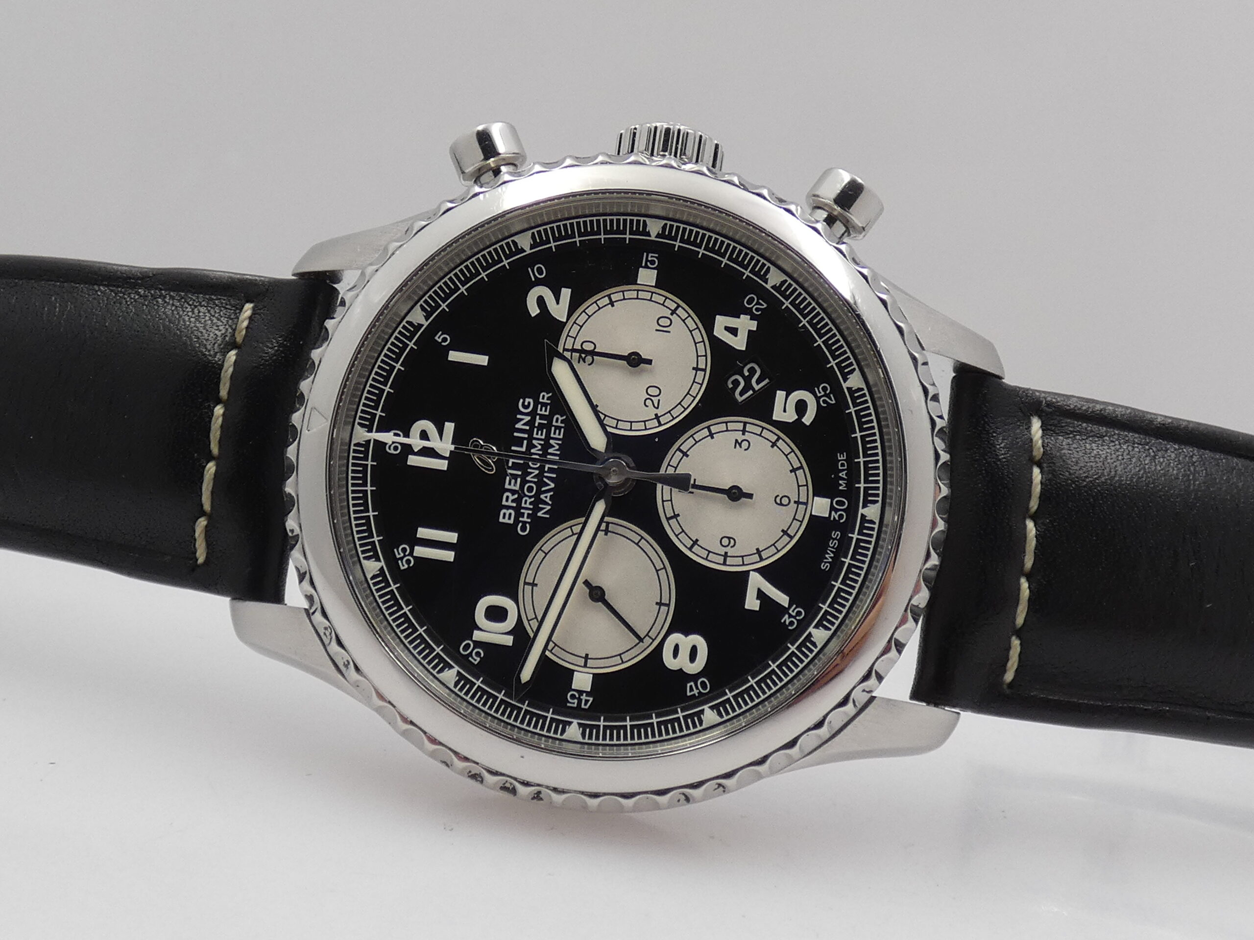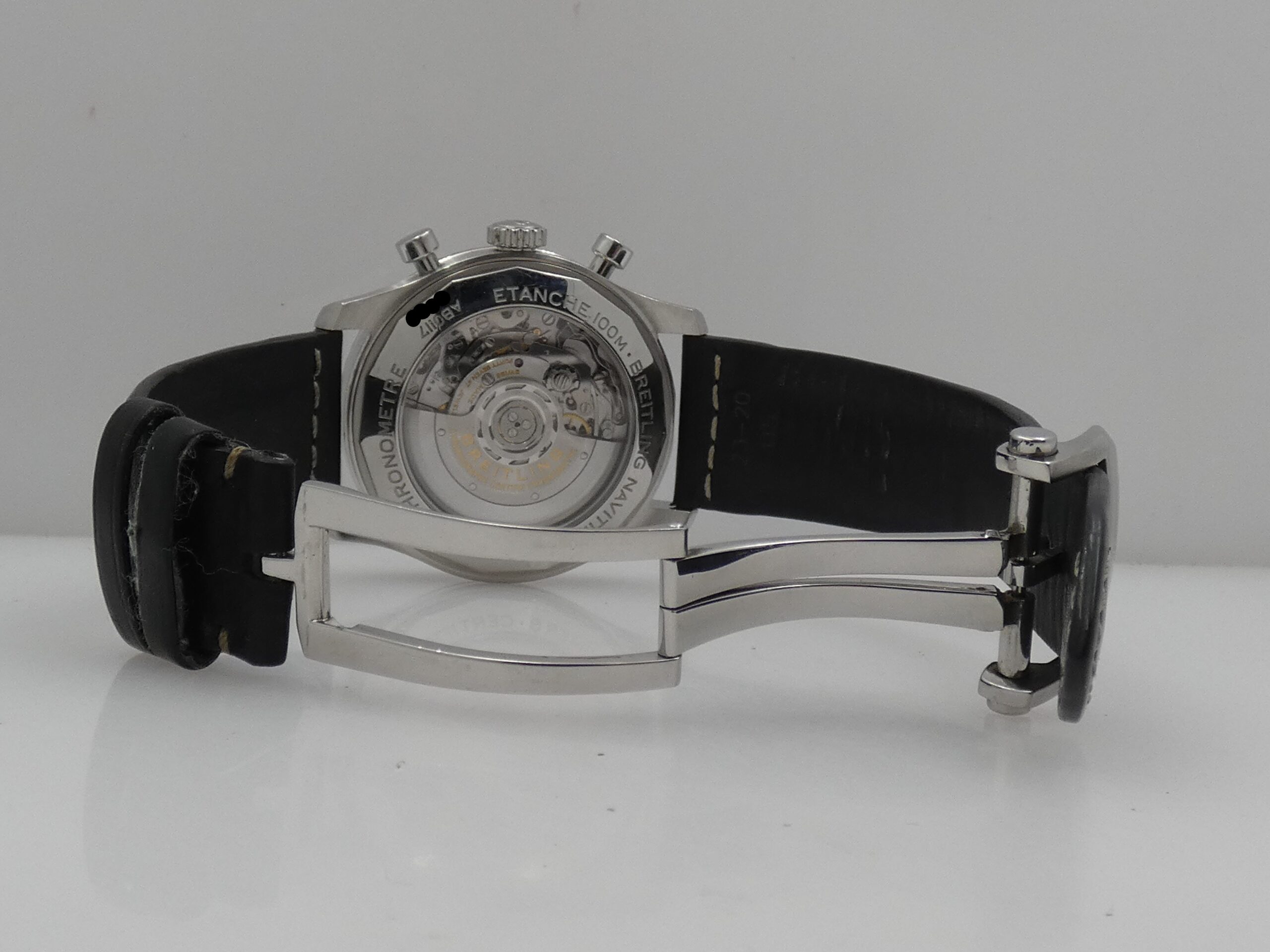 Quadrante: nero in contrasto con i contatori cronografici argentè, indici arabi trattati con materiale luminescente, lancette a matita in acciaio, anch’esse luminescenti, secondi continui al 9, minuti del crono al 3, ore del crono al 6, secondi cronografici al centro, indicazione del datario tra 4 e 5 con rimessa rapida in corona, scala sessantesimale sul rehaut con suddivisione ad 1/5 di secondo, logo Breitling al 12