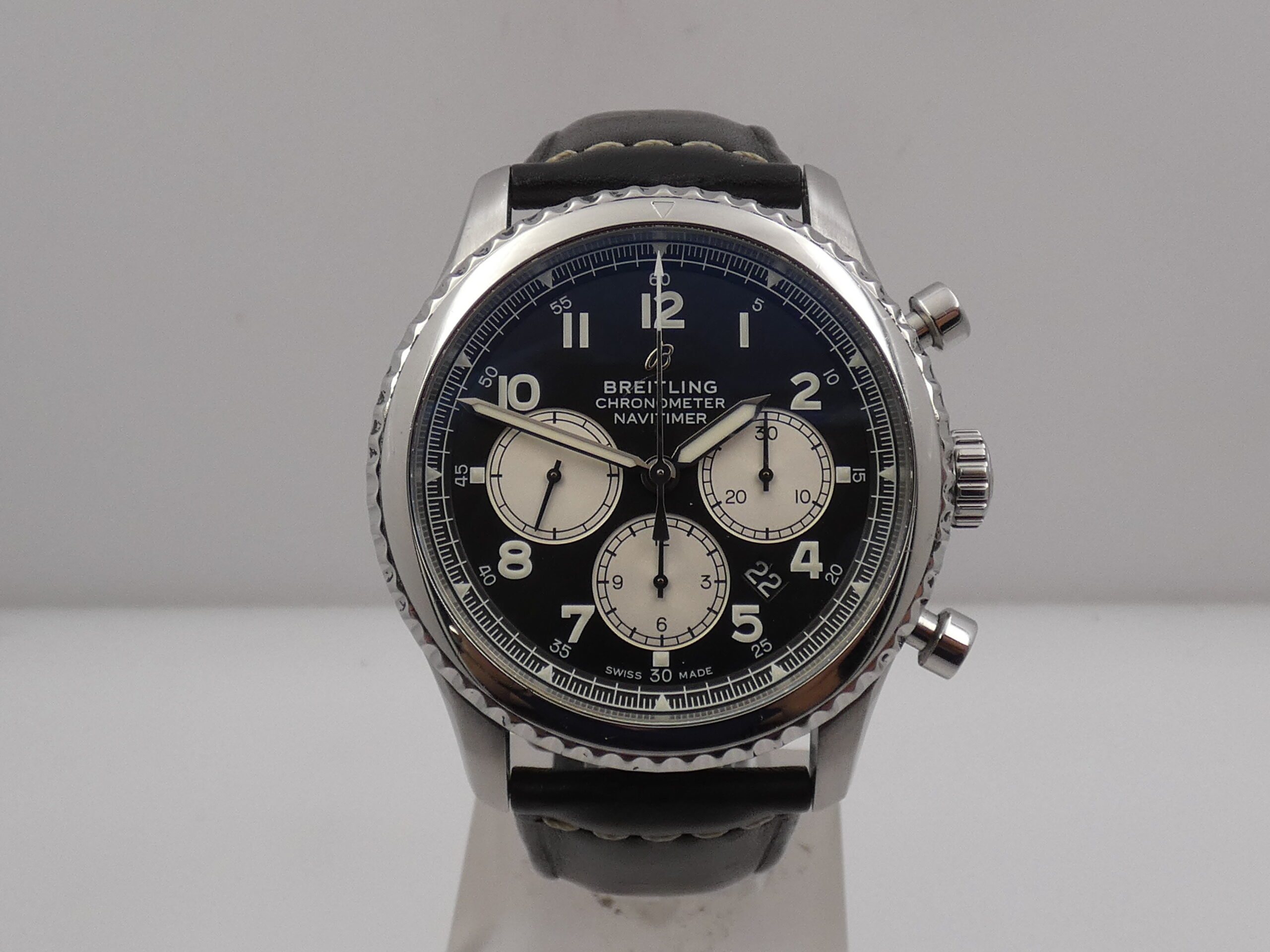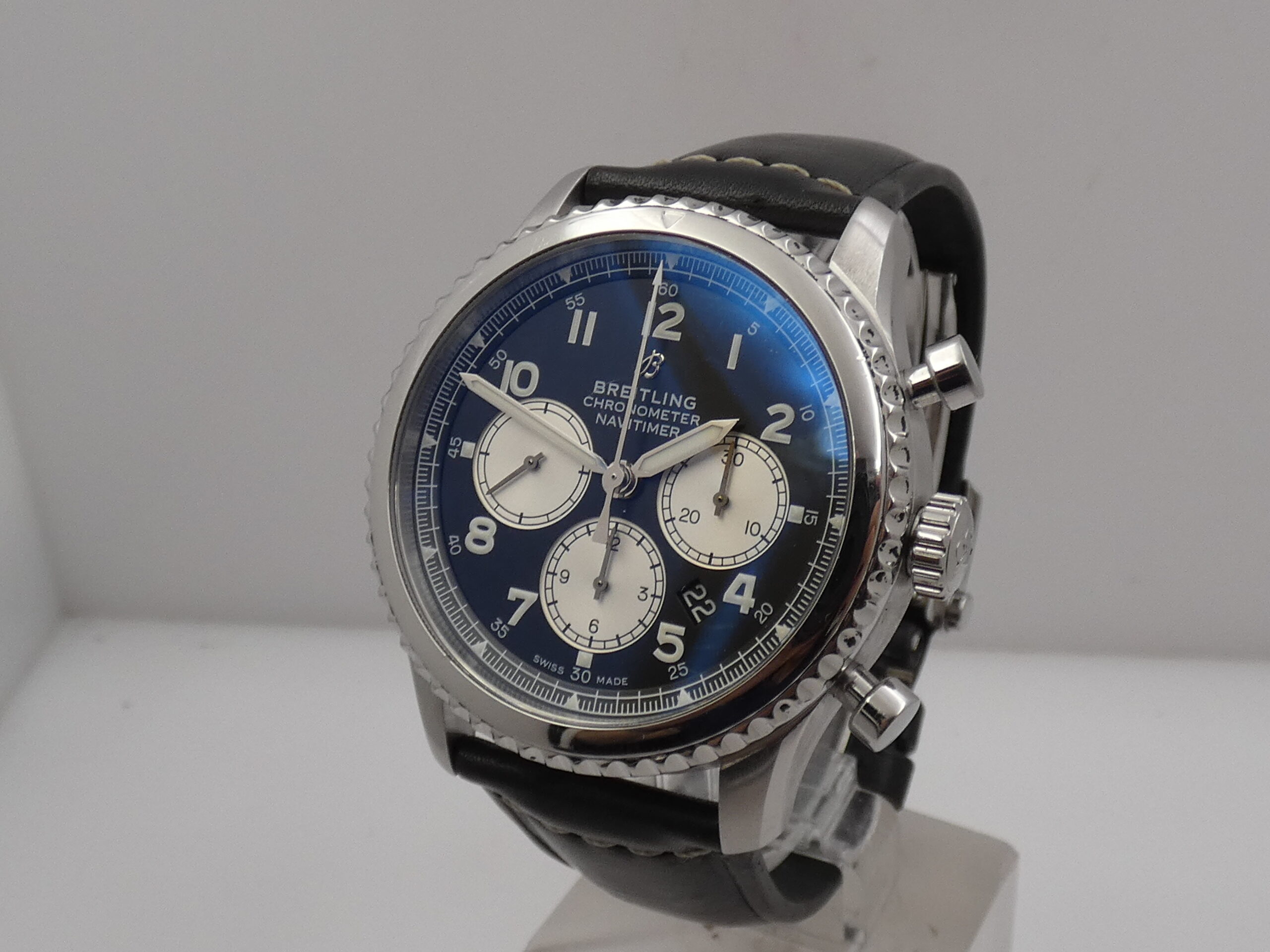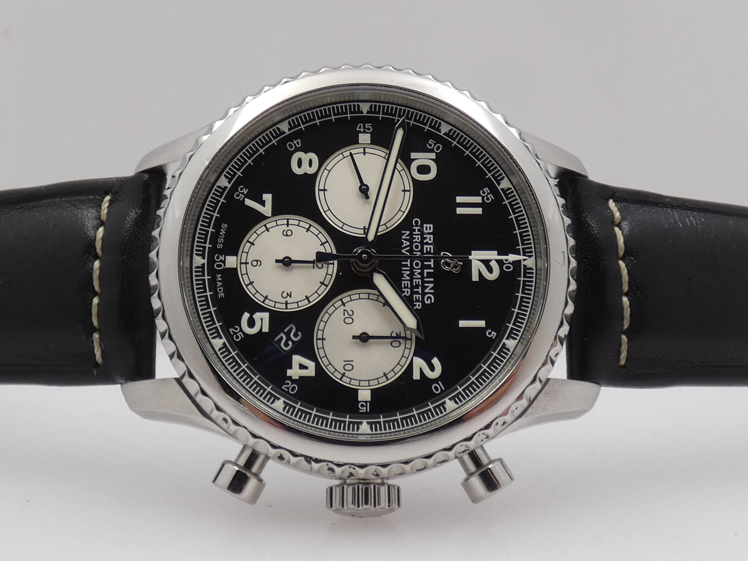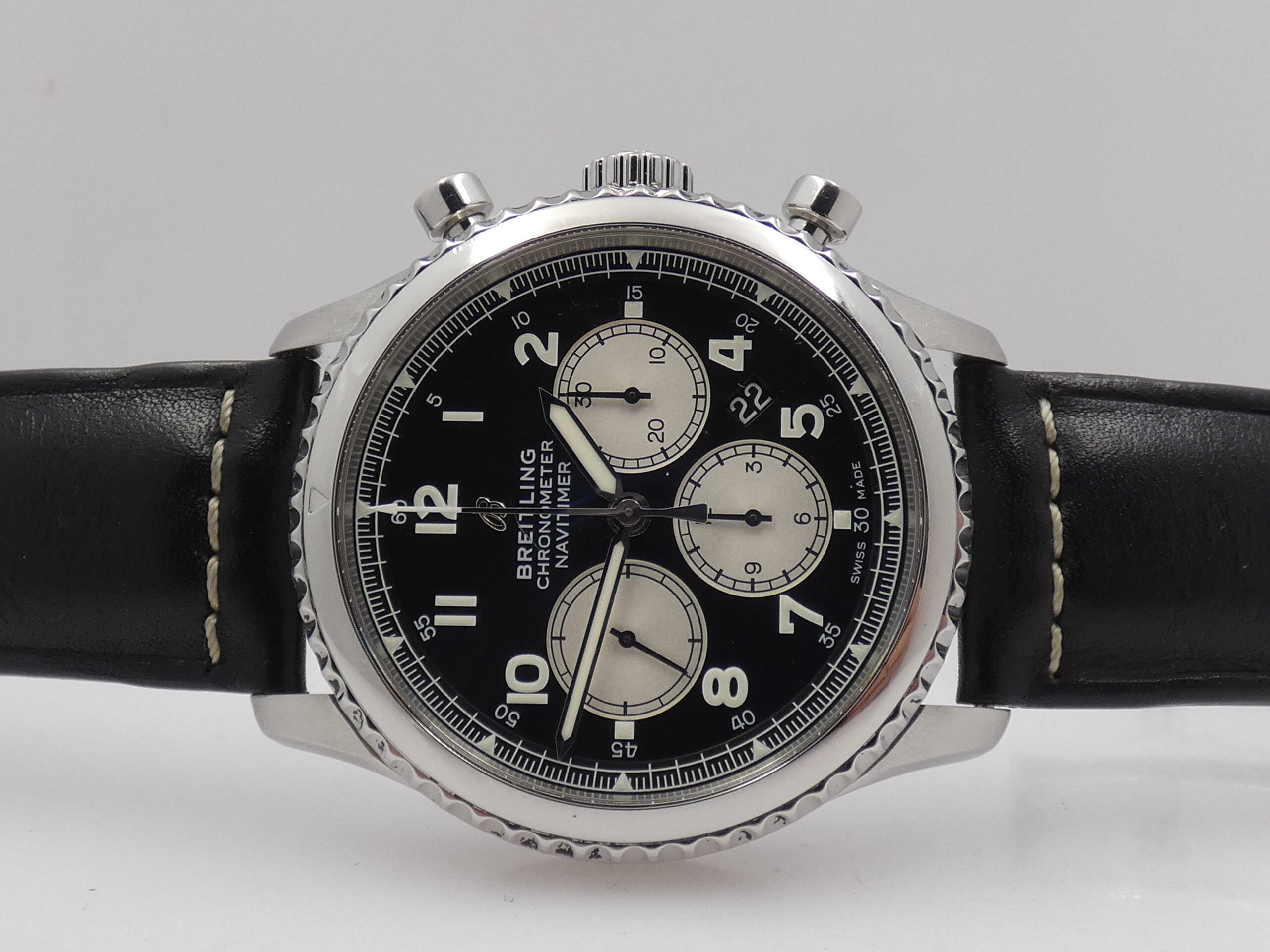 Brand: BREITLING Model: Navitimer 8 Chronograph Reference: AB0117 Year: 2018 Movement: Self-winding mechanical movement, Breitling caliber B01, officially chronometer-certified by the C.O.S.C. Functions: Hours, minutes, seconds, chronograph, date Case: Oversized, all-steel Bezel: Fluted, bidirectional rotating Crown: Screw-lock, original Breitling Push-buttons: Push-button Lugs: Faceted and curved; 23mm lug width Dimensions: 43 mm excluding crown, 50 mm at the lugs Crystal: Sapphire, with anti-reflective coating Case back: Screw-down, featuring the brand logo, with visible movement Dial: Black contrasting with silver-tone chronograph subdials, Arabic numerals with luminescent coating, steel pencil hands, also luminescent, running seconds at 9 o’clock, chronograph minutes at 3 o’clock, chronograph hours at 6 o’clock, center chronograph seconds, date display between 4 and 5 o’clock with quick-set crown, 60-second scale on the flange with 1/5th of a second divisions, Breitling logo at 12 o’clock Strap: Leather, original Breitling Clasp: Steel folding clasp, original Breitling The watch you see for sale is in good condition, in perfect working order, accurate, and reliable. It is completely original. It will be delivered with its original Breitling box, its slightly damaged outer box, its COSC certificate, its manual, its warranty, its document holder, and its seal, plus our 12-month warranty on proper functioning!!! It’s in the photos. Wonderful!!! WE WILL EXAMINE YOUR PRE-OWNED ITEM. WE SHIPP FREE WORLDWIDE. |