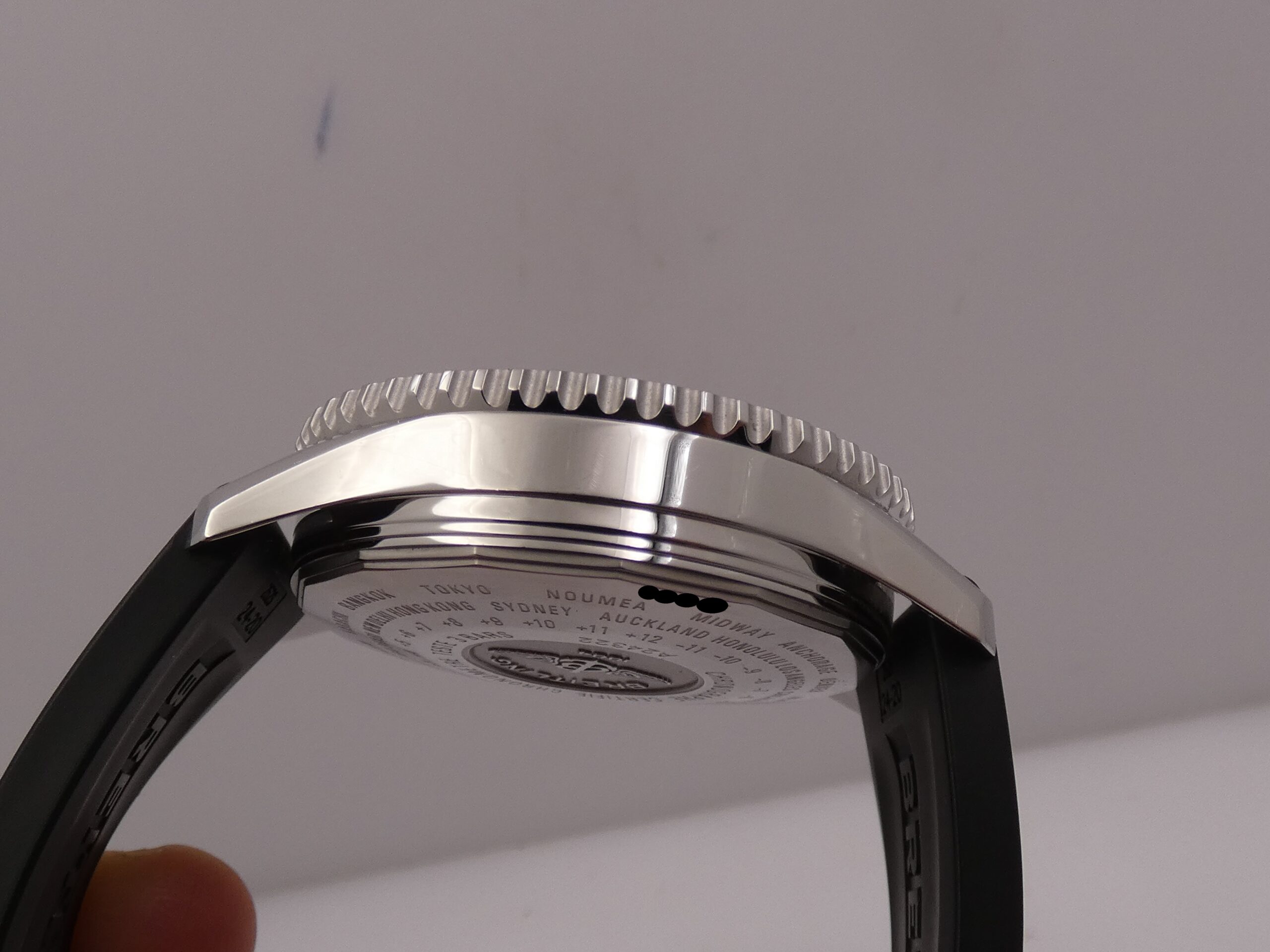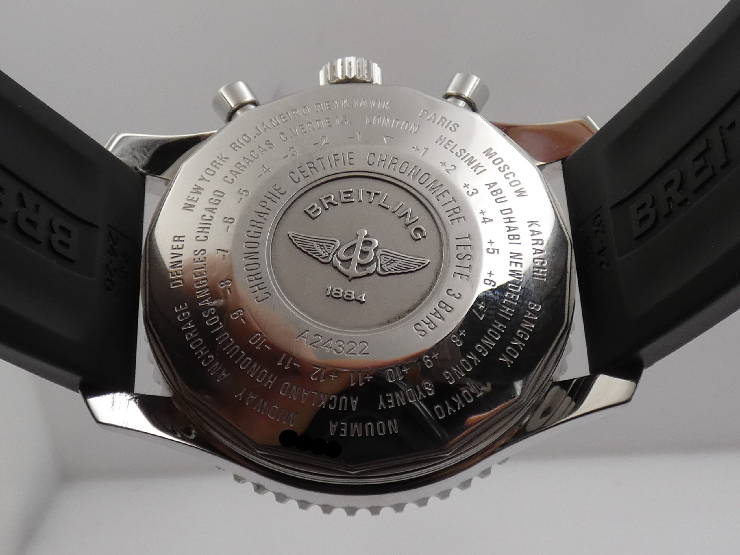 Quadrante: nero, con indici a barretta in acciaio, in rilievo e punti luminescenti in corrispondenza, lancette a punta, anch’esse in acciaio e luminescenti, secondi continui al 9, minuti del crono al 12, ore del crono al 6, secondi cronografici al centro, datario al 3, indicazione del GMT tramite sfera centrale con freccia rossa in punta, scala tachimetrica sul rehaut, scala sessantesimale con suddivisione ad 1/5 di secondo, logo Breitling al 3; rimesse rapide in corona