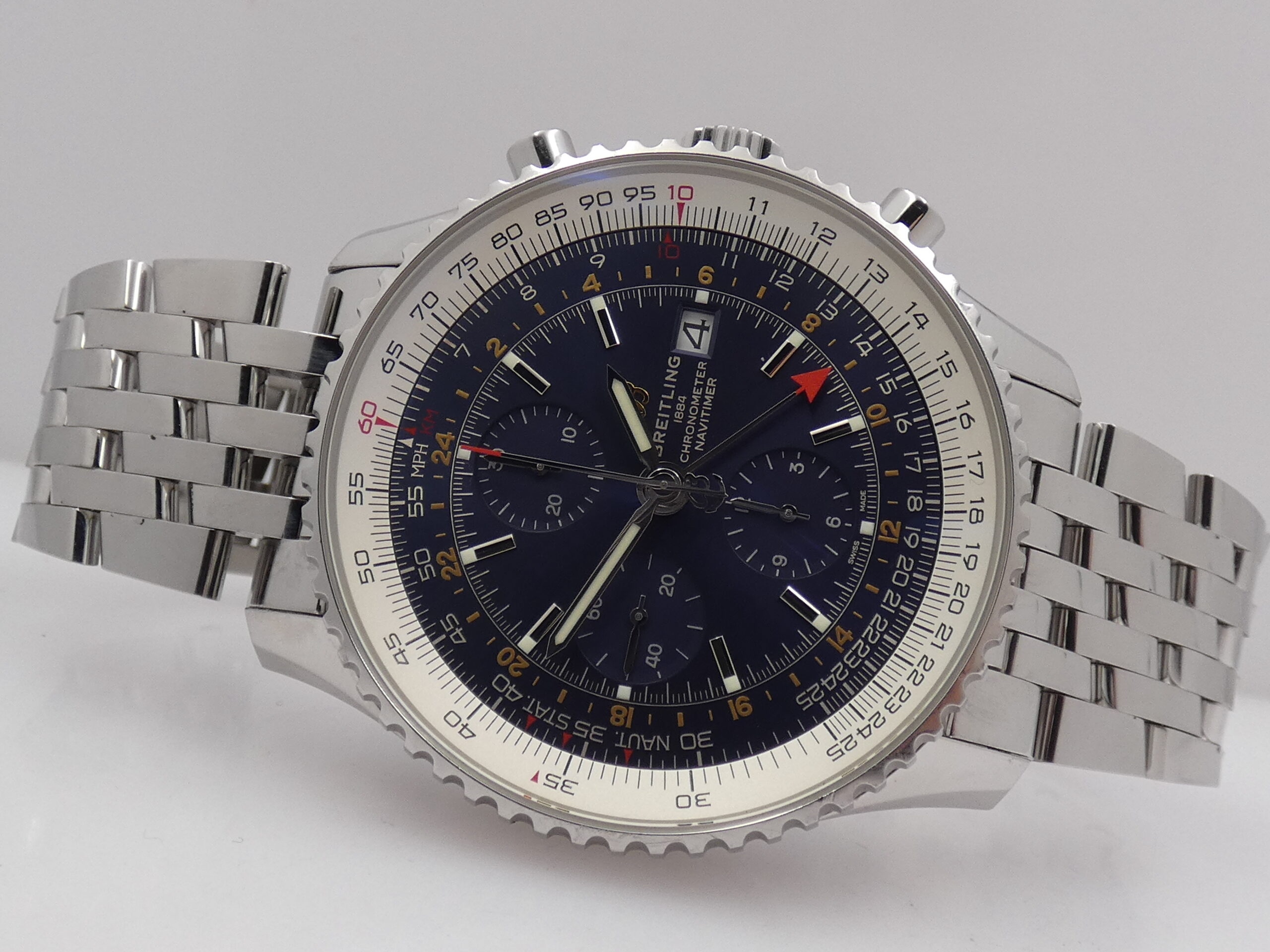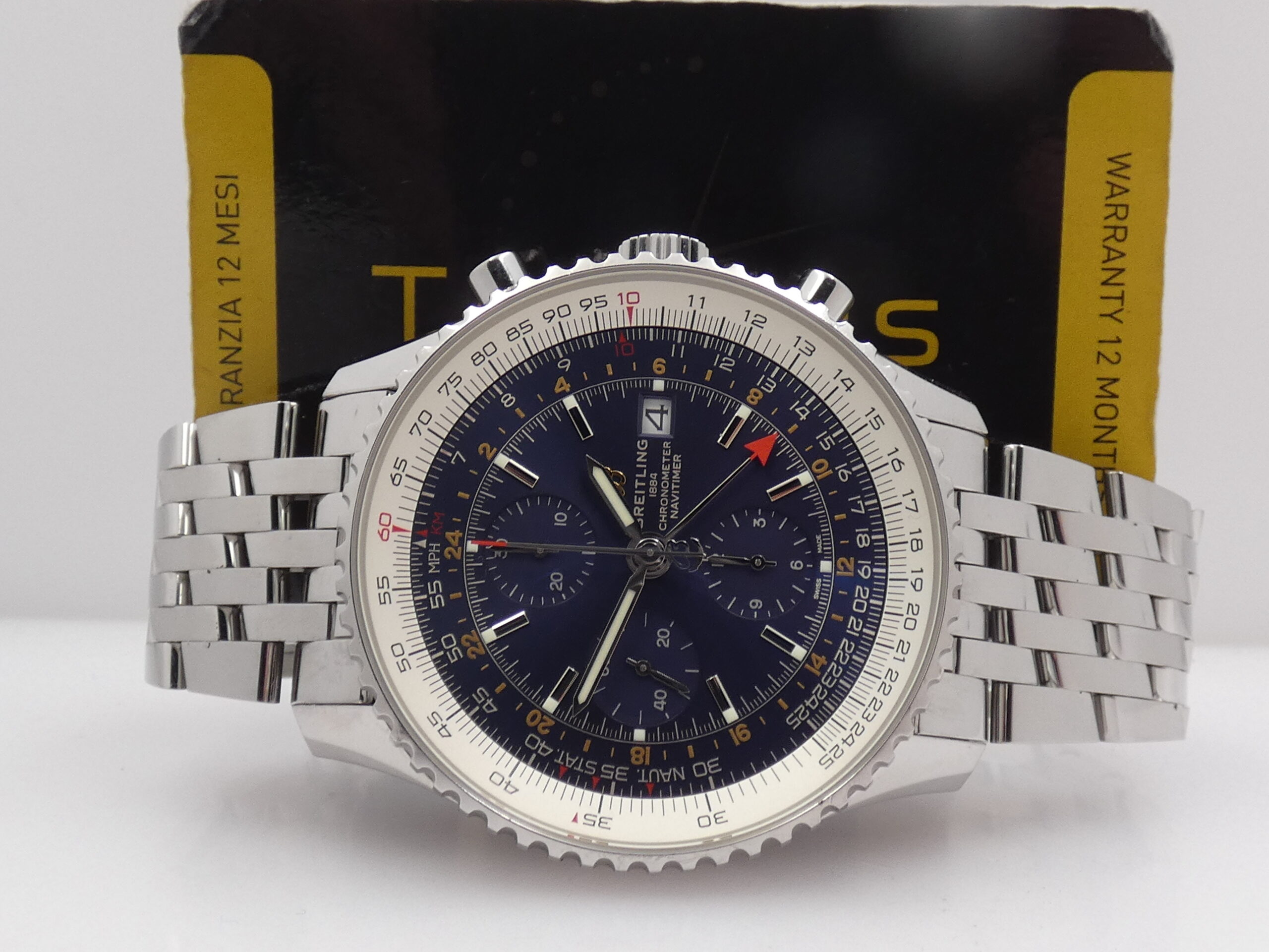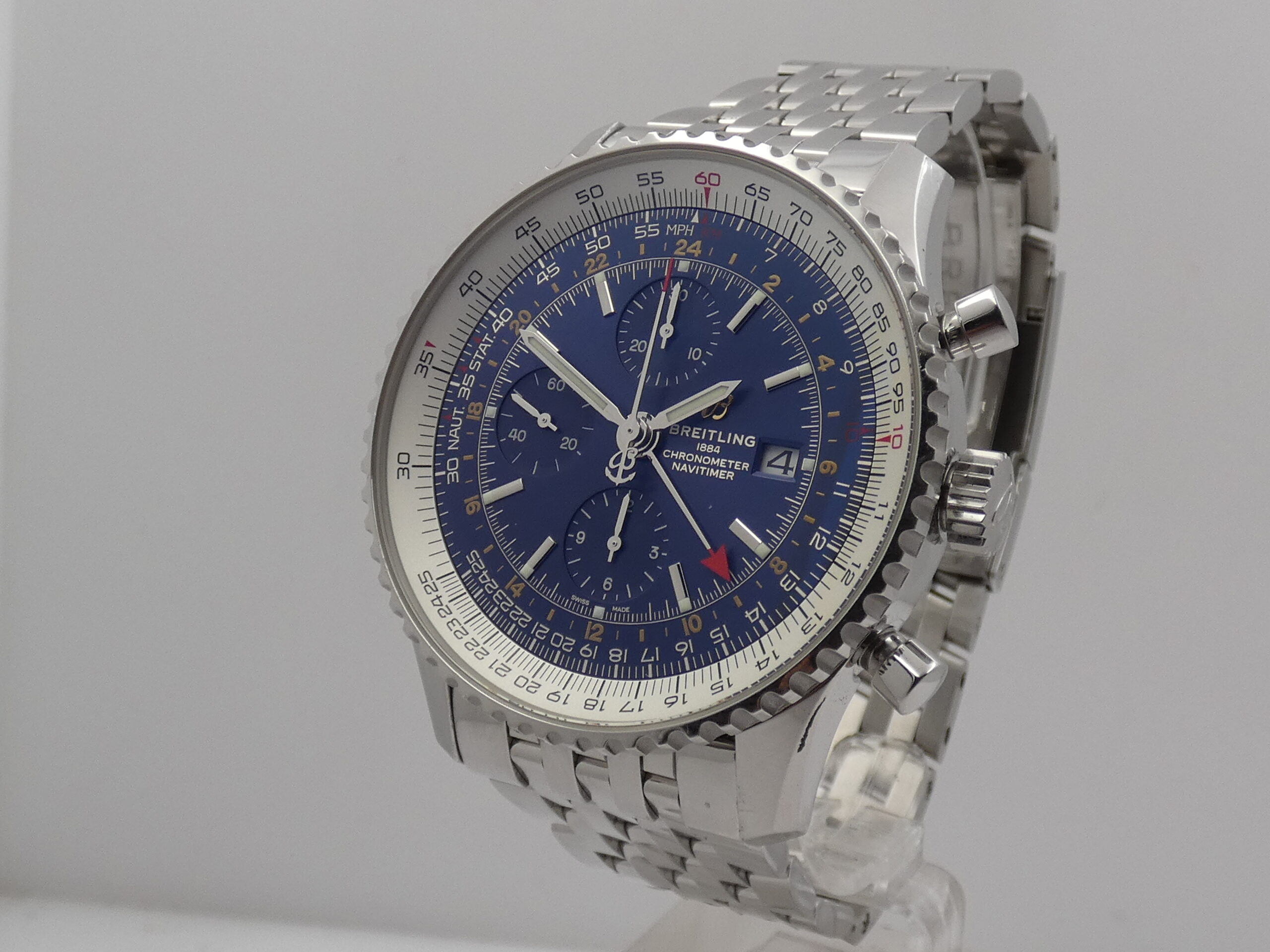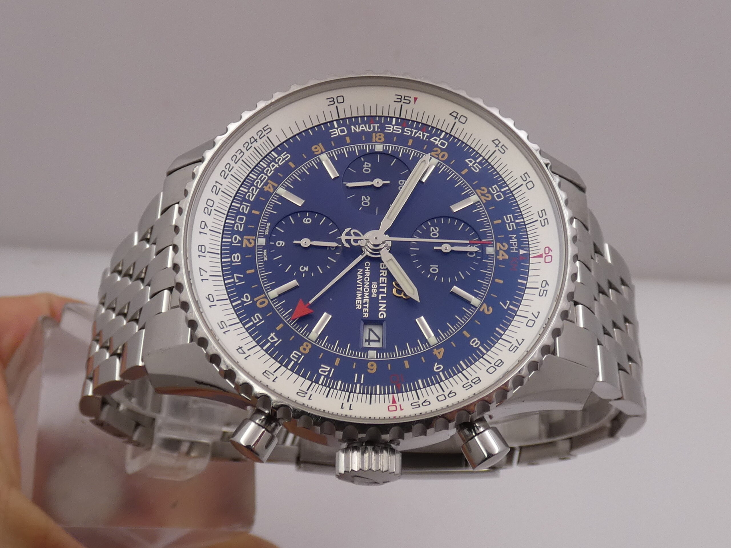 Quadrante: blu, con indici a barretta in acciaio, in rilievo e punti luminescenti in corrispondenza, lancette a stilo, anch’esse in acciaio e luminescenti, secondi continui al 9, minuti del crono al 12, ore del crono al 6, secondi cronografici al centro, datario al 3, indicazione del GMT tramite sfera centrale con freccia rossa in punta, scala tachimetrica, scala sessantesimale con suddivisione ad 1/5 di secondo, logo Breitling al 3; rimesse rapide in corona