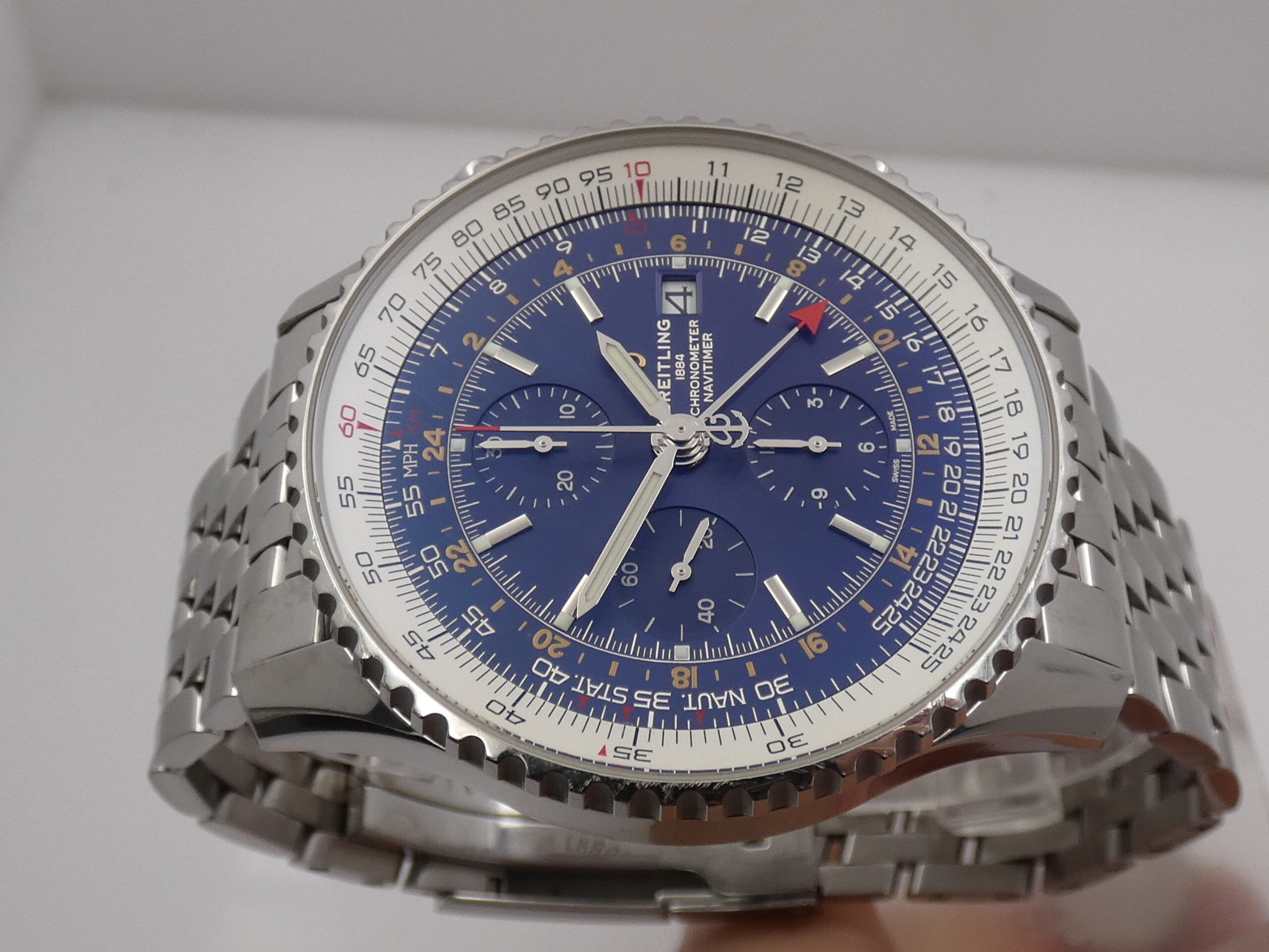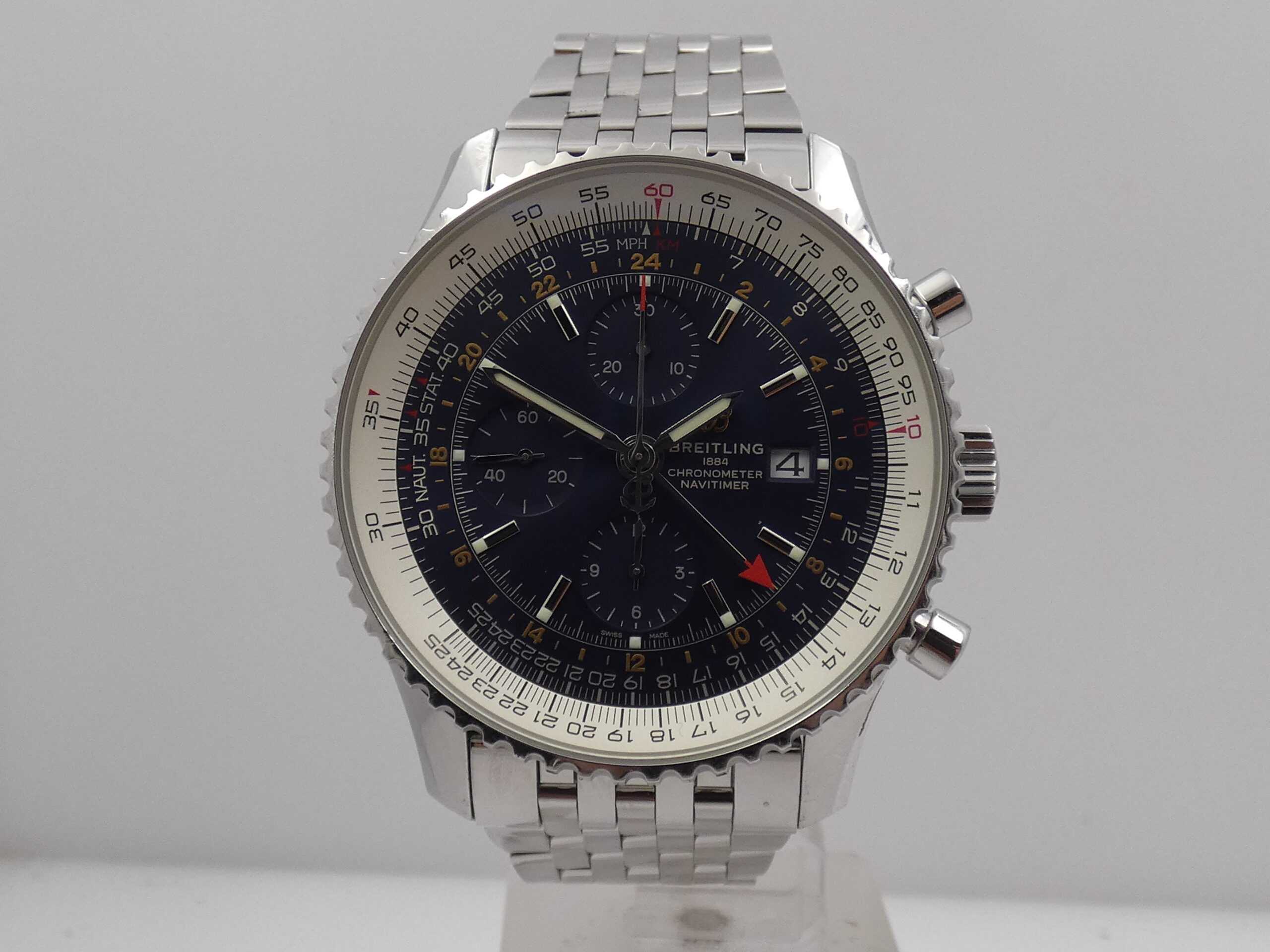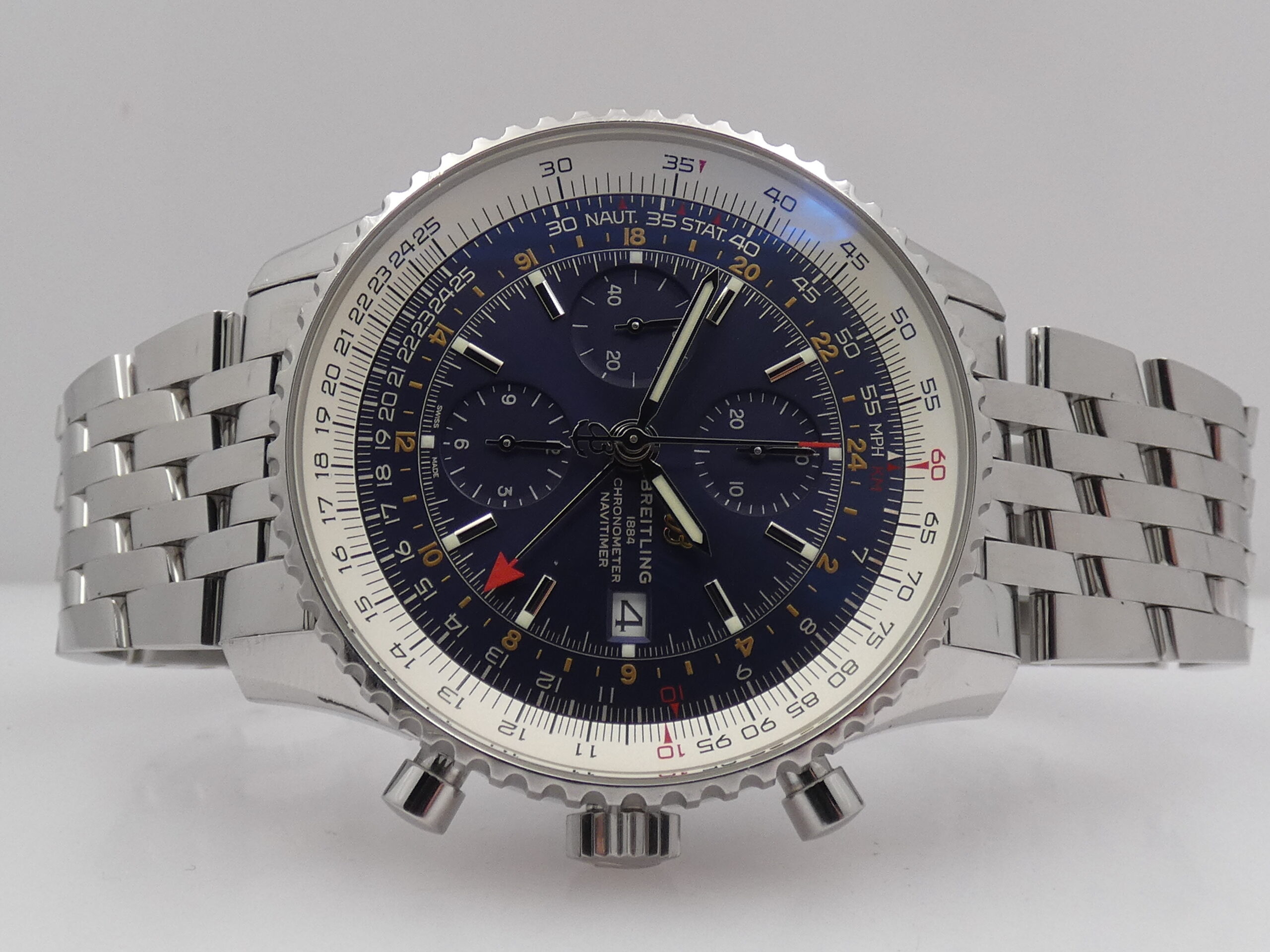 Quadrante: blu, con indici a barretta in acciaio, in rilievo e punti luminescenti in corrispondenza, lancette a stilo, anch’esse in acciaio e luminescenti, secondi continui al 9, minuti del crono al 12, ore del crono al 6, secondi cronografici al centro, datario al 3, indicazione del GMT tramite sfera centrale con freccia rossa in punta, scala tachimetrica, scala sessantesimale con suddivisione ad 1/5 di secondo, logo Breitling al 3; rimesse rapide in corona