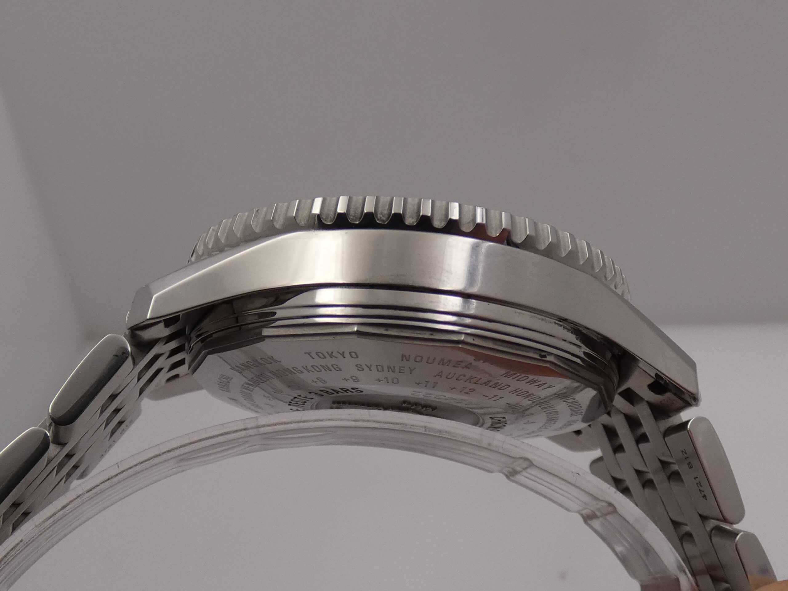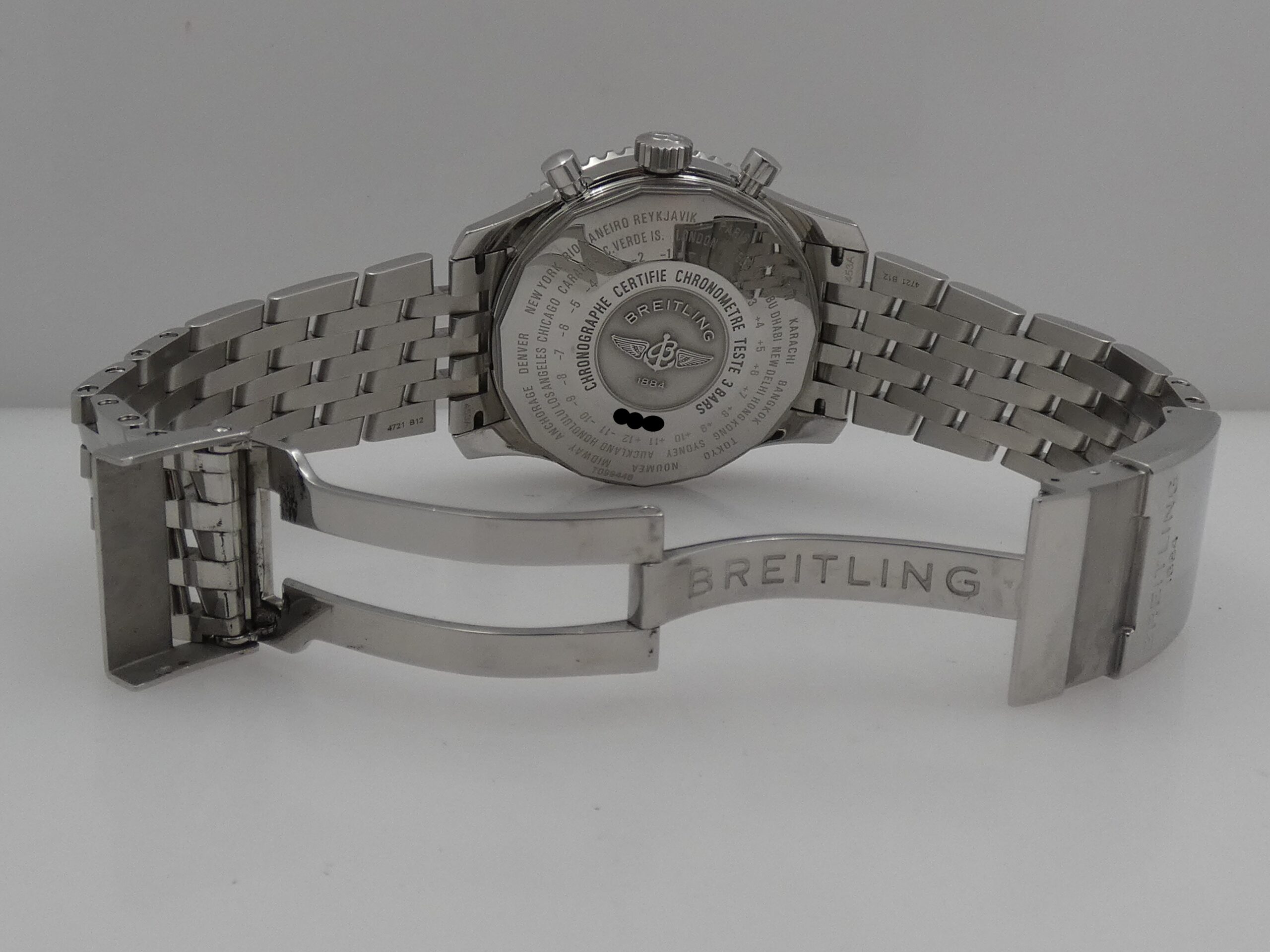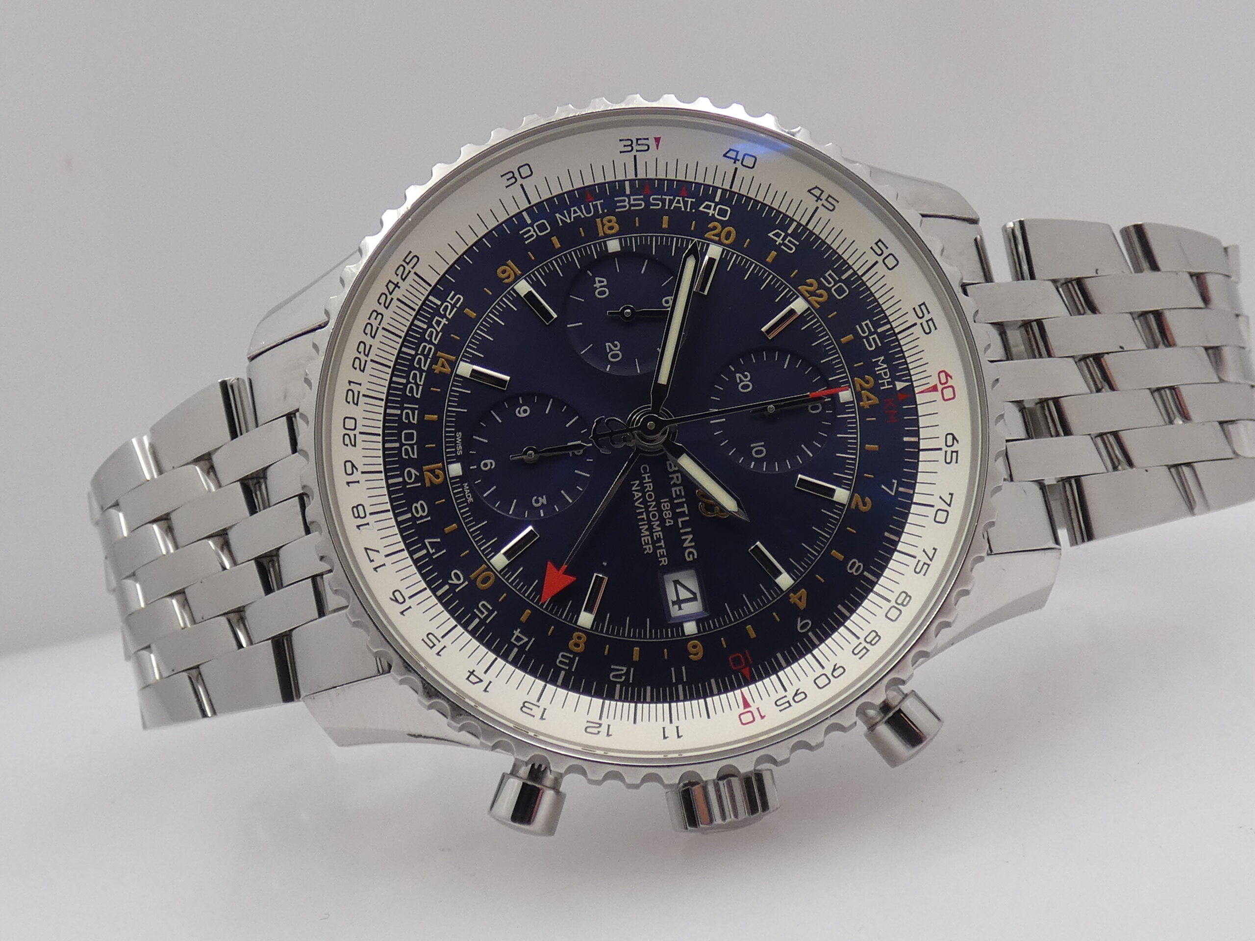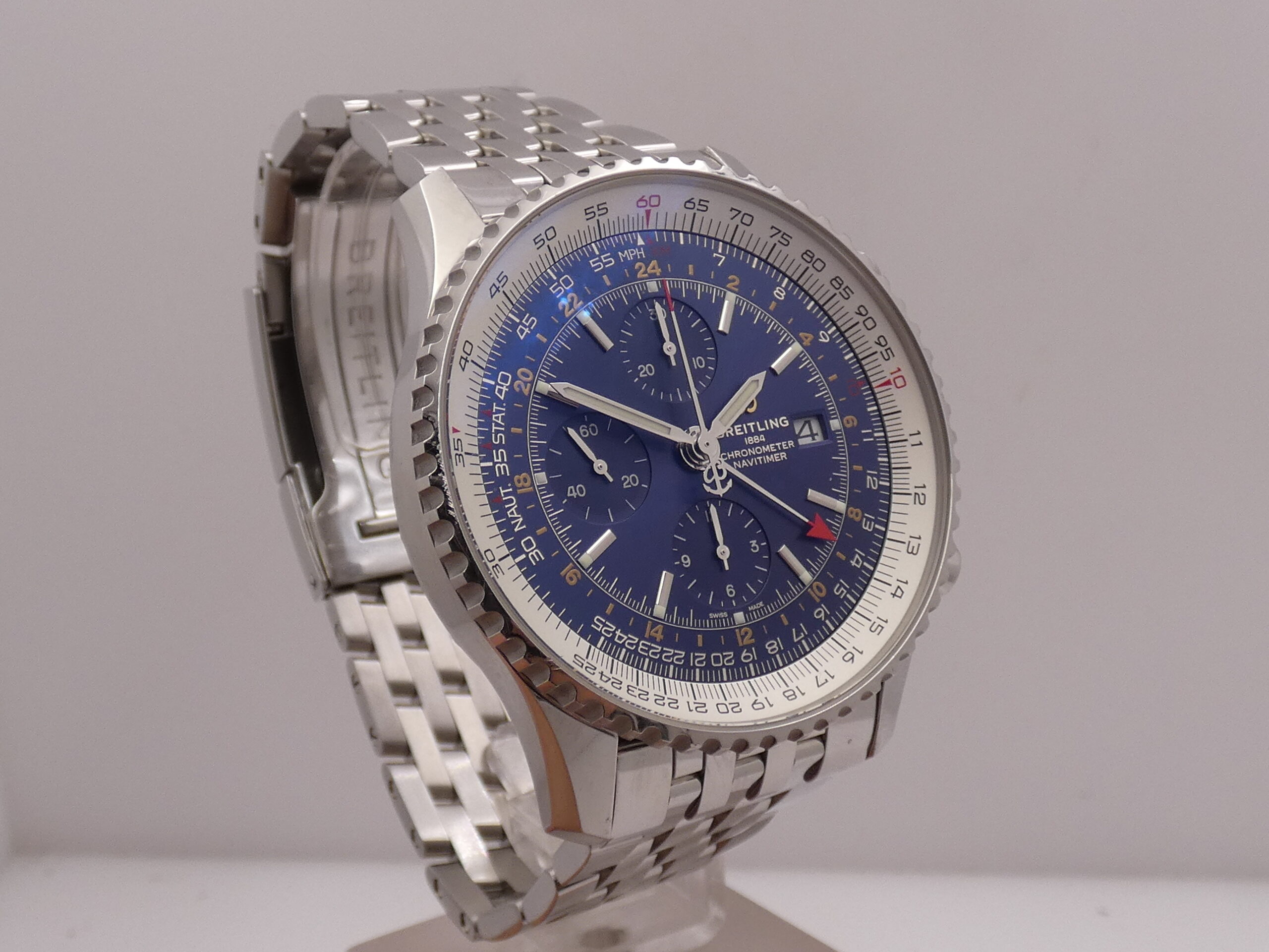 Quadrante: blu, con indici a barretta in acciaio, in rilievo e punti luminescenti in corrispondenza, lancette a stilo, anch’esse in acciaio e luminescenti, secondi continui al 9, minuti del crono al 12, ore del crono al 6, secondi cronografici al centro, datario al 3, indicazione del GMT tramite sfera centrale con freccia rossa in punta, scala tachimetrica, scala sessantesimale con suddivisione ad 1/5 di secondo, logo Breitling al 3; rimesse rapide in corona