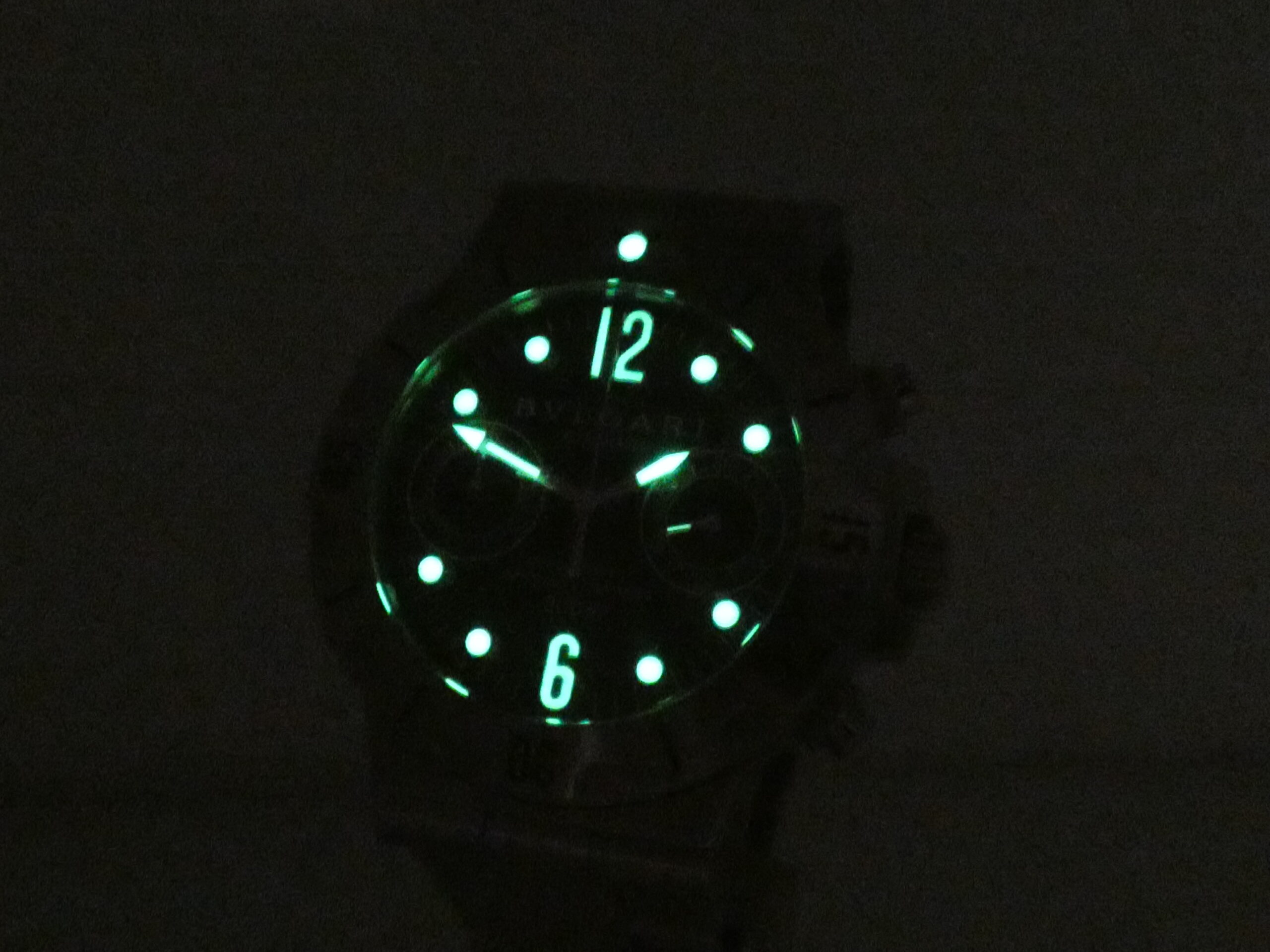 Quadrante: nero, con indici a bicchierini, arabi a mezza, in acciaio, in rilievo e trattati con materiale luminescente, lancette Arrow anch’esse in acciaio e luminescenti, secondi continui al 3, minuti (45′) del crono al 9, secondi cronografici al centro, scala sessantesimale, logo Bulgari al 12