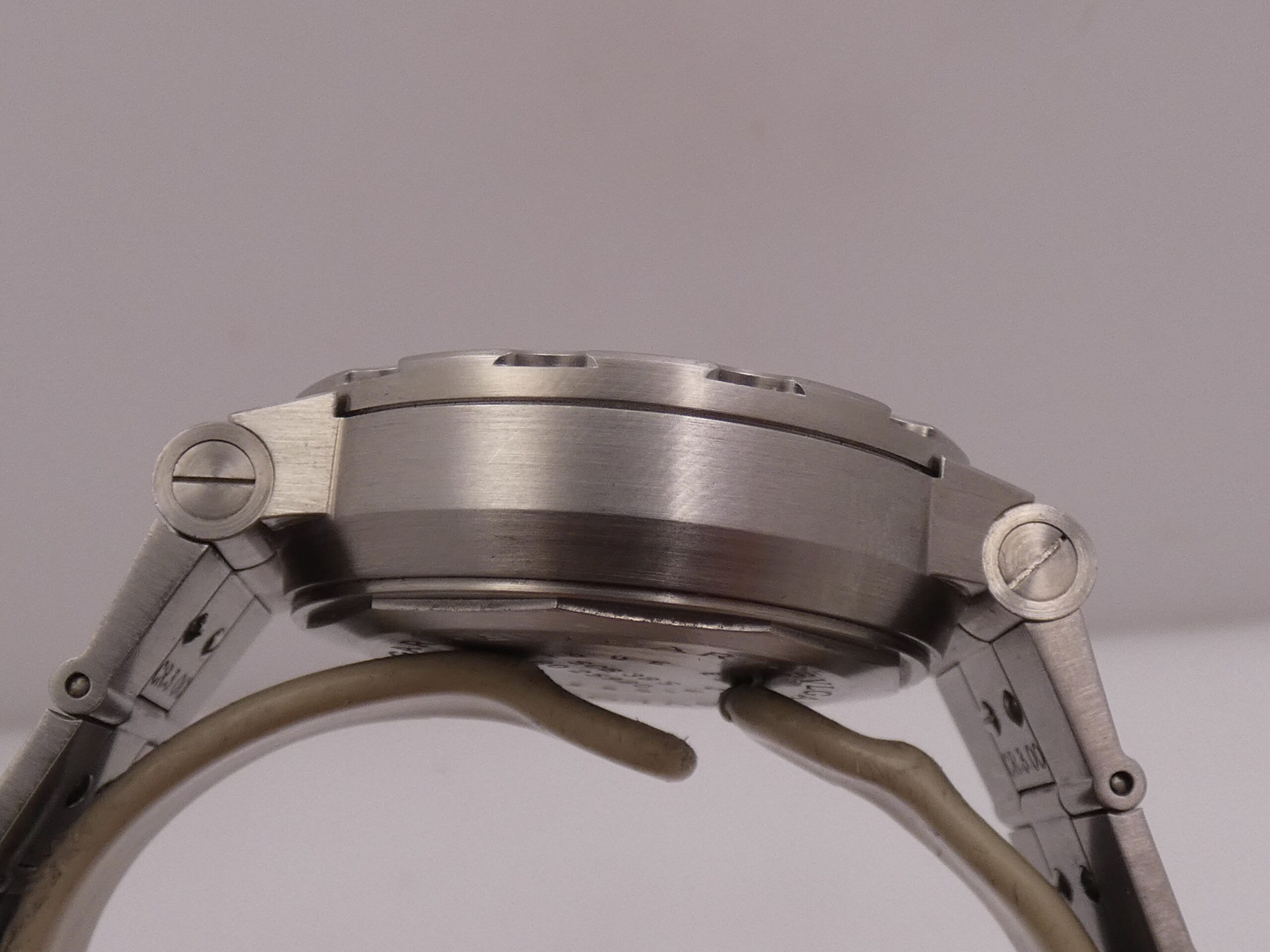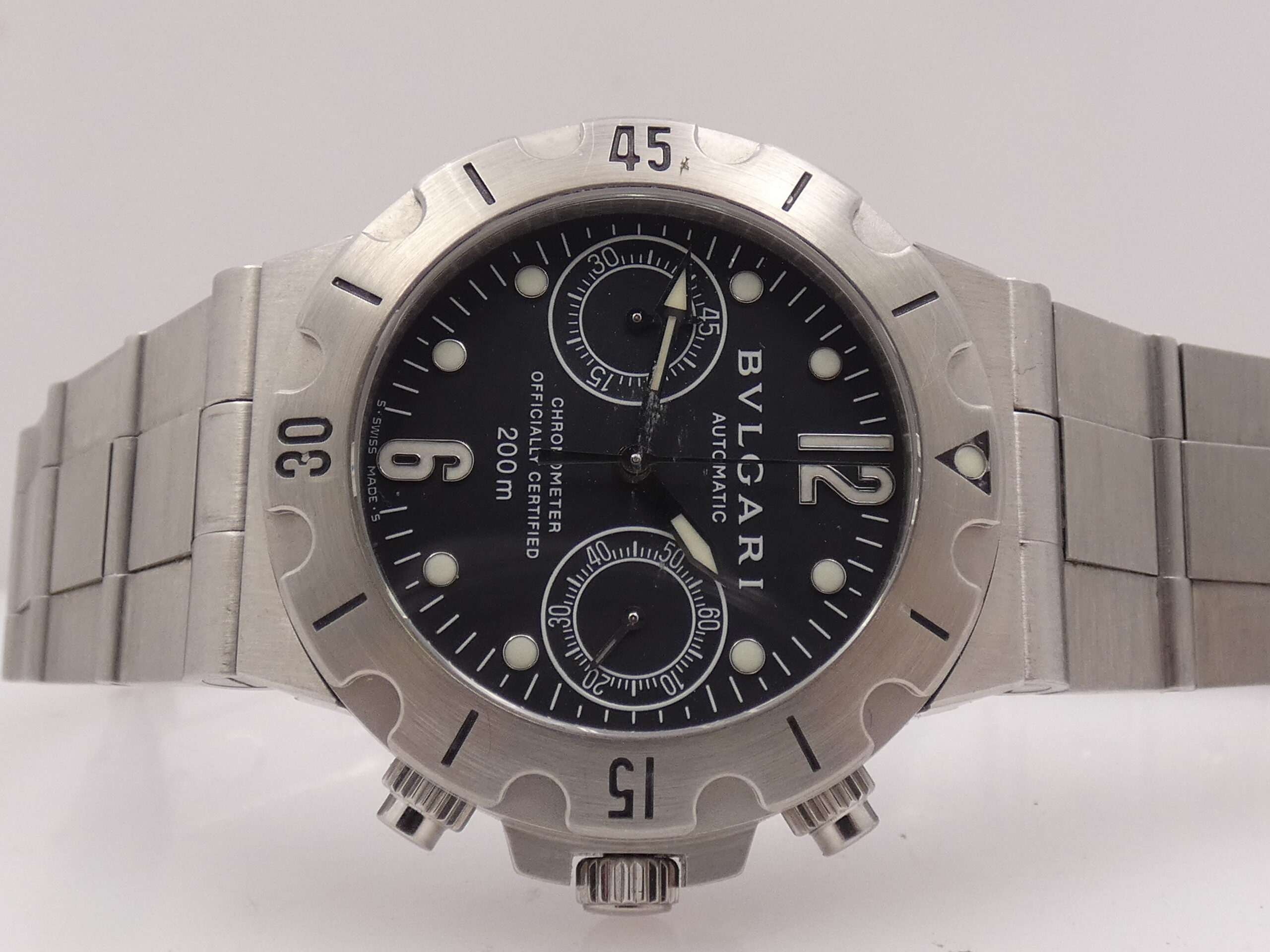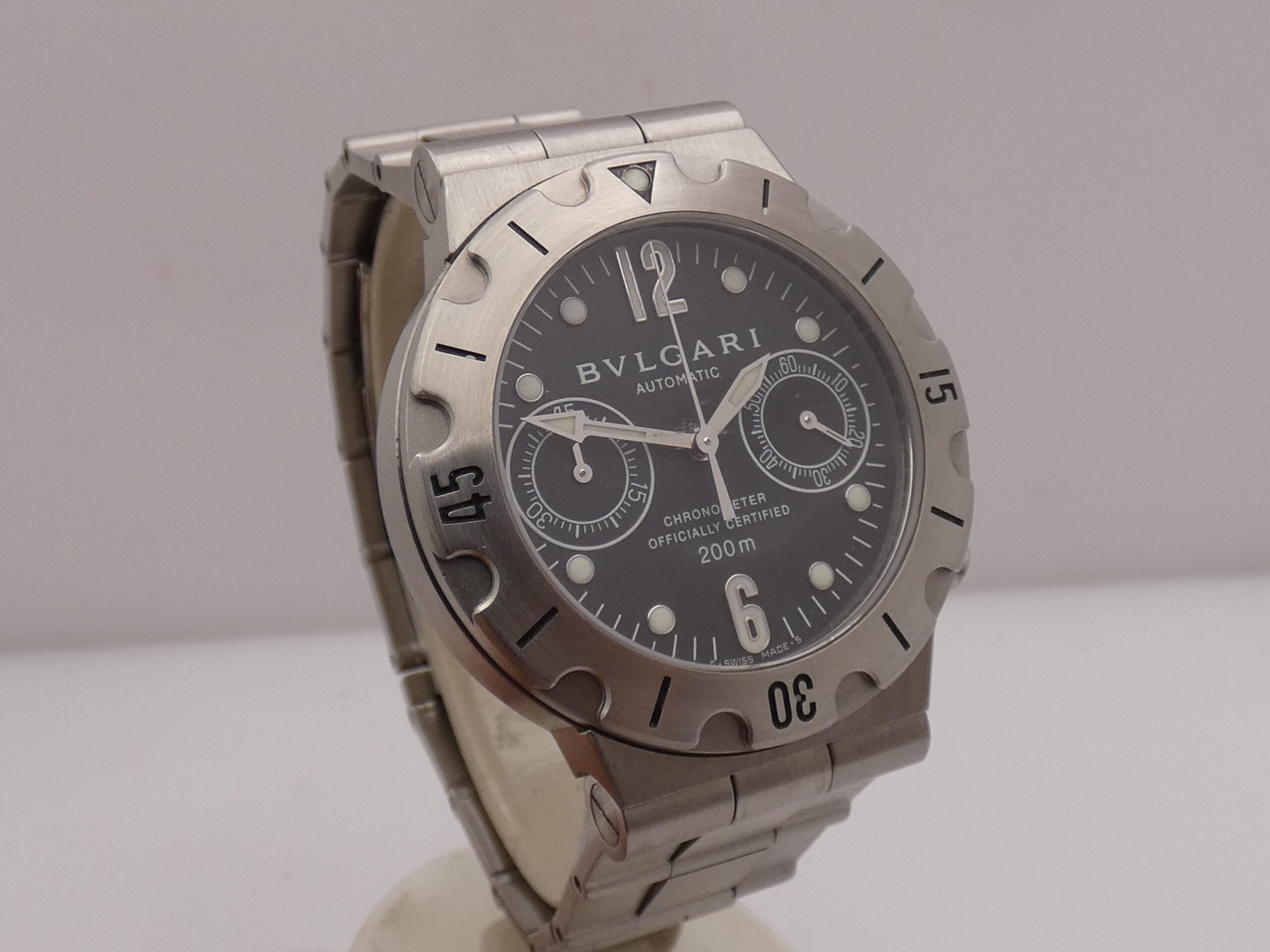 Model: Diagono Scuba Chronograph Reference: SCB 38 S Year: 2000s Movement: Mechanical, self-winding, Bulgari caliber 2282, 45 jewels, COSC-certified chronometer Functions: Hours, minutes, seconds, chronograph Case: All-steel Bezel: Unidirectional rotating bezel with a sixtieth scale for calculating dive times, luminescent dot at 12 o’clock Crown: Screw-down, with protective shoulders Push-buttons: Screw-down Lugs: Typical Bulgari Dimensions: 38 mm excluding crown, 40 mm at the lugs Crystal: Sapphire Case back: Screw-down, featuring the brand’s logo Dial: Black, with raised steel indexes and Arabic numerals, treated with luminescent material, steel Arrow hands and Luminous hands, running seconds at 3 o’clock, chronograph minutes (45′) at 9 o’clock, central chronograph seconds, 60-minute scale, Bulgari logo at 12 o’clock Bracelet: Steel, original Bulgari Clasp: Steel folding clasp, original Bulgari The watch you see for sale is in excellent condition, in perfect working order, accurate and reliable, and waterproof: water resistance is guaranteed by a test performed and shown in the photos. It is completely original. It will be delivered to you with our box and our 12-month warranty on proper functioning!!! It’s pictured. Gorgeous!!! WE WILL EXAMINE YOUR PRE-OWNED ITEM. WE SHIP FREE WORLDWIDE. |