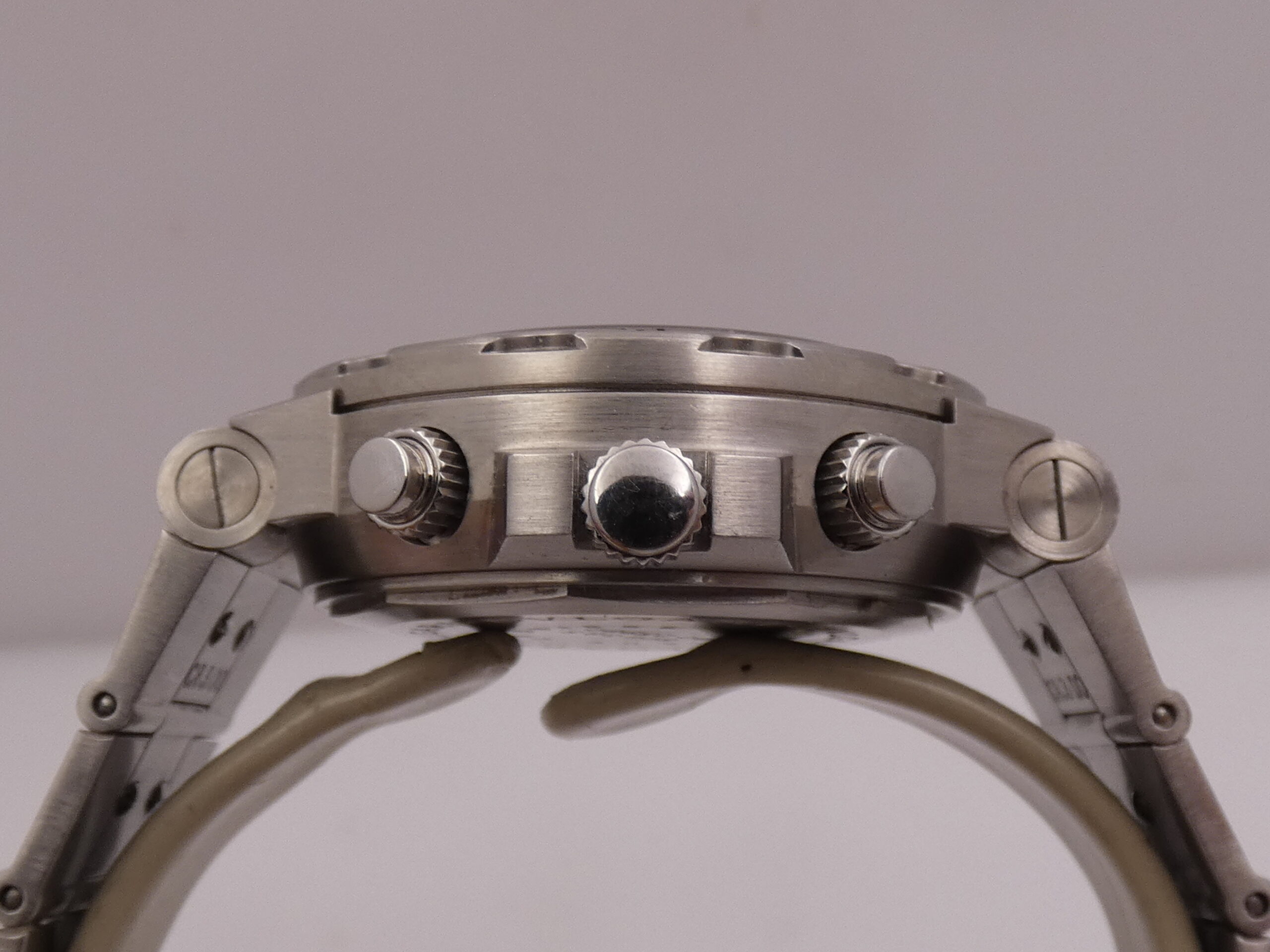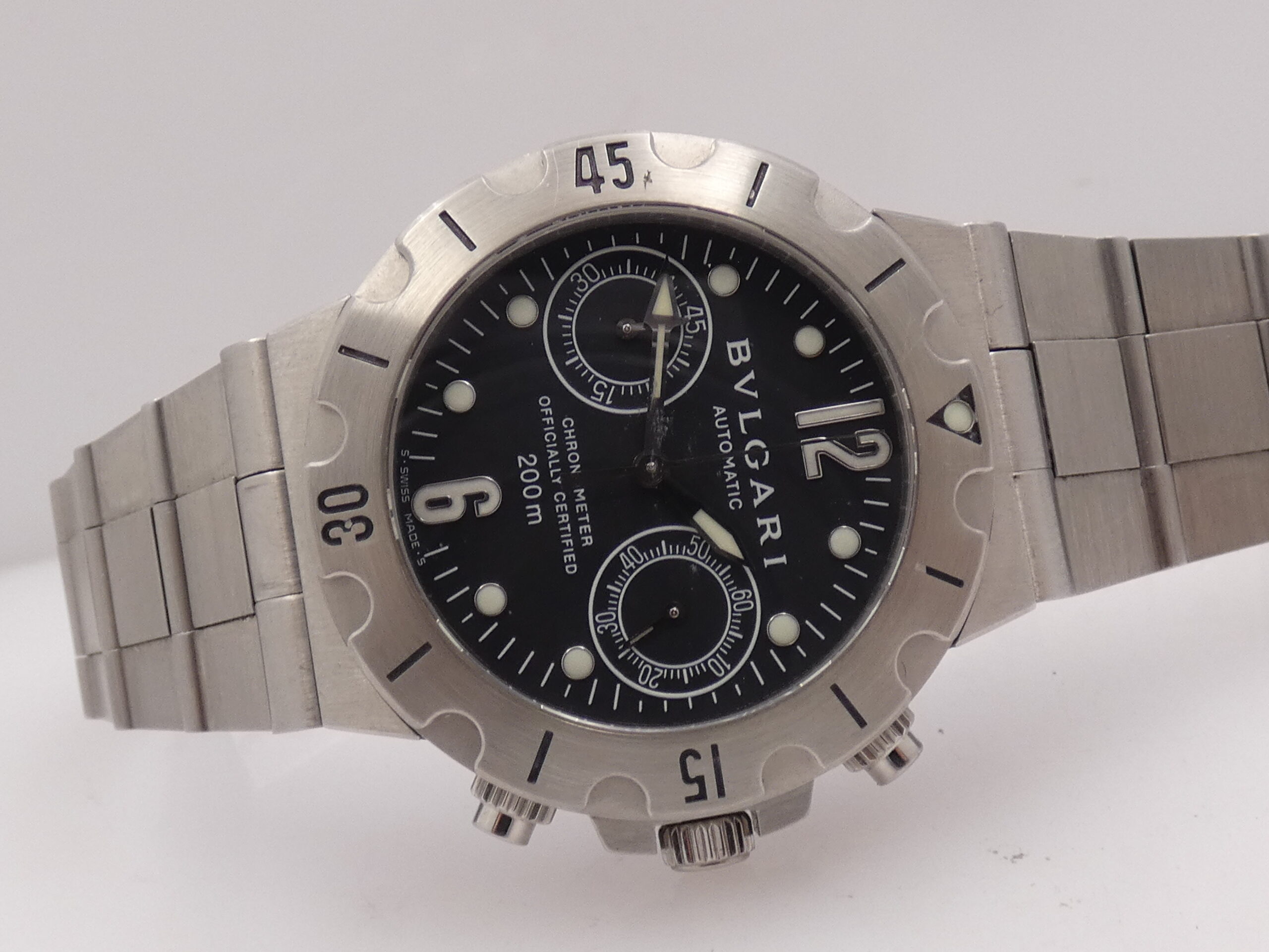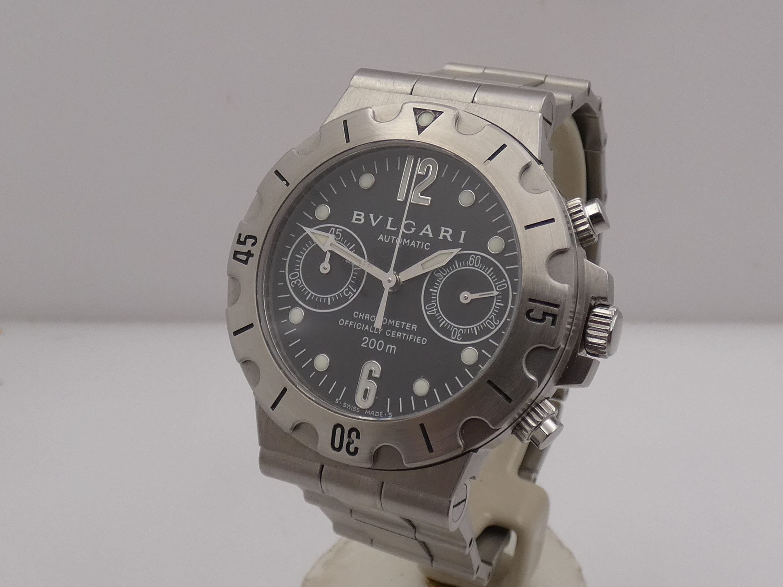 Model: Diagono Scuba Chronograph Reference: SCB 38 S Year: 2000s Movement: Mechanical, self-winding, Bulgari caliber 2282, 45 jewels, COSC-certified chronometer Functions: Hours, minutes, seconds, chronograph Case: All-steel Bezel: Unidirectional rotating bezel with a sixtieth scale for calculating dive times, luminescent dot at 12 o’clock Crown: Screw-down, with protective shoulders Push-buttons: Screw-down Lugs: Typical Bulgari Dimensions: 38 mm excluding crown, 40 mm at the lugs Crystal: Sapphire Case back: Screw-down, featuring the brand’s logo Dial: Black, with raised steel indexes and Arabic numerals, treated with luminescent material, steel Arrow hands and Luminous hands, running seconds at 3 o’clock, chronograph minutes (45′) at 9 o’clock, central chronograph seconds, 60-minute scale, Bulgari logo at 12 o’clock Bracelet: Steel, original Bulgari Clasp: Steel folding clasp, original Bulgari The watch you see for sale is in excellent condition, in perfect working order, accurate and reliable, and waterproof: water resistance is guaranteed by a test performed and shown in the photos. It is completely original. It will be delivered to you with our box and our 12-month warranty on proper functioning!!! It’s pictured. Gorgeous!!! WE WILL EXAMINE YOUR PRE-OWNED ITEM. WE SHIP FREE WORLDWIDE. |