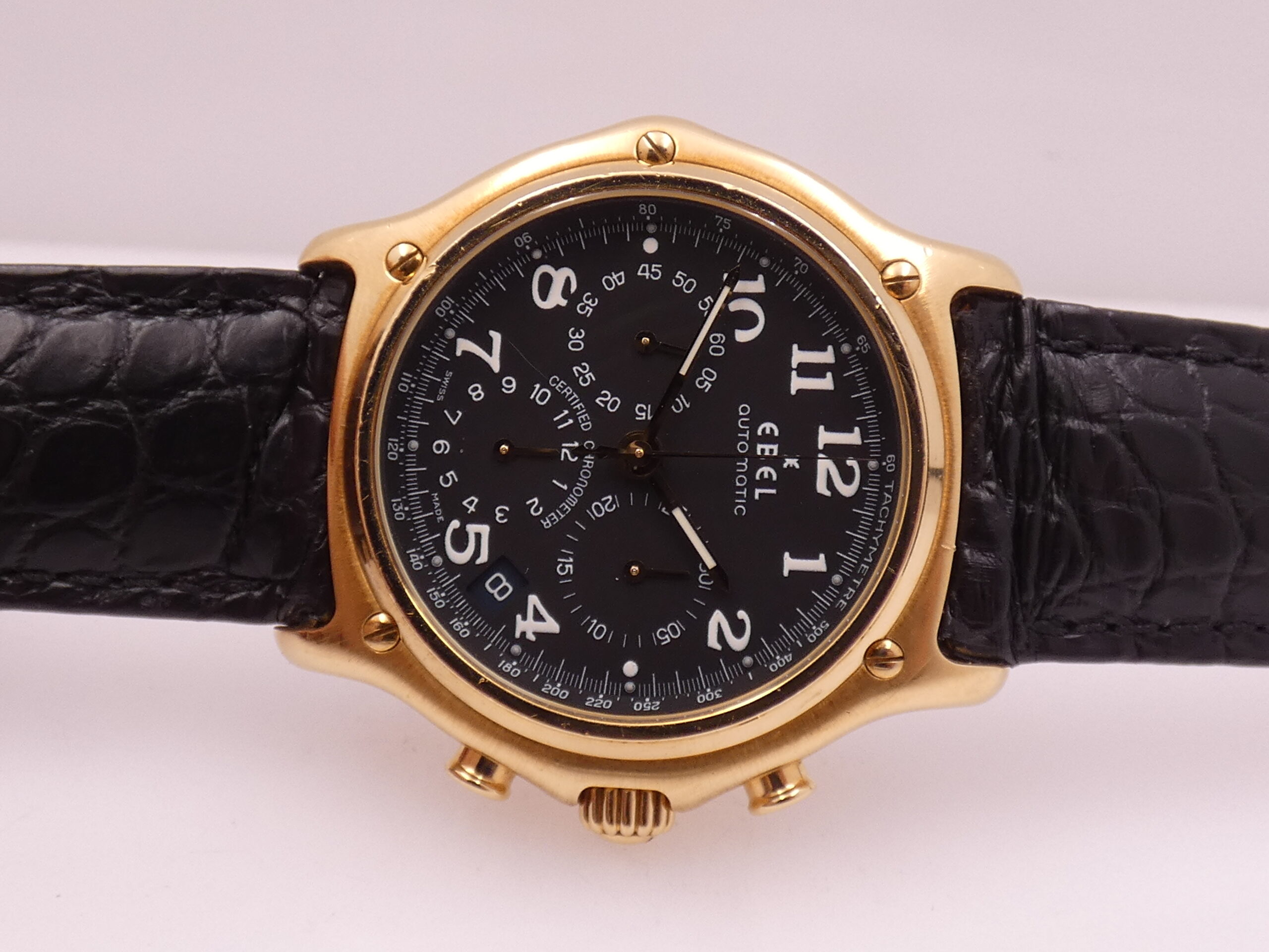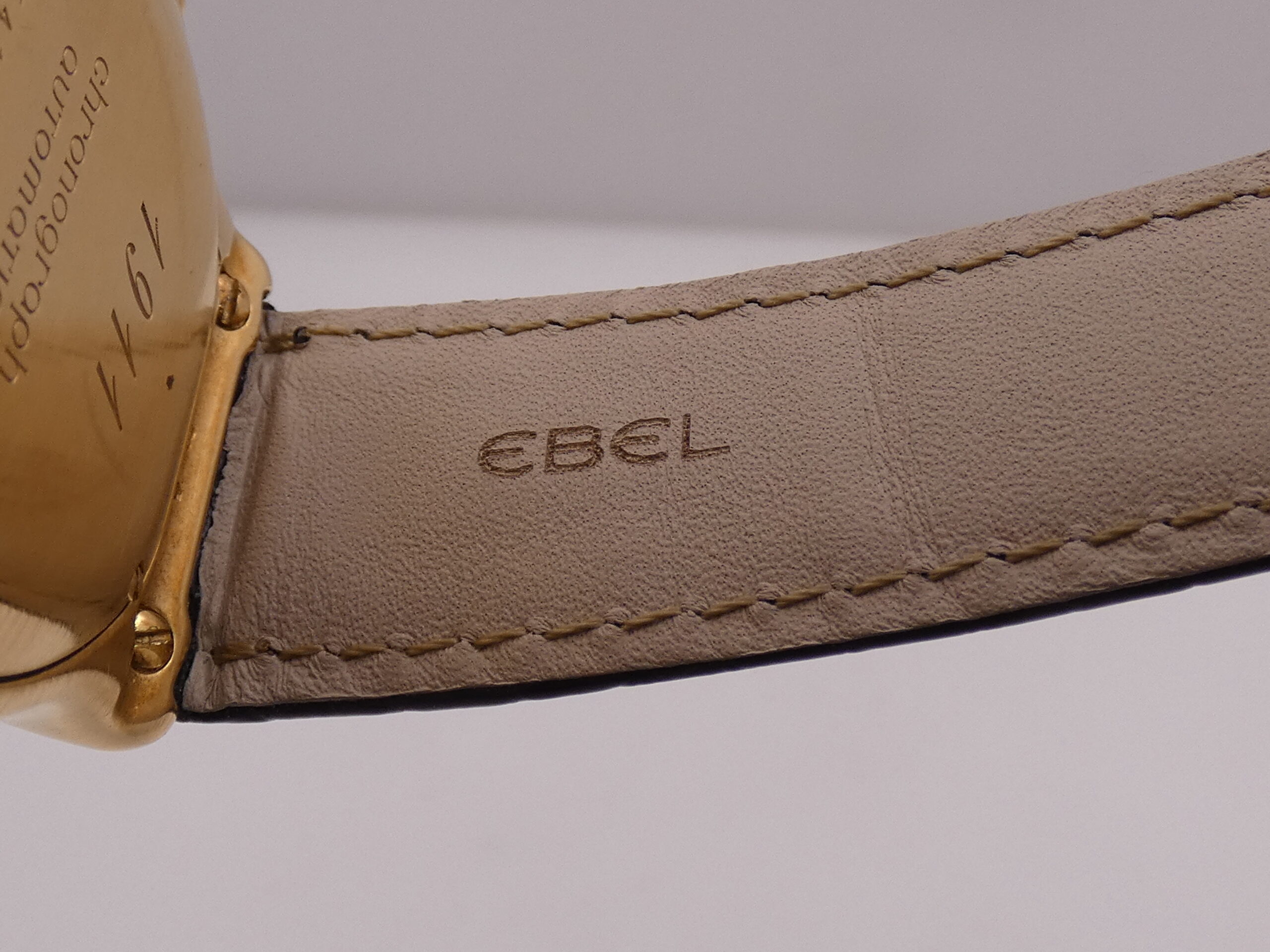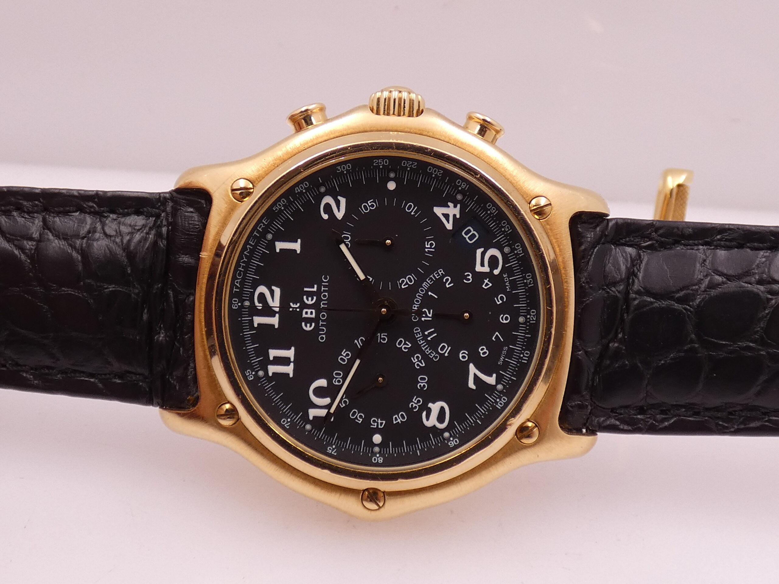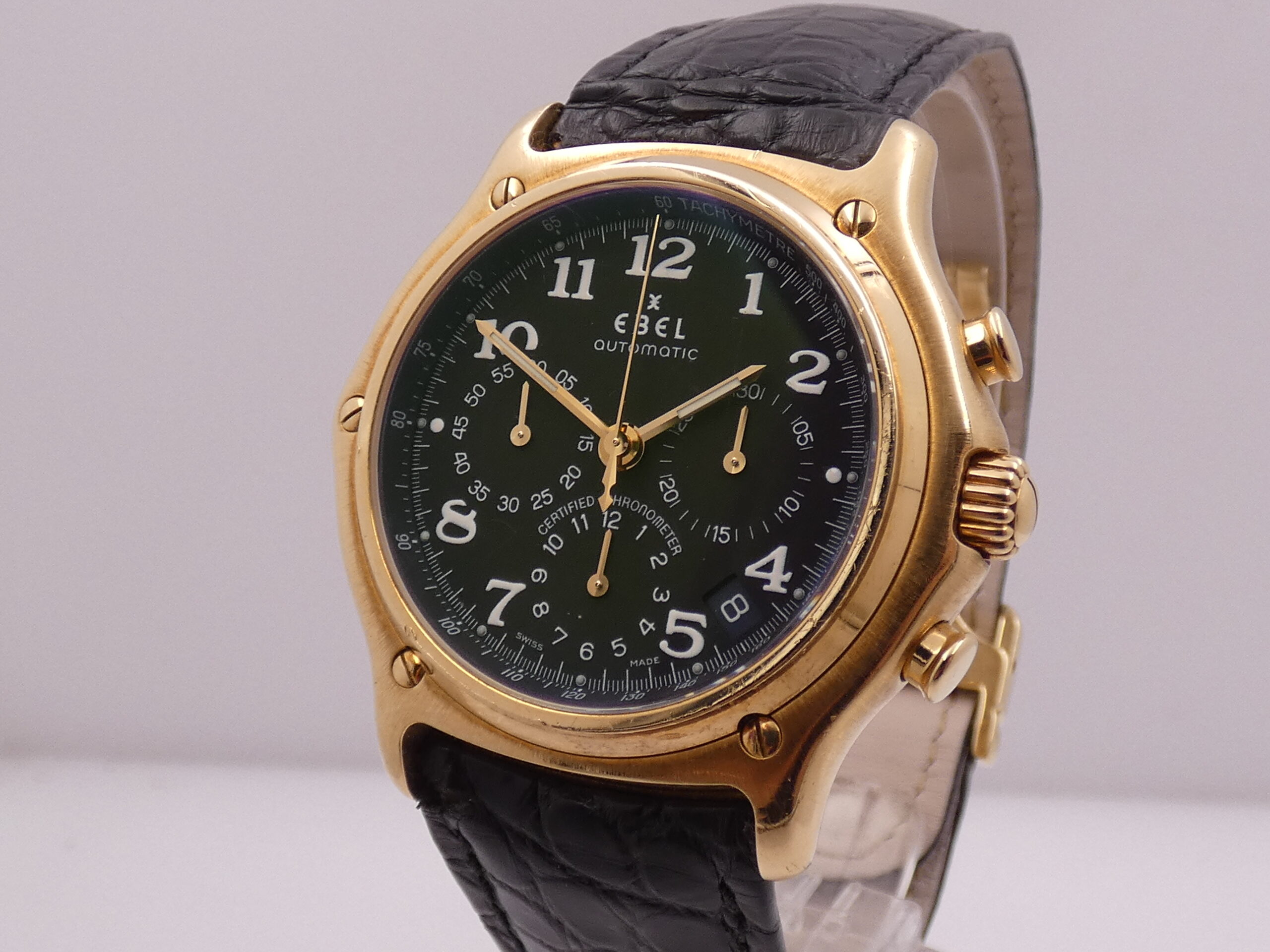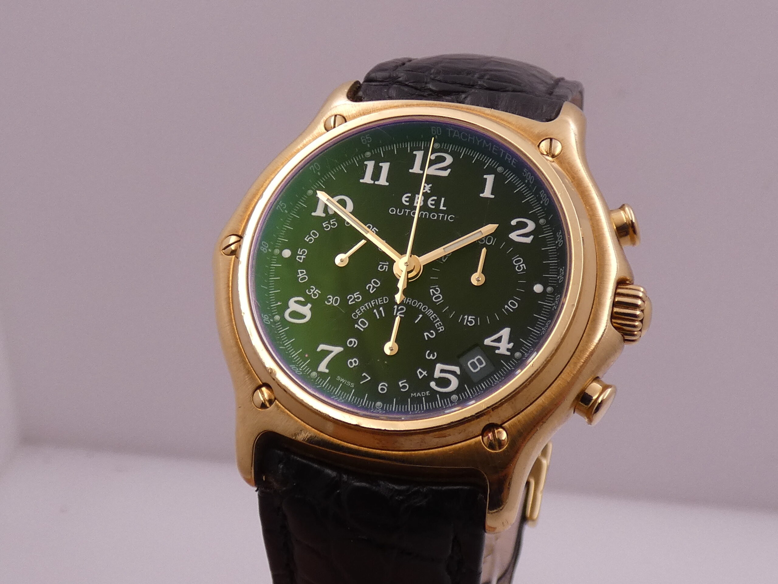 Quadrante: nero, con indici arabi e punti luminescenti in corrispondenza, lancette a stilo, anch’esse in oro e luminescenti, secondi continui al 9, minuti del crono al 3, ore del crono al 6, secondi cronografici al centro, datario tra il 4 e il 5 con rimessa rapida in corona, scala tachimetrica sul rehaut, scala sessantesimale con suddivisione ad 1/5 di secondo, logo Ebel al 12