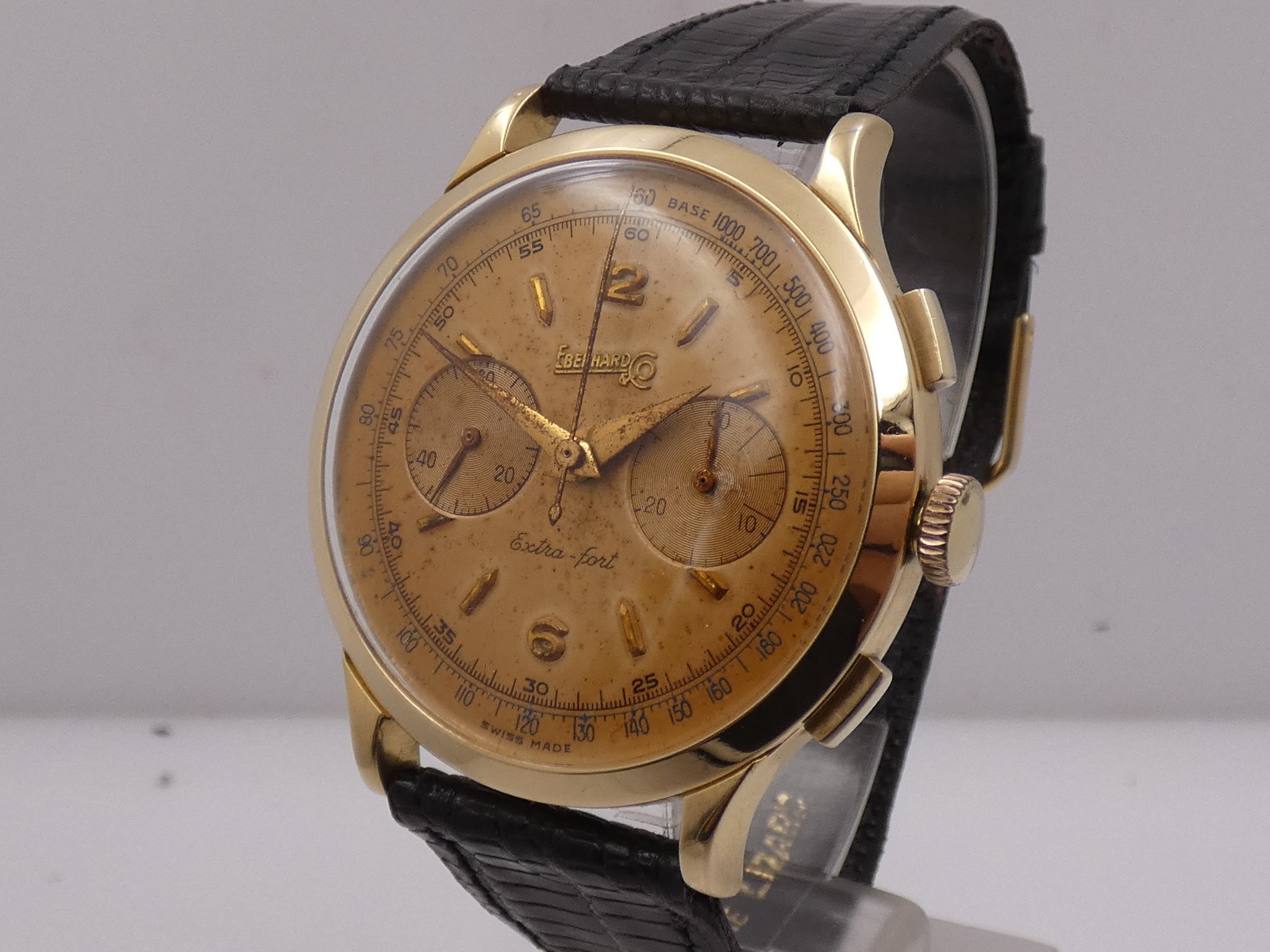Quadrante: bianco/argentè, con marcati segni del tempo, indici a barretta, arabi a mezza, in oro ed in rilievo, lancette dauphine, anch’esse in oro, secondi continui al 9, minuti del crono al 3, secondi cronografici al centro, scala tachimetrica blu, scala sessantesimale nera con suddivisione ad 1/5 di secondo, logo Eberhard al 12