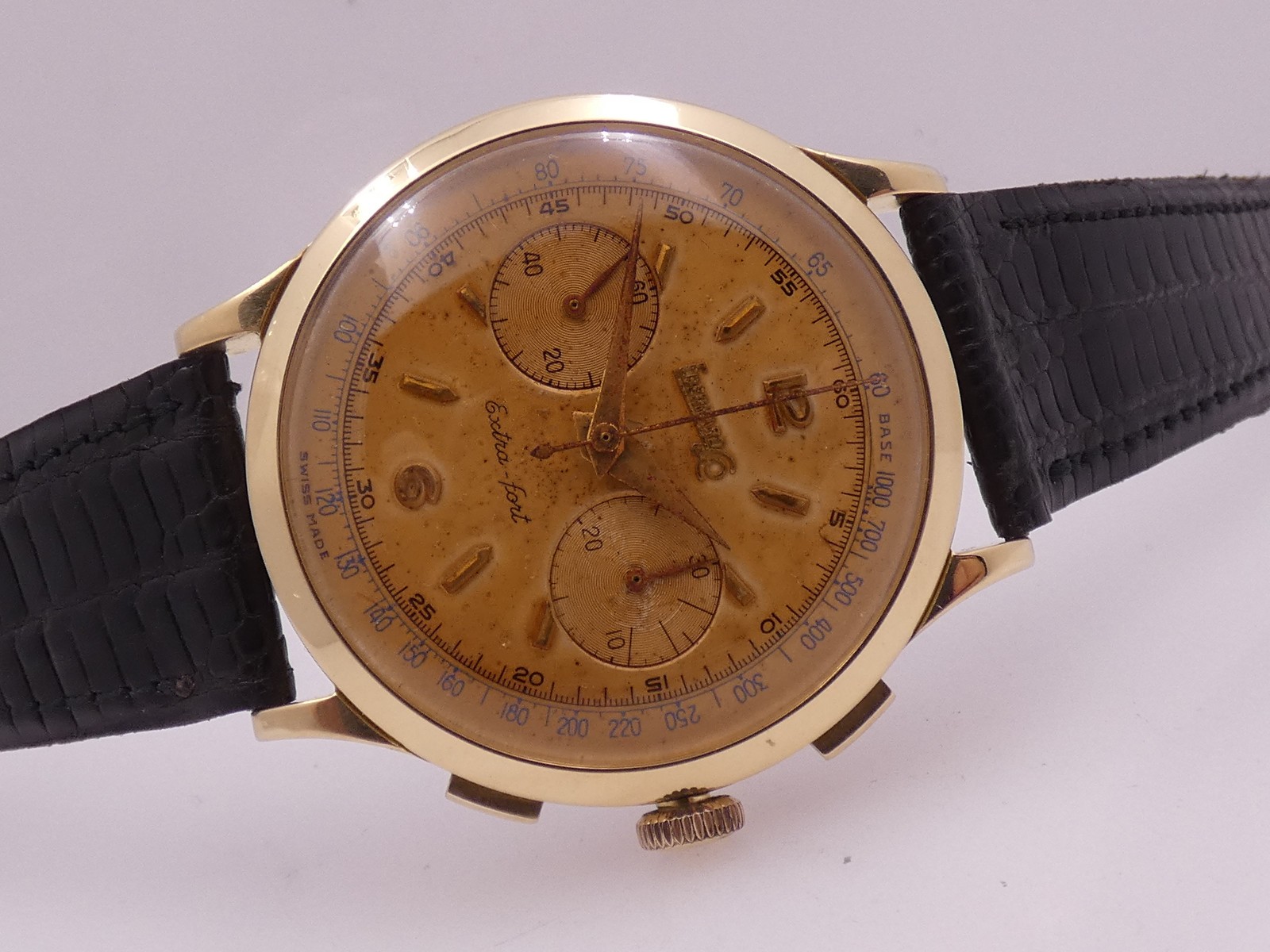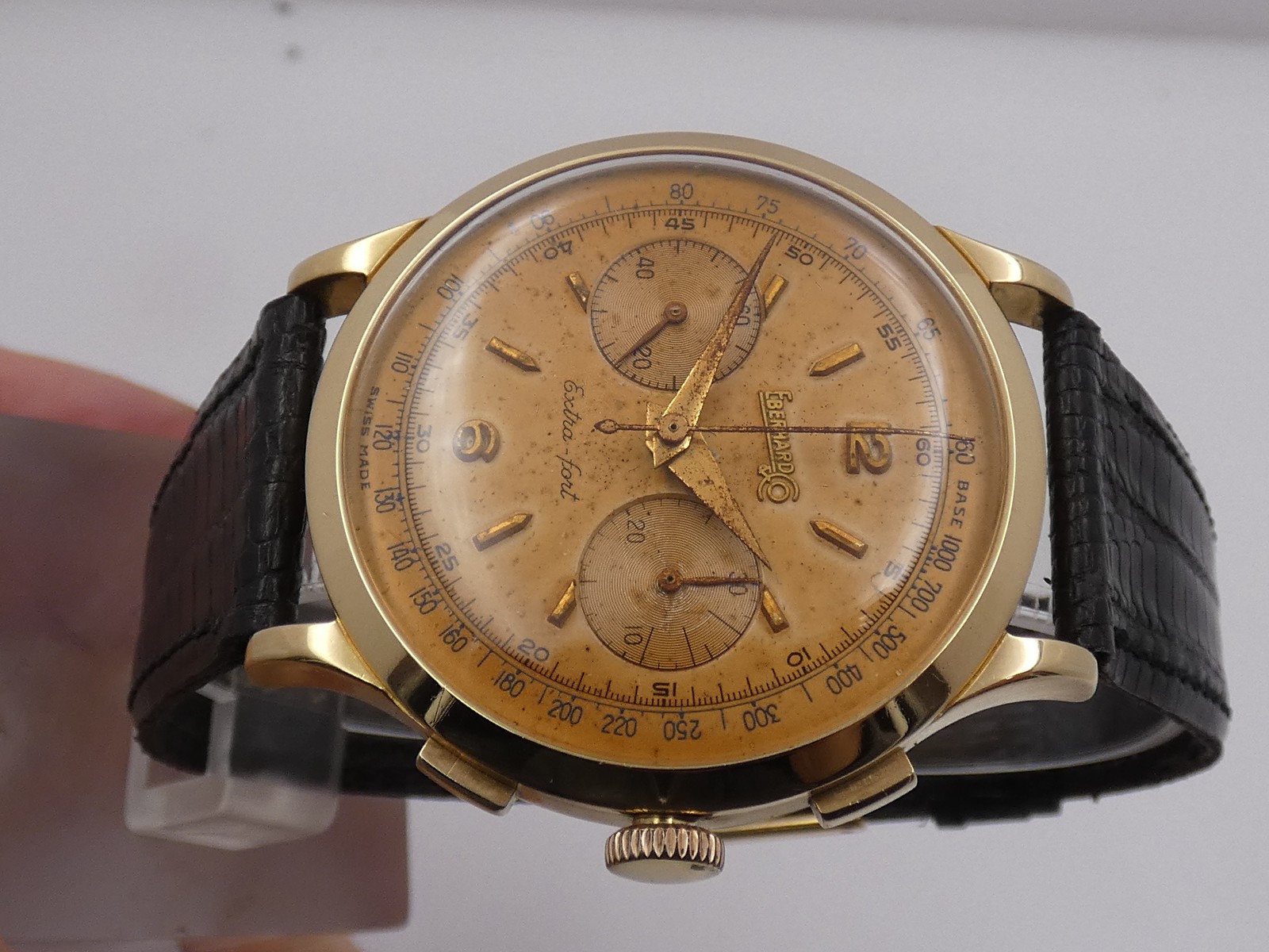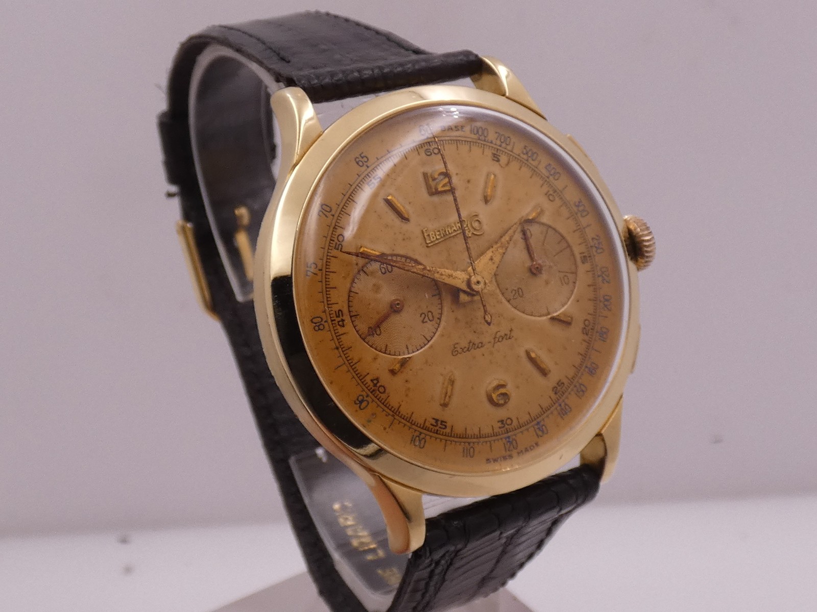Dial: white/silver, with marked signs of time, bar indexes, Arabic half, in gold and in relief, dauphine hands, also in gold, continuous seconds at 9, chrono minutes at 3, chronograph seconds in the center, blue tachometric scale, black sextensimal scale with 1/5 second divisions, Eberhard logo at 12