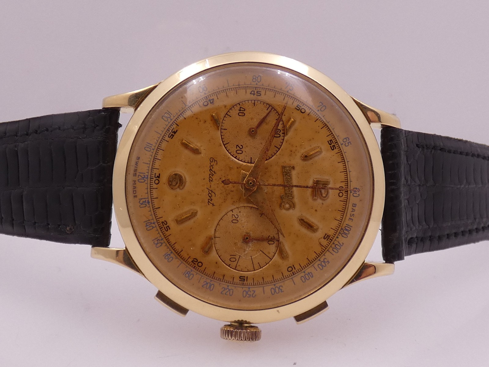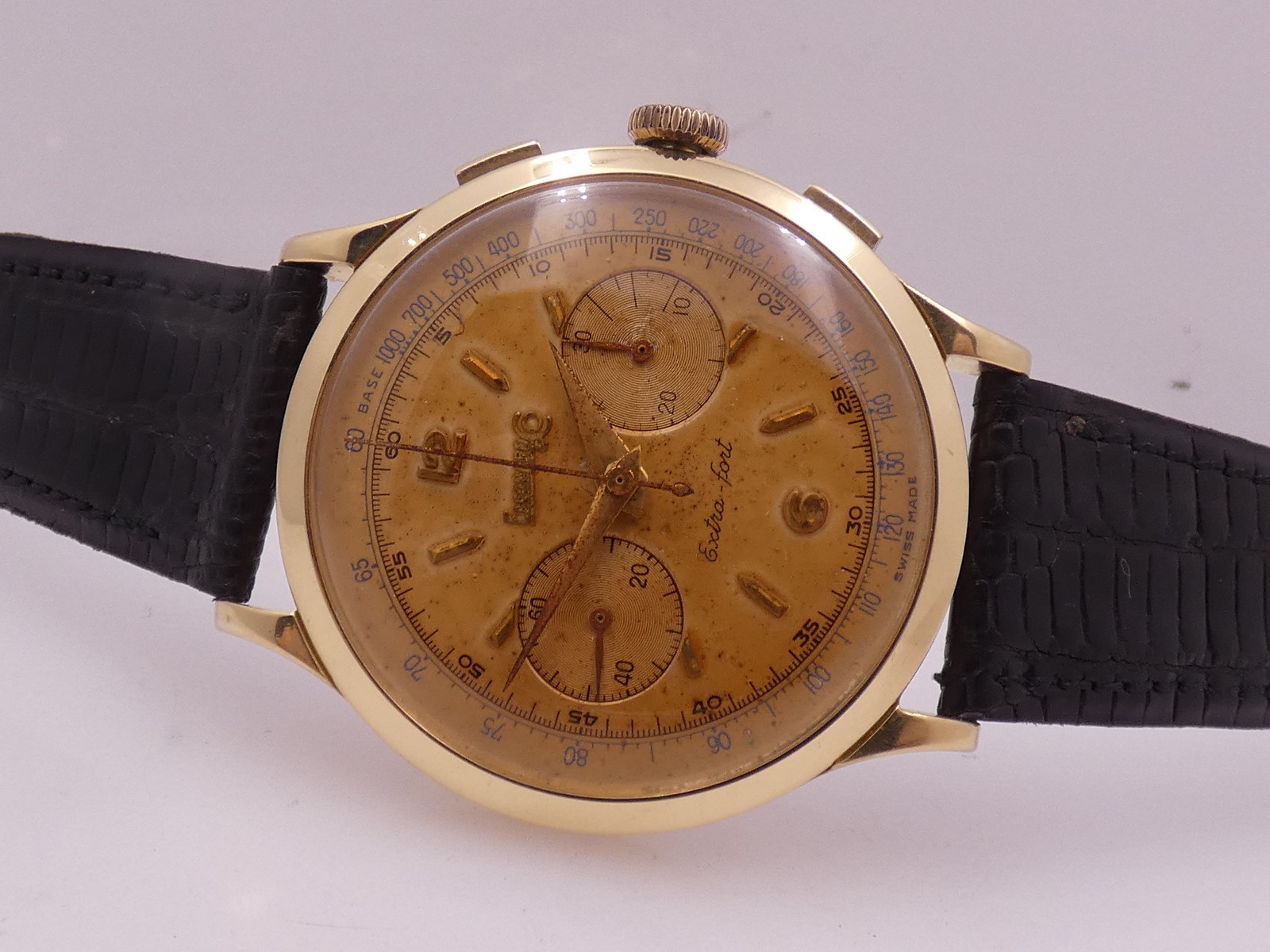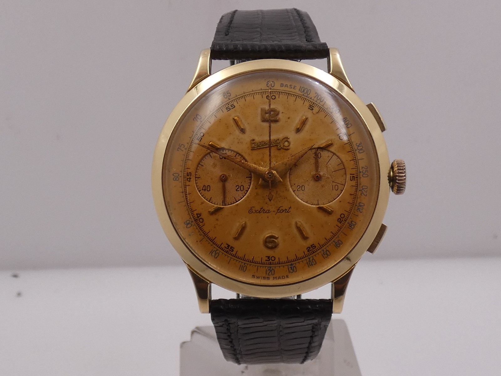 Dial: white/silver, with marked signs of time, bar indexes, Arabic half, in gold and in relief, dauphine hands, also in gold, continuous seconds at 9, chrono minutes at 3, chronograph seconds in the center, blue tachometric scale, black sextensimal scale with 1/5 second divisions, Eberhard logo at 12