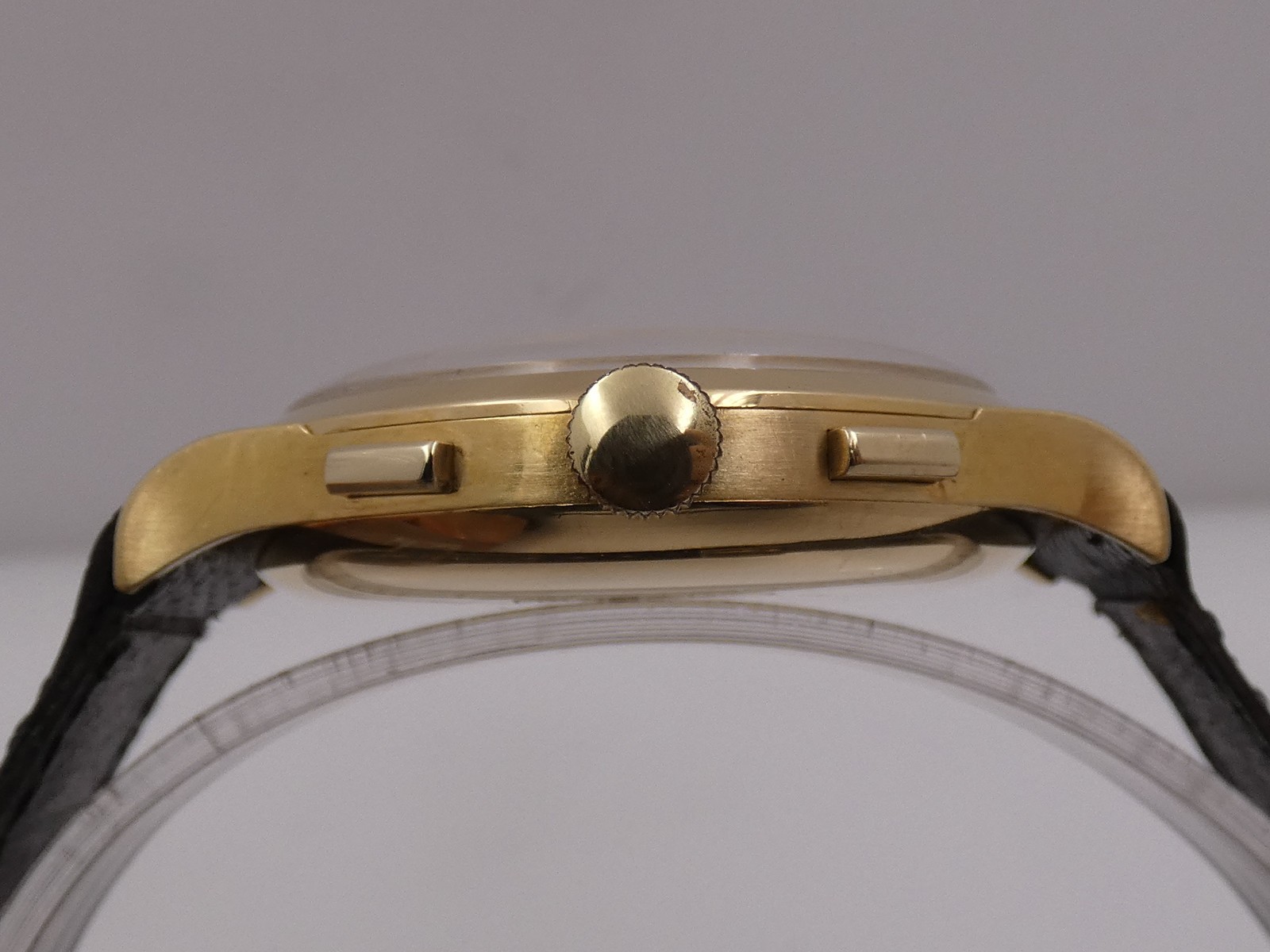 Pulsanti: rettangolari, il pulsante ad ore 2 consente al cronografo di funzionare come un monopulsante, in quanto attiva sequenzialmente le funzioni di start-stop e rimessa a zero. Il pulsante inferiore, di tipo scorrevole, viene invece azionato mediante uno spostamento verso il basso, che consente l’arresto della lancetta cronografica, mentre riportandolo nella posizione iniziale la lancetta riprende il suo cammino dal punto in cui era stata bloccata