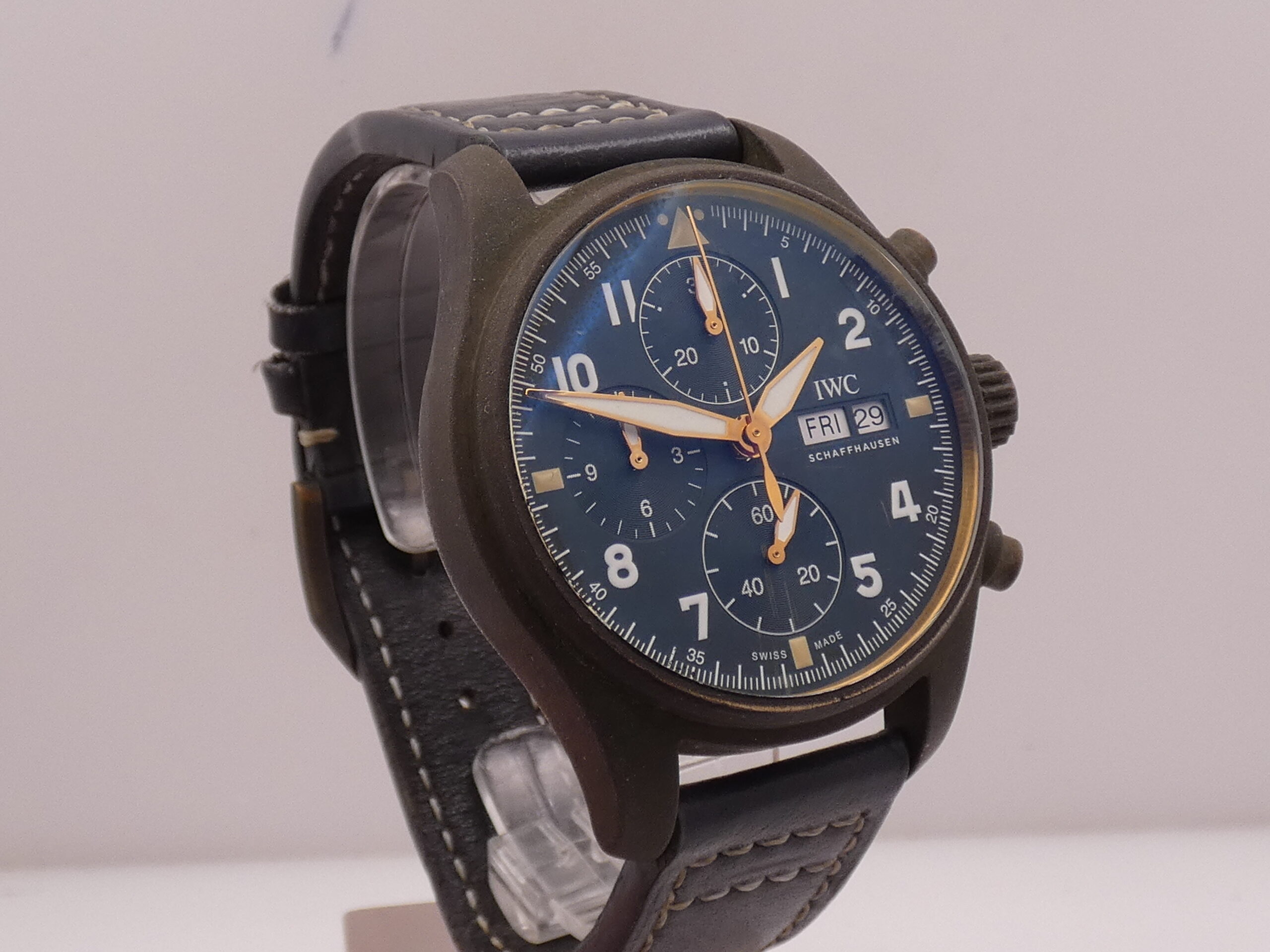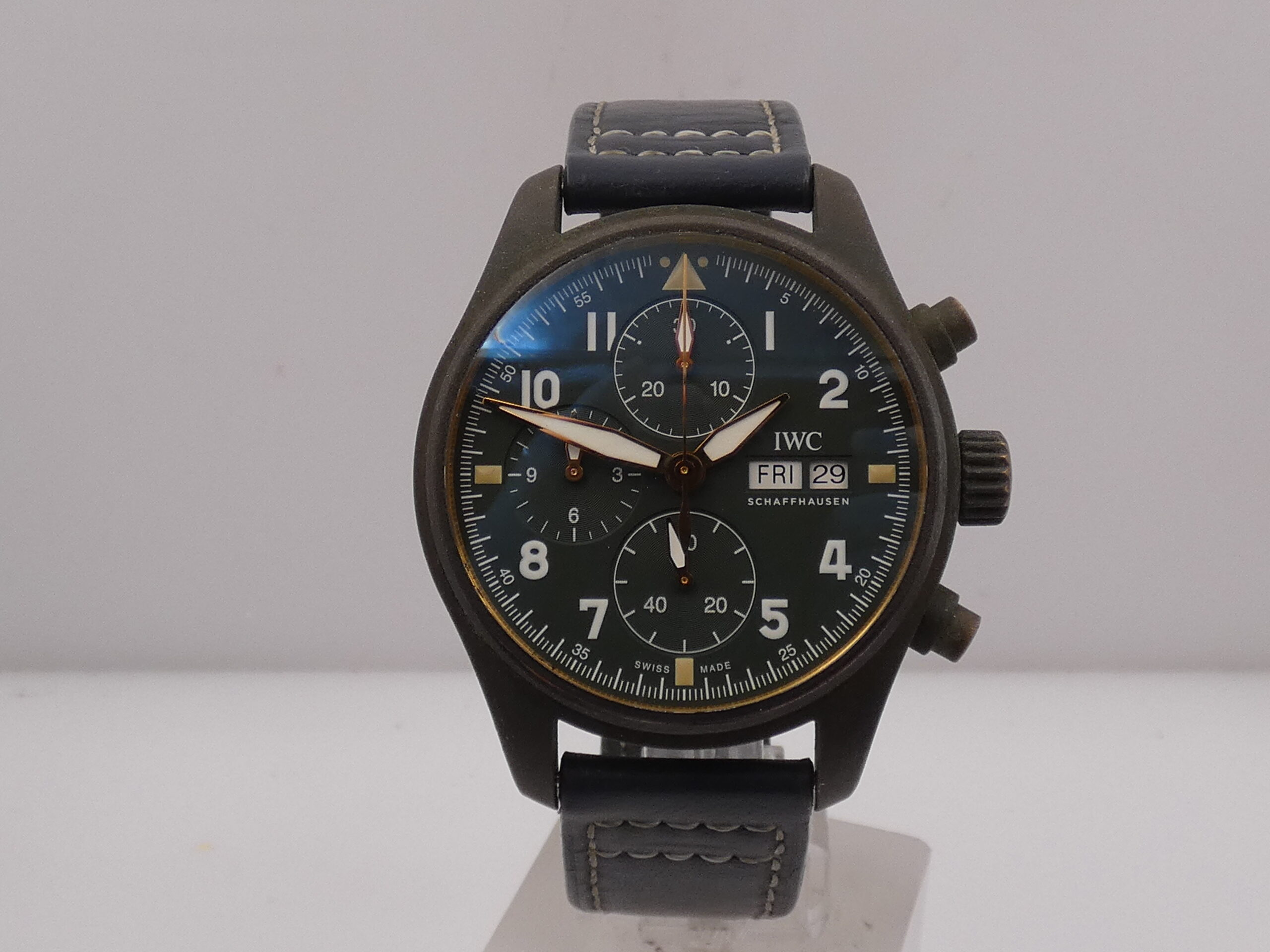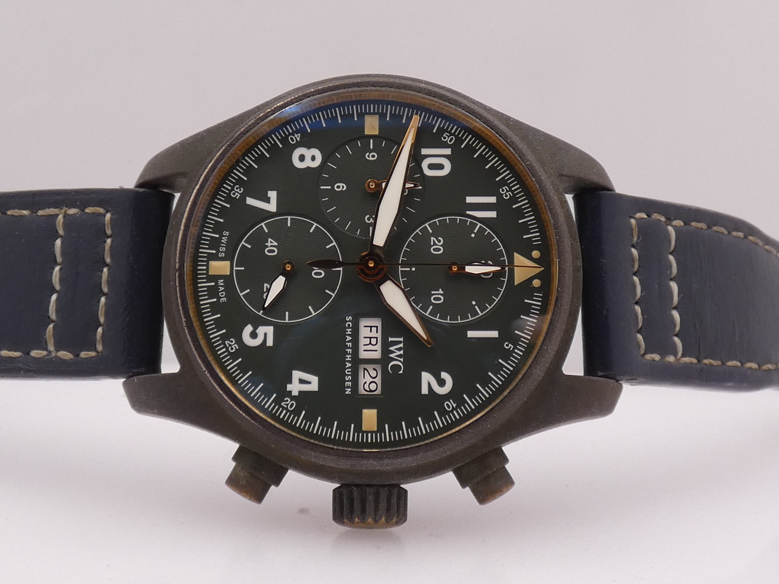 Con questo modello IWC rendere omaggio al Supermarine Spitfire: un aereo da caccia monoposto monomotore ad ala bassa, prodotto dalla ditta britannica Supermarine Aviation Works negli anni trenta e quaranta. Impiegato in Europa, Nord Africa, Australia e Asia, nella Seconda guerra mondiale, soprattutto per il suo efficace e decisivo contributo alla vittoriosa resistenza inglese all’aggressione tedesca, durante la Battaglia d’Inghilterra e gli anni del conflitto. Questo cronografo con cassa in bronzo, ha una personalità esclusiva. Con il passare del tempo e a seconda dell’uso, questo materiale assume una leggera patina che ne scurisce il colore, conferendo al Pilot’s Spitfire un carattere unico e inconfondibile. Marca: IWC L’orologio che vedete in vendita si trova in buone condizioni, è perfettamente funzionante, è preciso ed affidabile,è impermeabile: l’impermeabilità è garantita da test effettuato. È originale. Verrà a voi consegnato con un bellissimo cinturino supplementare fatto a mano, la sua scatola (putroppo rovinata all’esterno e leggermente all’interno) la sua garanzia, il suo panno per la pulizia, il suo manuale originale IWC, più la nostra garanzia di 12 mesi sul buon funzionamento!!! E’ in foto. Stupendo !!! ESAMINIAMO IL VOSTRO USATO. SPEDIAMO GRATIS IN TUTTO IL MONDO. CODICE INTERNO: CZCZ |
