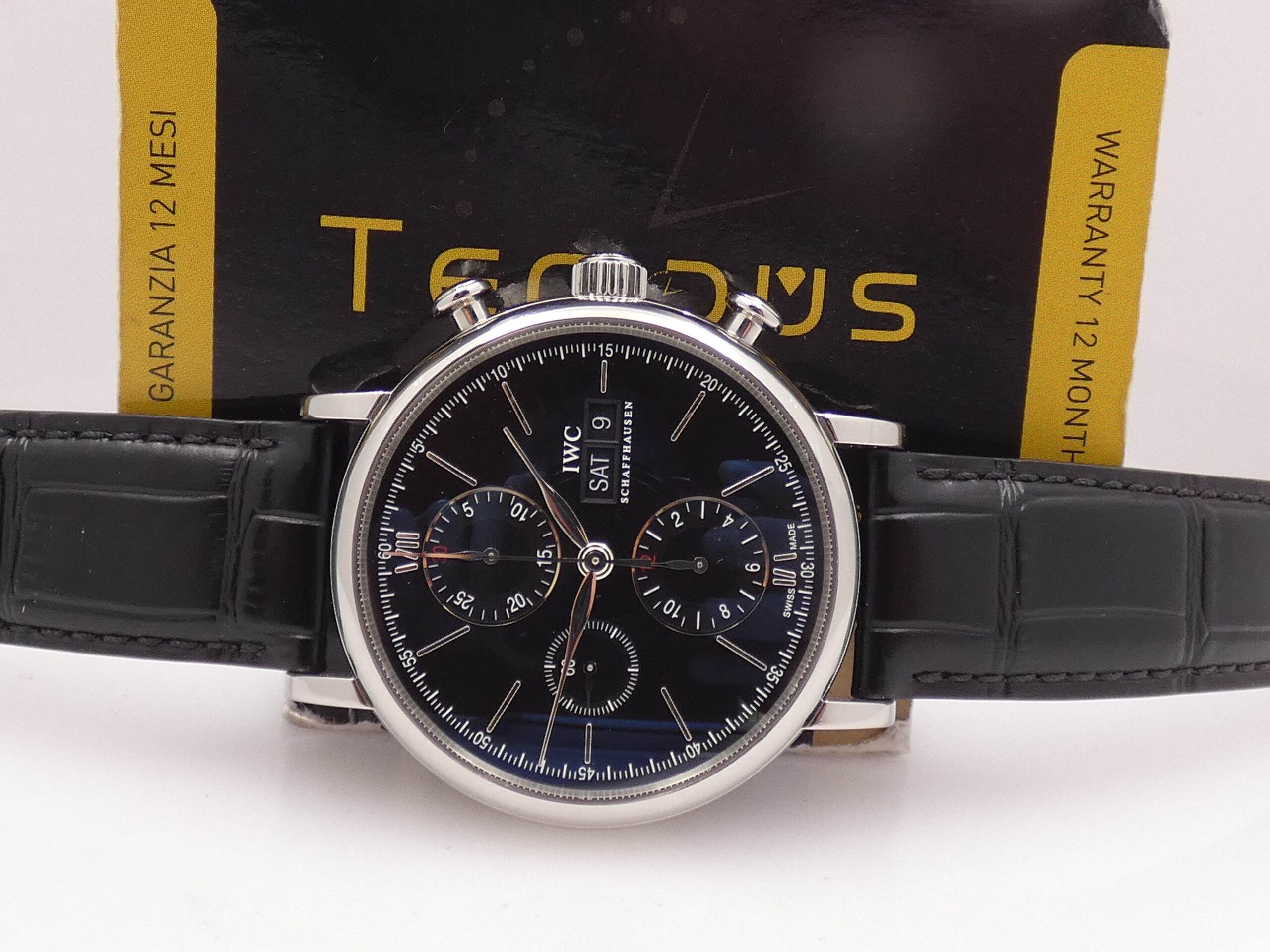 Quadrante: nero, con indici a barretta in acciaio ed i rilievo, lancette a foglia, anch’esse in acciaio, secondi continui al 9, minuti del crono al 12, ore del crono al 6, secondi cronografici al centro, indicazione del day-date tramite doppia finestrella al 3 con rimessa rapida in corona, scala sessantesimale con suddivisione ad 1/5 di secondo, logo IWC al 3