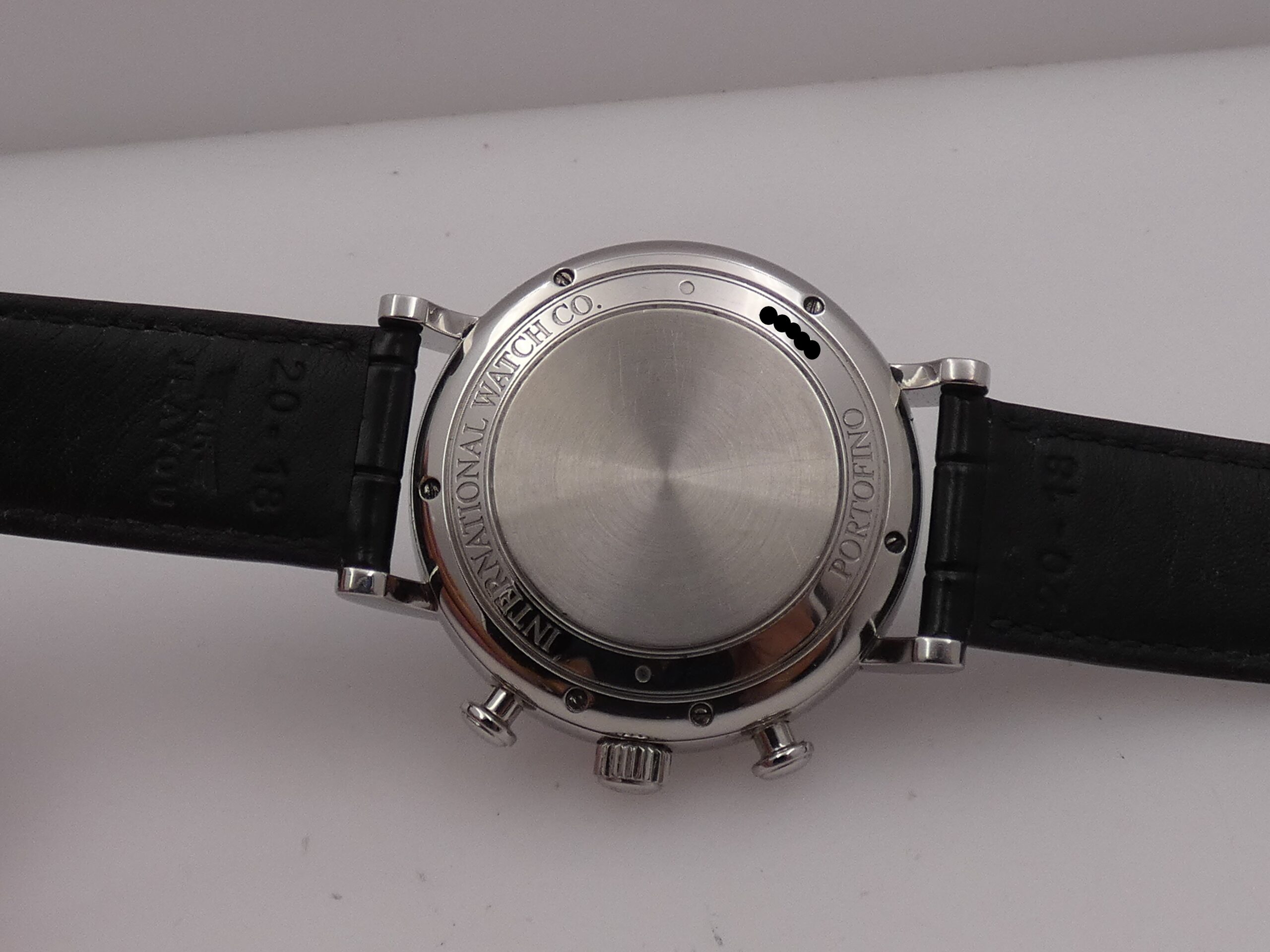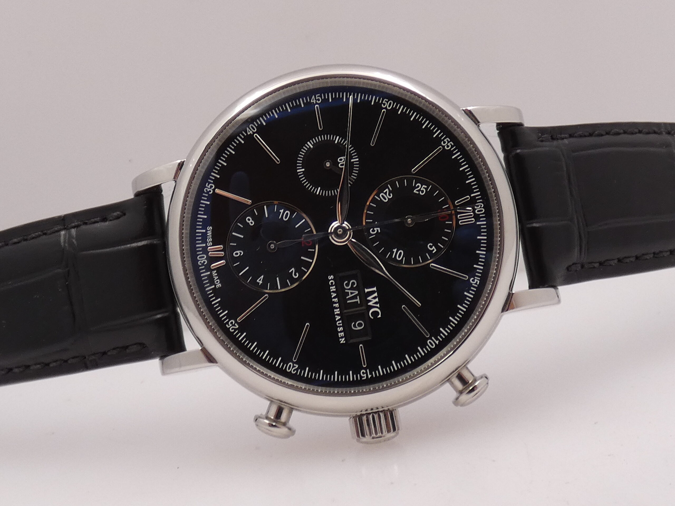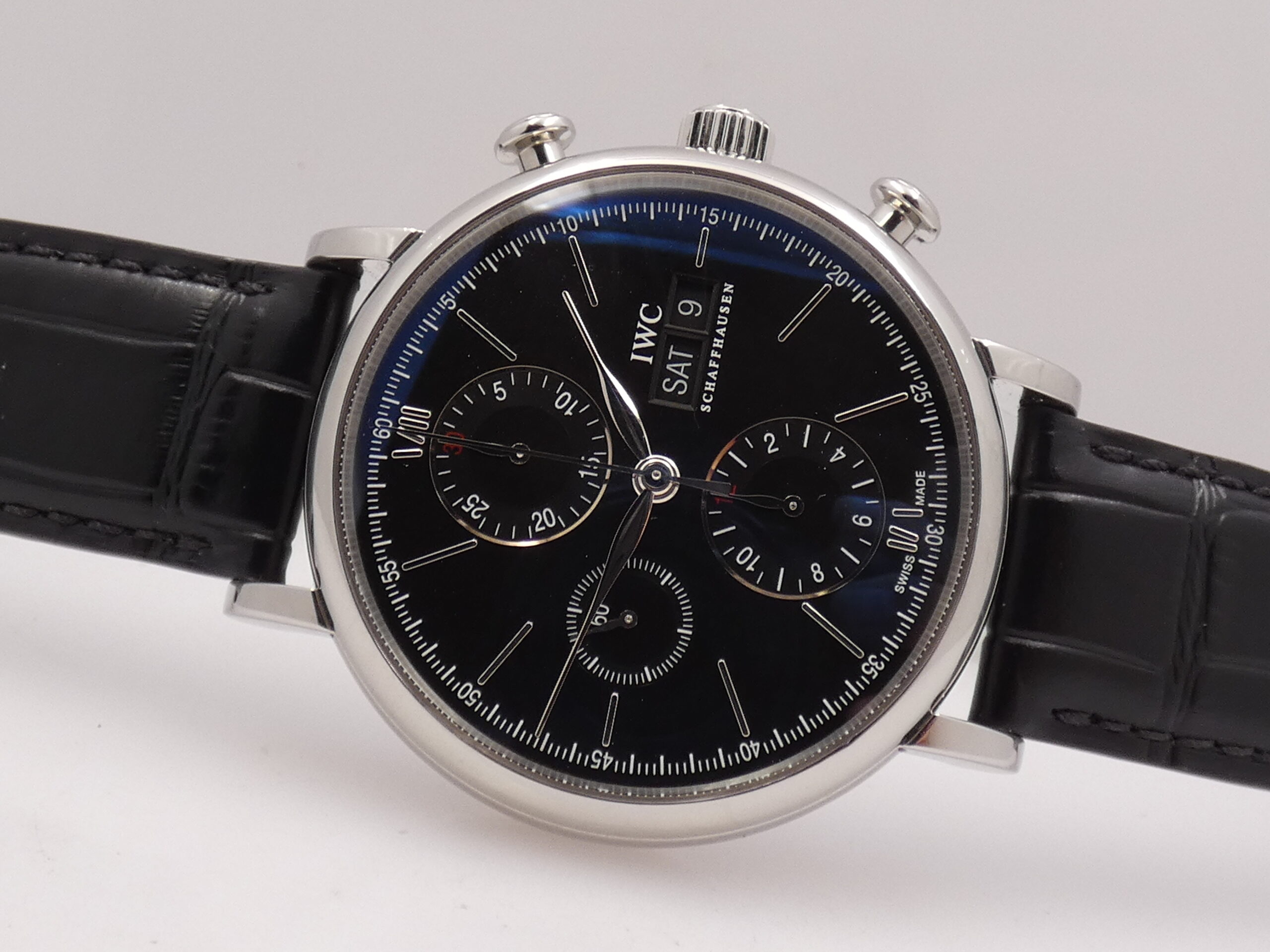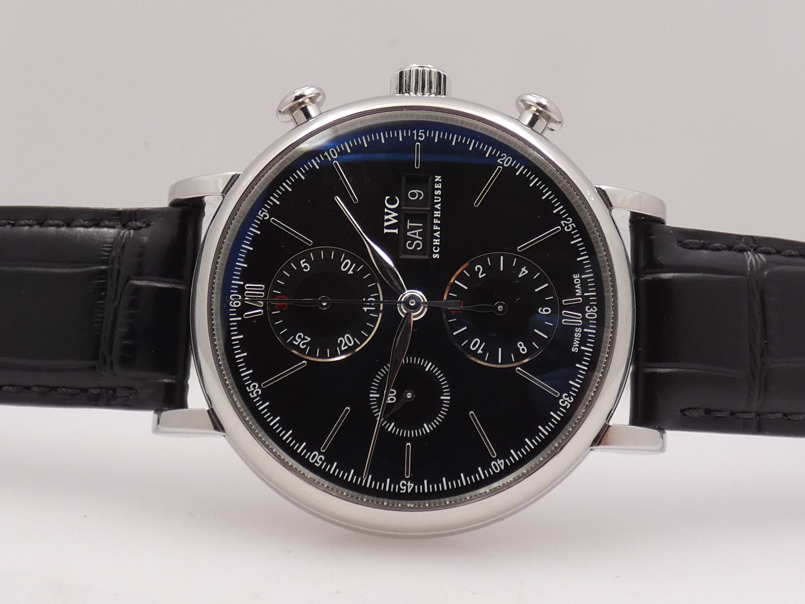Dial: Black, with steel bar indexes and raised indexes, steel leaf-shaped hands, running seconds at 9 o’clock, chronograph minutes at 12 o’clock, chronograph hours at 6 o’clock, center chronograph seconds, day-date display via a double window at 3 o’clock with quick-set crown, 60-second scale with 1/5th of a second subdivisions, IWC logo at 3 o’clock