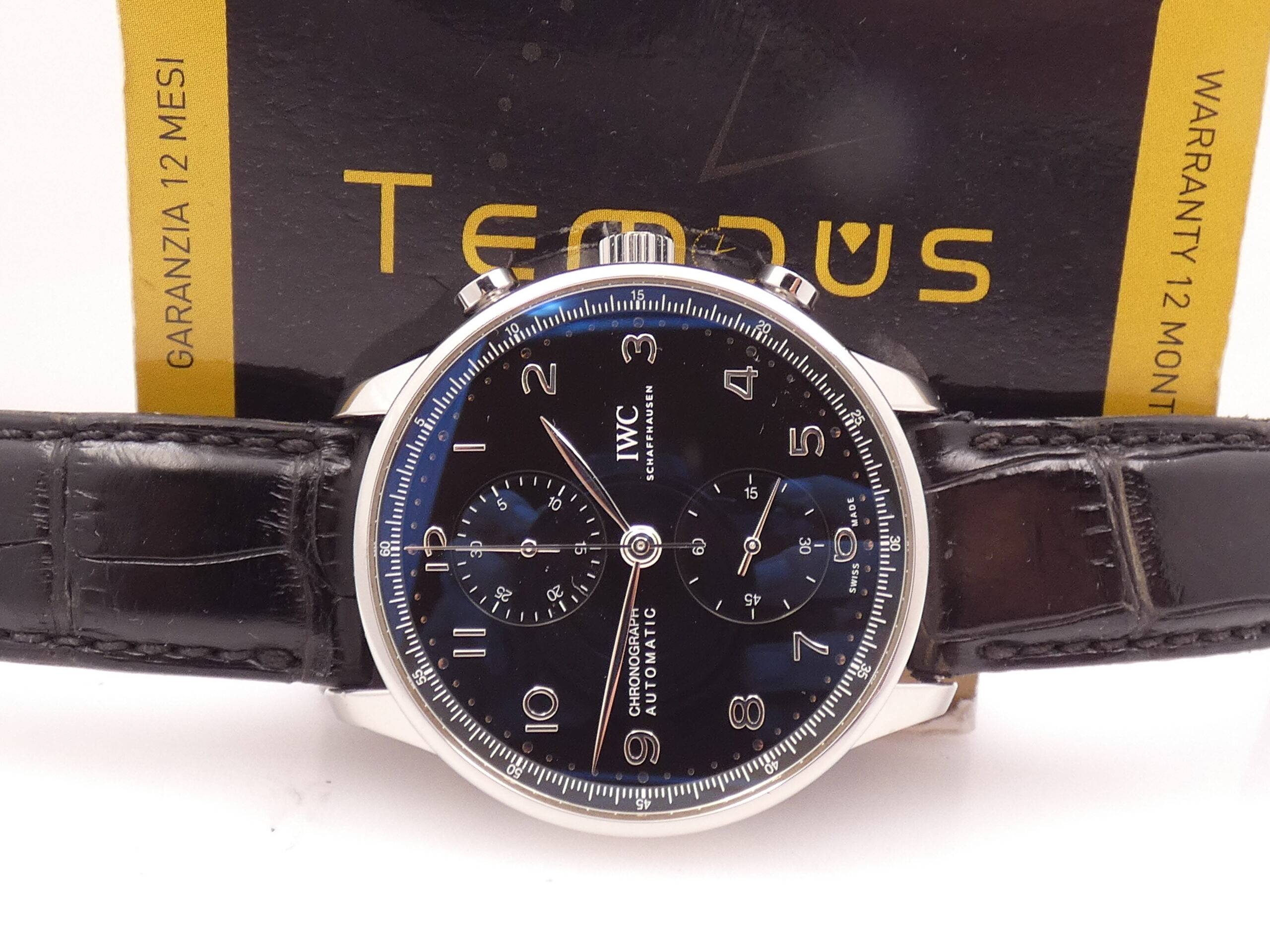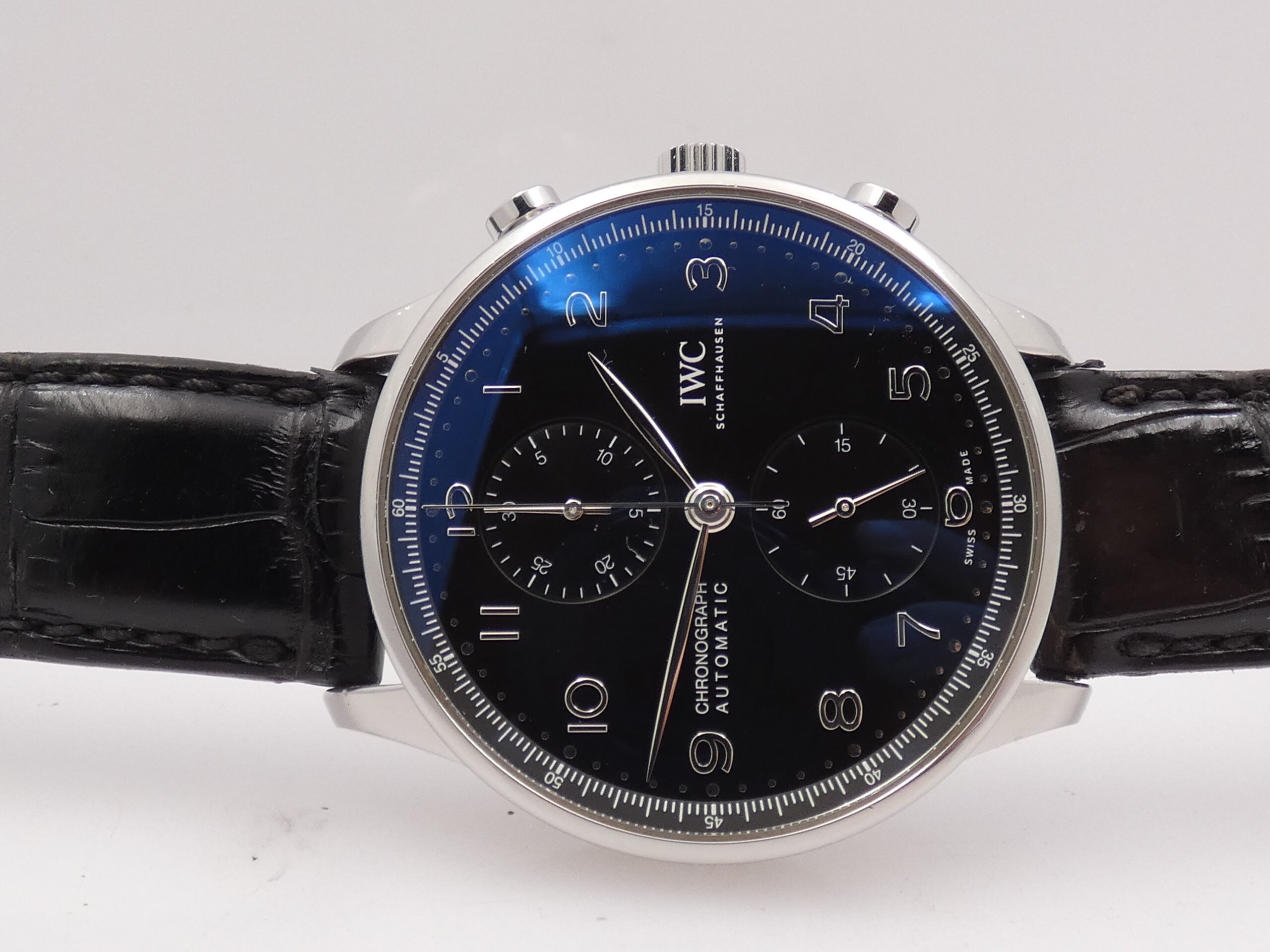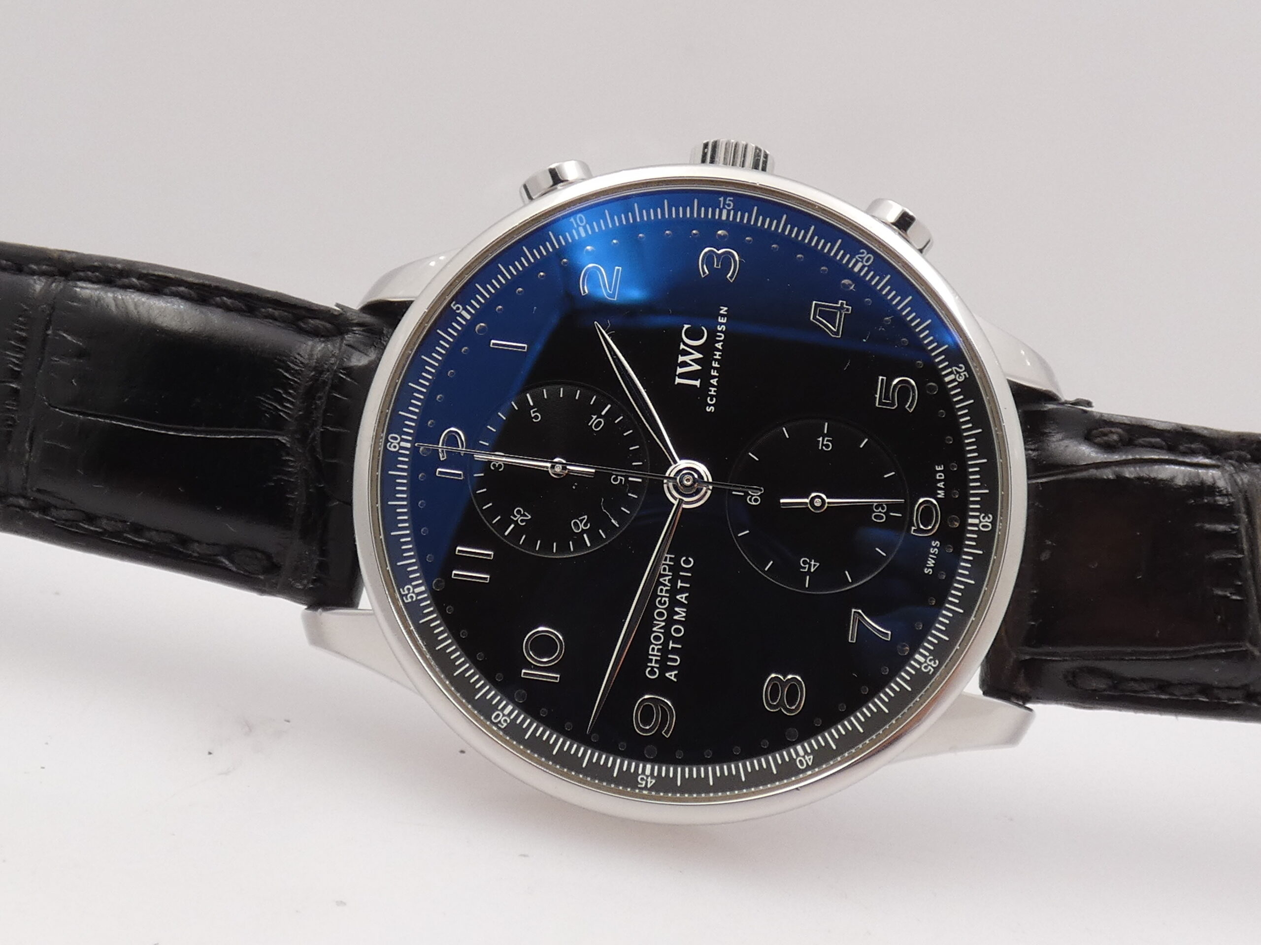 Quadrante: nero, con indici arabi in acciaio ed in rilievo, lancette a foglia anch’esse in acciaio, secondi continui al 6, minuti del crono al 12, secondi cronografici al centro, scala sessantesimale sul rehaut, logo Iwc al 3