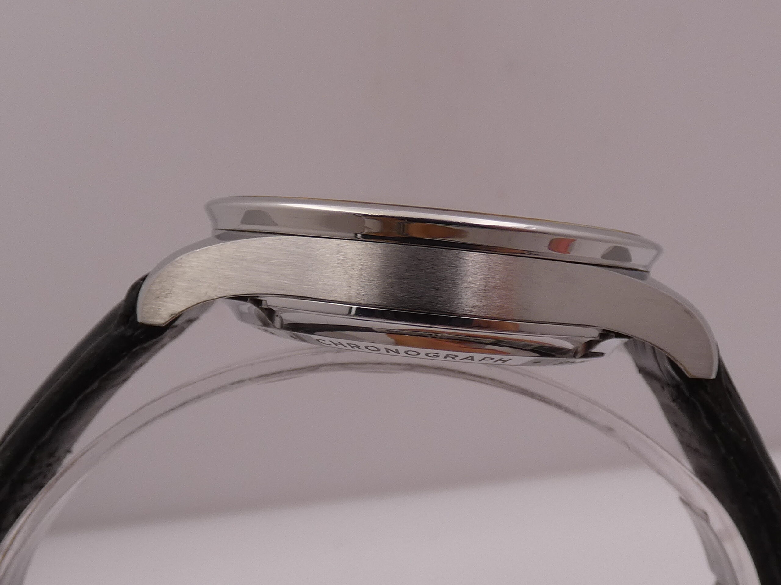 Dial: Black, with steel and raised Arabic numerals, steel leaf-shaped hands, running seconds at 6 o’clock, chronograph minutes at 12 o’clock, center chronograph seconds, 60-minute scale on the flange, IWC logo at 3 o’clock