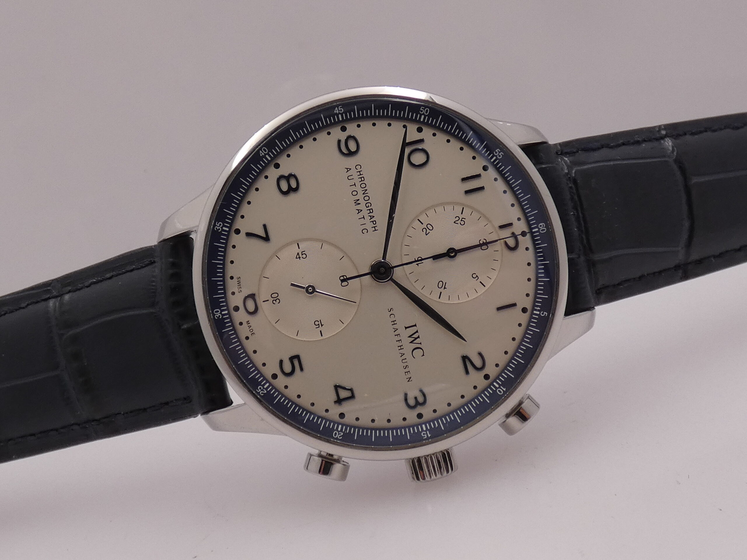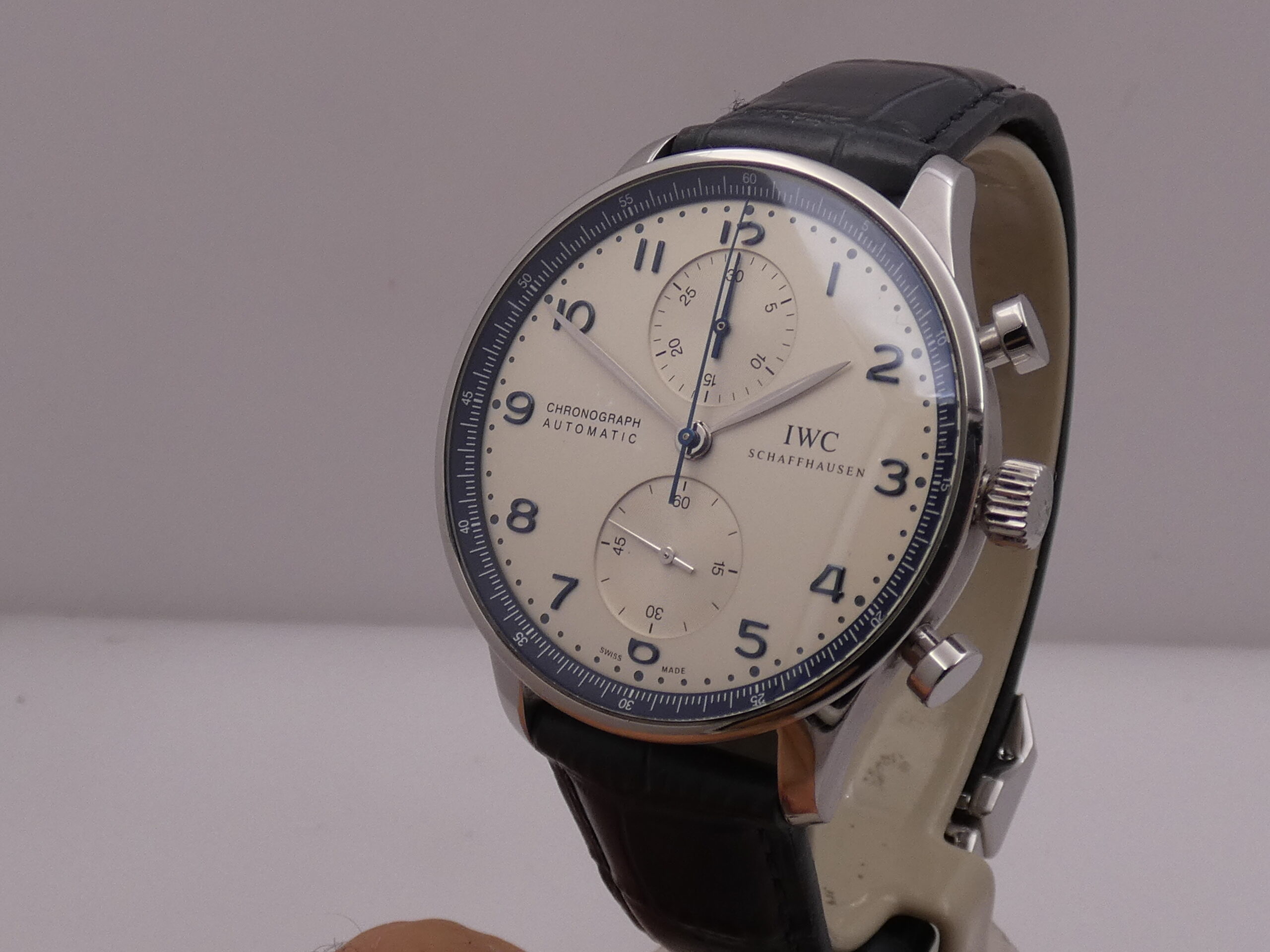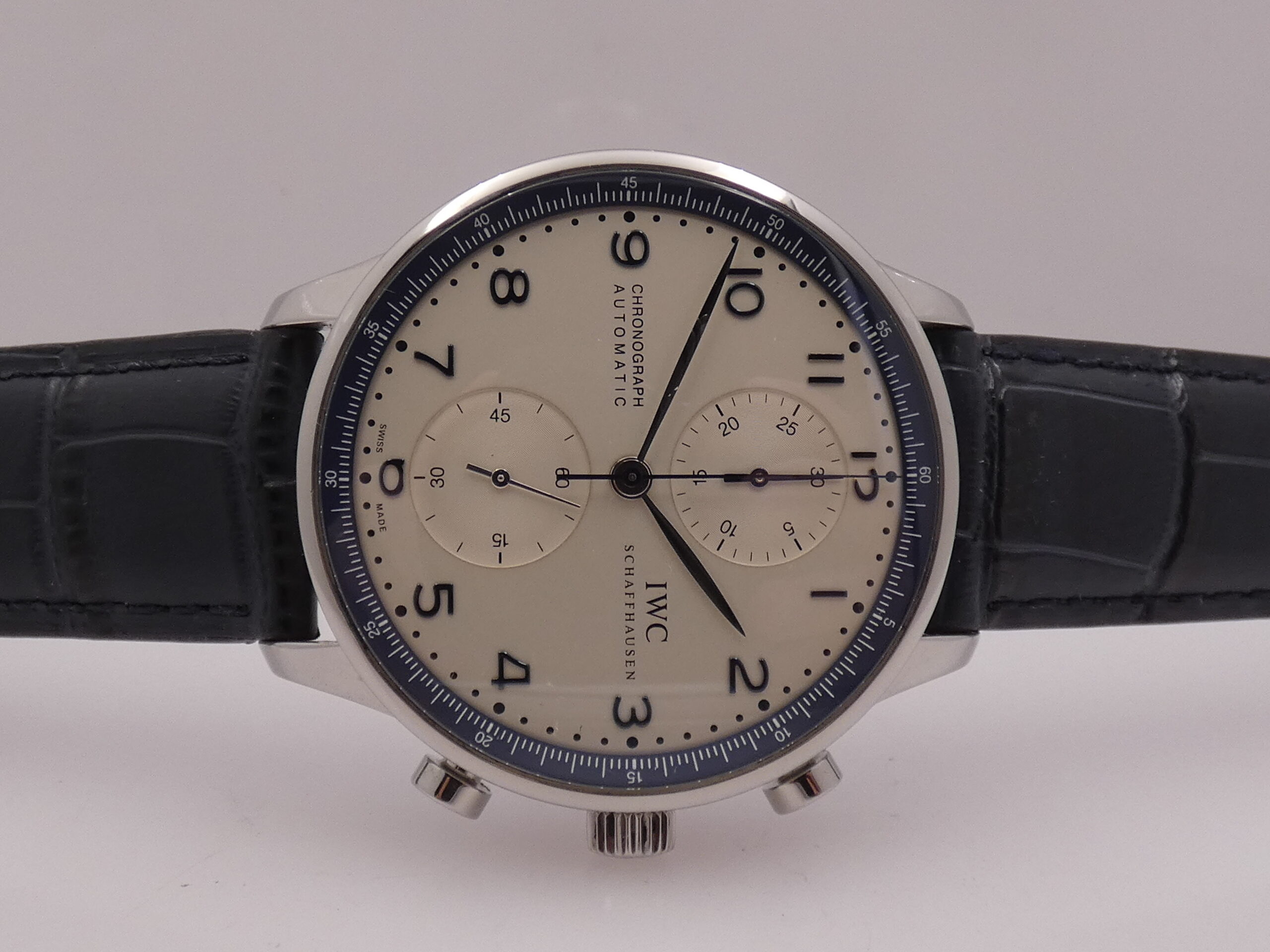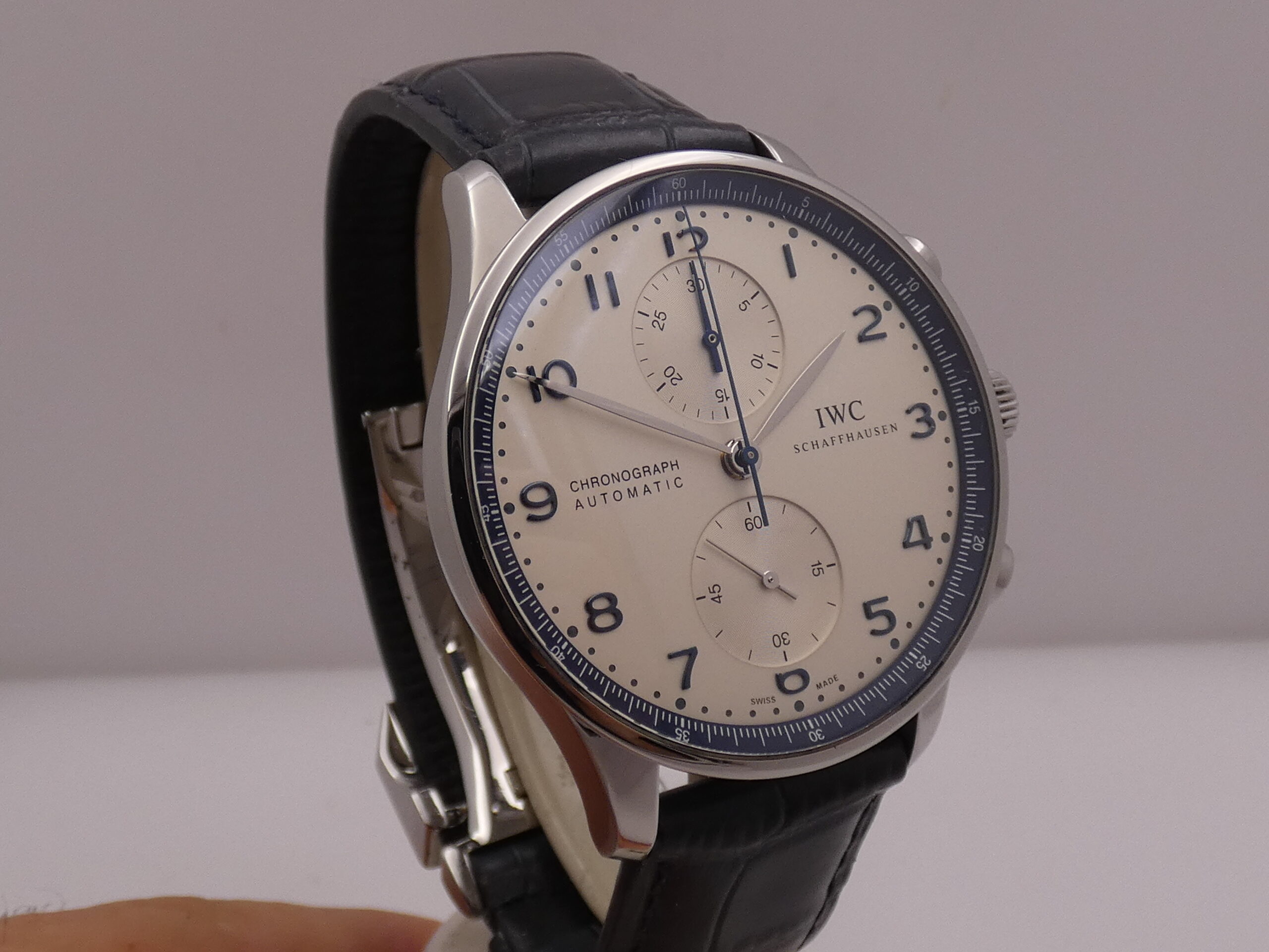 Quadrante: argentè con rehaut interno blu a contrasto, indici arabi azzurrati in rilievo, lancette a foglia in acciaio, secondi continui al 6, minuti del crono al 12, secondi cronografici al centro, scala sessantesimale sul rehout, logo Iwc al 3
