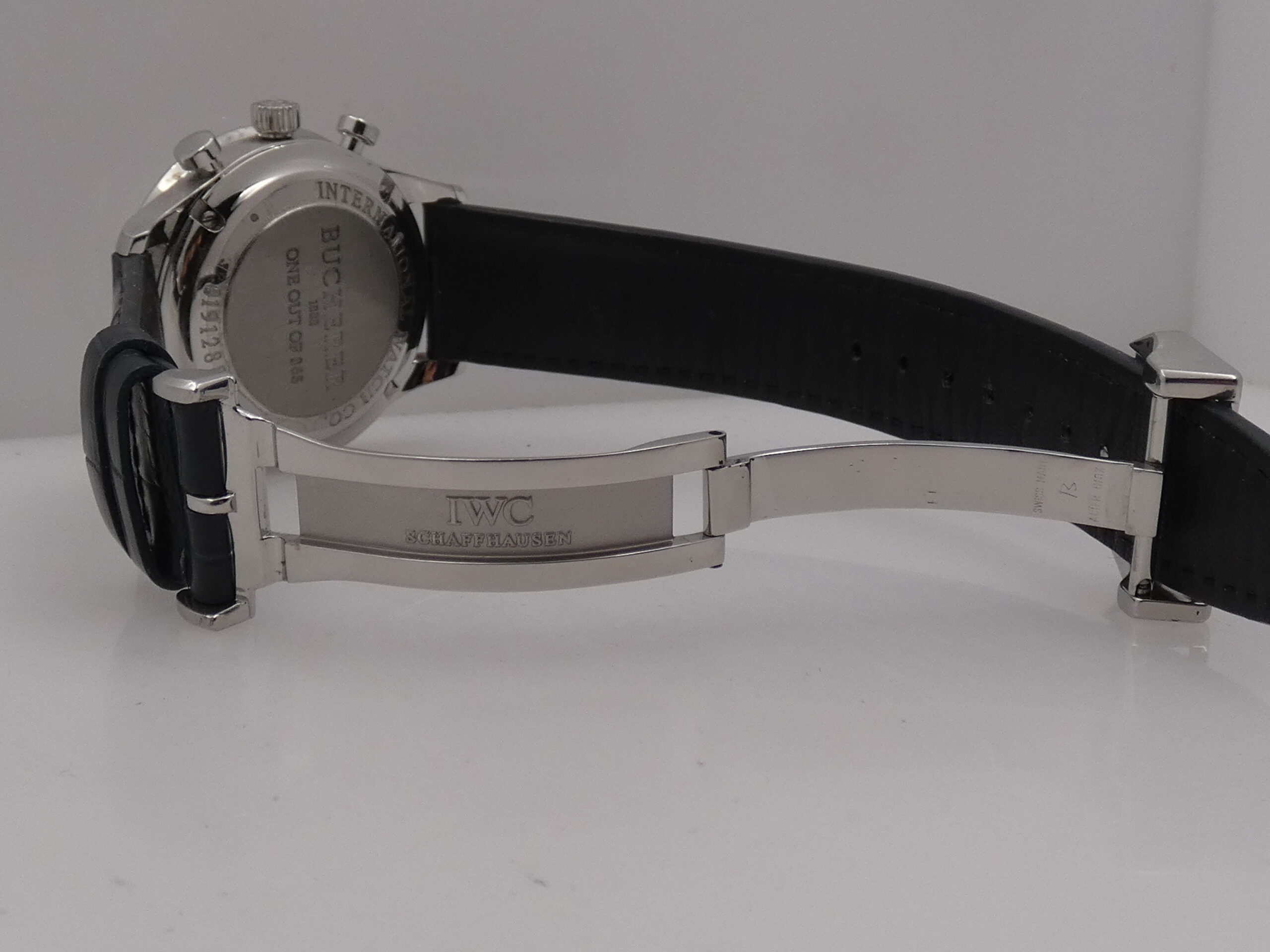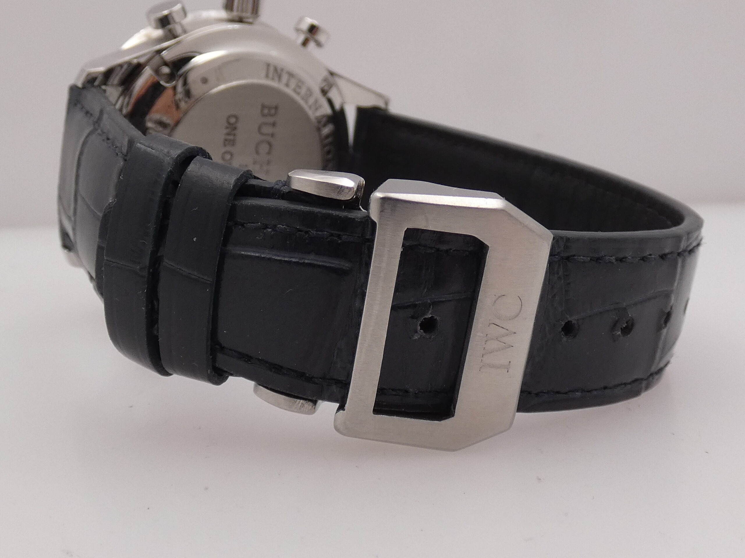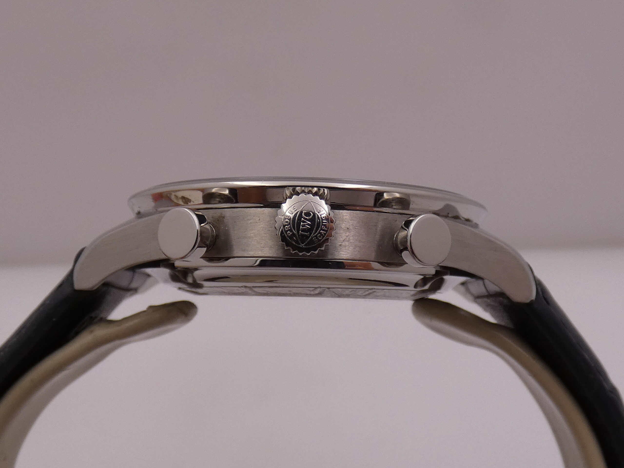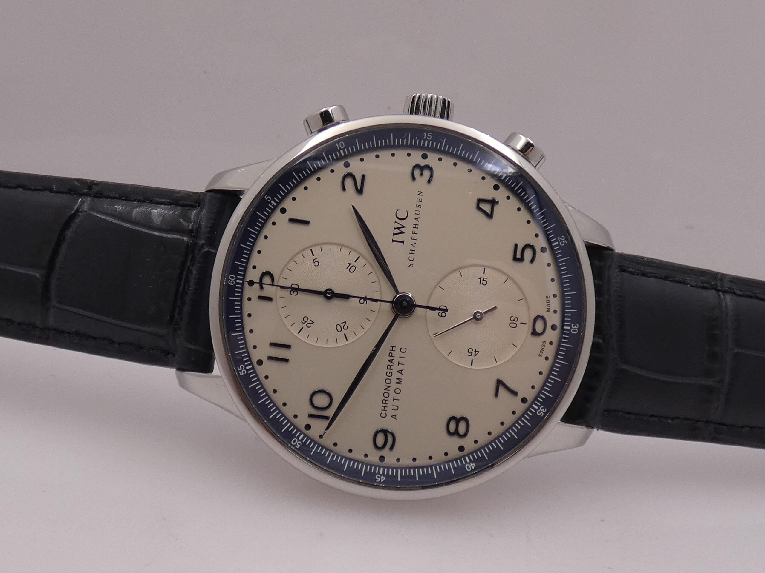 Quadrante: argentè con rehaut interno blu a contrasto, indici arabi azzurrati in rilievo, lancette a foglia in acciaio, secondi continui al 6, minuti del crono al 12, secondi cronografici al centro, scala sessantesimale sul rehout, logo Iwc al 3