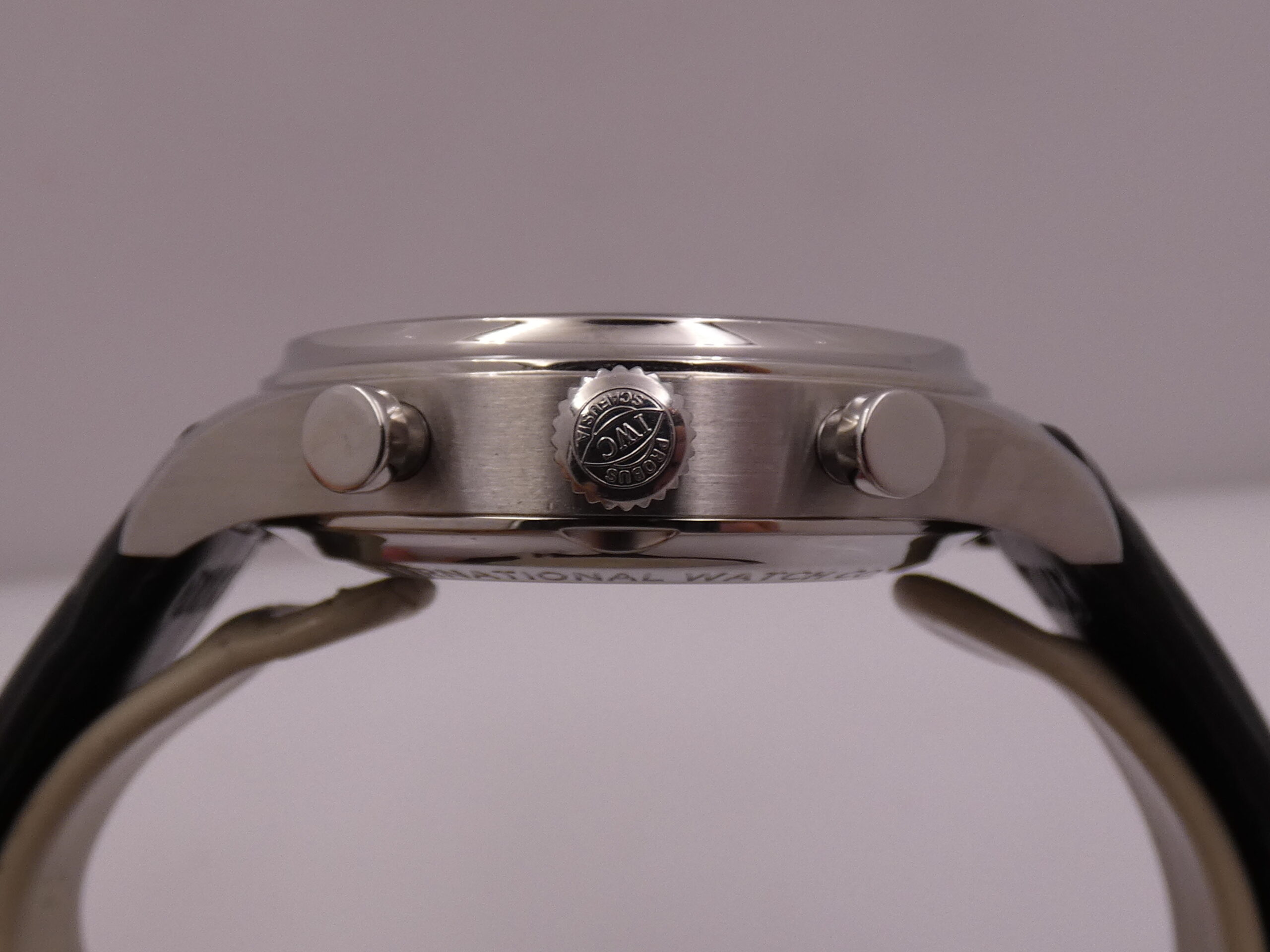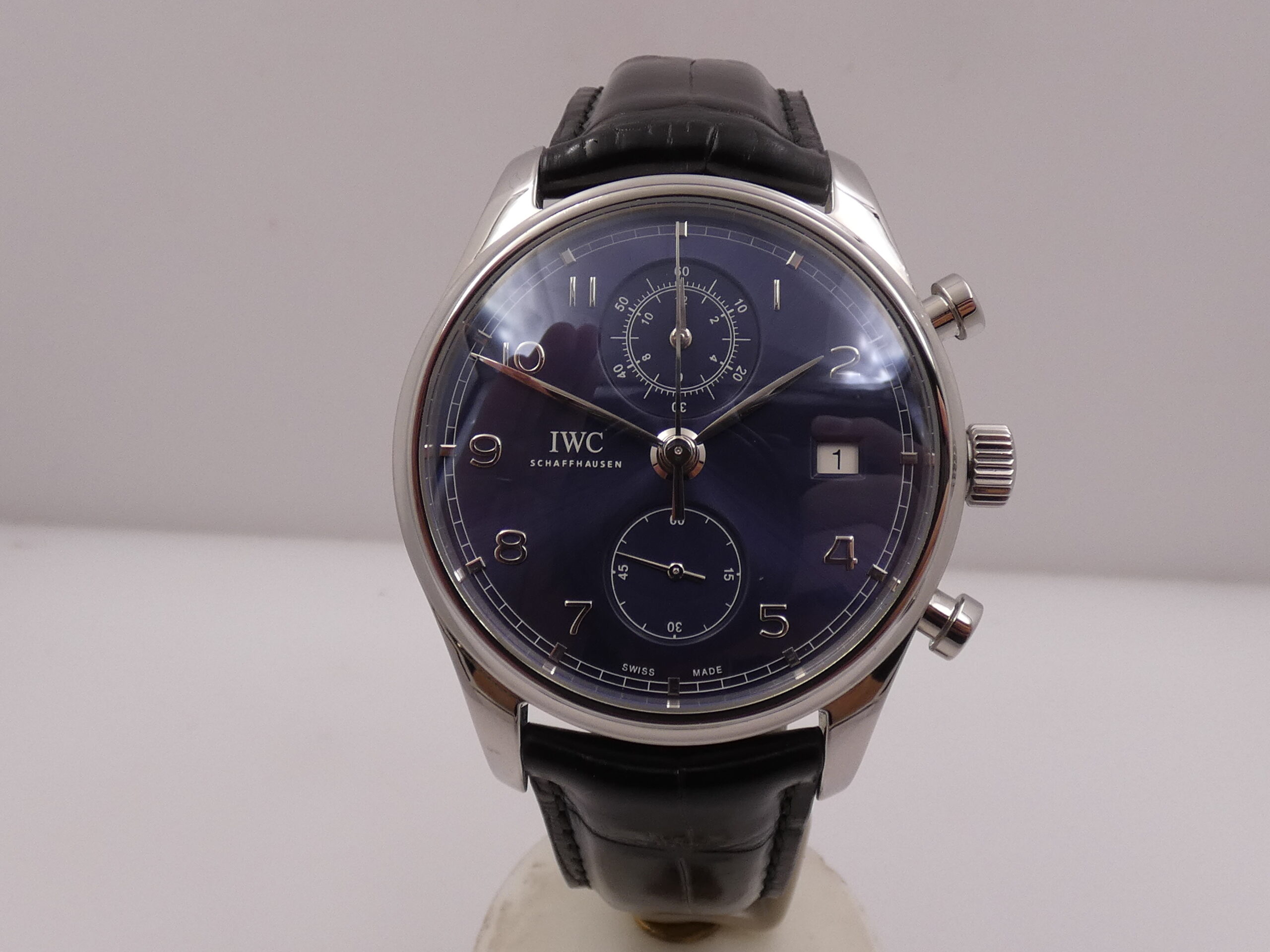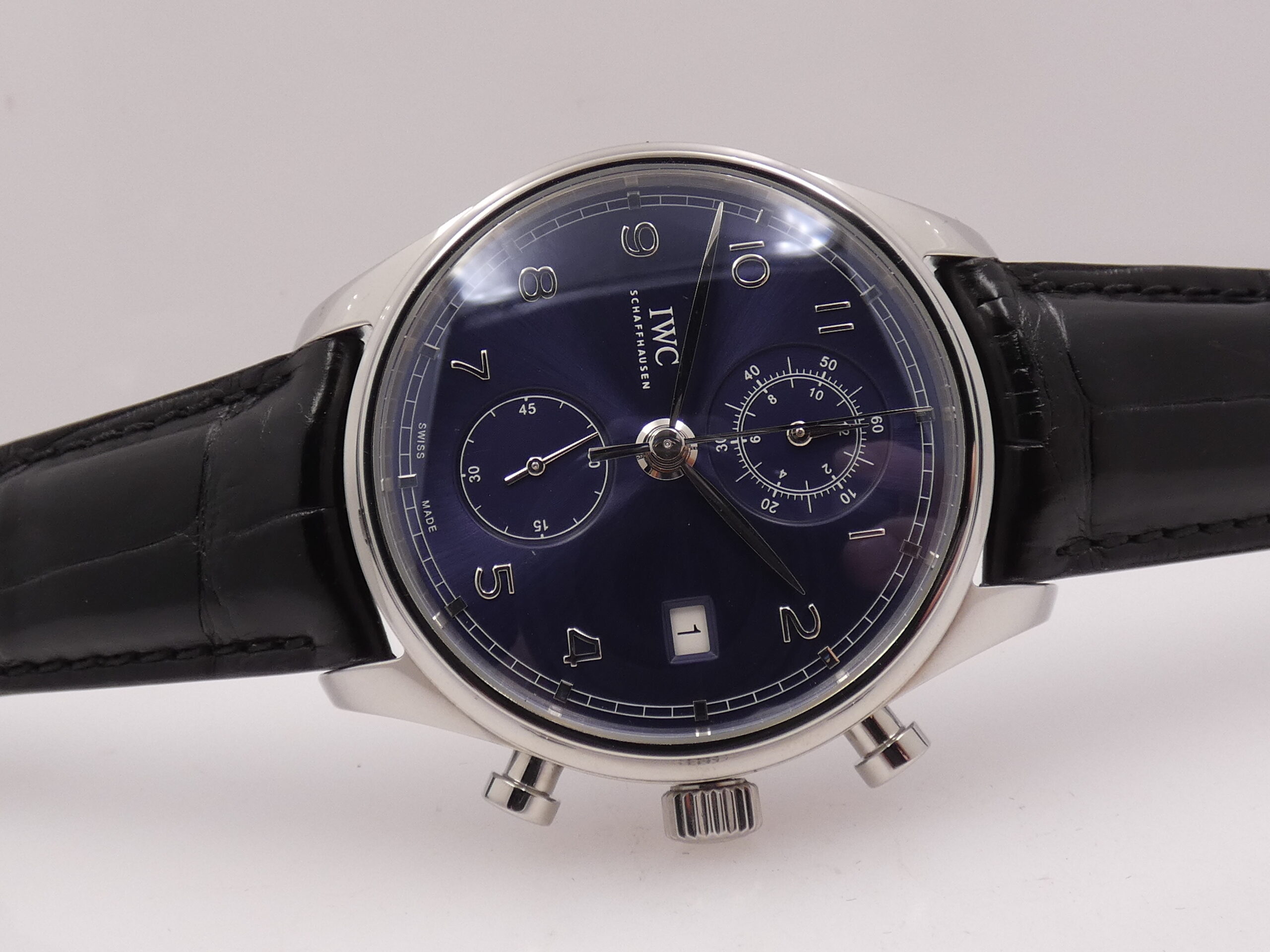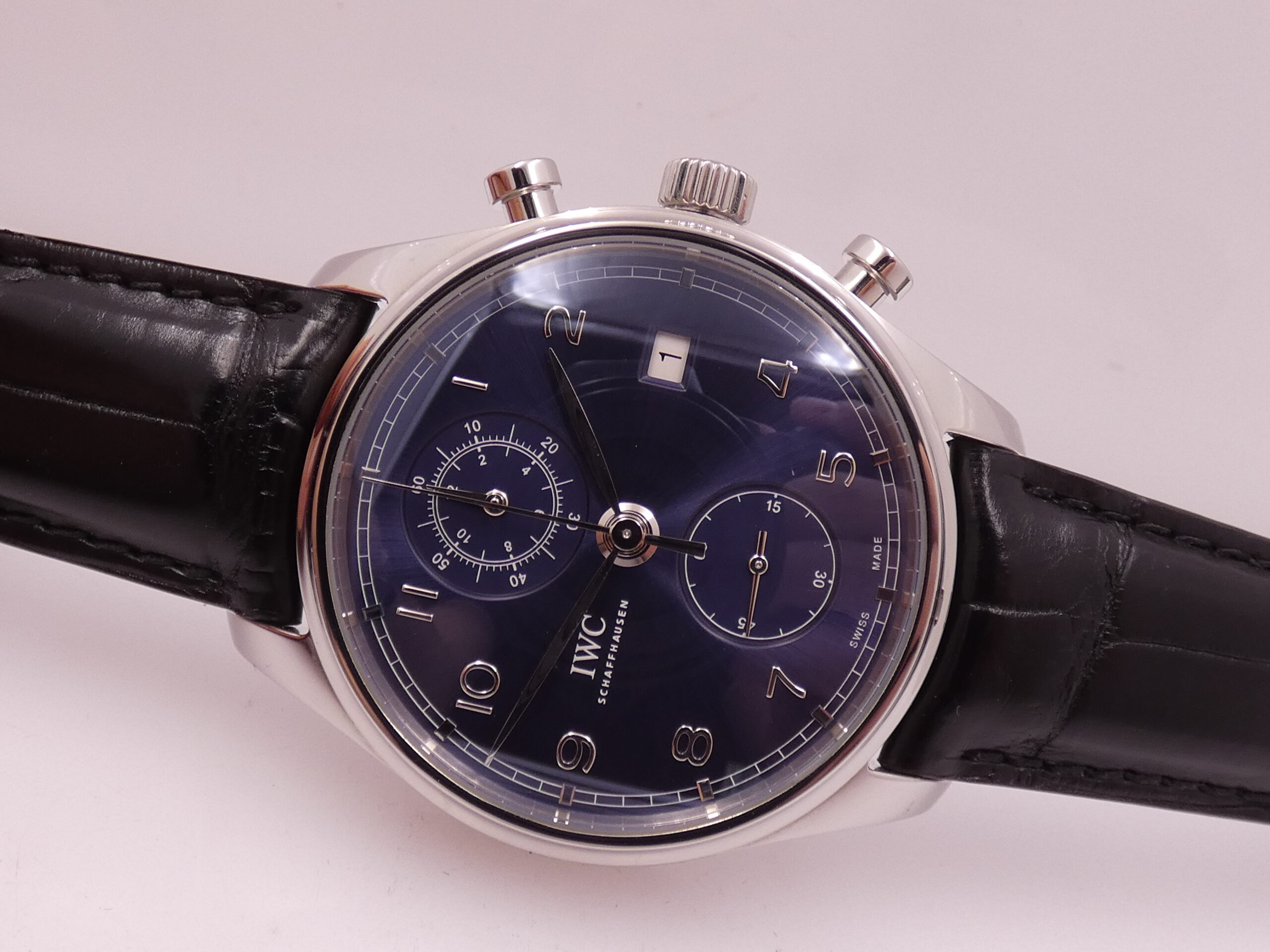 Dial: Sunburst blue, with raised steel Arabic numerals, steel leaf-shaped hands, running seconds at 6 o’clock, chronograph minutes and hours at 12 o’clock, center chronograph seconds, date display at 3 o’clock with quick-set crown, Chemin de Fer (railroad) 60-minute scale, IWC logo at 9 o’clock